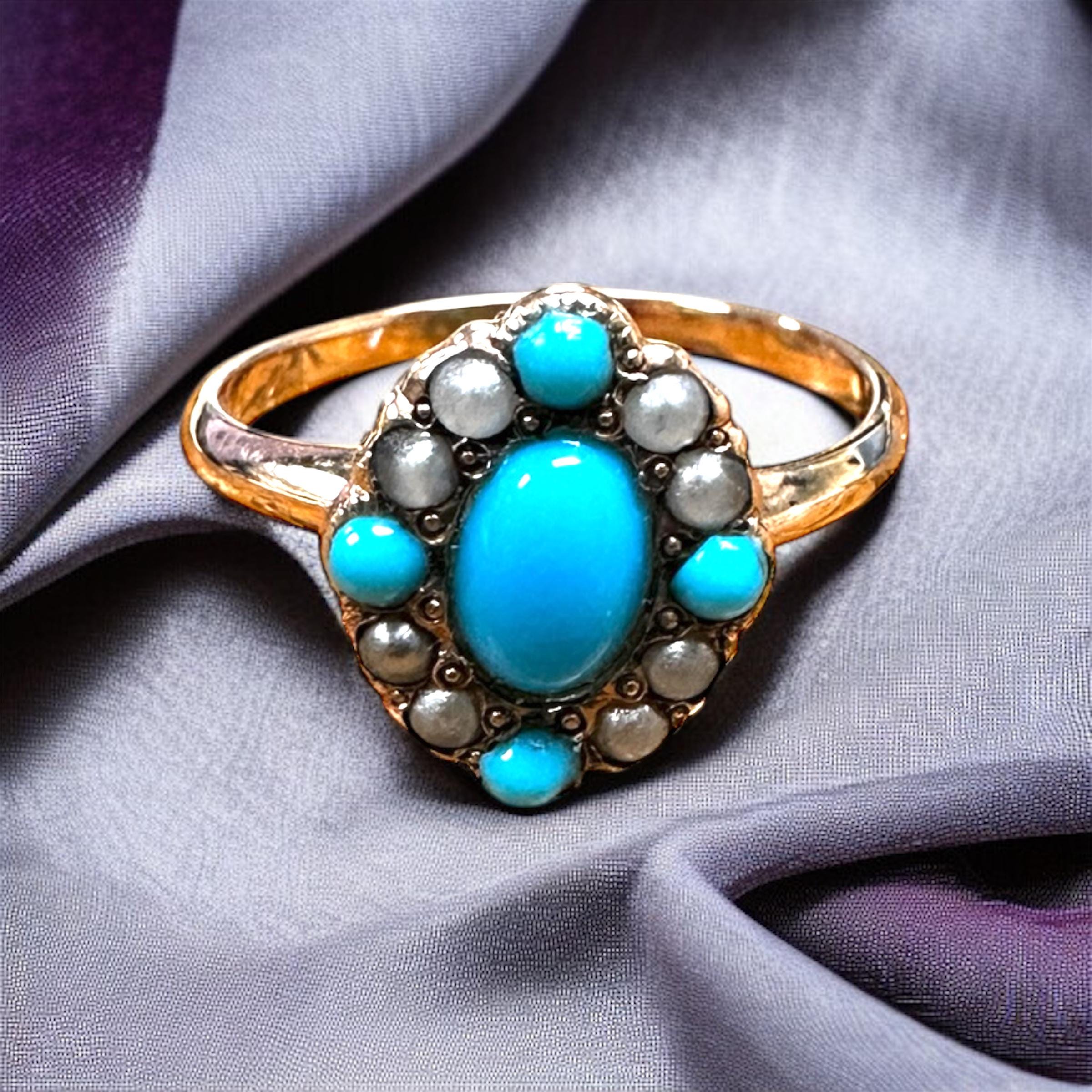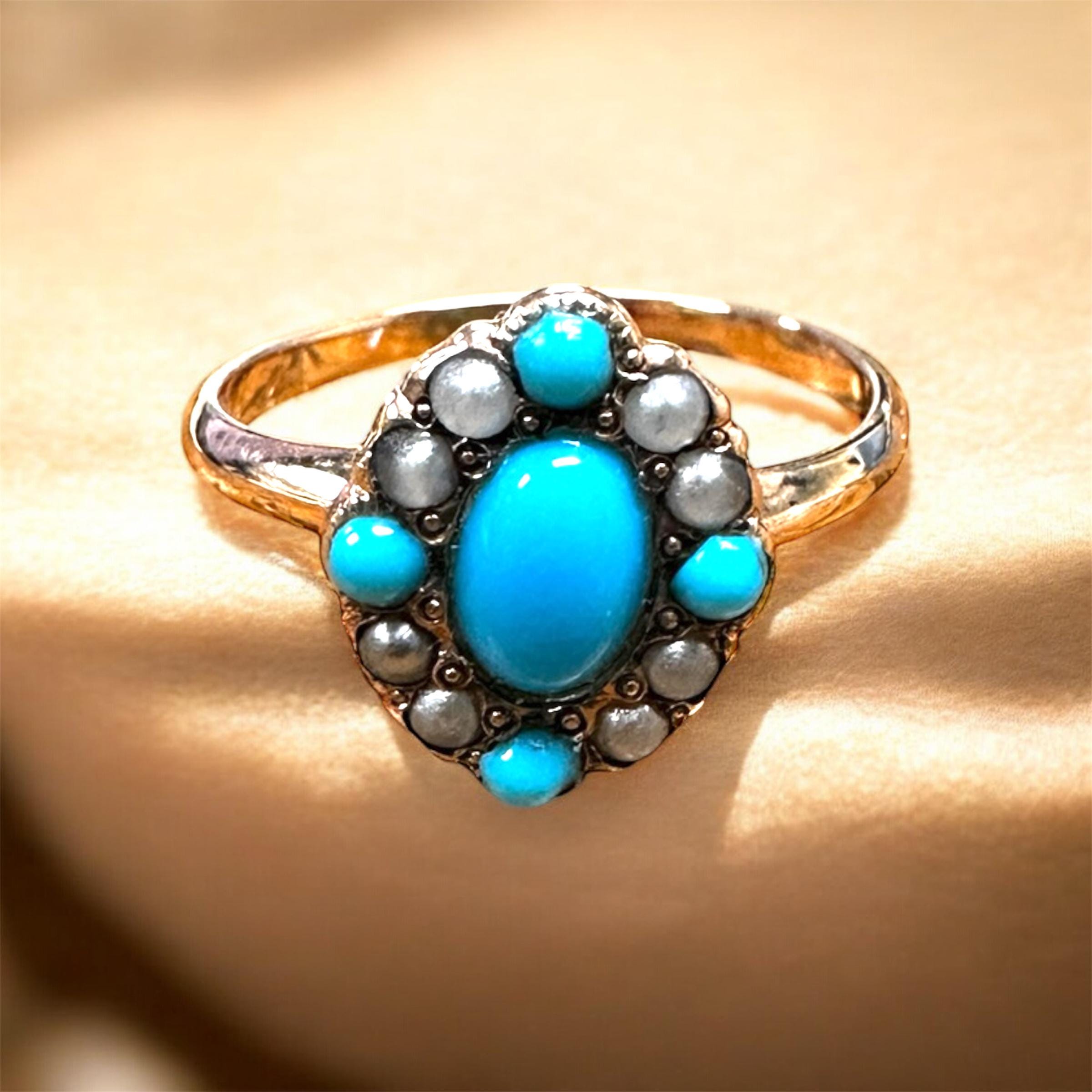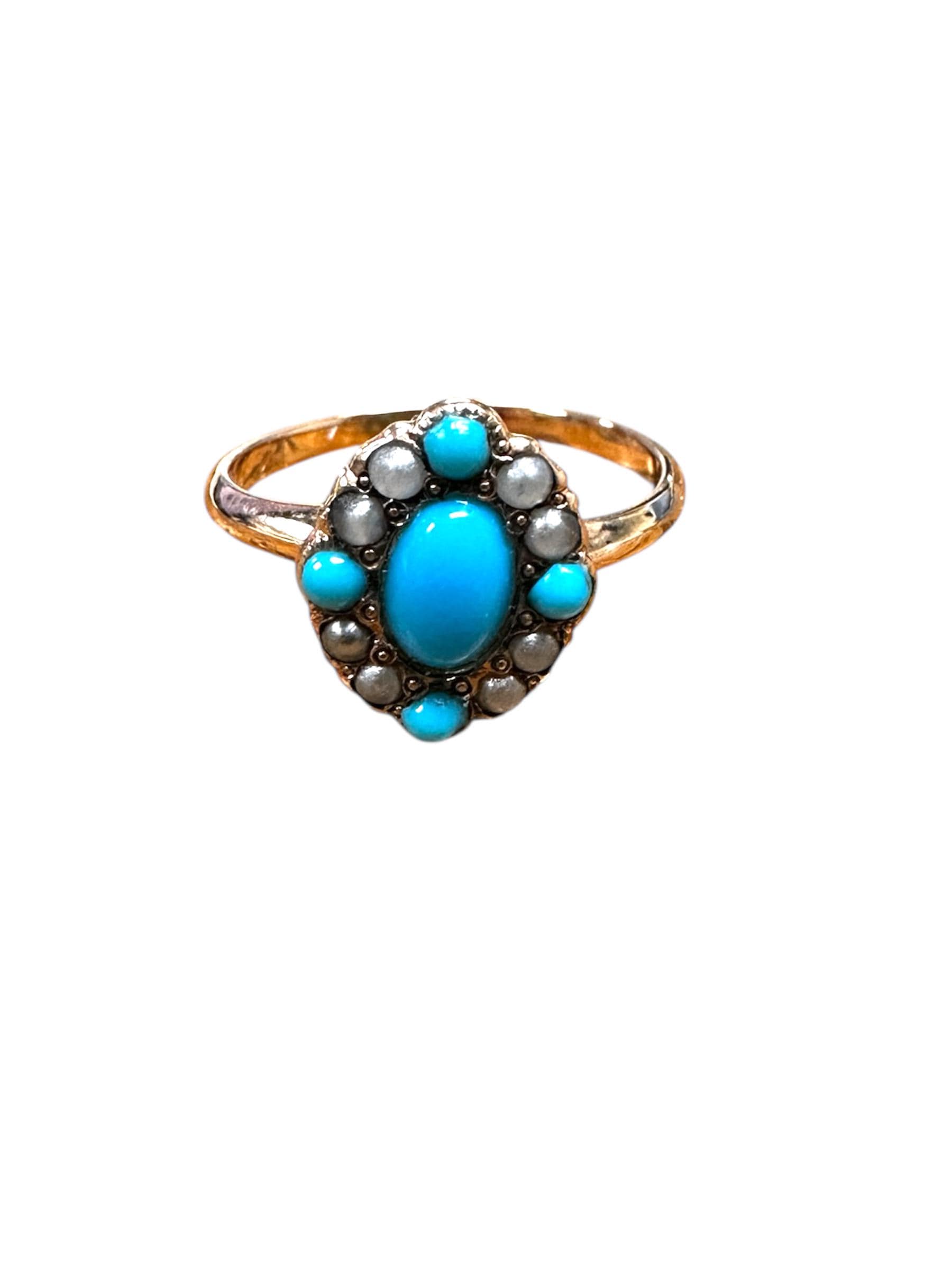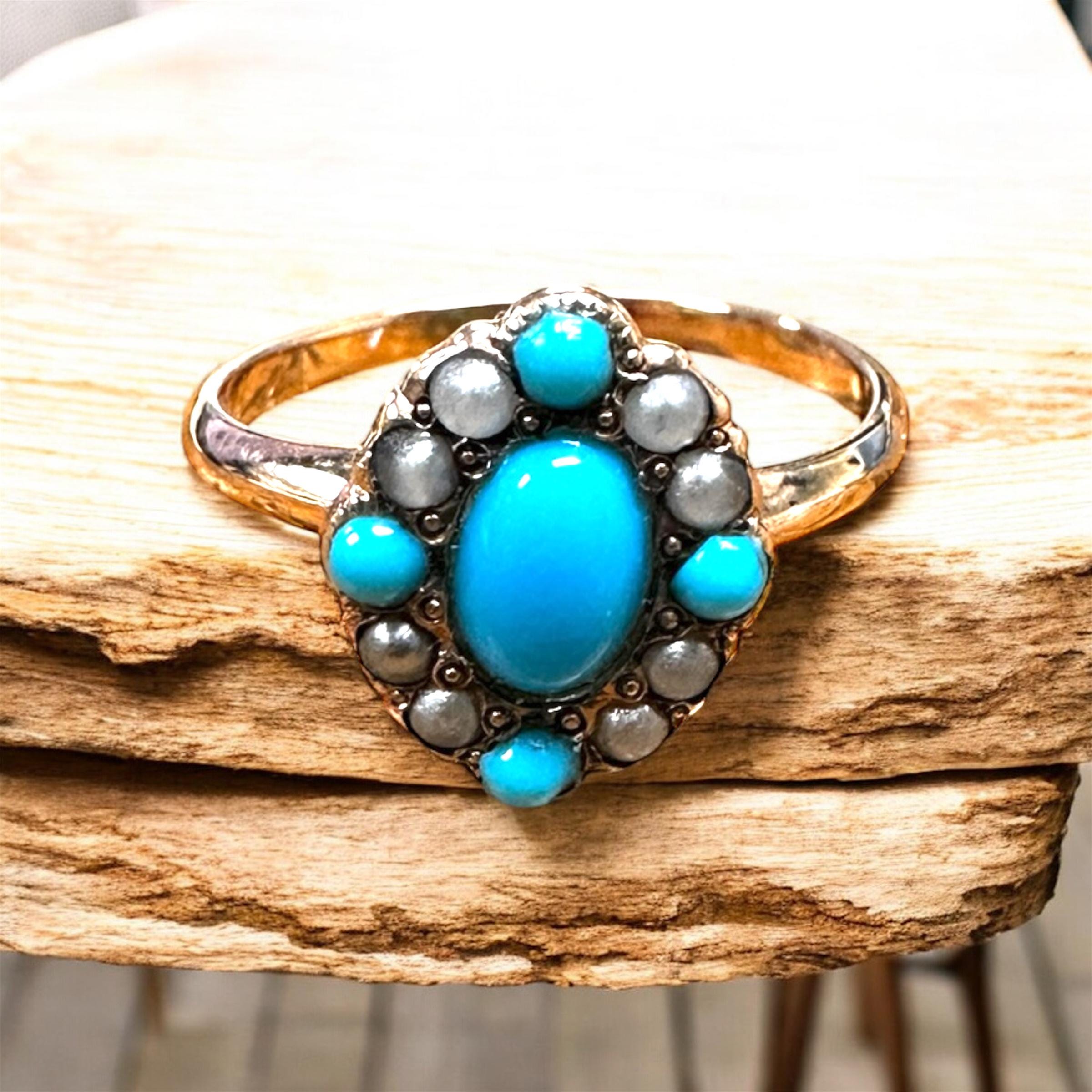 Authentic Victorian 10 karat yellow gold turquoise and pearl ring. Perfect birthstone ring for those born in the month of December or for the avid turquoise lover! The ring is a romantic symbol of a long gone era in time. Dainty and nostalgic the ring will become a favorite the minute you put it on your finger!