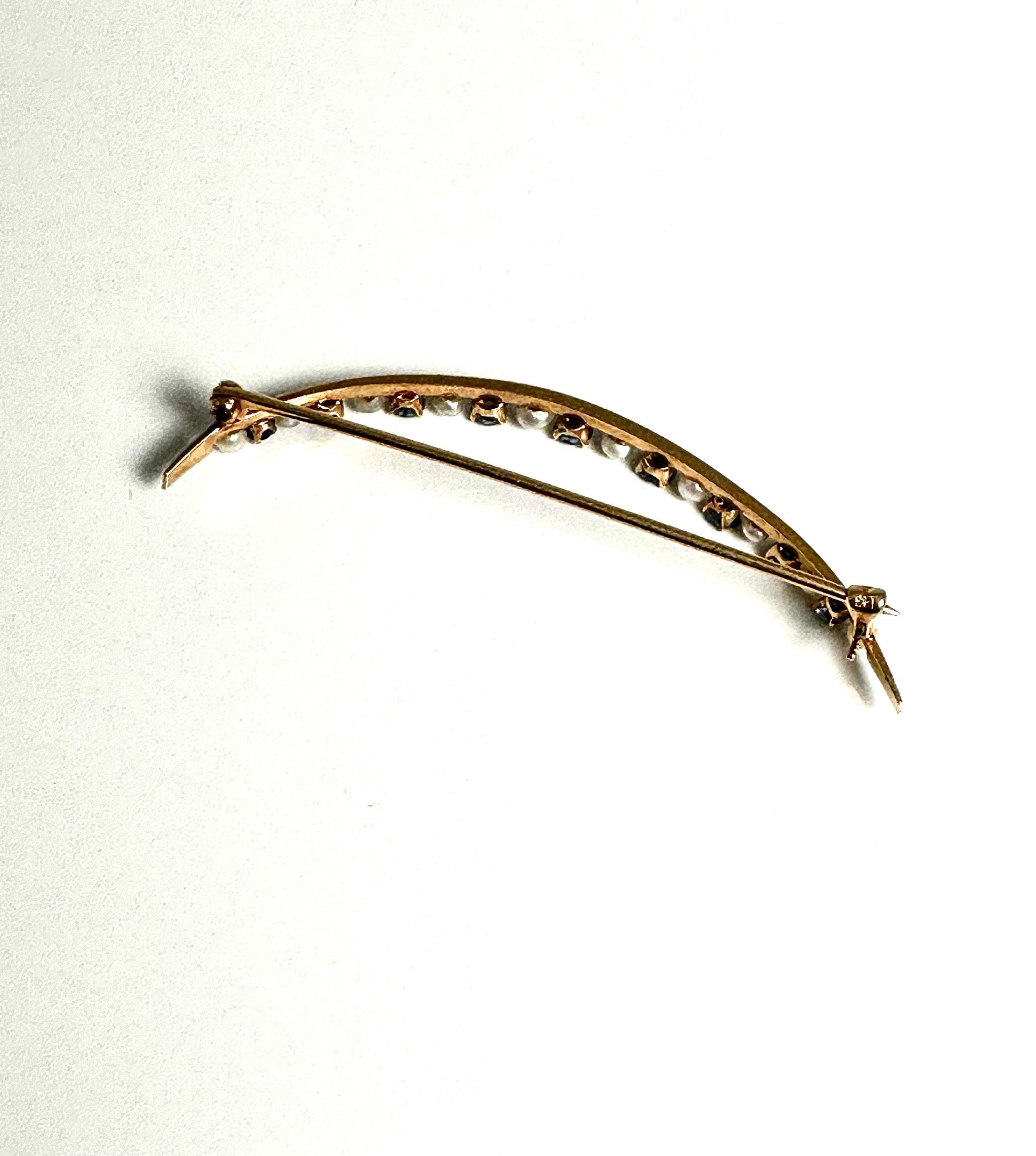 Our stunning Edwardian 14 karat yellow gold blue sapphire and cultured pearl crescent pin exudes the allure and grace of a bygone era, making it a treasure to cherish and pass down through generations. The crescent design is showcasing alternating blue sapphires and cultured pearls. Embrace the romance and elegance the pin exudes and let it become a cherished heirloom that tells a story of grace and sophistication for years to come.