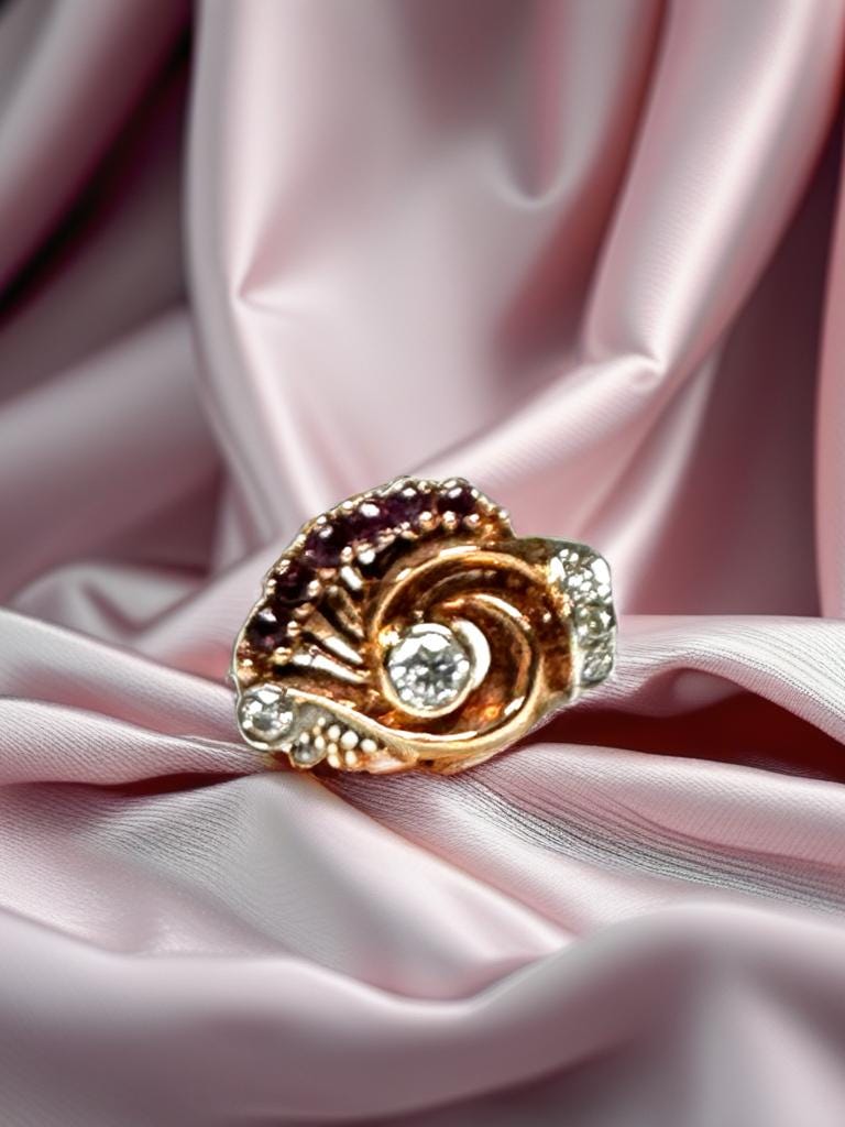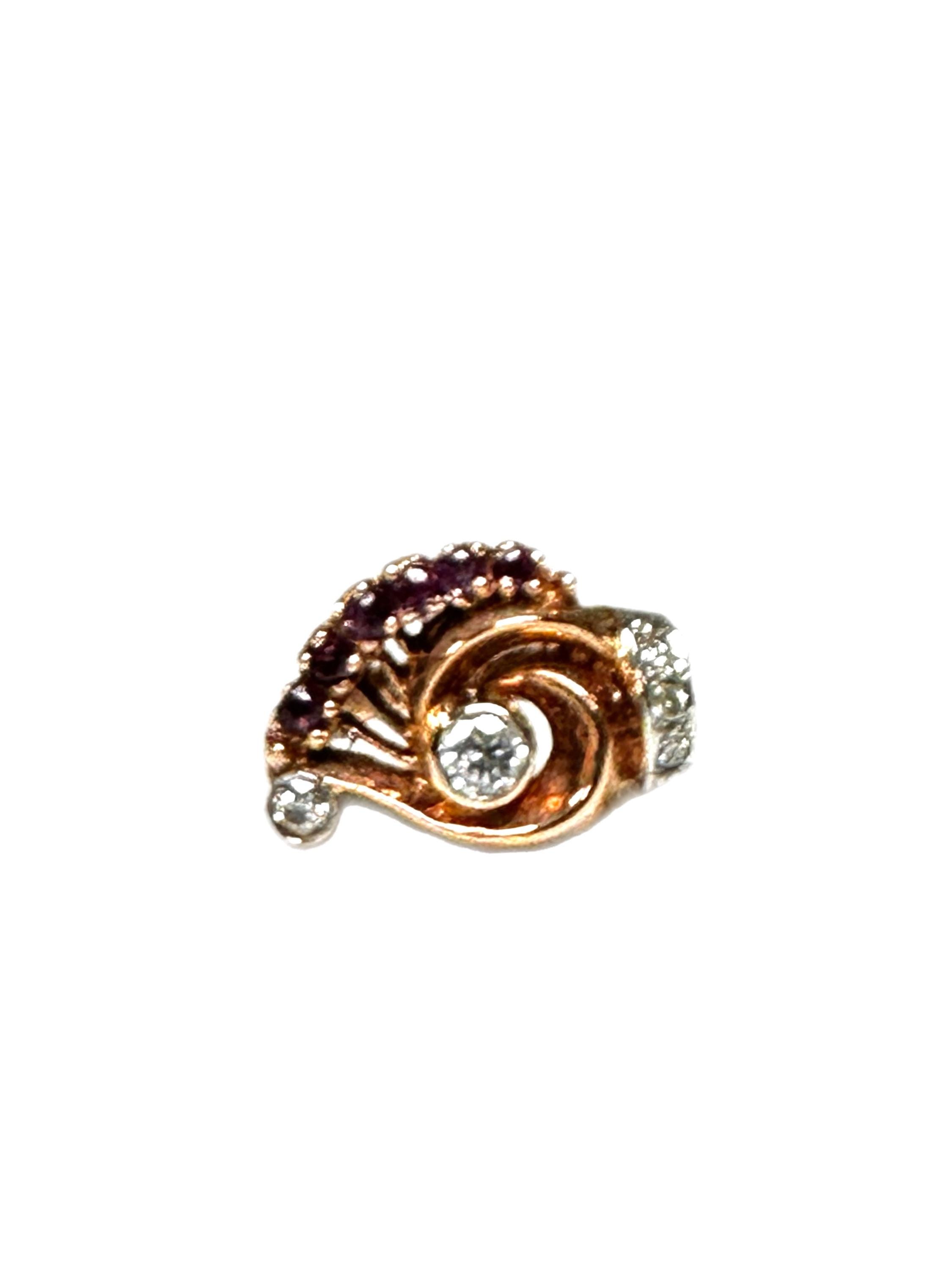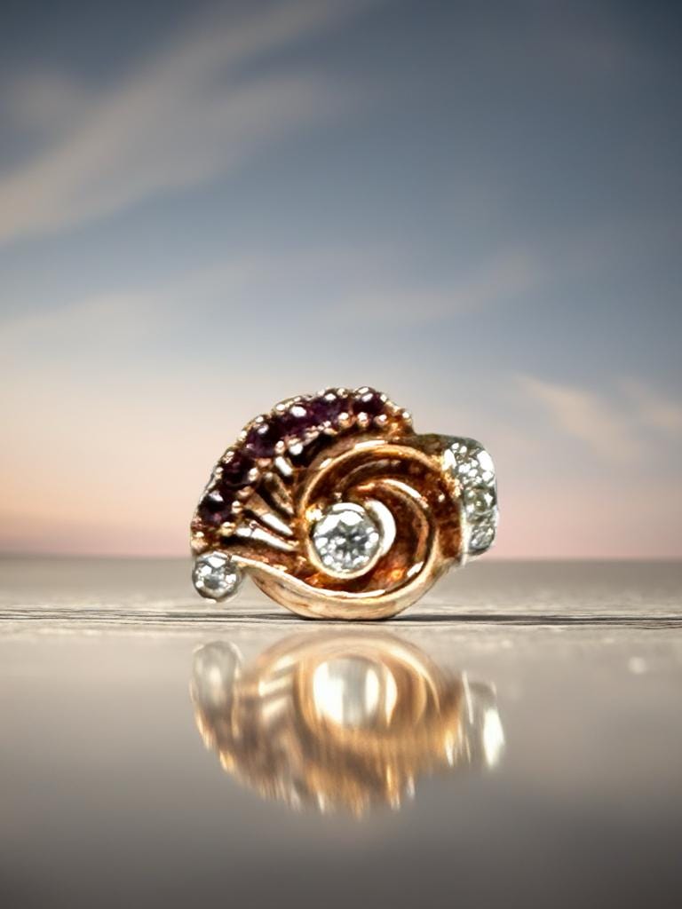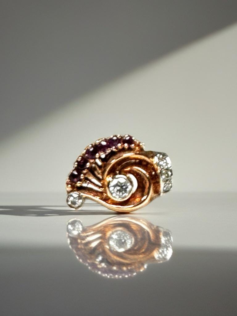 14 karat rose gold ruby and diamond retro ring. A unique 1935 ring with style and grace. It is a wonderful statement ring.