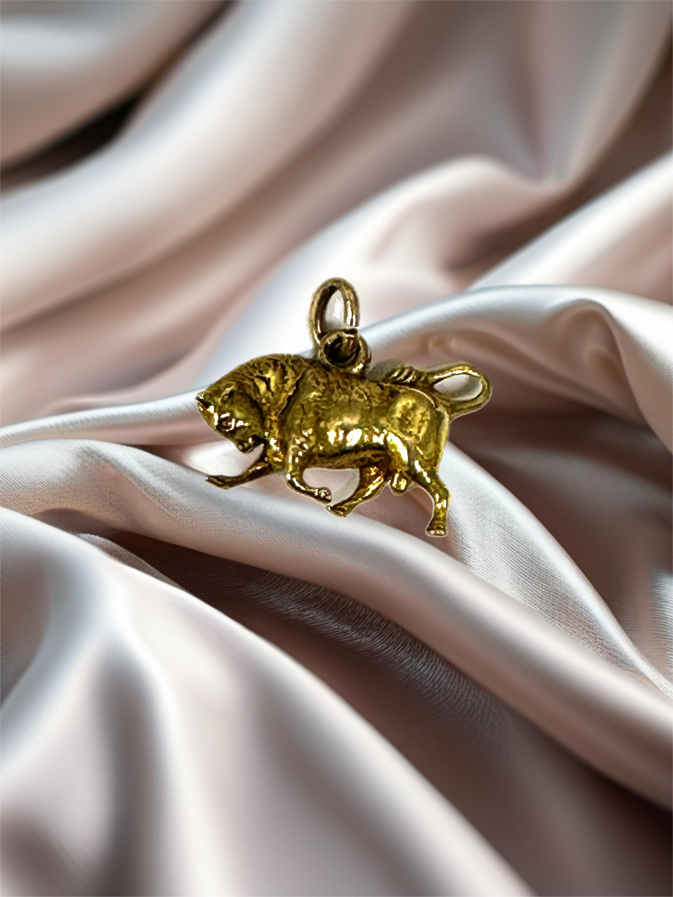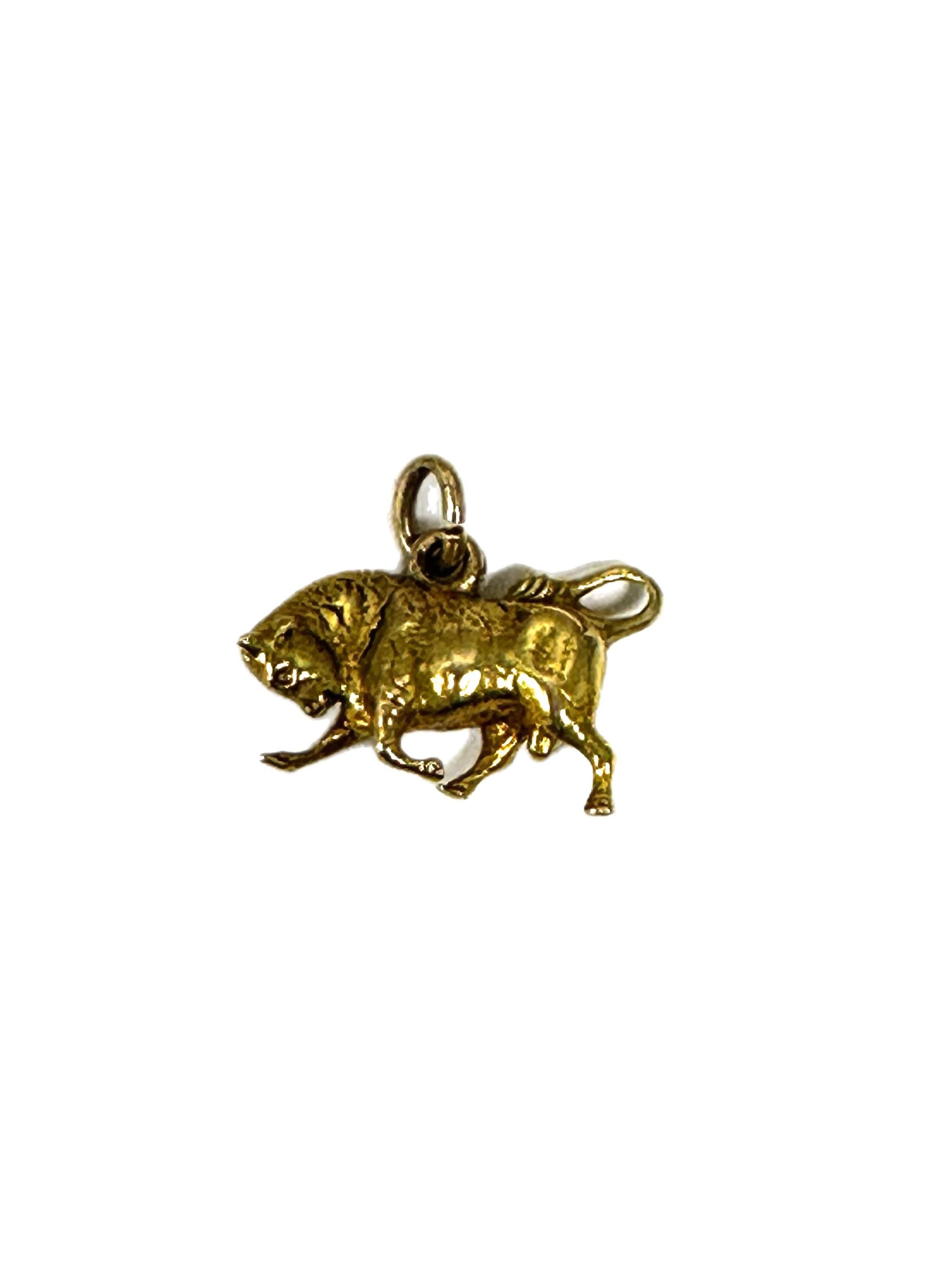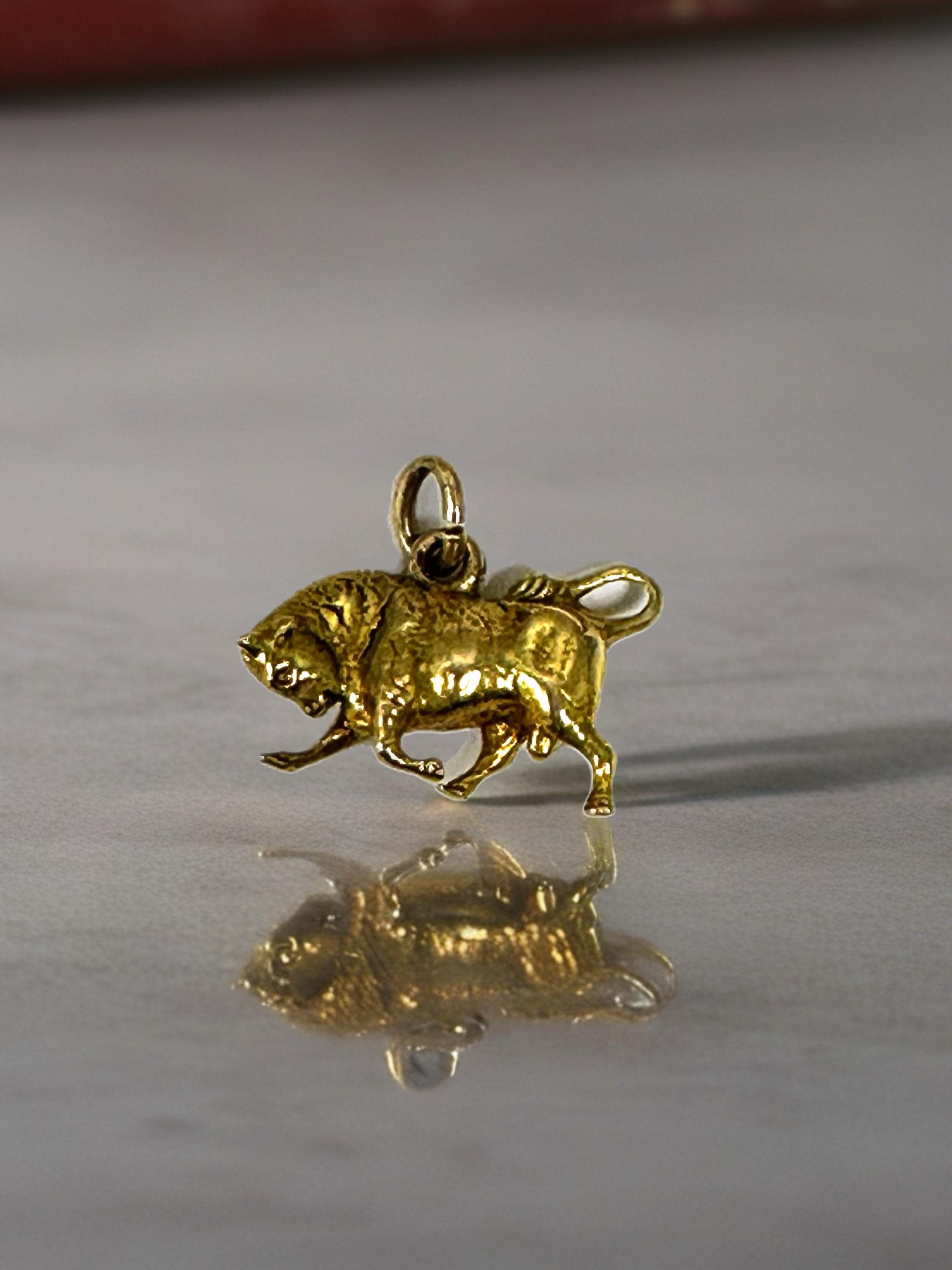 This is a 14 karat (stamped) yellow gold bull or buffalo...I am not sure how to tell the difference. Either way it looks as if he's ready to charge! A great addition to your charm bracelet or a fun pendant to wear!