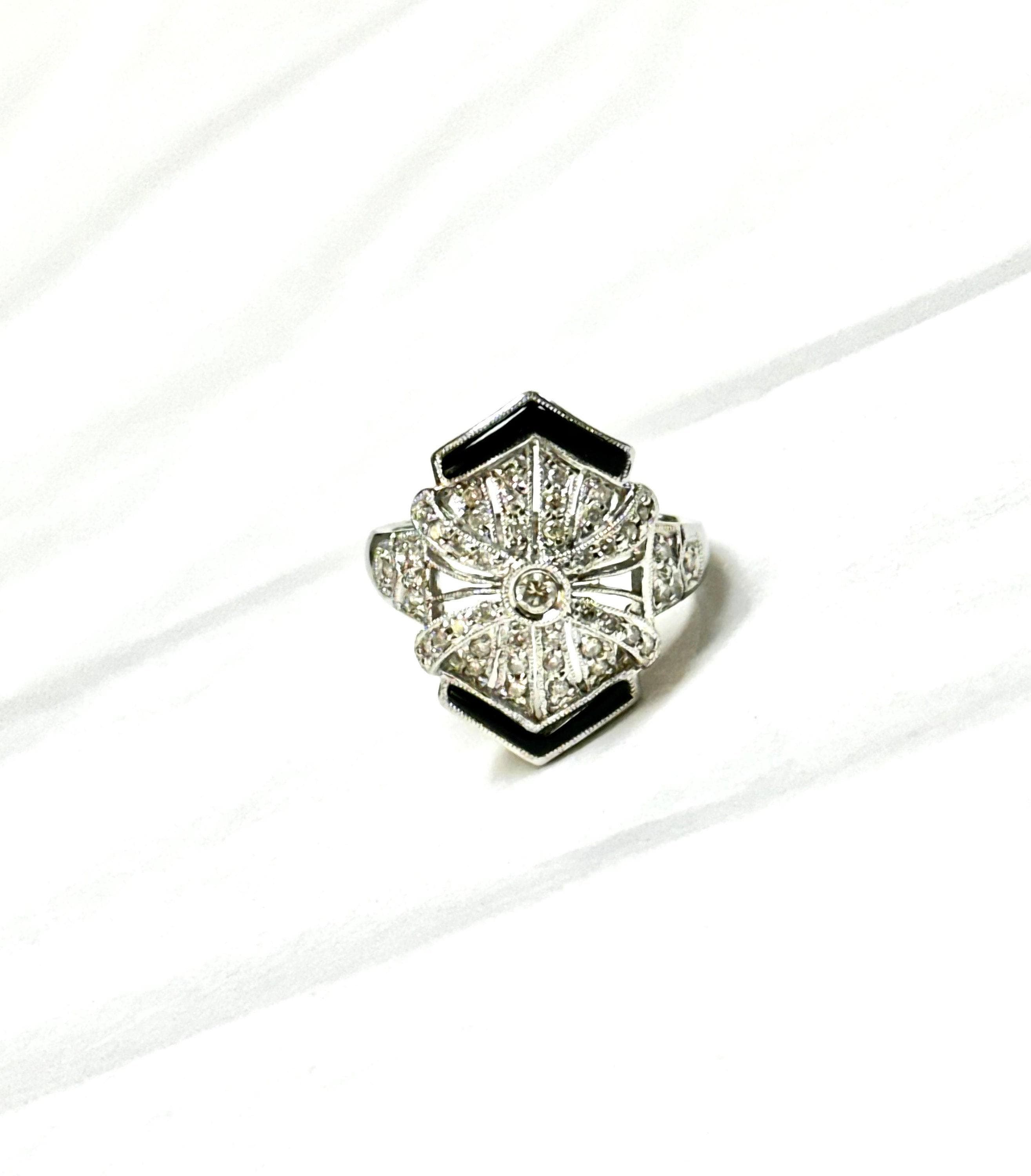 Add a touch of timeless elegance to your jewelry collection with this stunning 14 karat white gold diamond and black onyx Art Deco style ring. The contrasting black onyx and diamonds create a striking look that is perfect for any occasion. This exquisite ring is a true statement piece that effortlessly combines classic Art Deco design with modern sophistication. Whether you're dressing up for a night out or looking for a unique accessory to elevate your everyday style, this ring is sure to be a showstopper. Handcrafted with care and attention to detail, this exceptional piece will be a treasured addition to your jewelry repertoire.