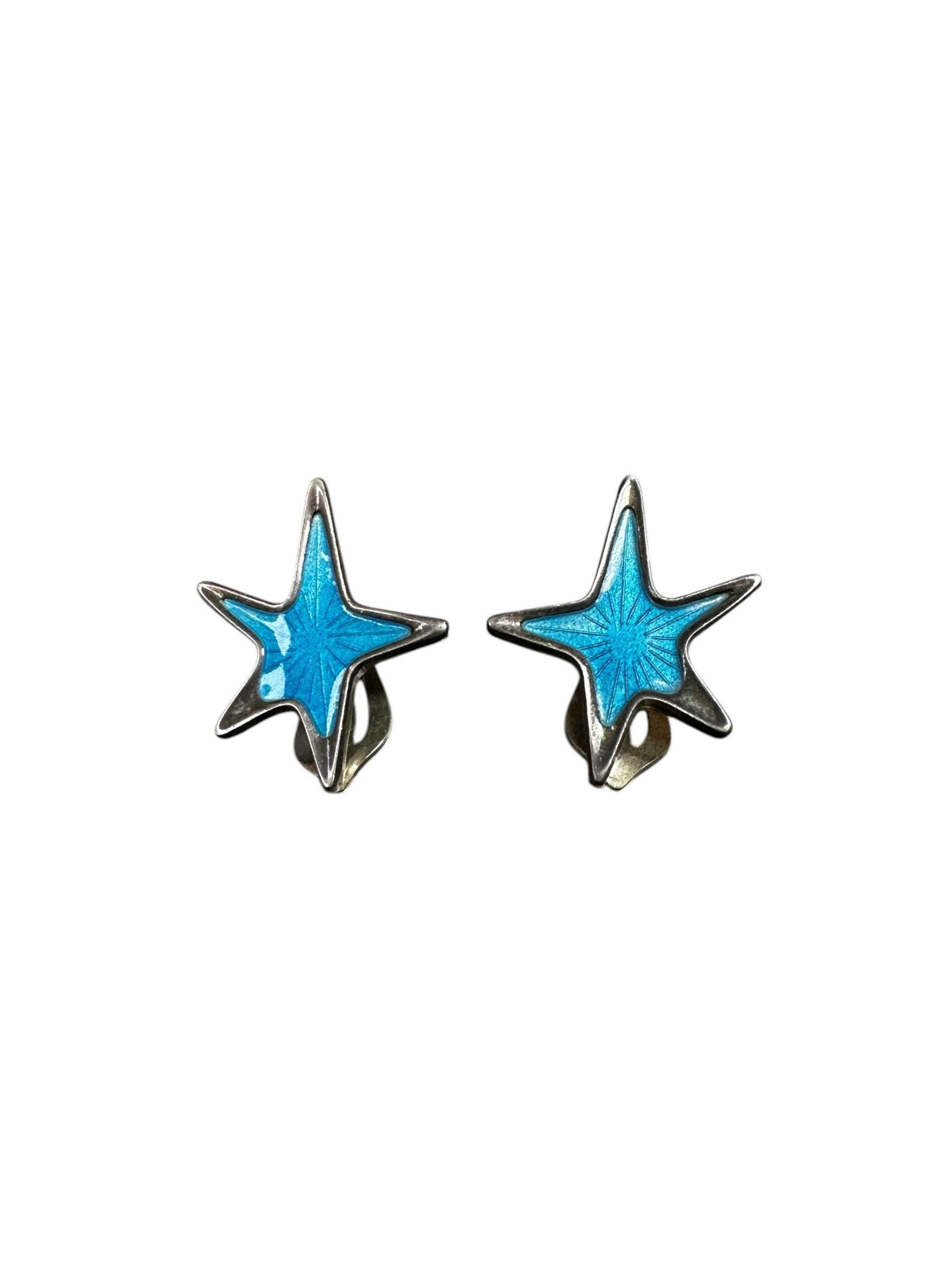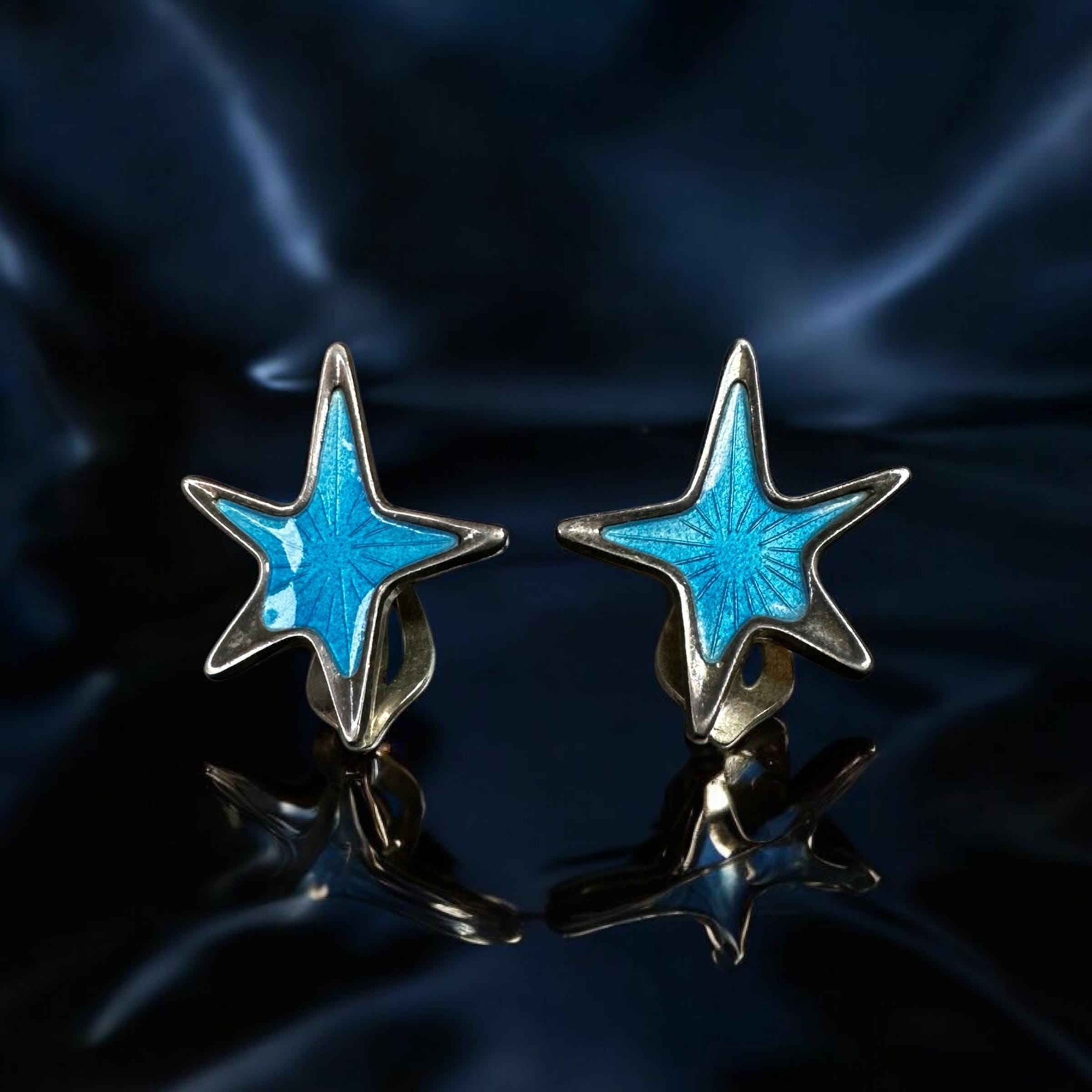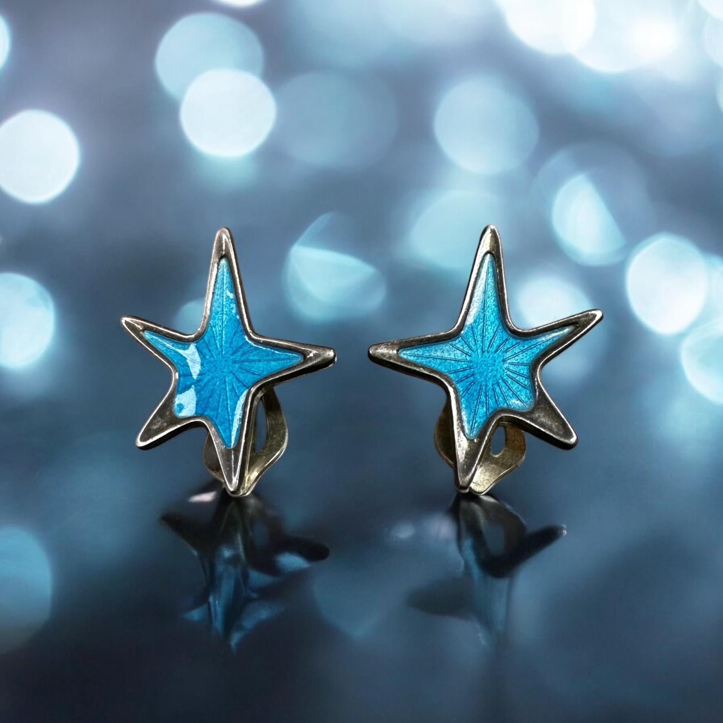 These mid century modern earrings feature an atomic modernist star design, accented with blue enamel Guilloche with a stunning ray-like pattern. They were made in Denmark by MCM designer MEKA. Both earrings are signed "Meka Sterling Denmark"