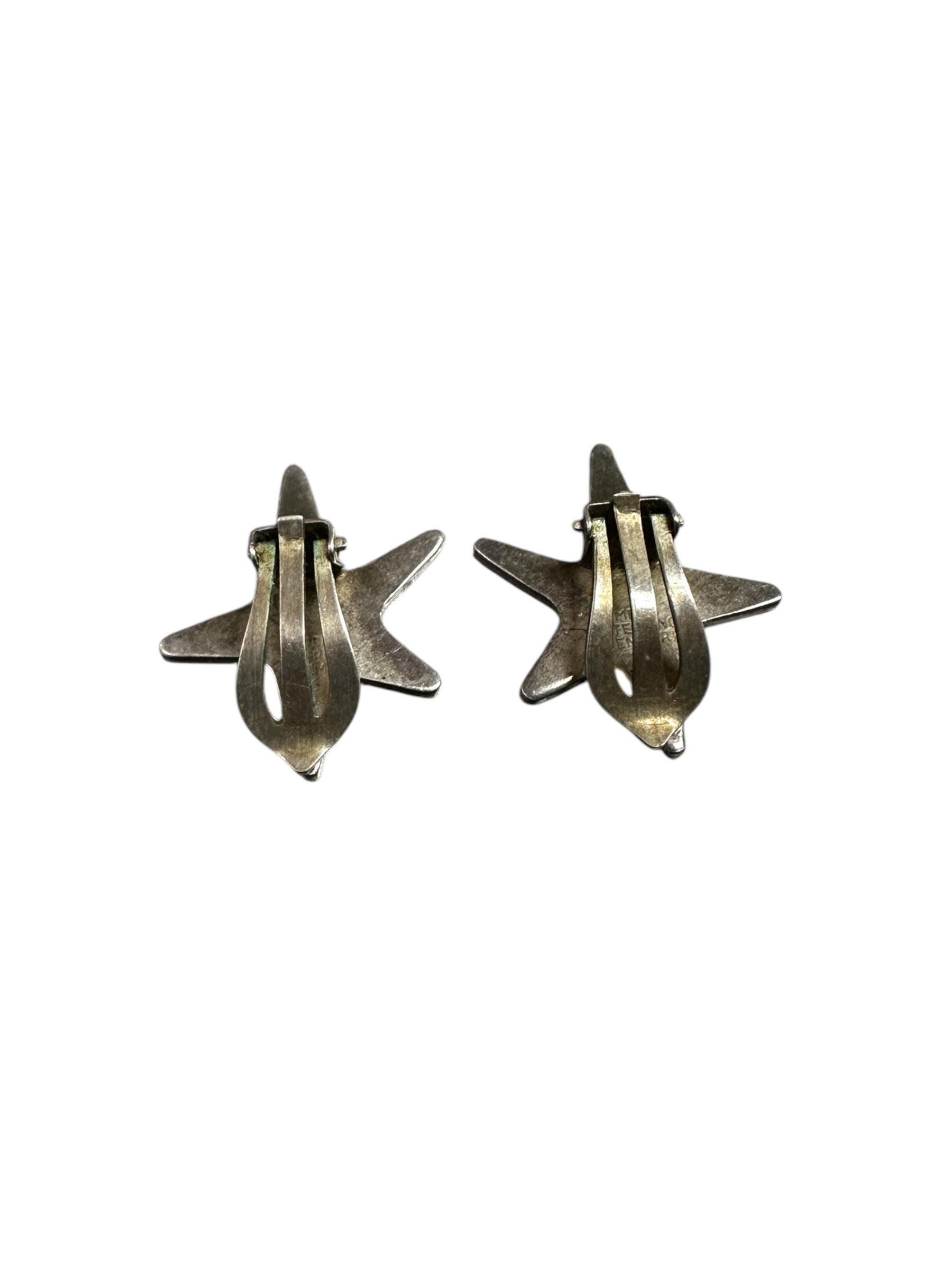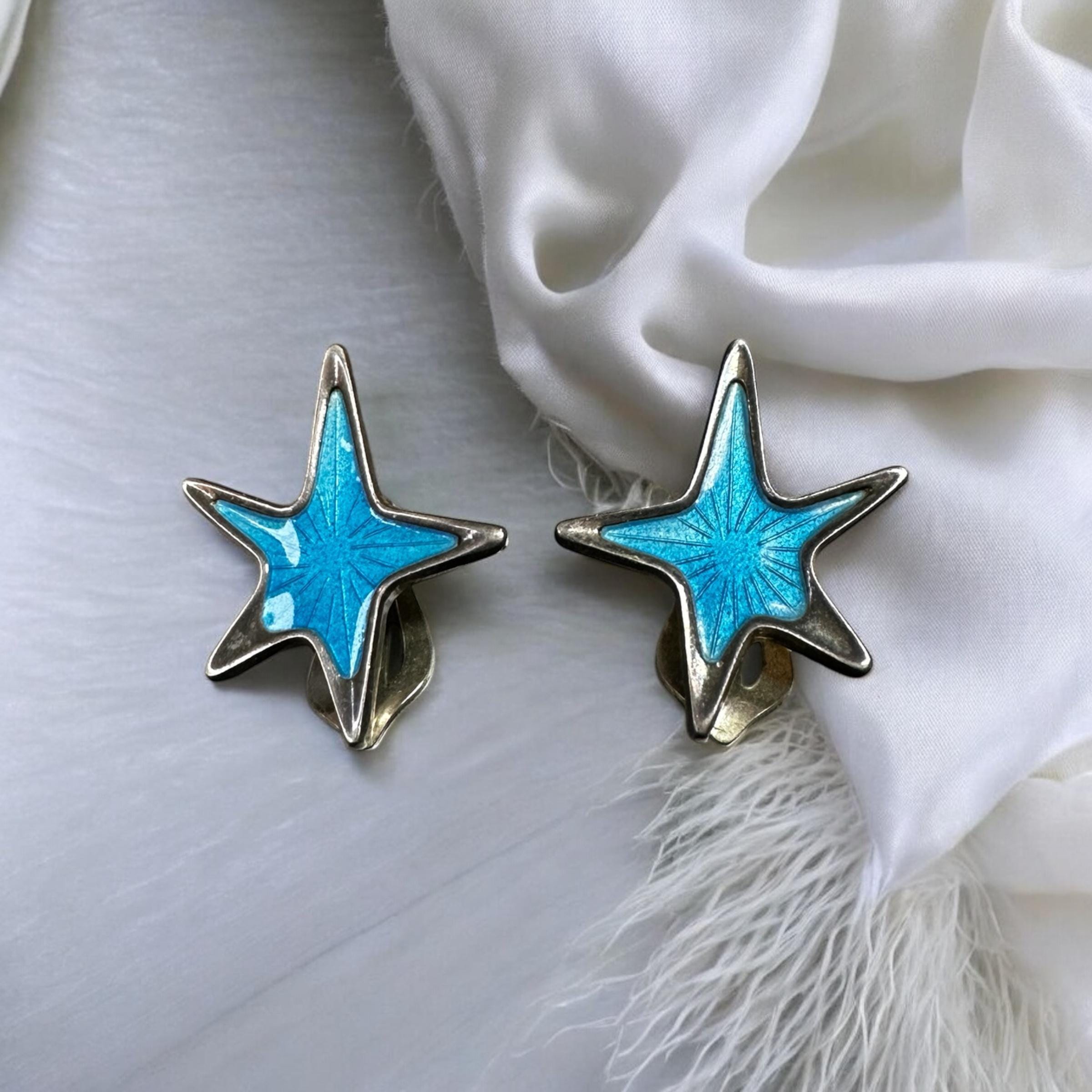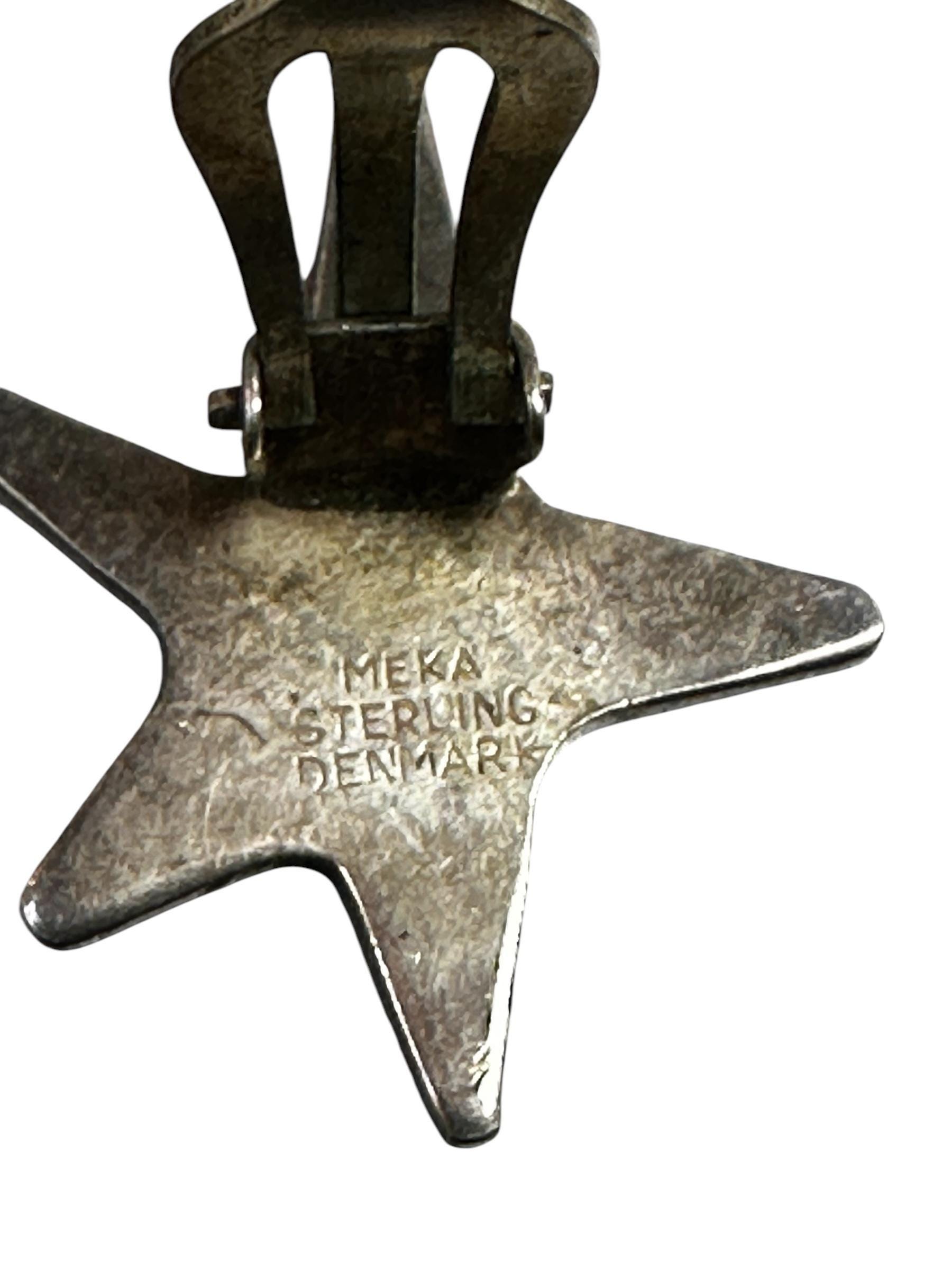 These mid century modern earrings feature an atomic modernist star design, accented with blue enamel Guilloche with a stunning ray-like pattern. They were made in Denmark by MCM designer MEKA. Both earrings are signed "Meka Sterling Denmark"