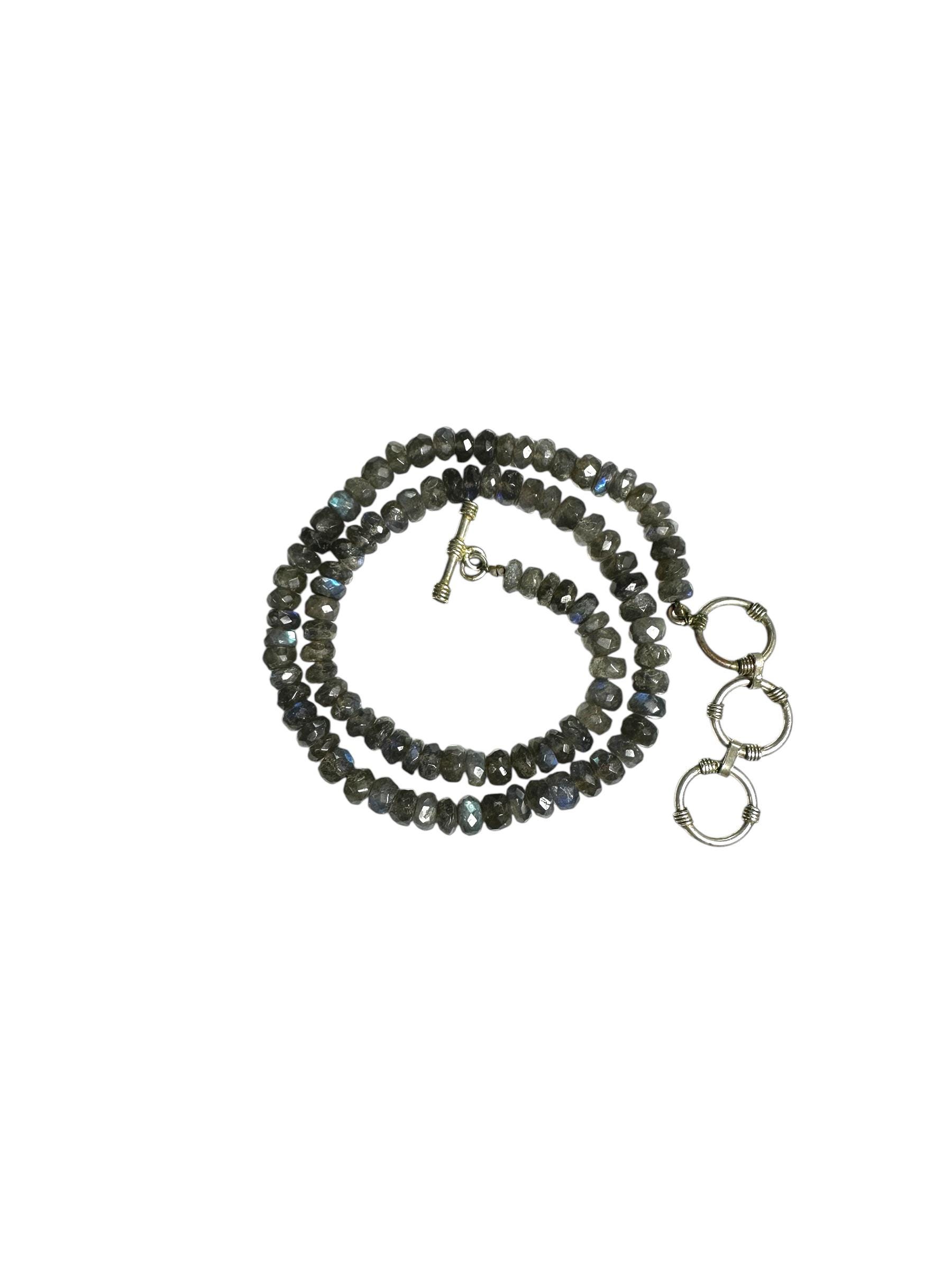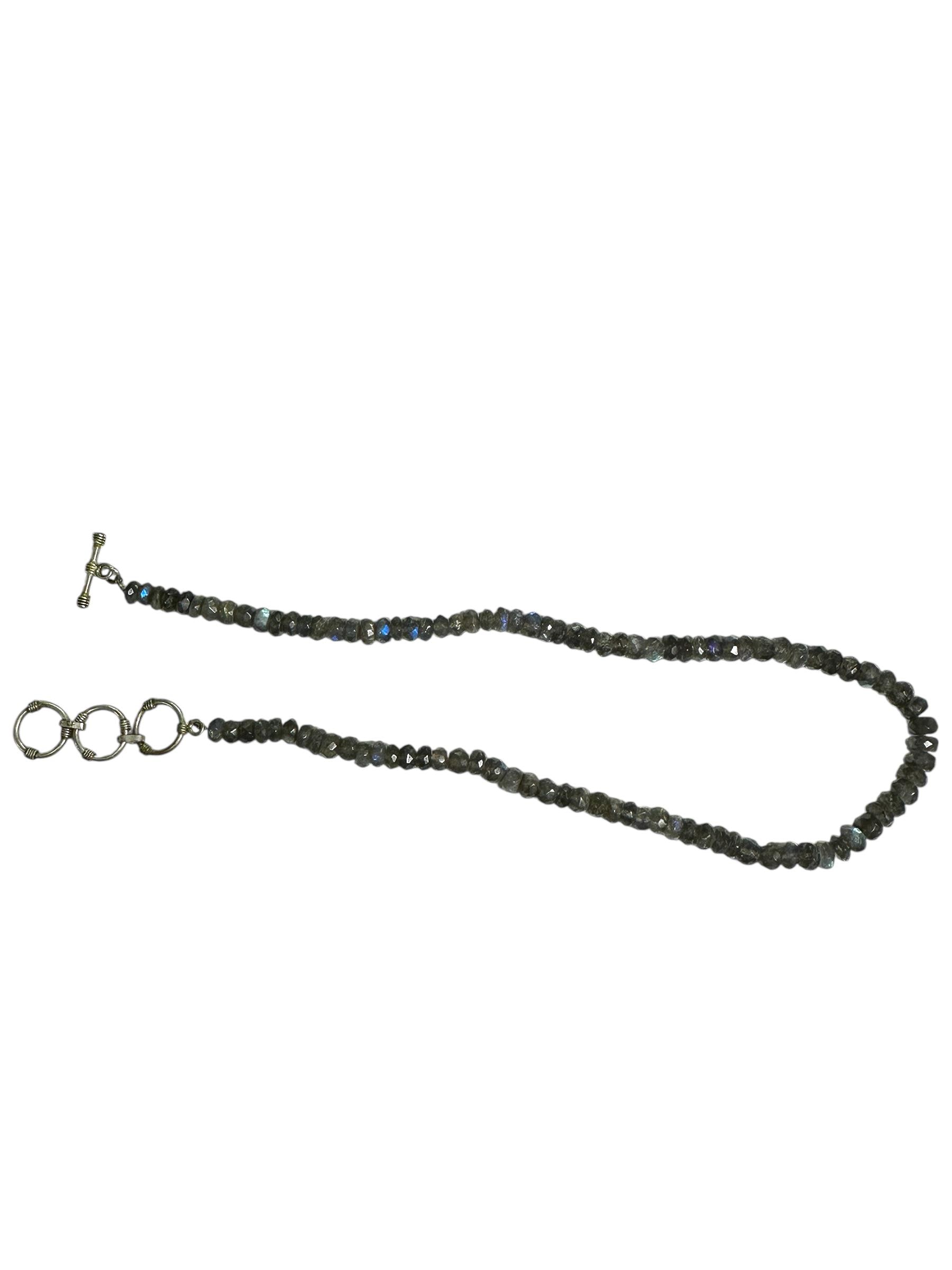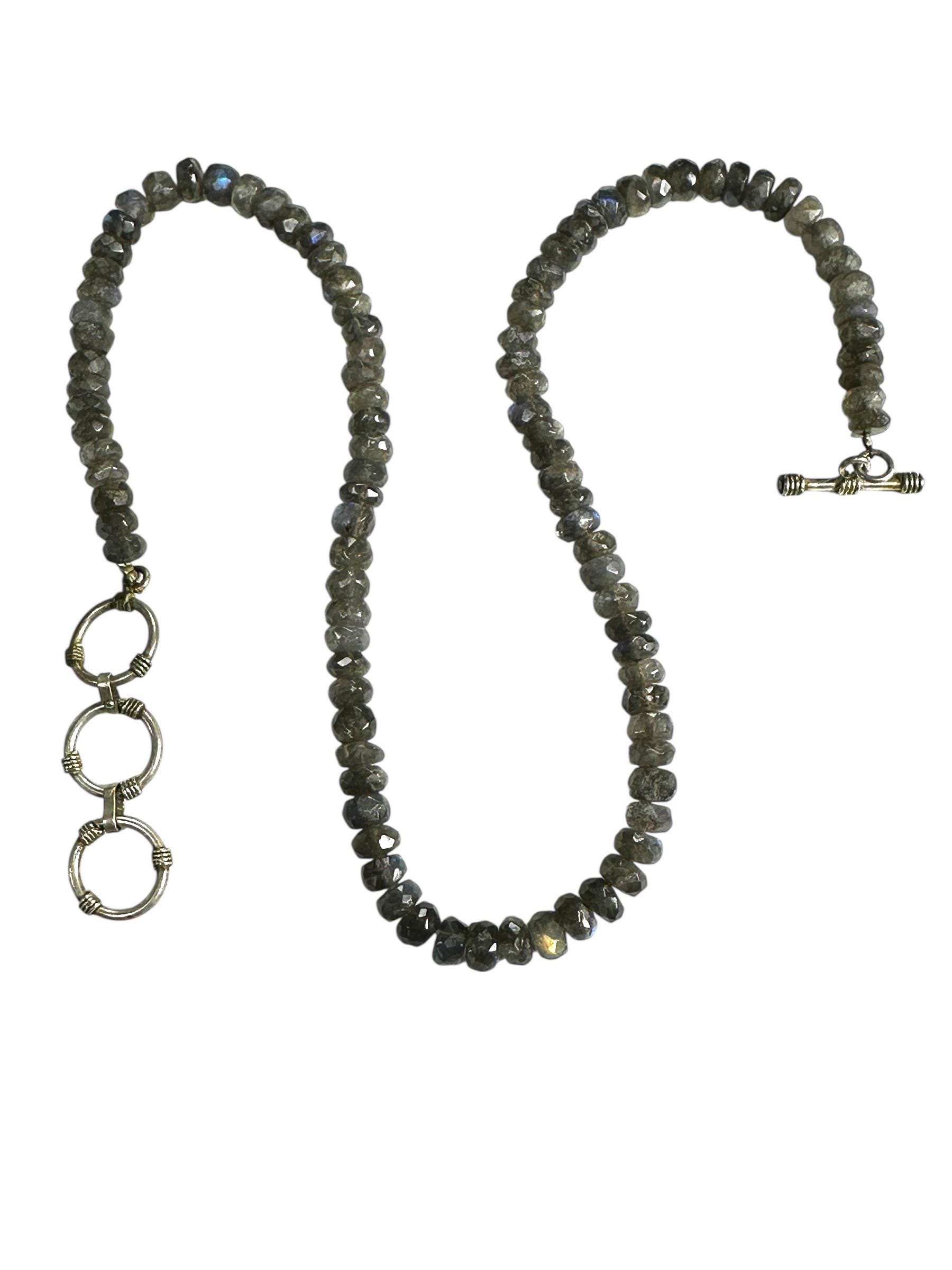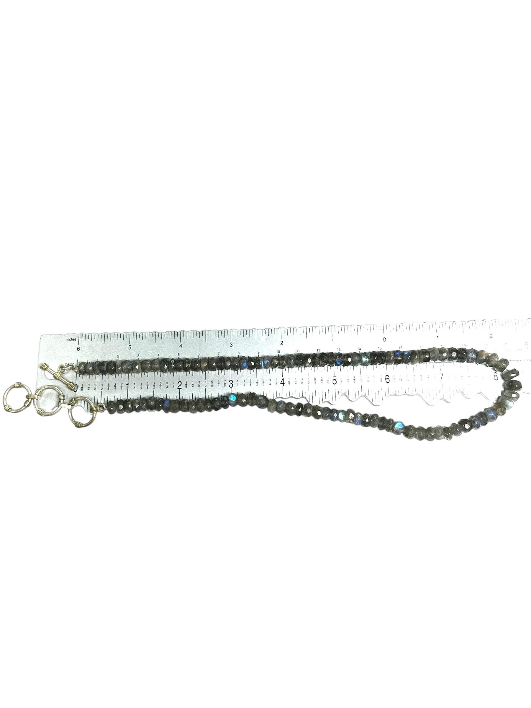 This necklace features shimmering faceted Labradorite beads, each measuring approximately 7.00mm in diameter. The strand is designed at 17 inches and extends to 19 inches with a silver tone clasp. There is a subtle play of color making the necklace versatile...and interesting necklace that will grab the attention of others.