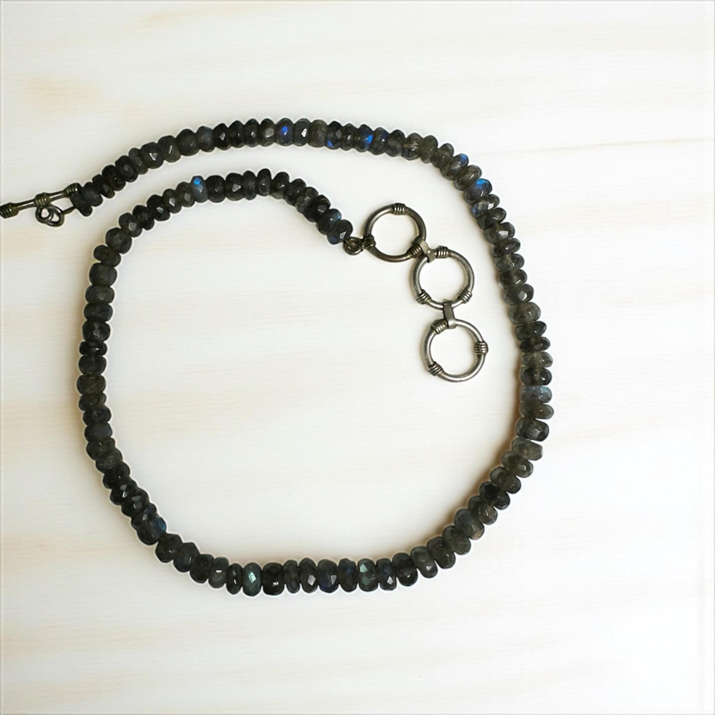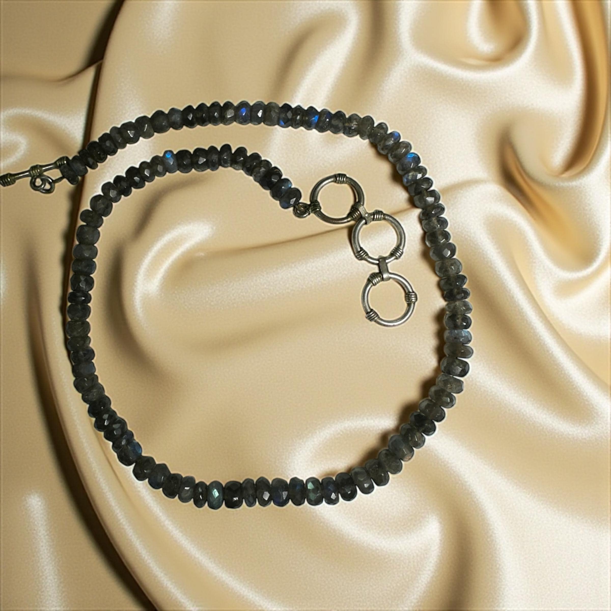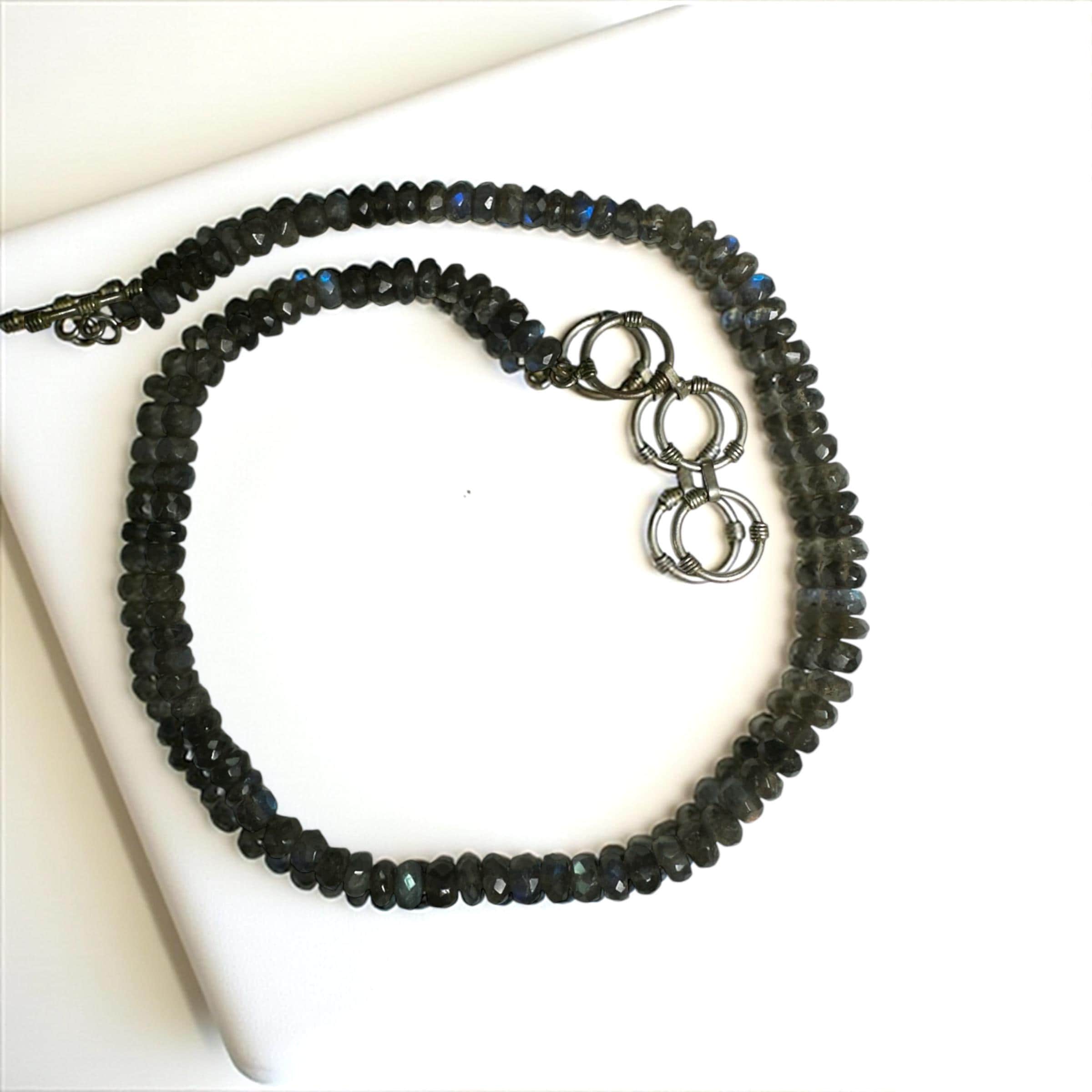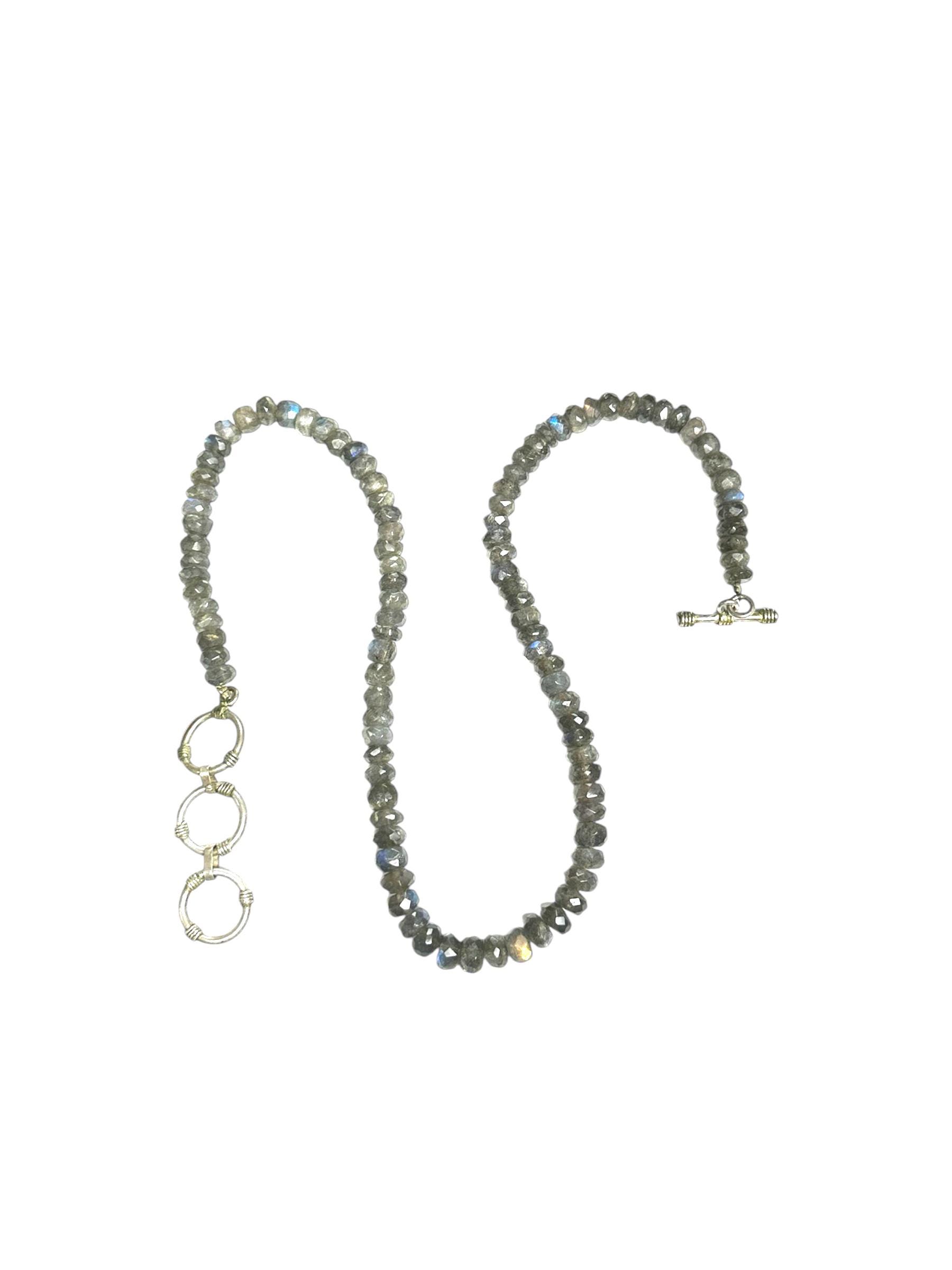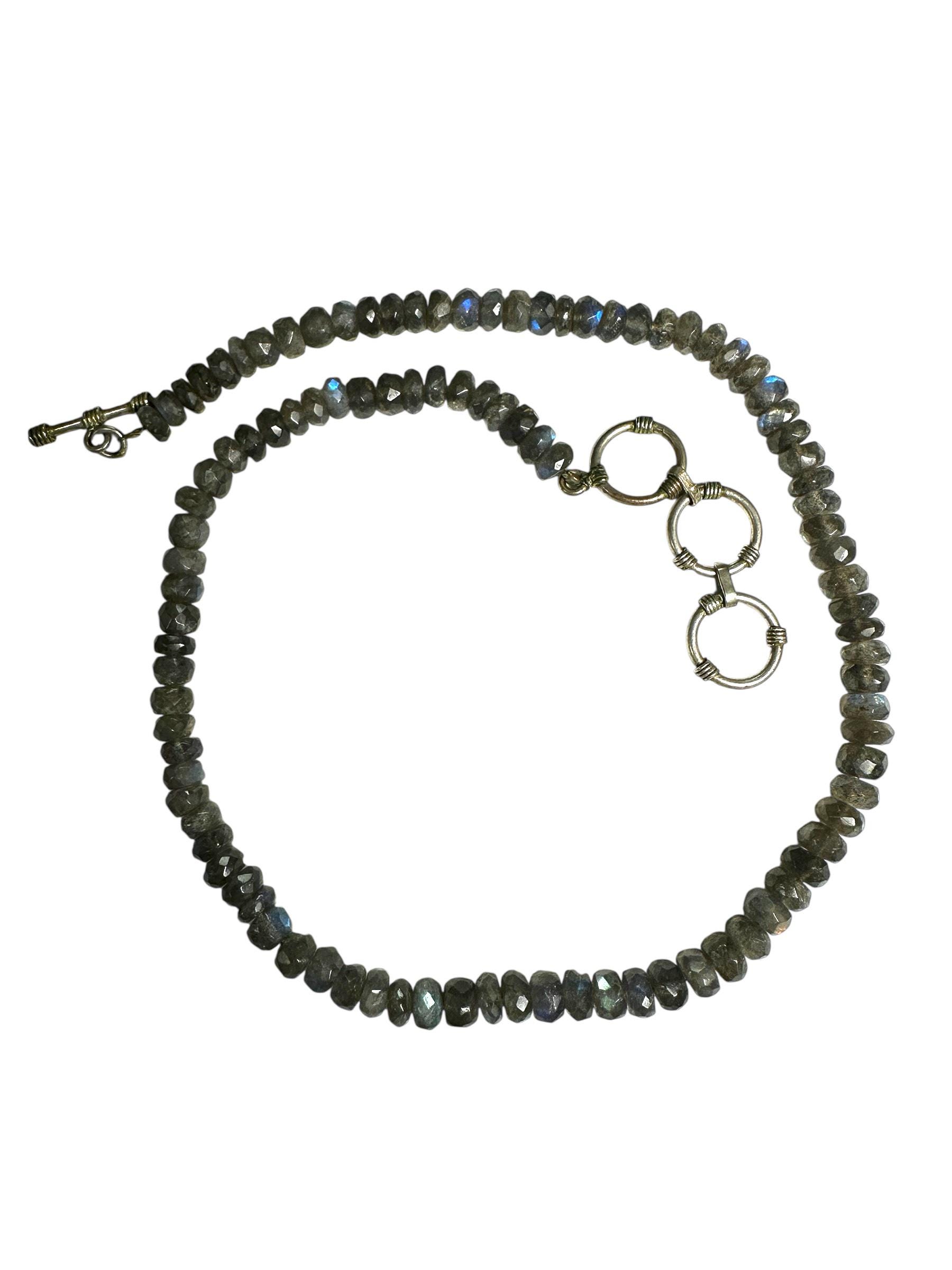 This necklace features shimmering faceted Labradorite beads, each measuring approximately 7.00mm in diameter. The strand is designed at 17 inches and extends to 19 inches with a silver tone clasp. There is a subtle play of color making the necklace versatile...and interesting necklace that will grab the attention of others.