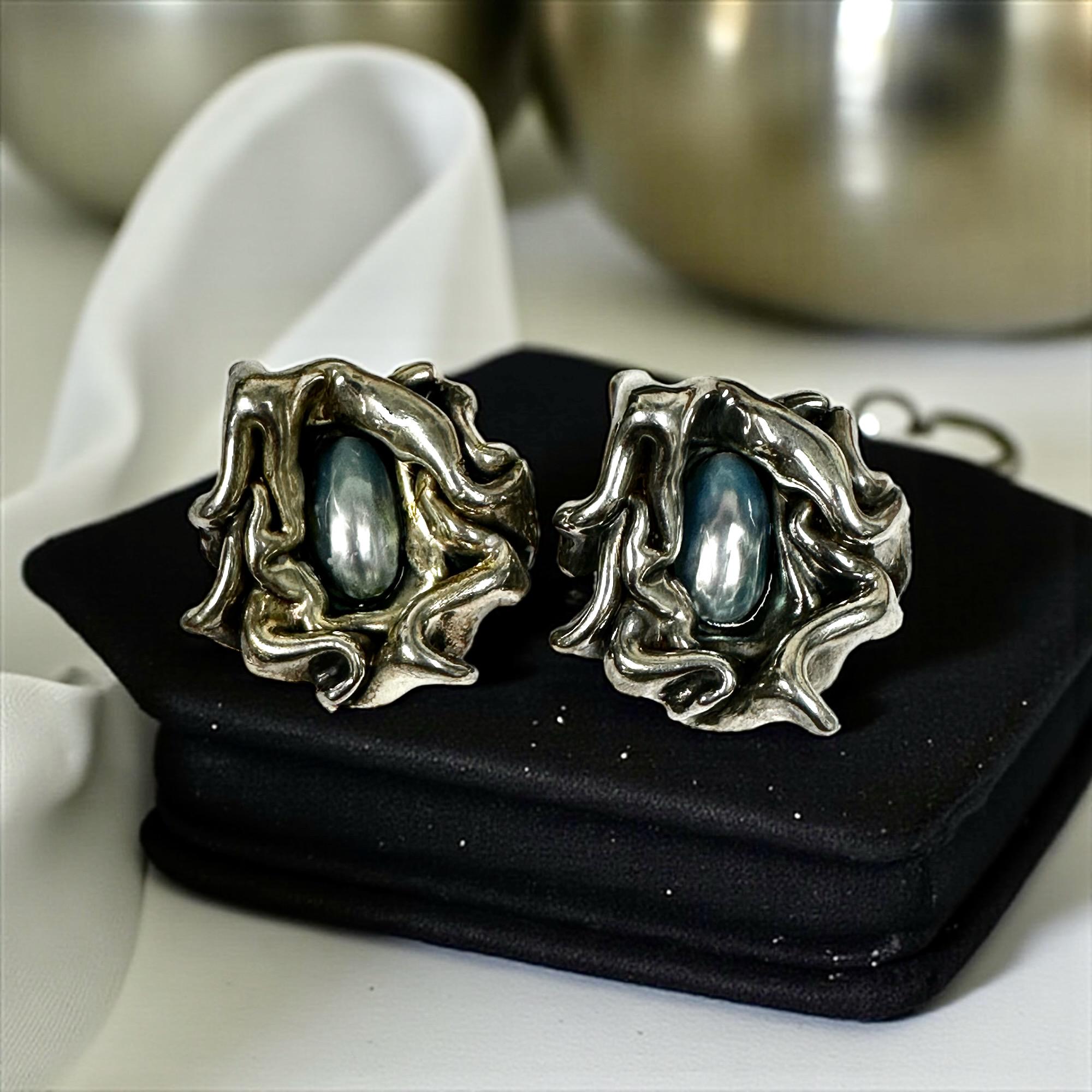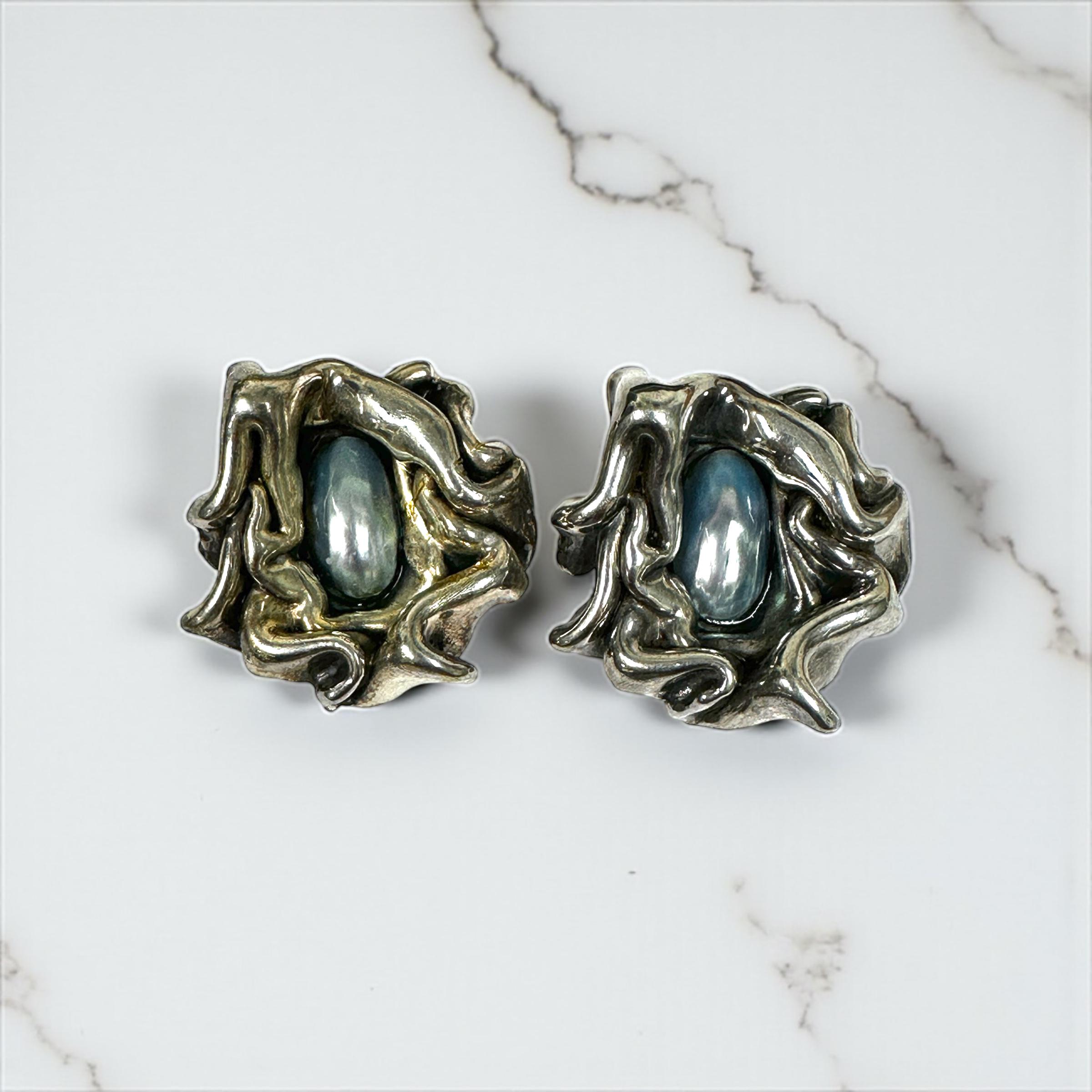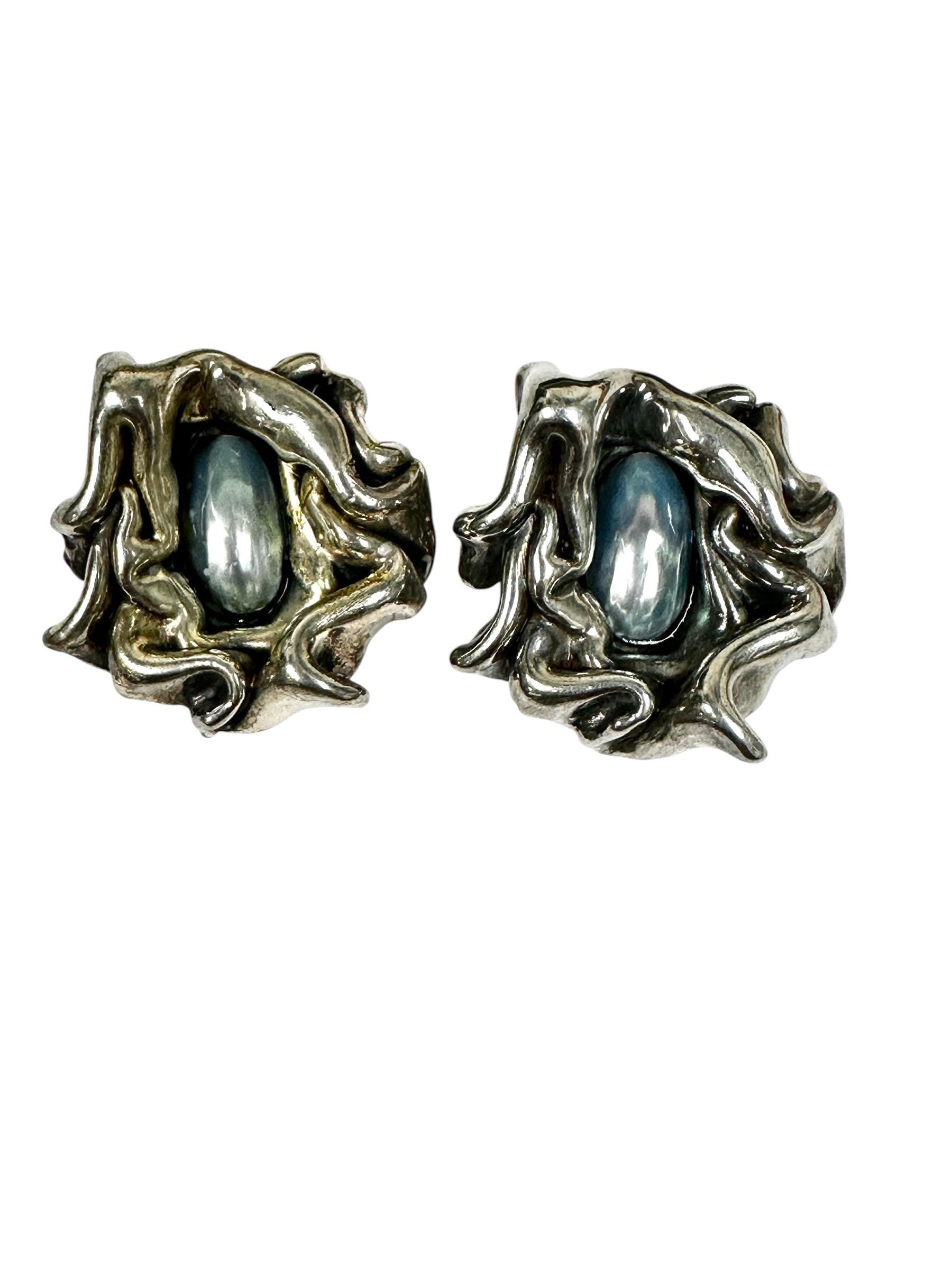 Unique sterling silver clip-on earrings signed A. IDAN. Each earring is set with an elongated oval blister pearl. Handcrafted in sterling silver these standout earrings add an artistic flair to any outfit.