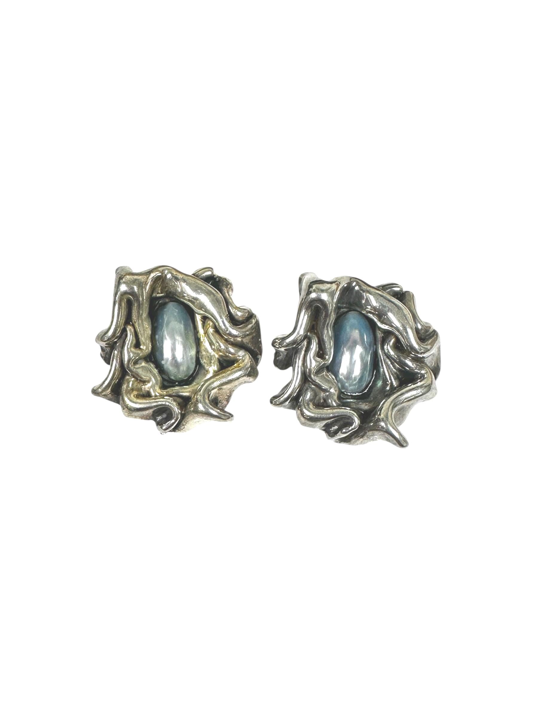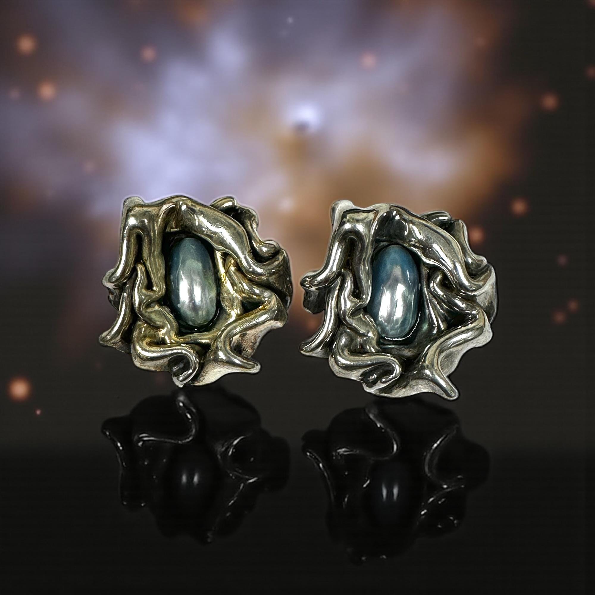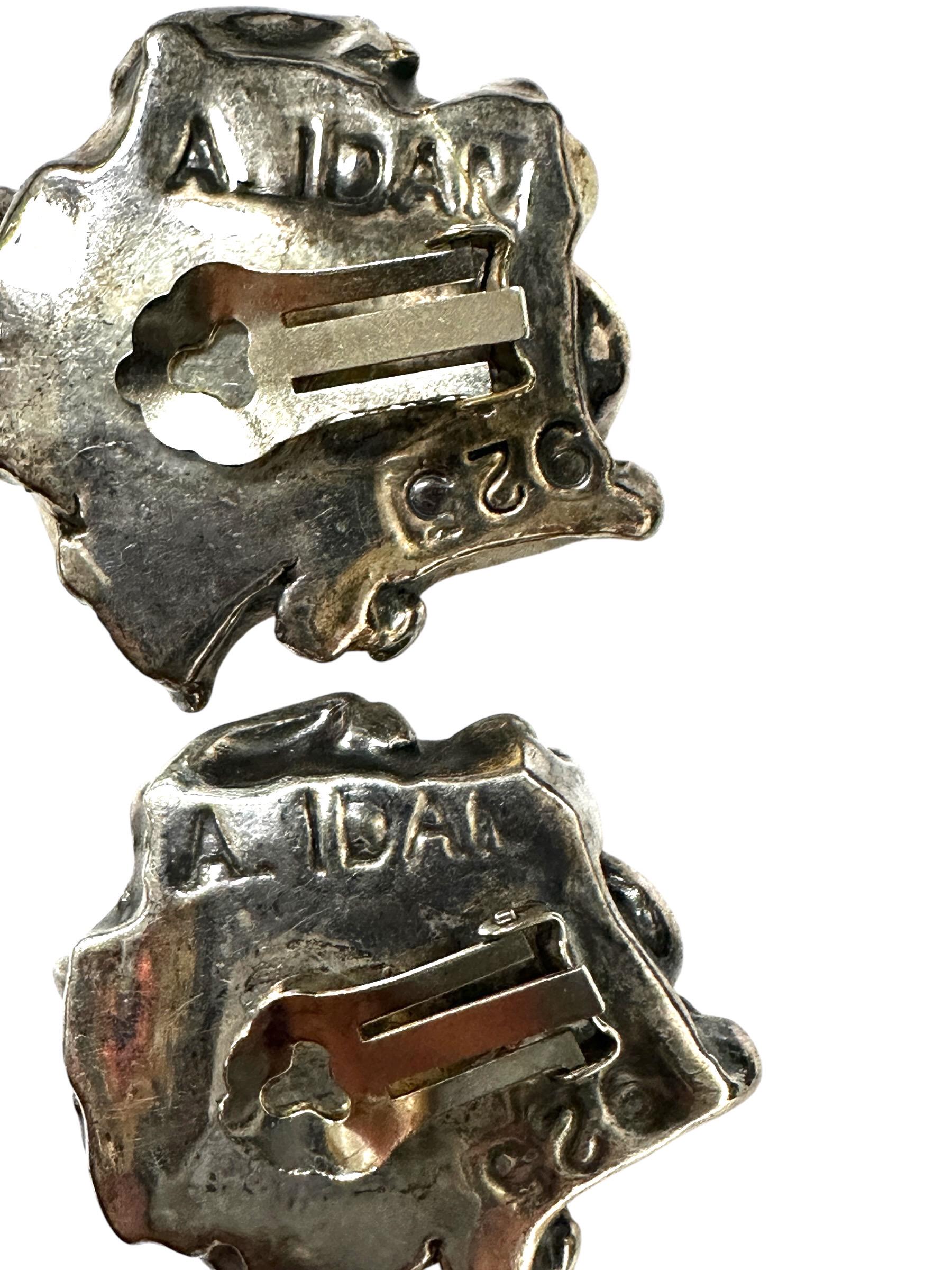 Unique sterling silver clip-on earrings signed A. IDAN. Each earring is set with an elongated oval blister pearl. Handcrafted in sterling silver these standout earrings add an artistic flair to any outfit.