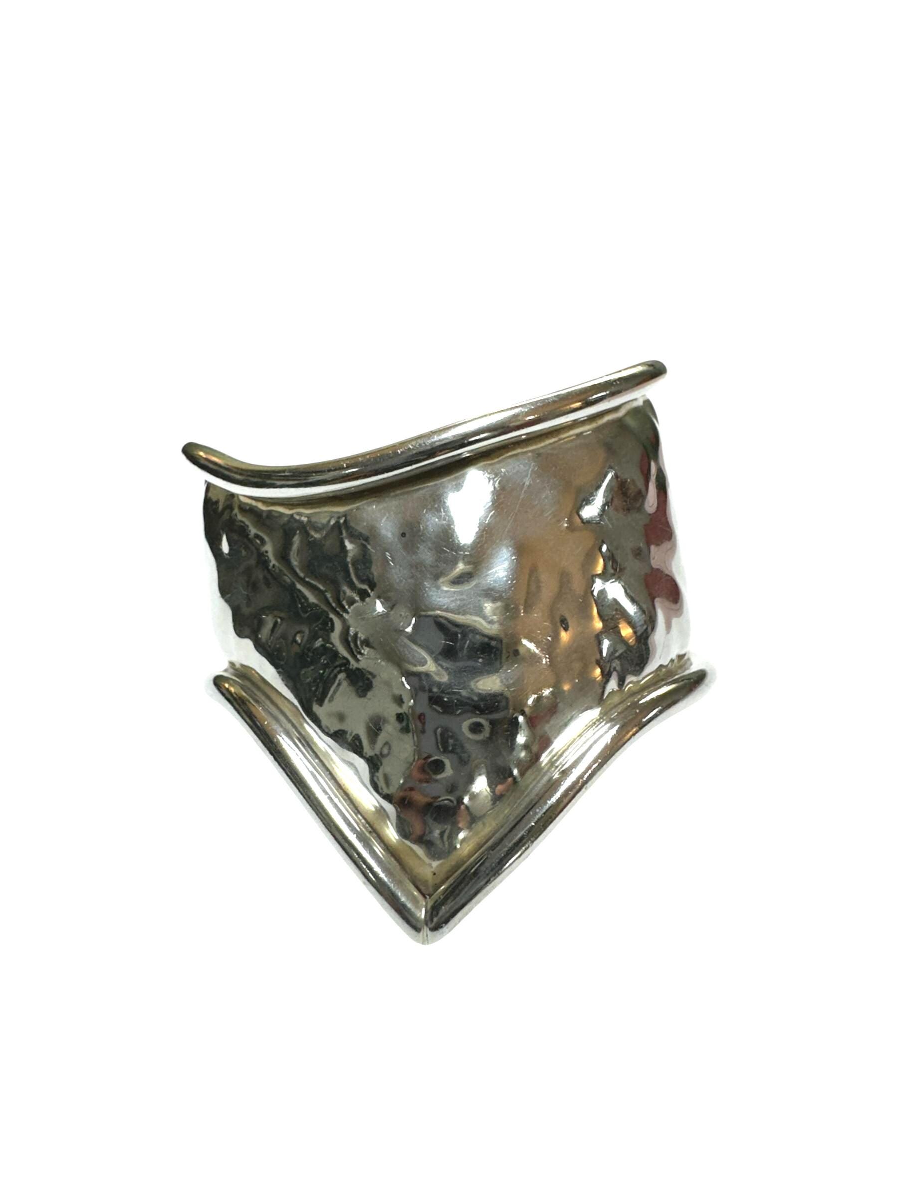 Vintage stylized sterling silver hammered cuff bracelet. The hammered bracelet comes to a dramatic point while the bracelet flows upward. Stylish and bold this bracelet is sure to grab attention!