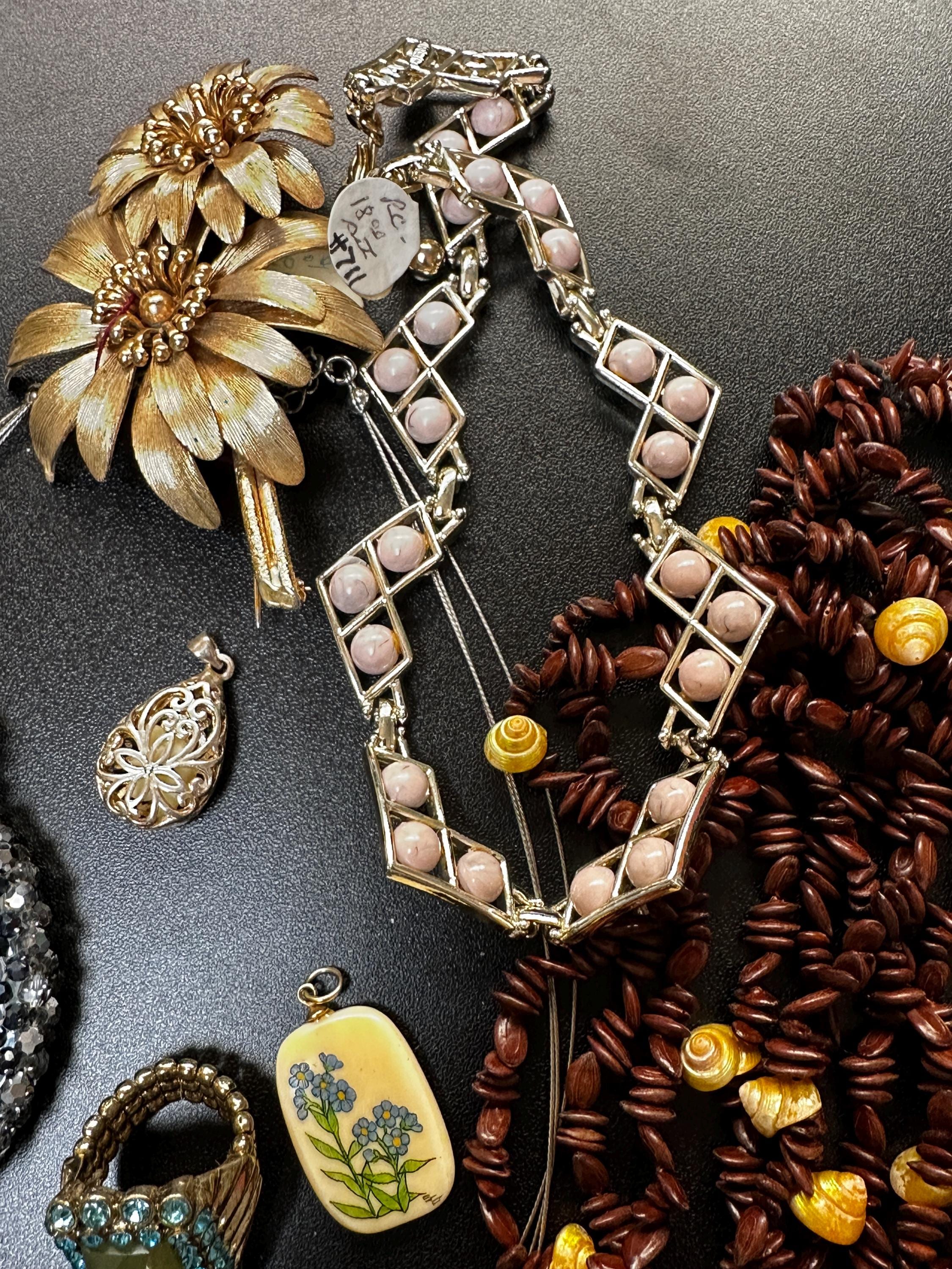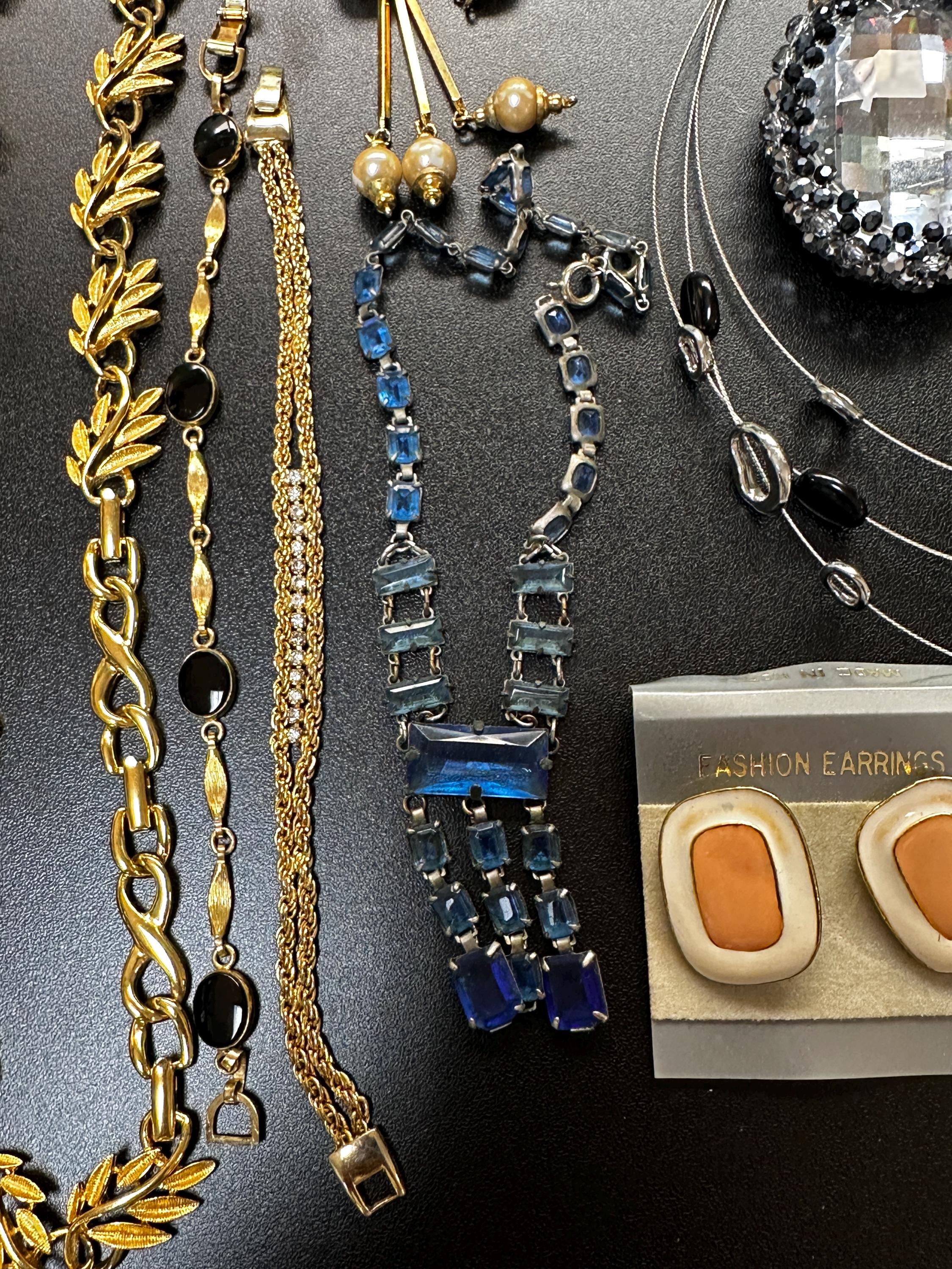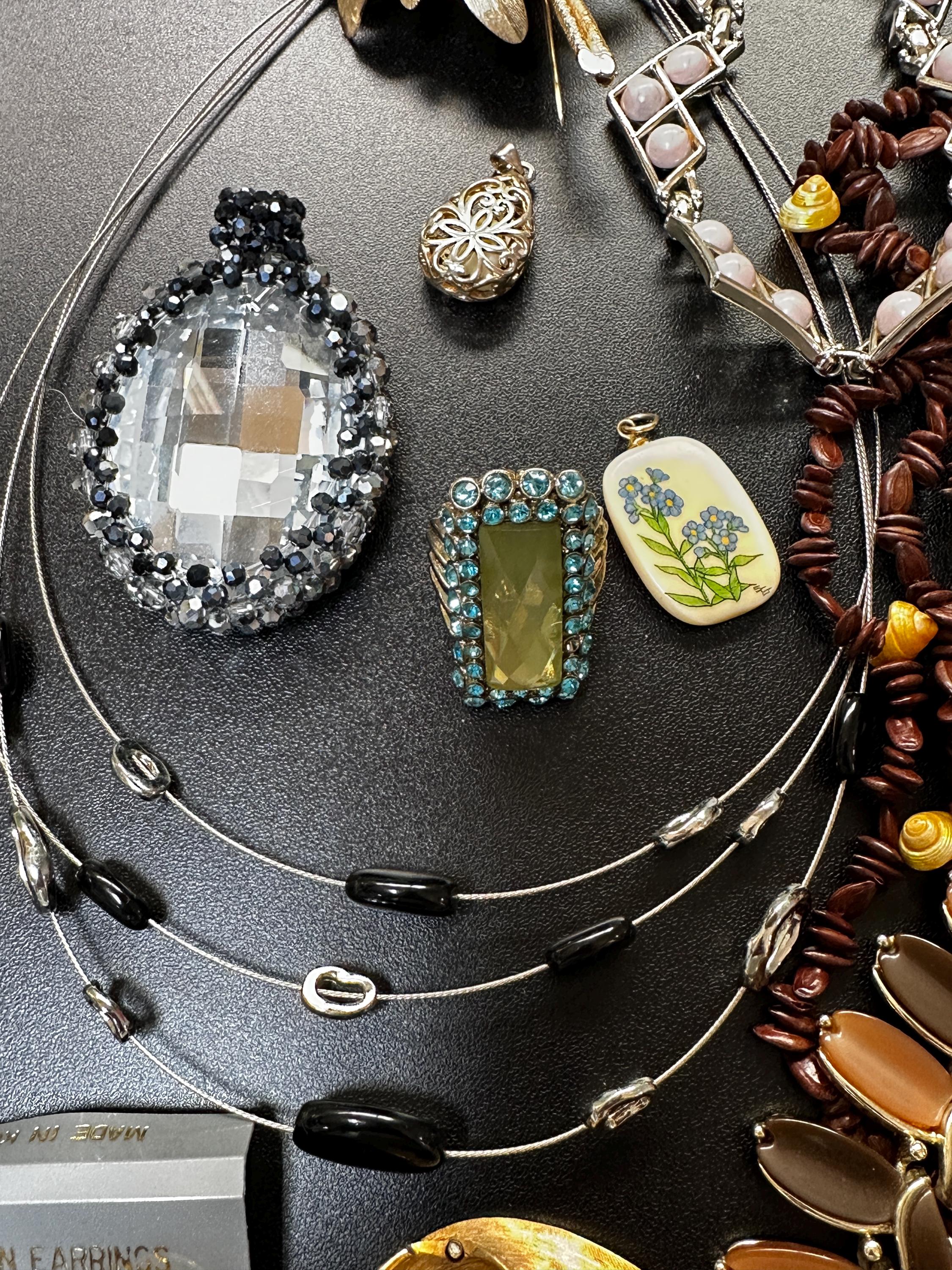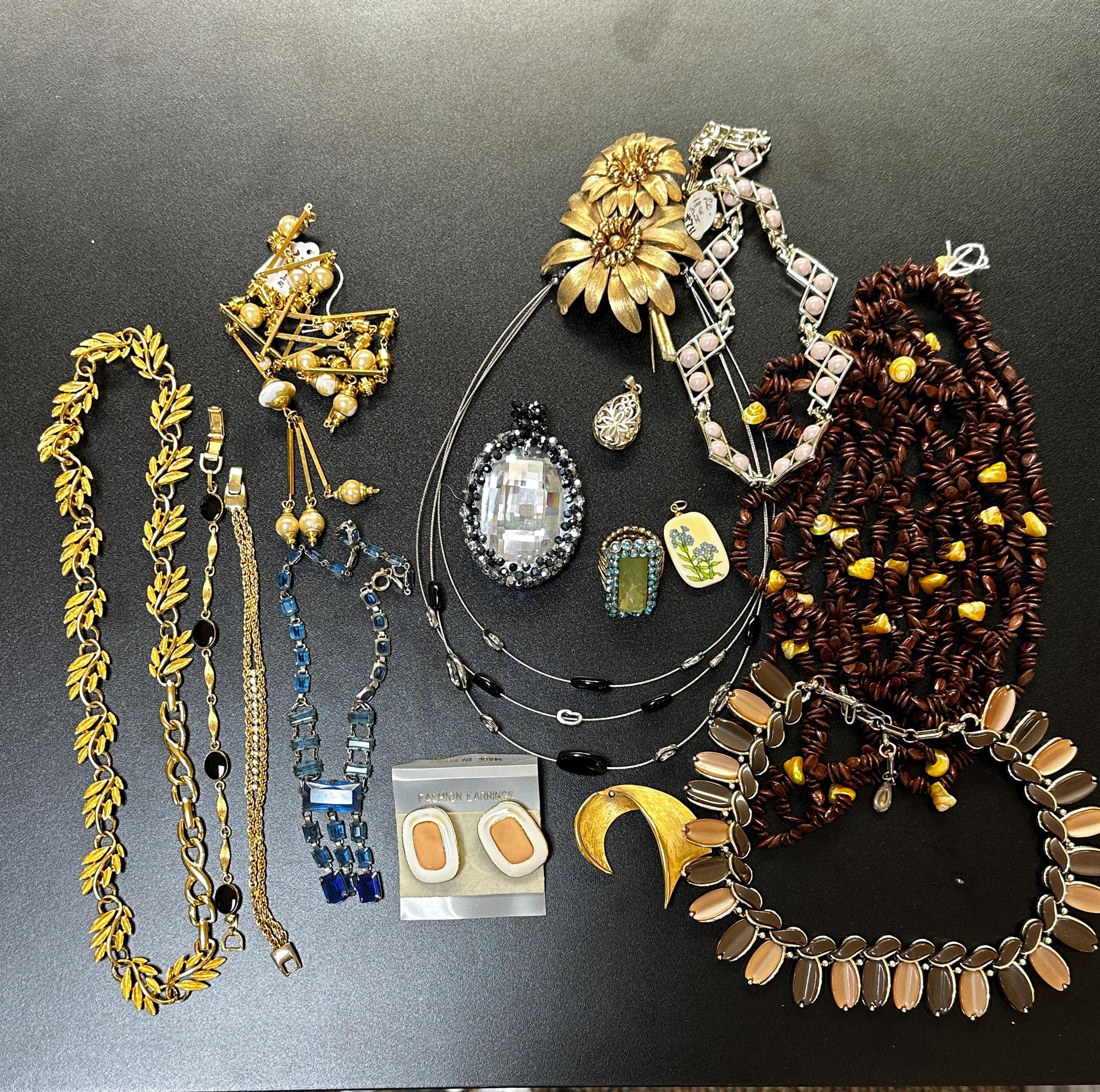 Bag lot of jewelry in various states of condition....broken or wearable. Necklaces, earrings, a ring, a pendant....take things apart and make something else--this is an opportunity to create something wonderful and have some fun.