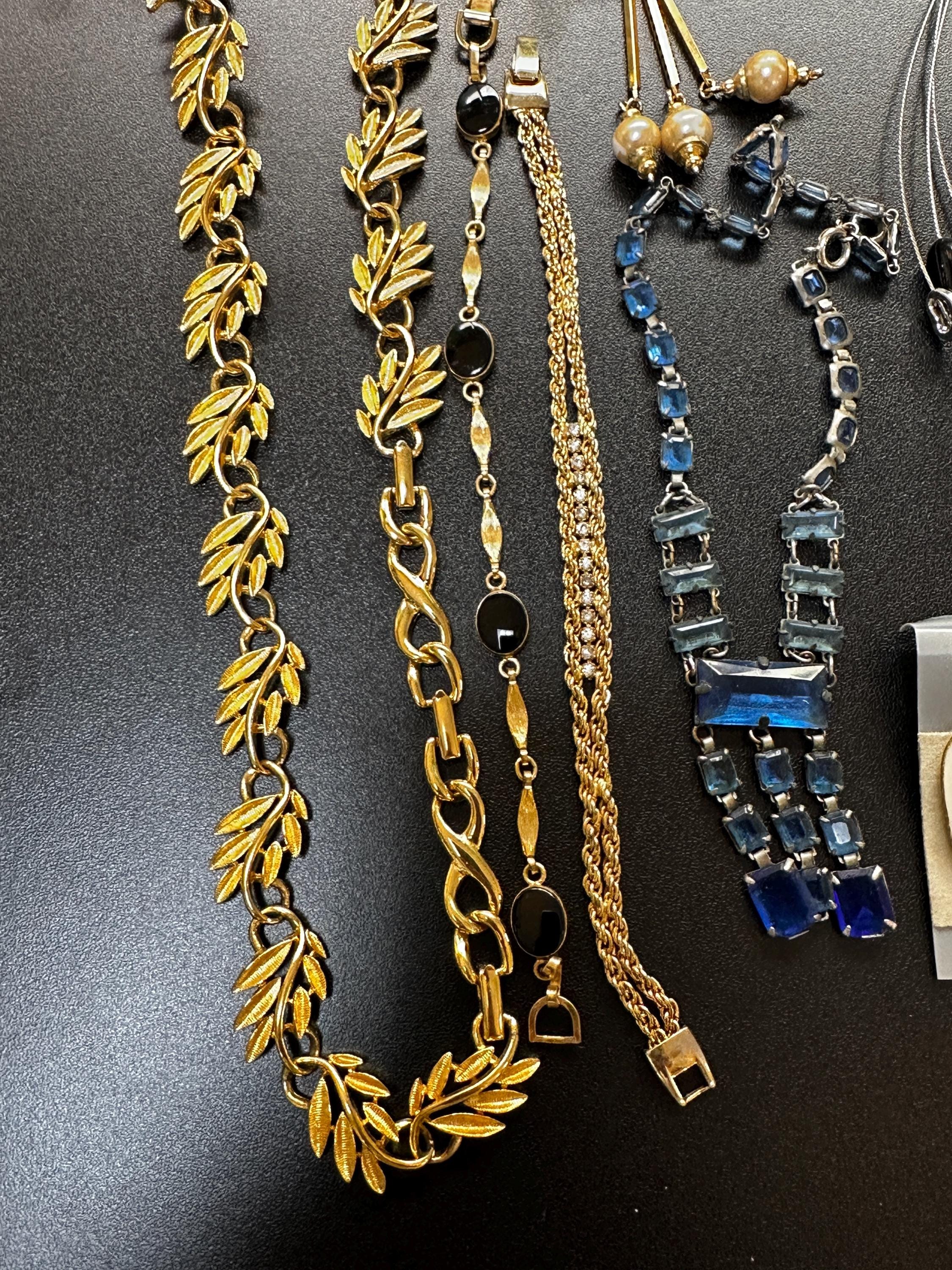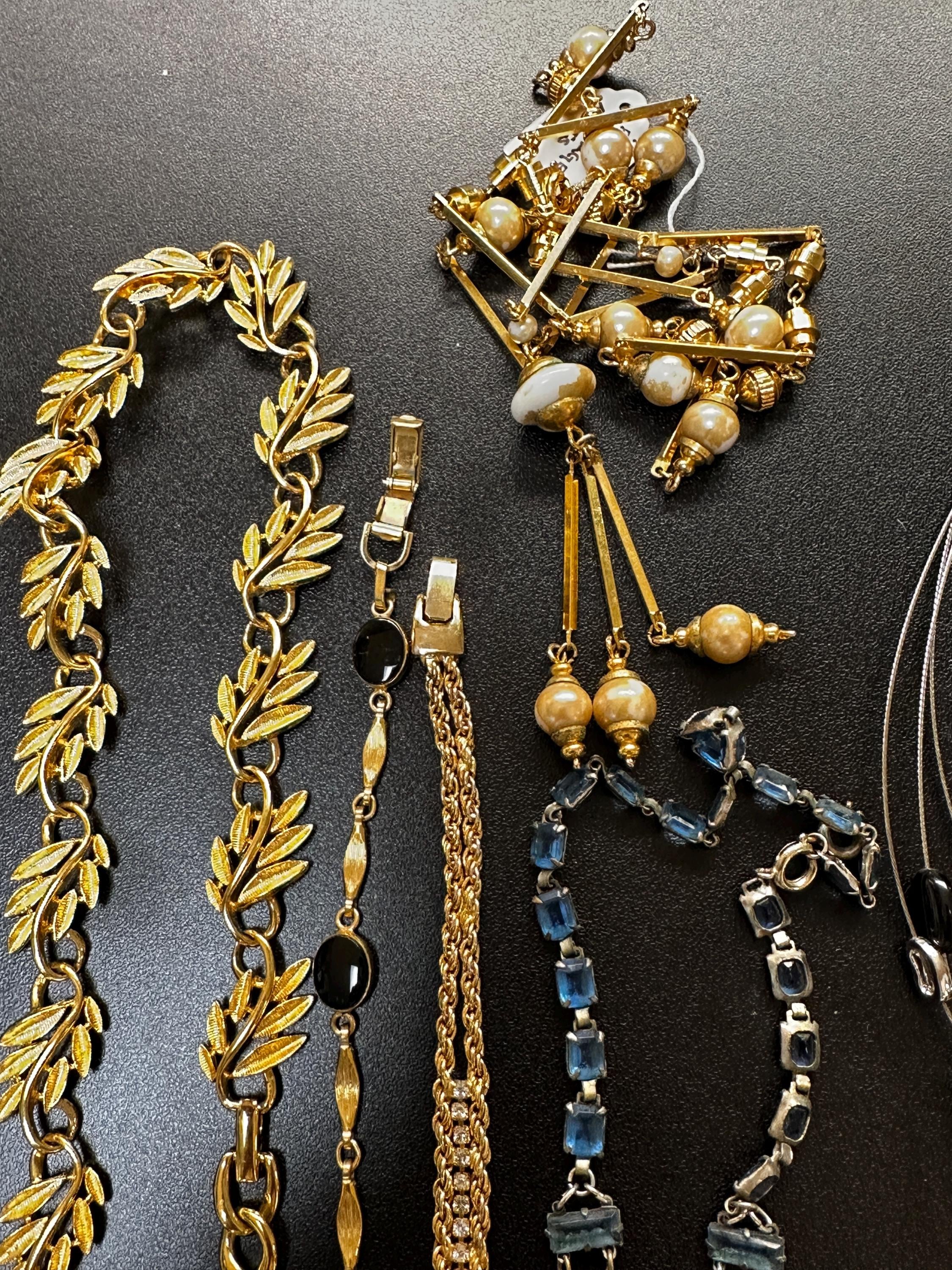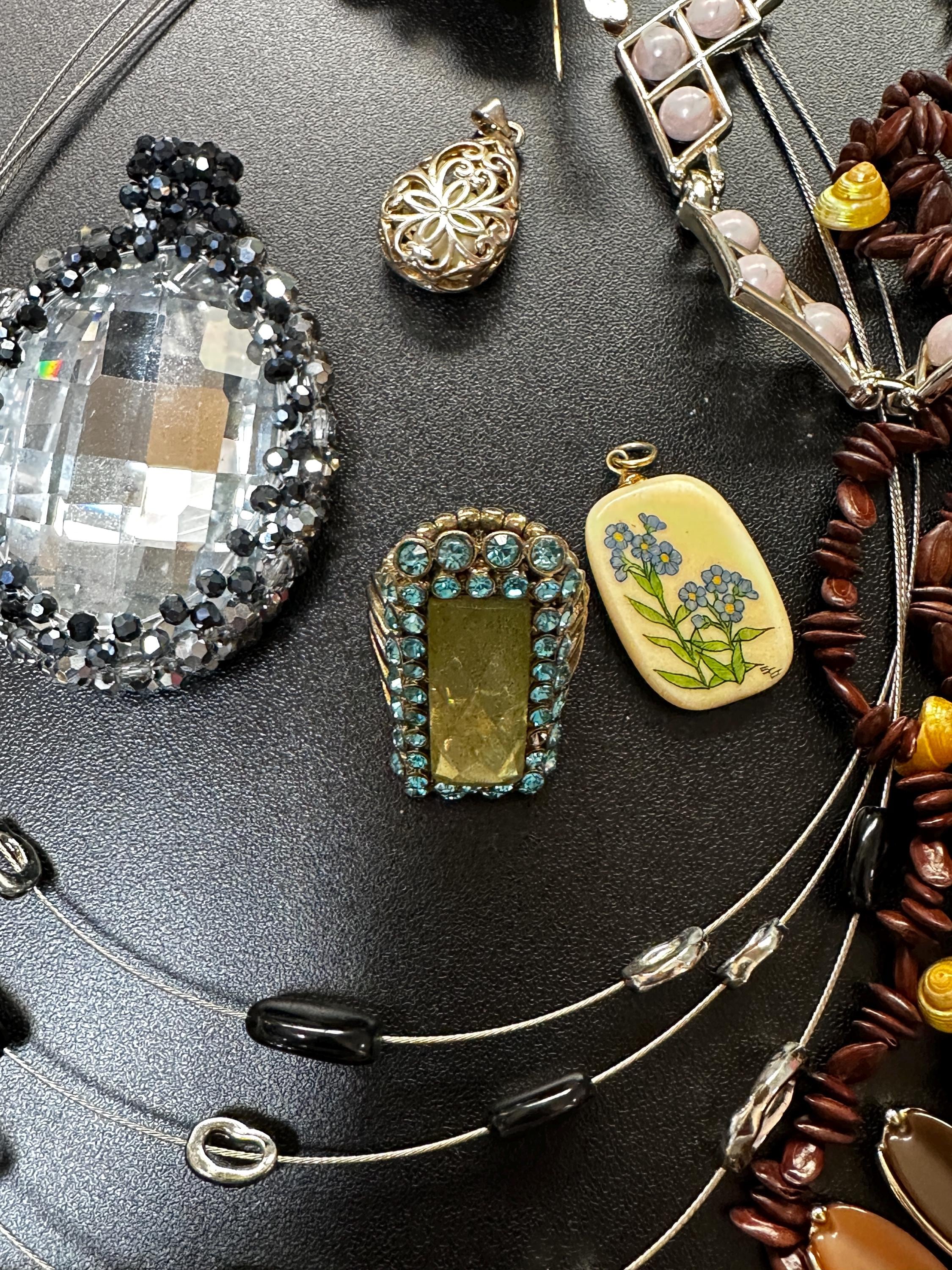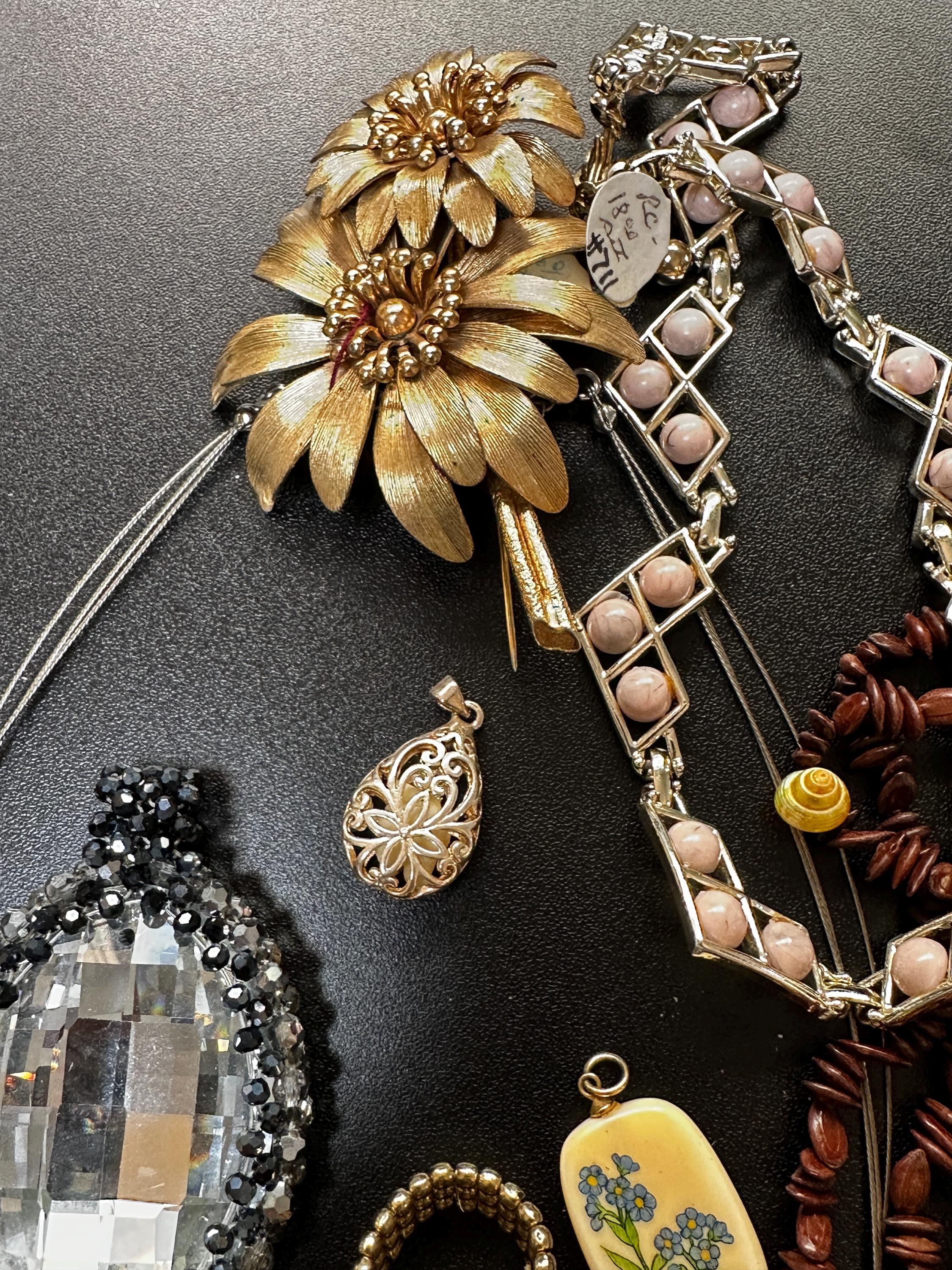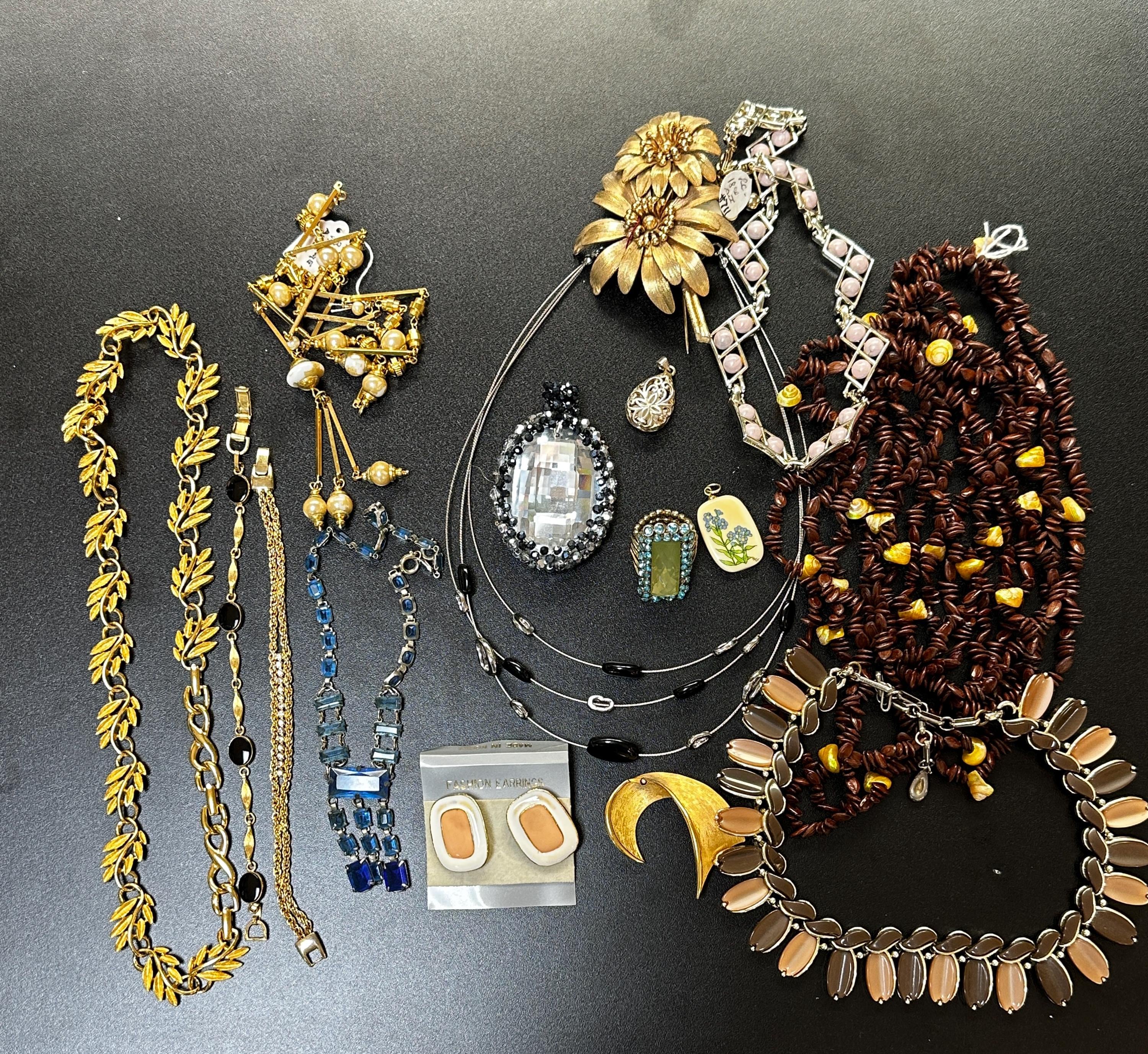 Bag lot of jewelry in various states of condition....broken or wearable. Necklaces, earrings, a ring, a pendant....take things apart and make something else--this is an opportunity to create something wonderful and have some fun.