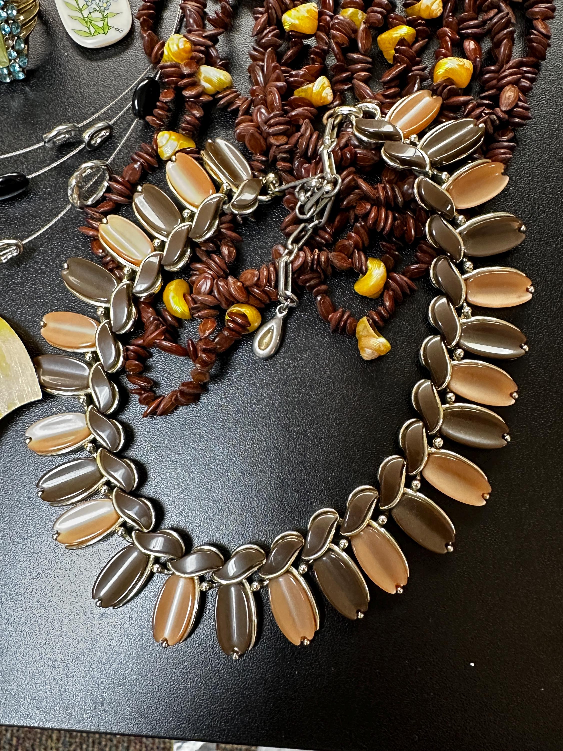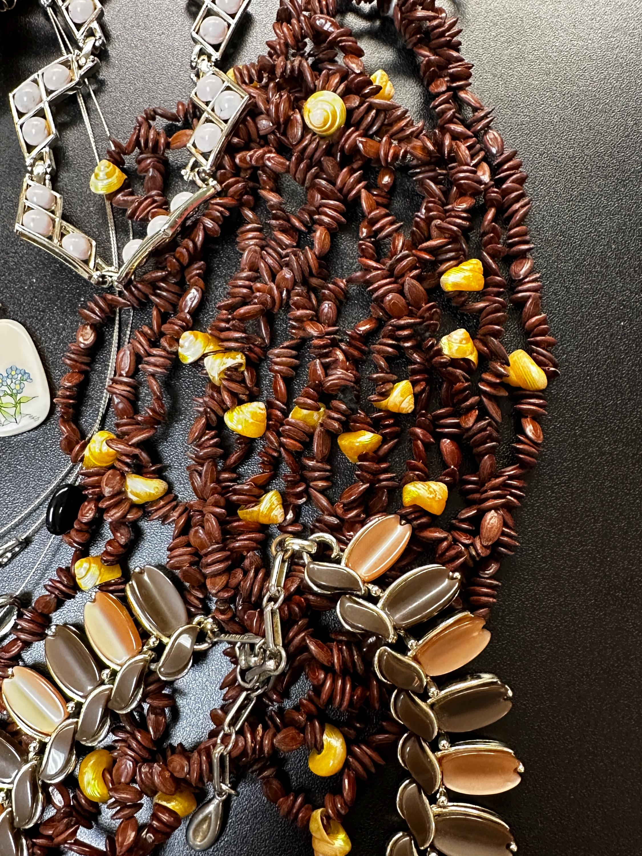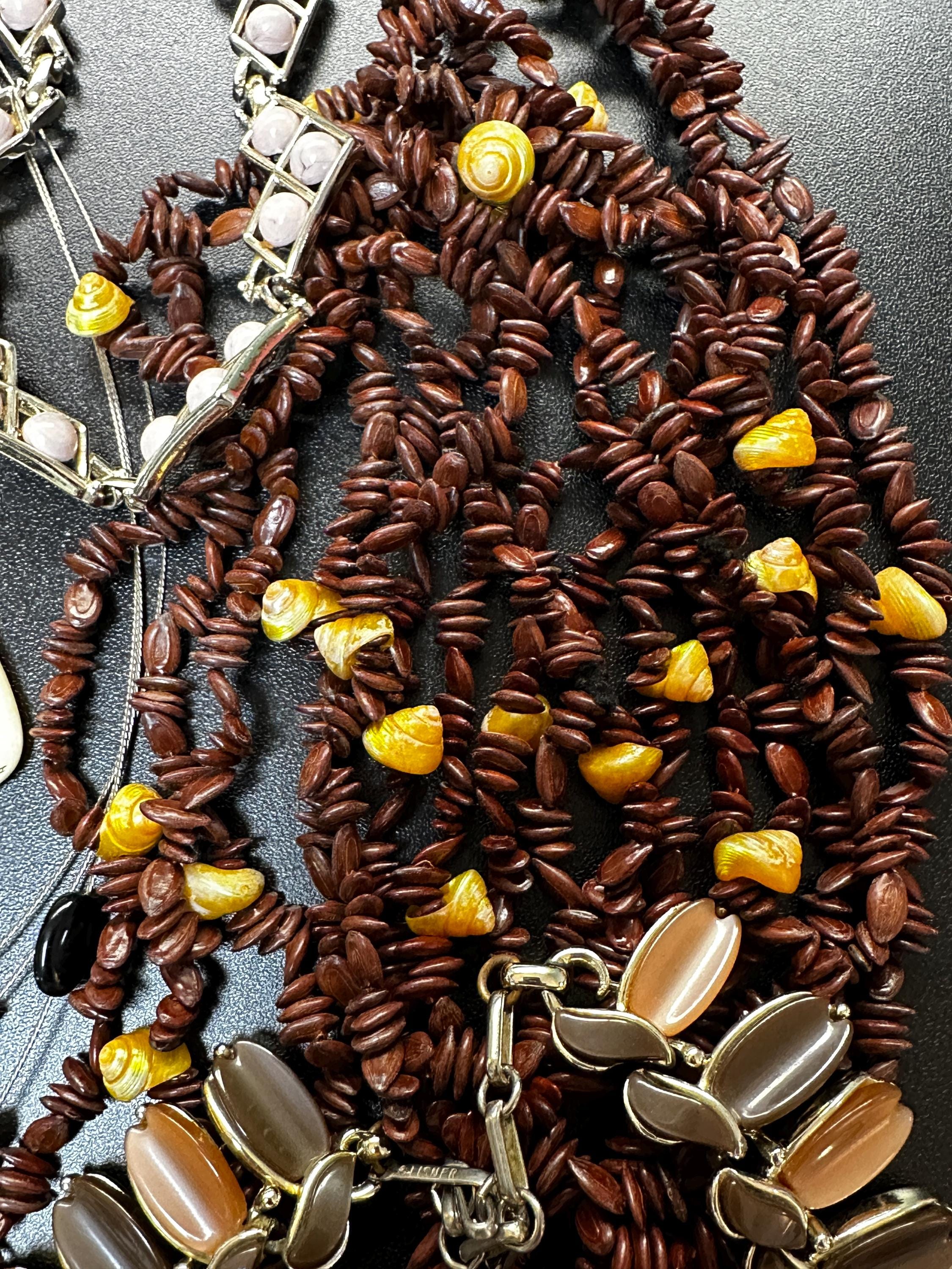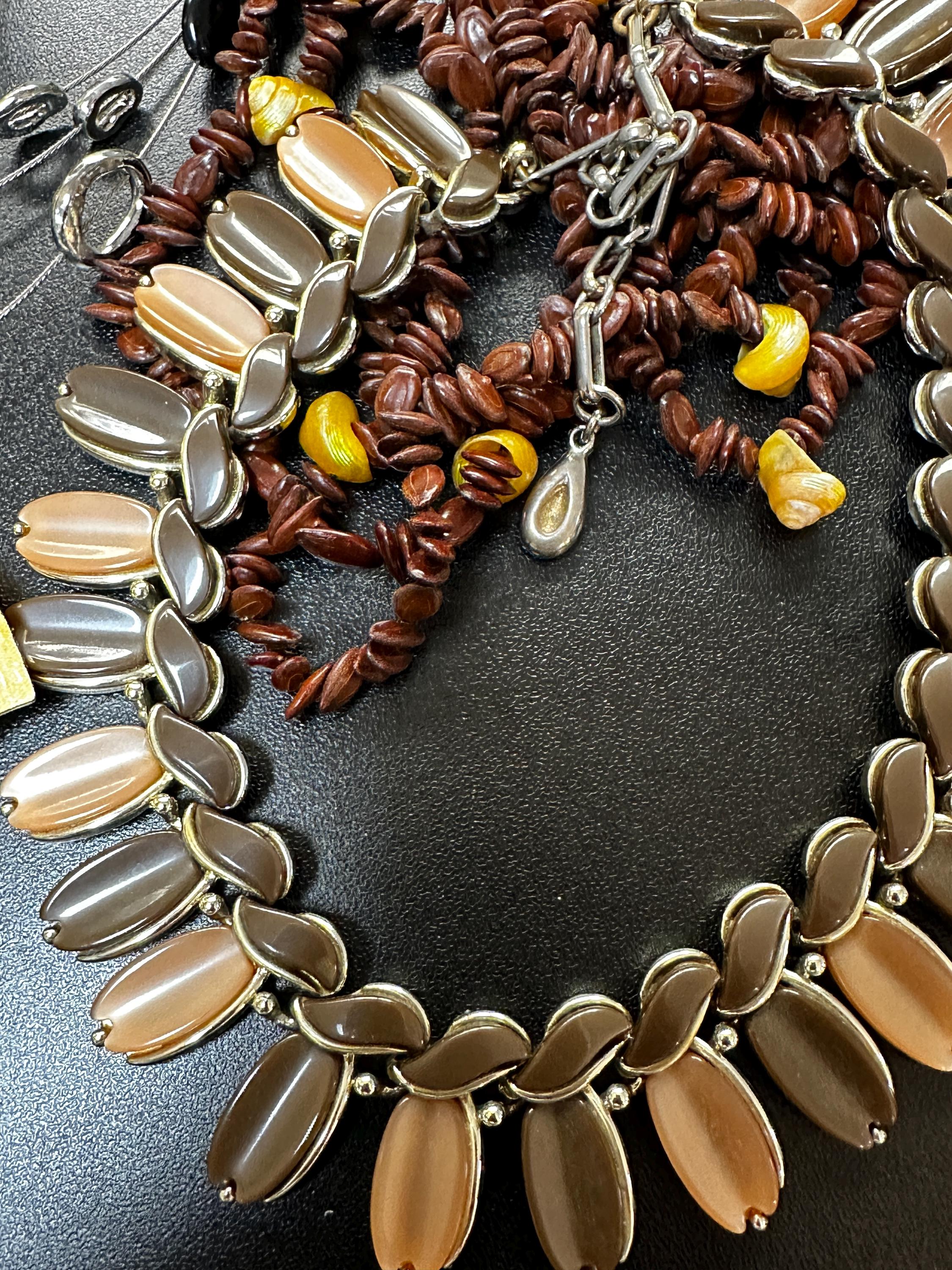 Bag lot of jewelry in various states of condition....broken or wearable. Necklaces, earrings, a ring, a pendant....take things apart and make something else--this is an opportunity to create something wonderful and have some fun.