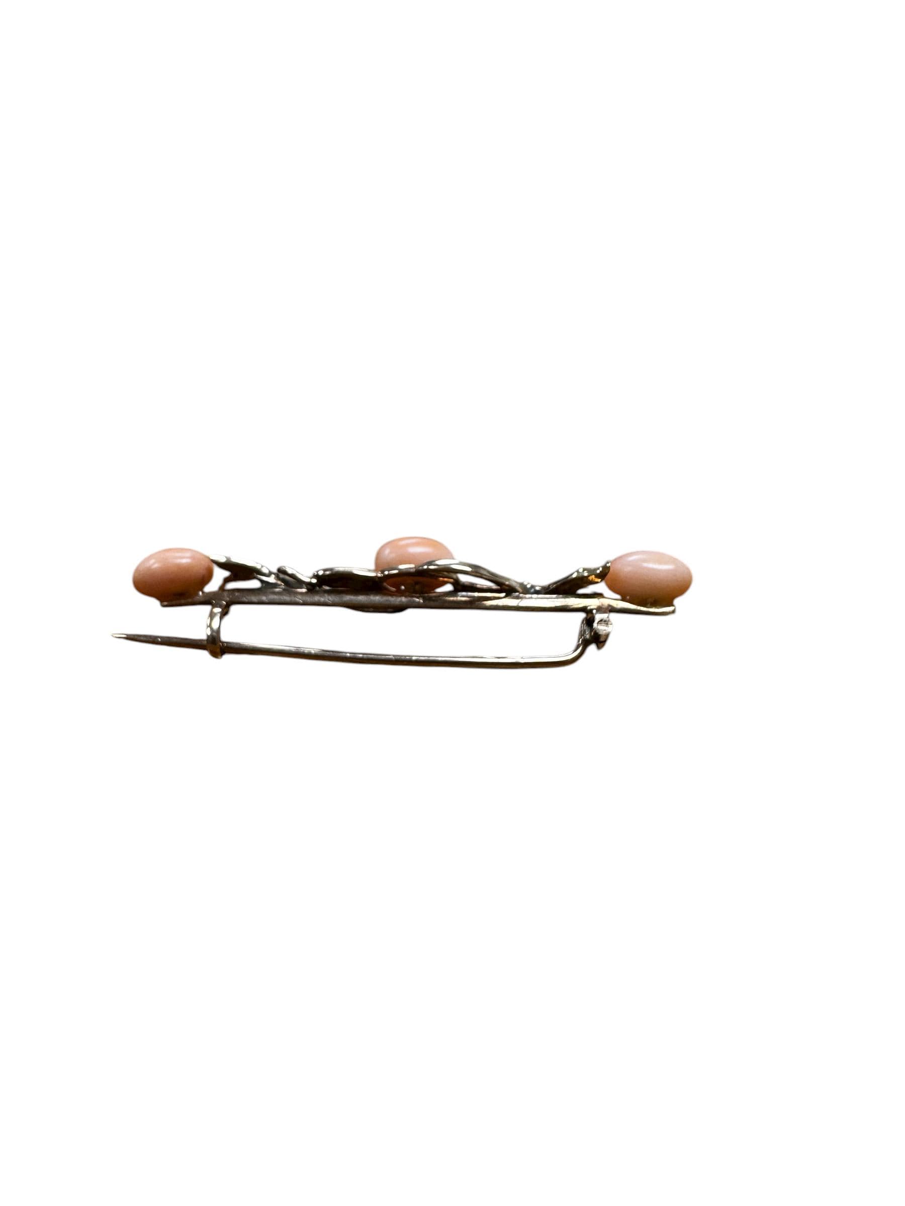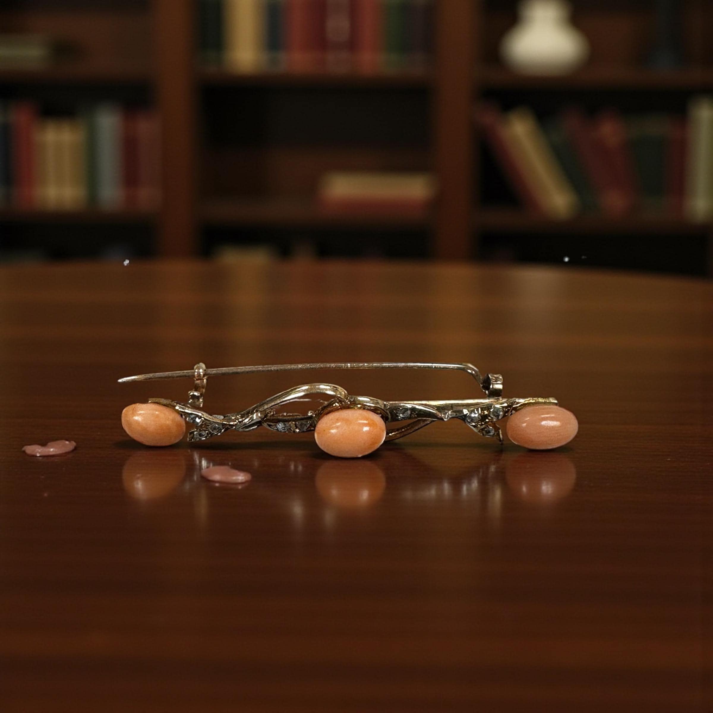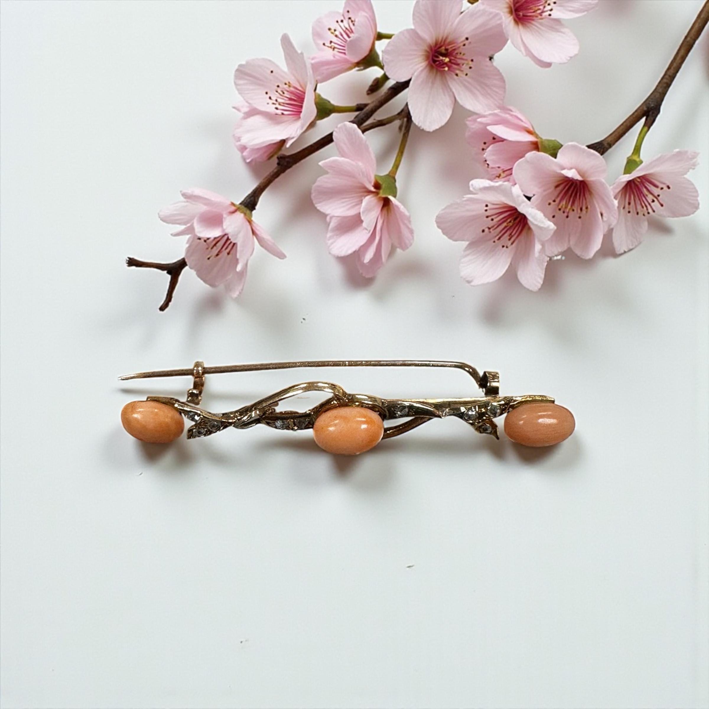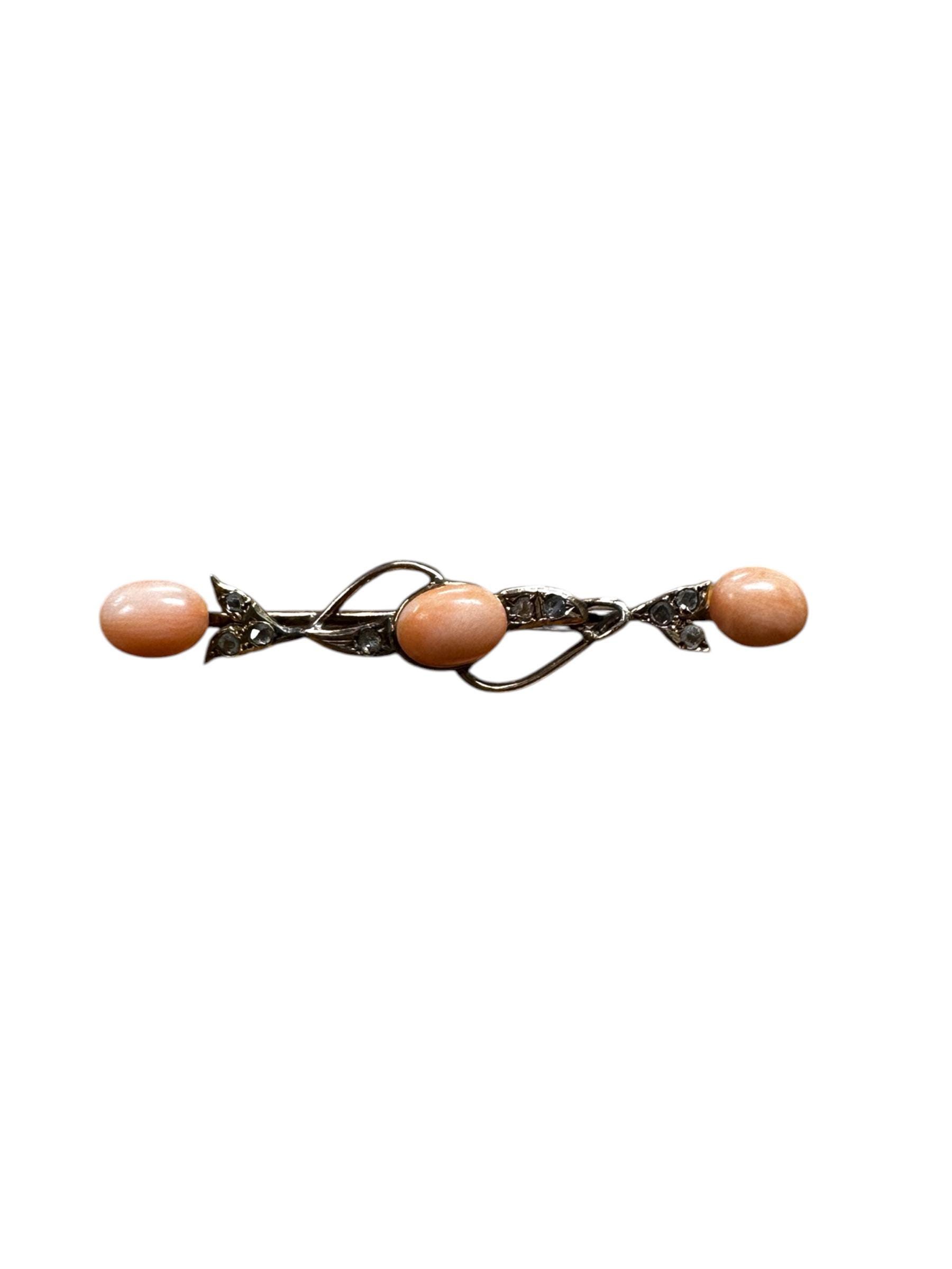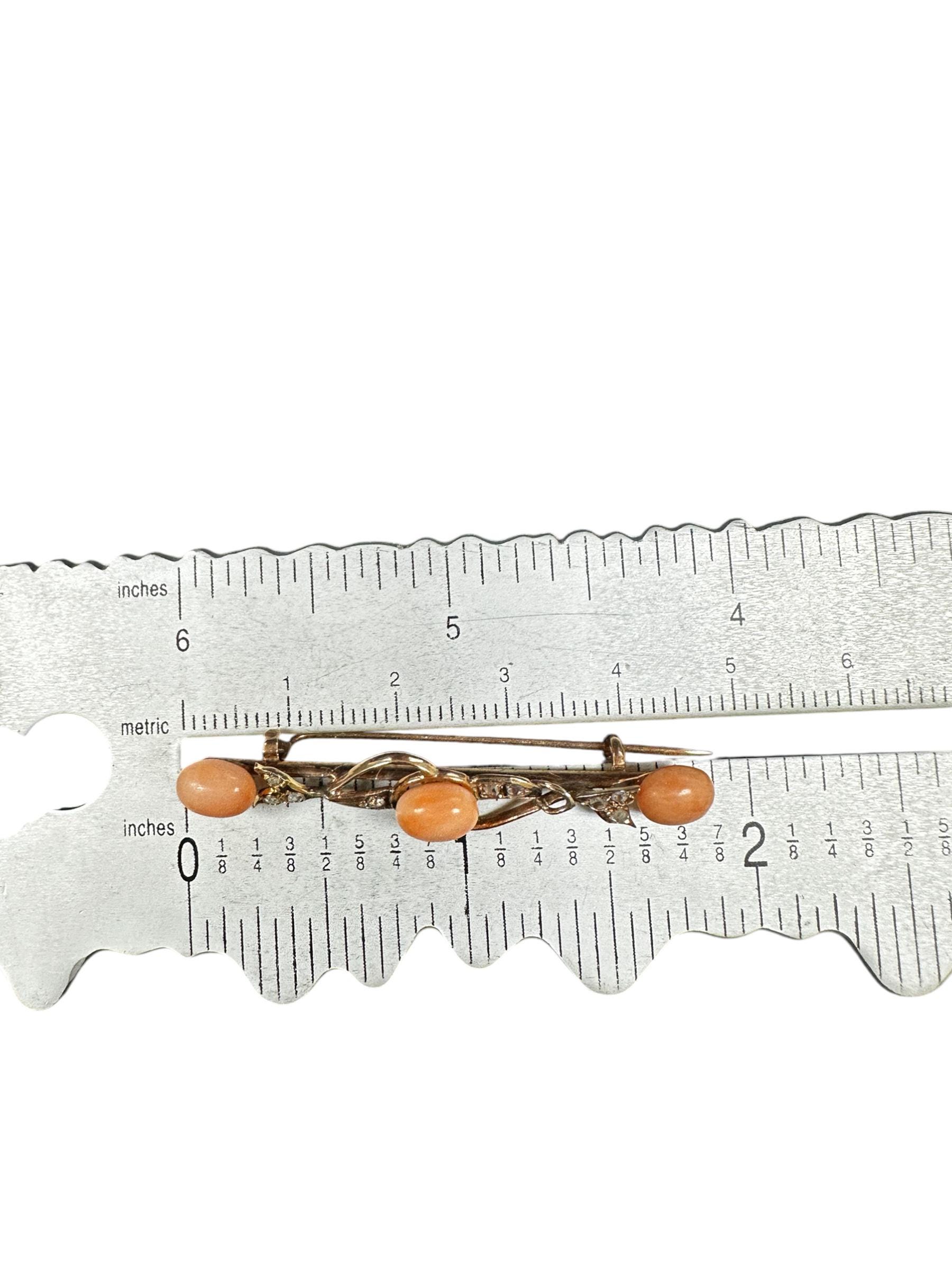 Gemstone: The pin has three oval, bead like coral. The coral is considered to be light to moderate in hue. Each piece of coral is pet set and glued. Additionally please notice because of the age of this pin the coral are not uniform in size. Accenting the coral are 9 small rose cut diamonds.