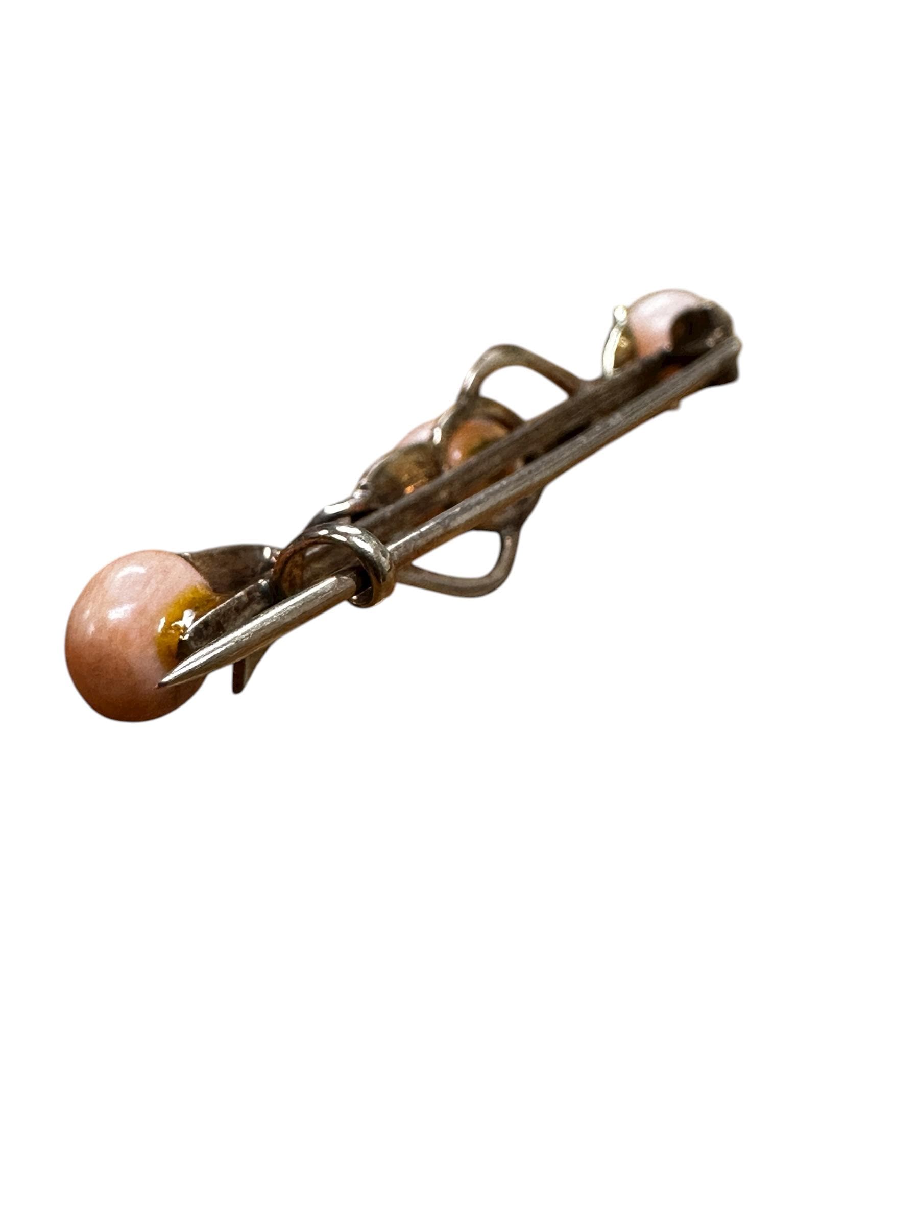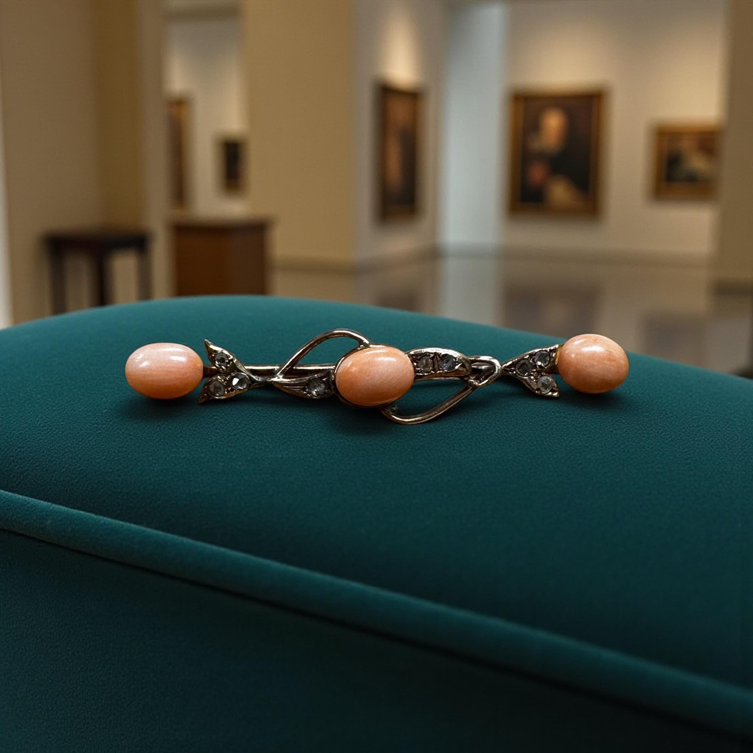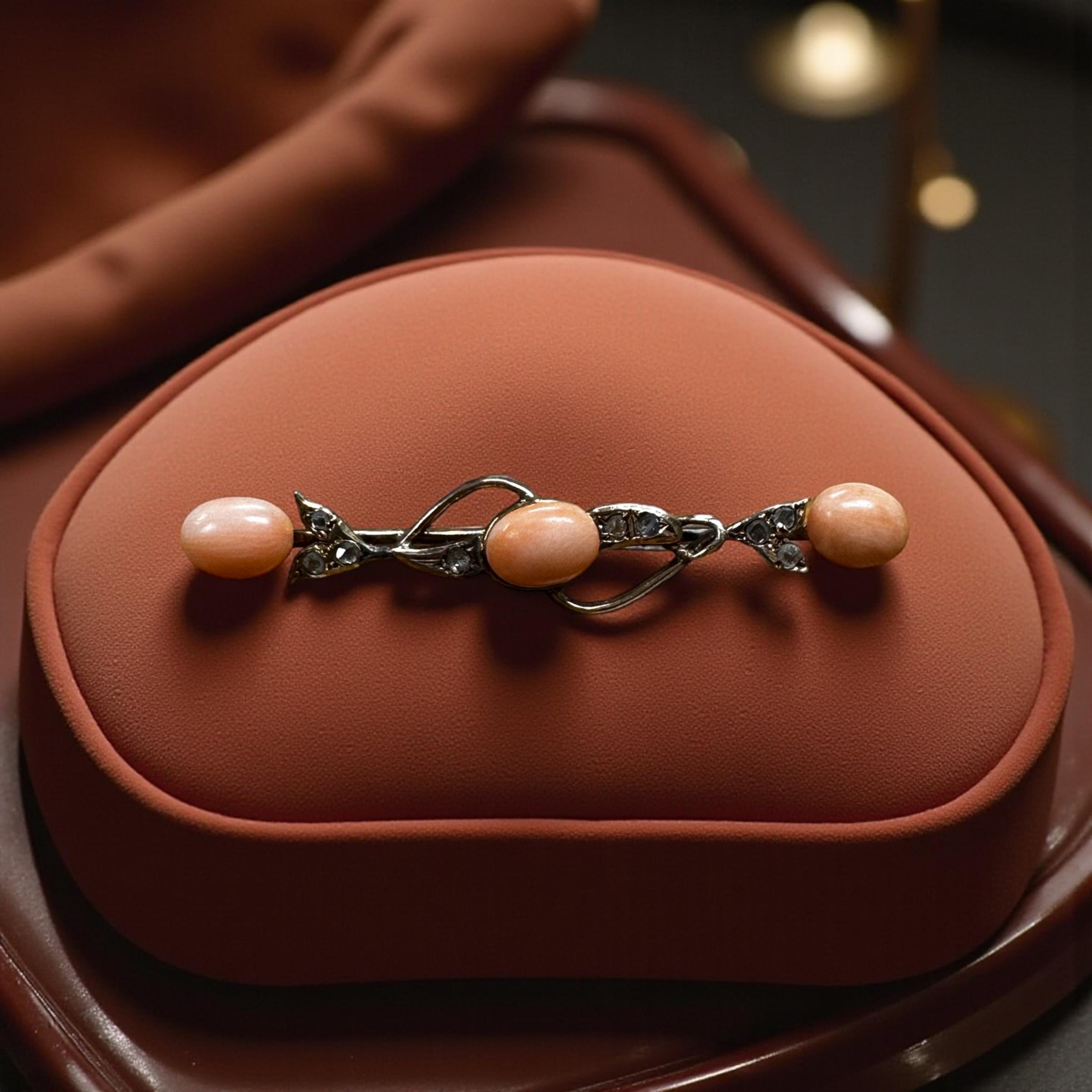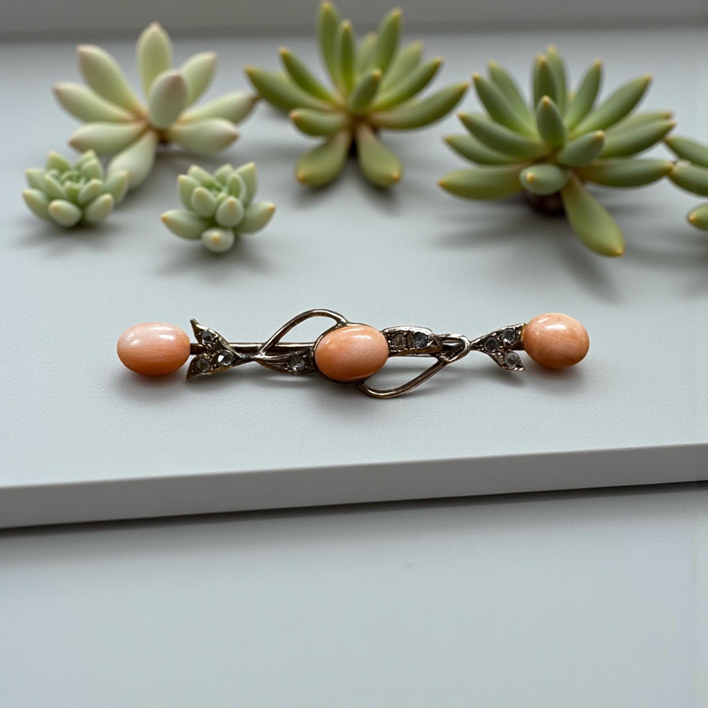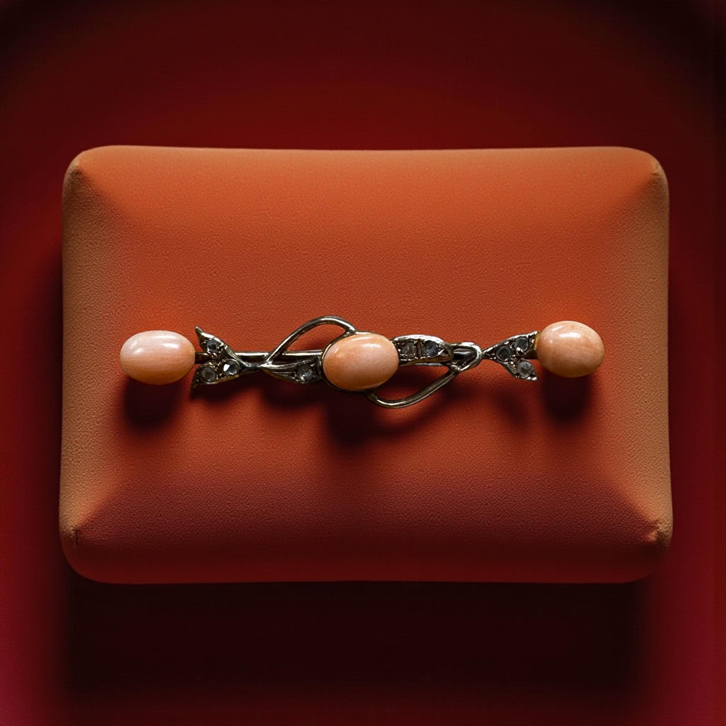Gemstone: The pin has three oval, bead like coral. The coral is considered to be light to moderate in hue. Each piece of coral is pet set and glued. Additionally please notice because of the age of this pin the coral are not uniform in size. Accenting the coral are 9 small rose cut diamonds.