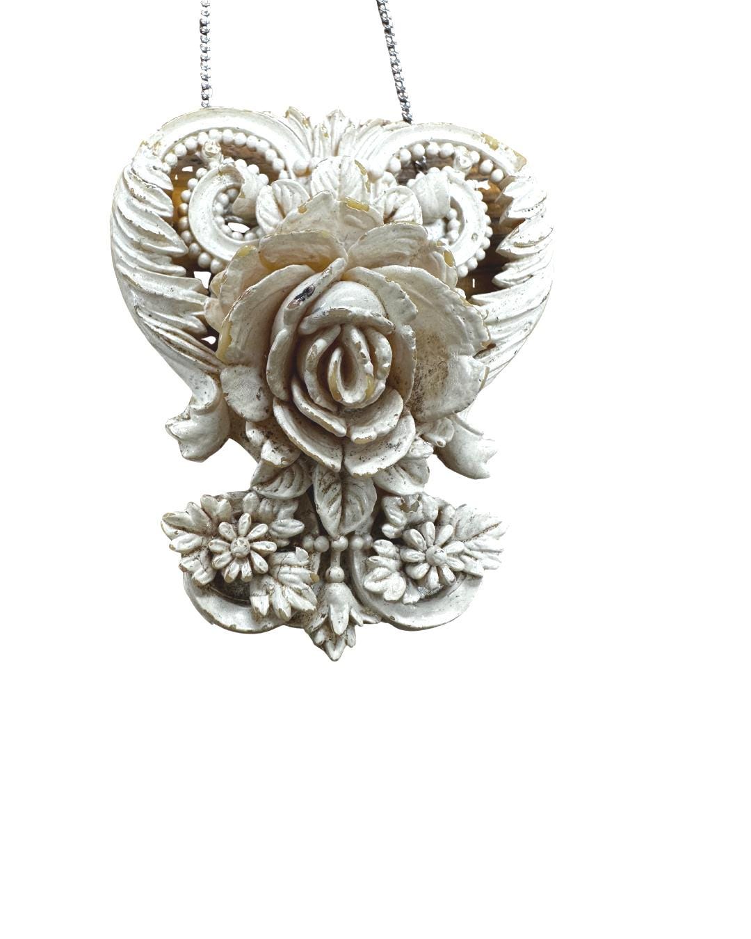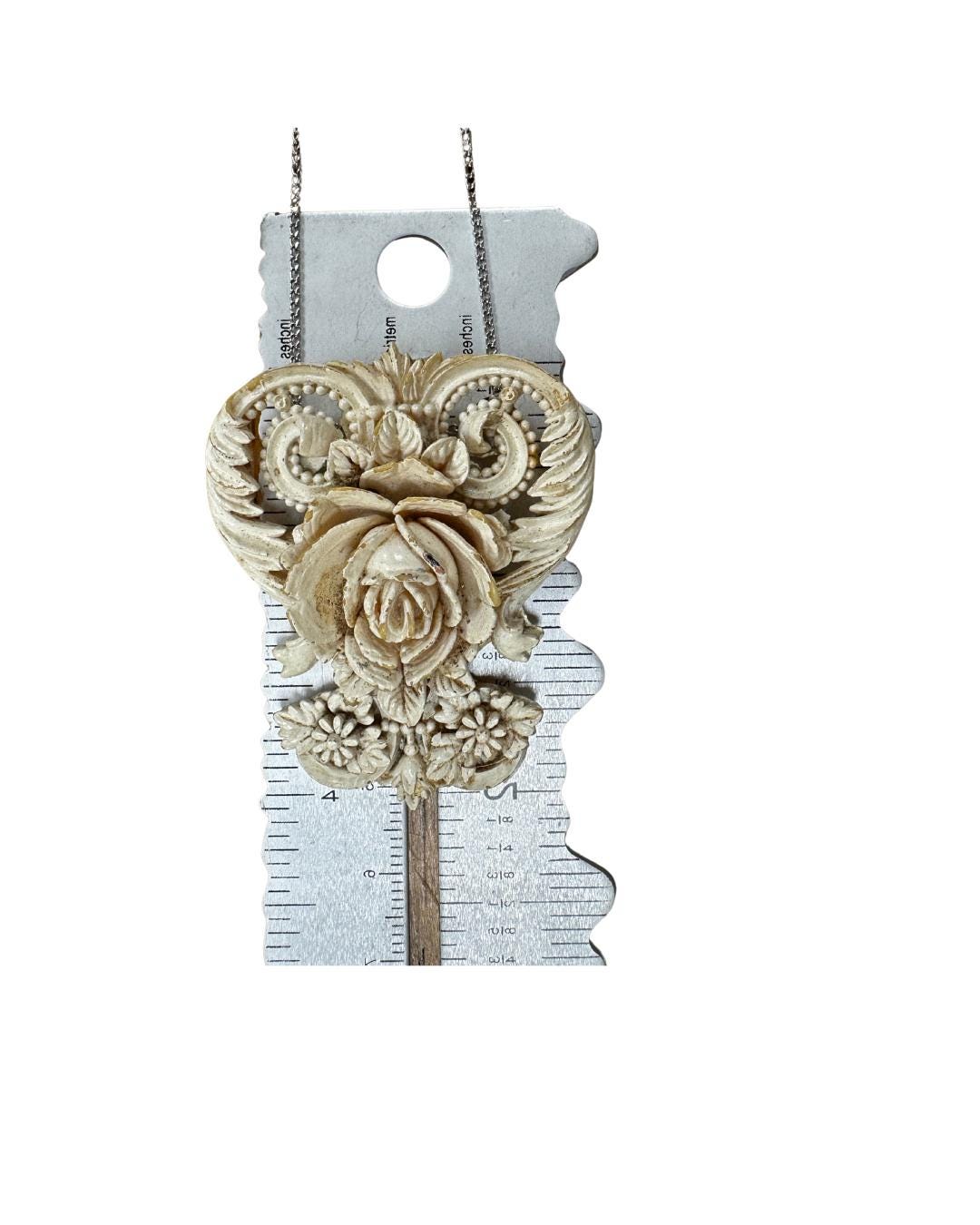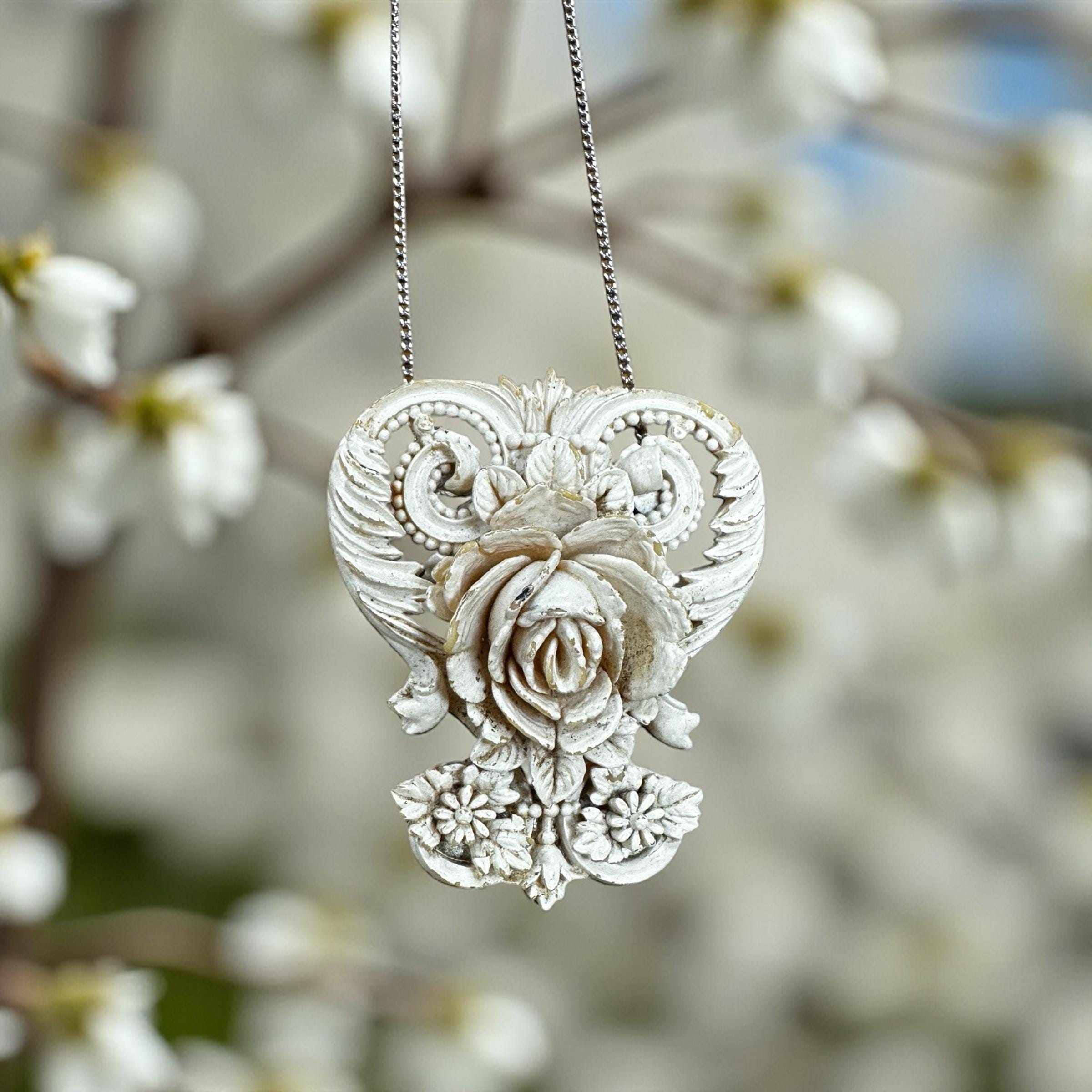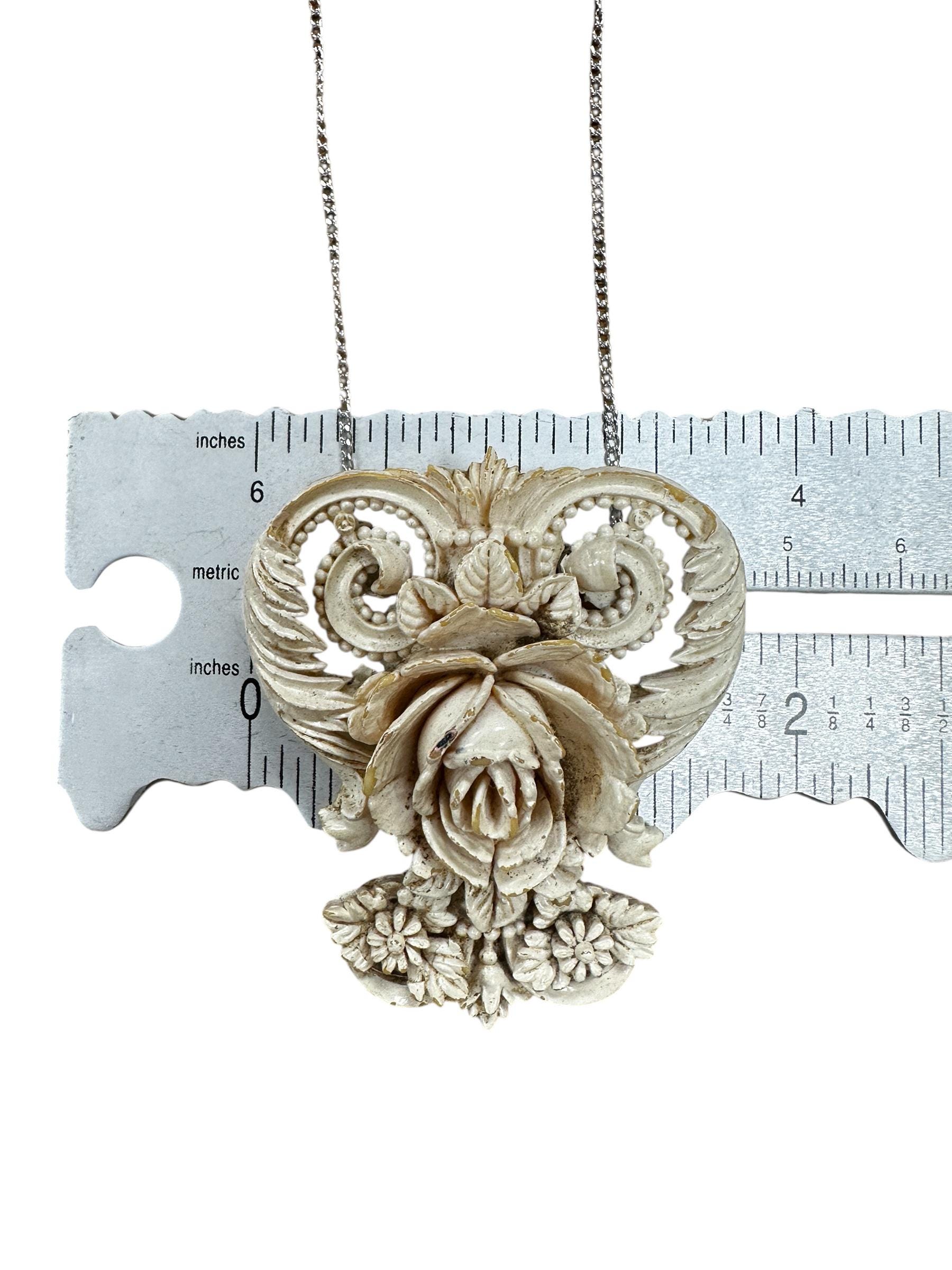 A charming vintage celluloid carving of a unique floral arrangement from the 1940's. We believe that at one time it was perhaps a dress clip, and since there was only one we decided to create a pendant from it. This one-of-a-kind piece captures the essence of mid-century design, making it a perfect statement accessory for any outfit. With intricate detailing and a timeless aesthetic, it’s an ideal gift for vintage lovers or a special treat for yourself. The pendant is suspended from a sterling silver chain.