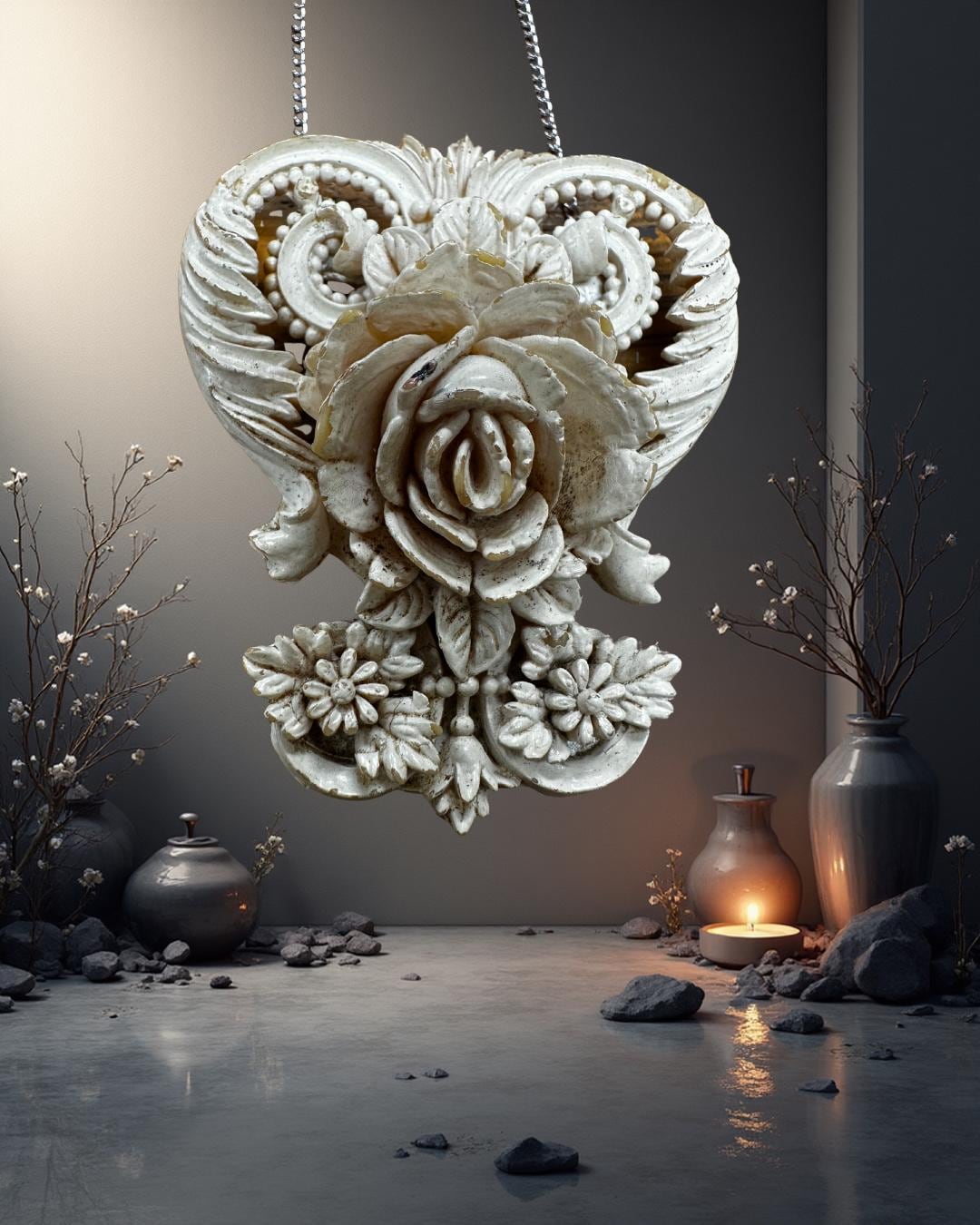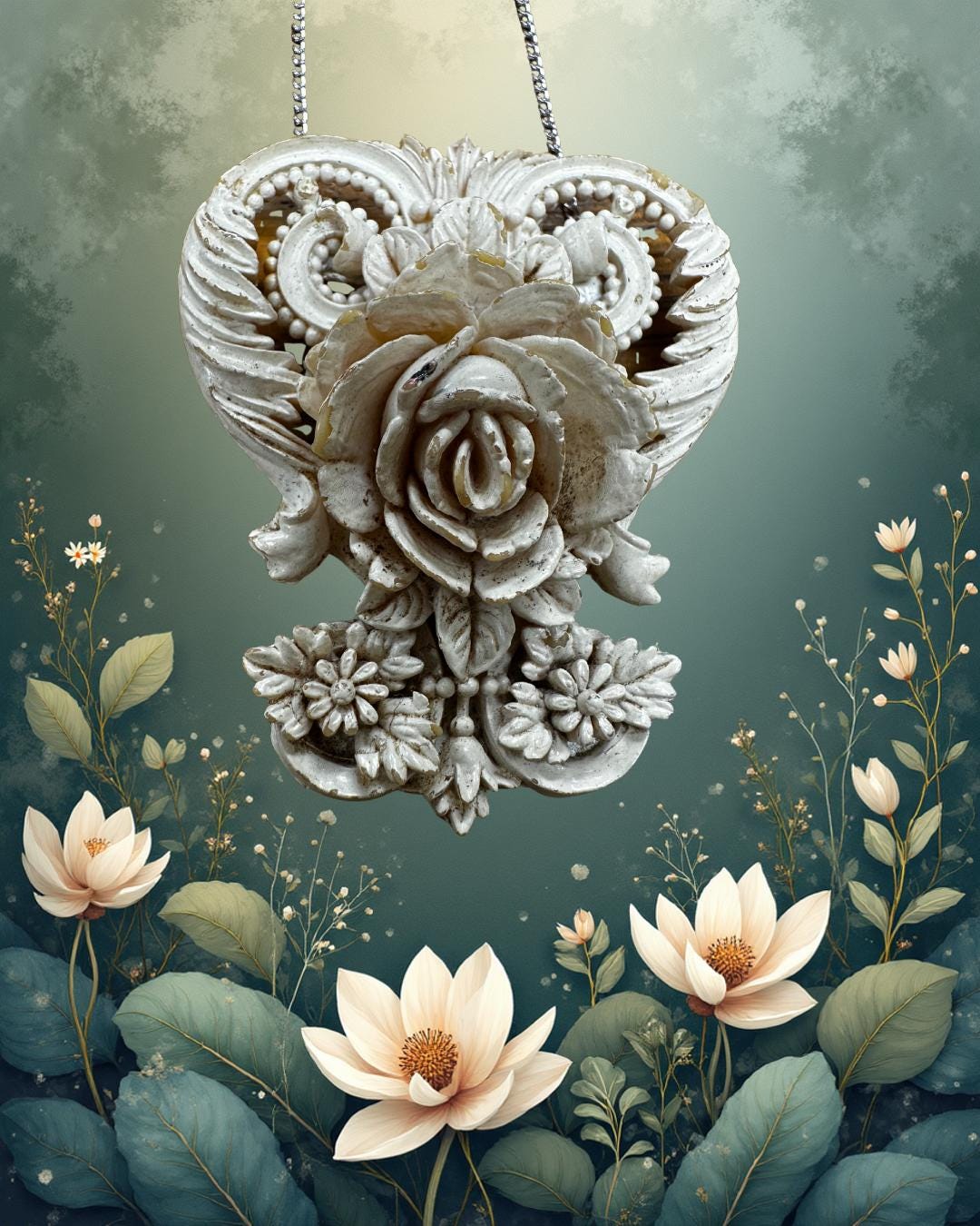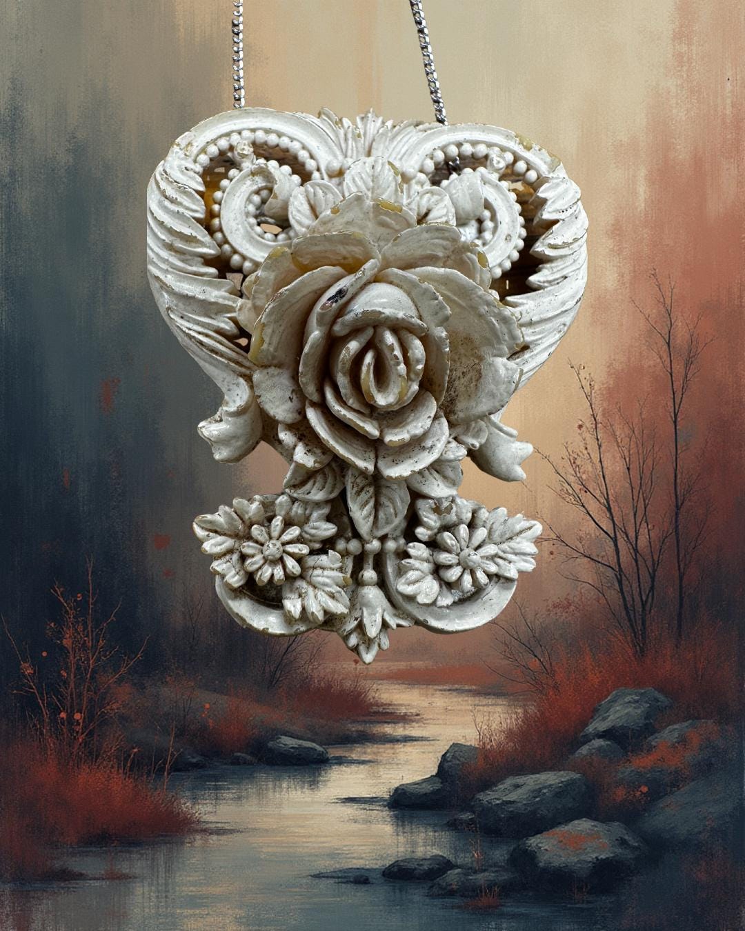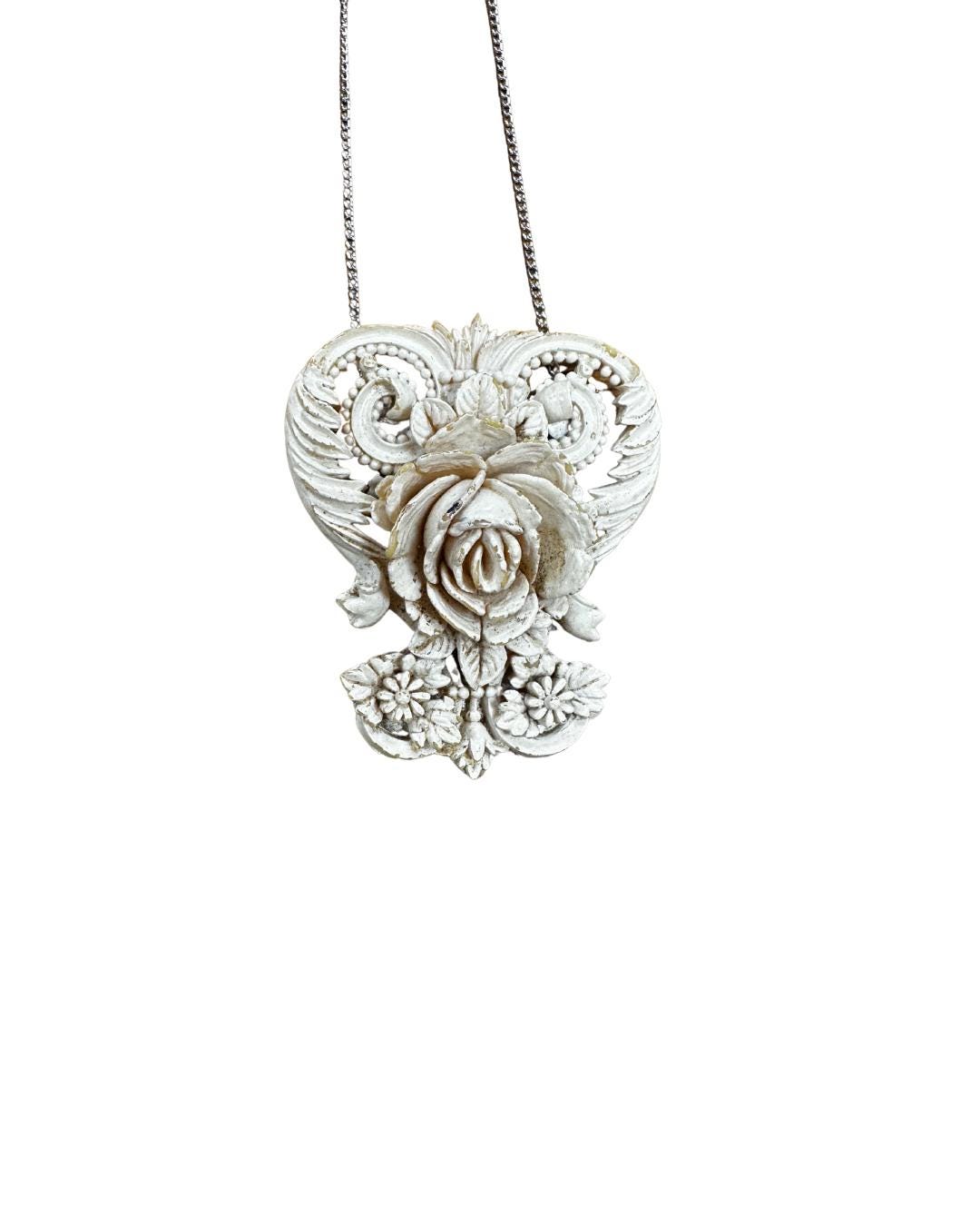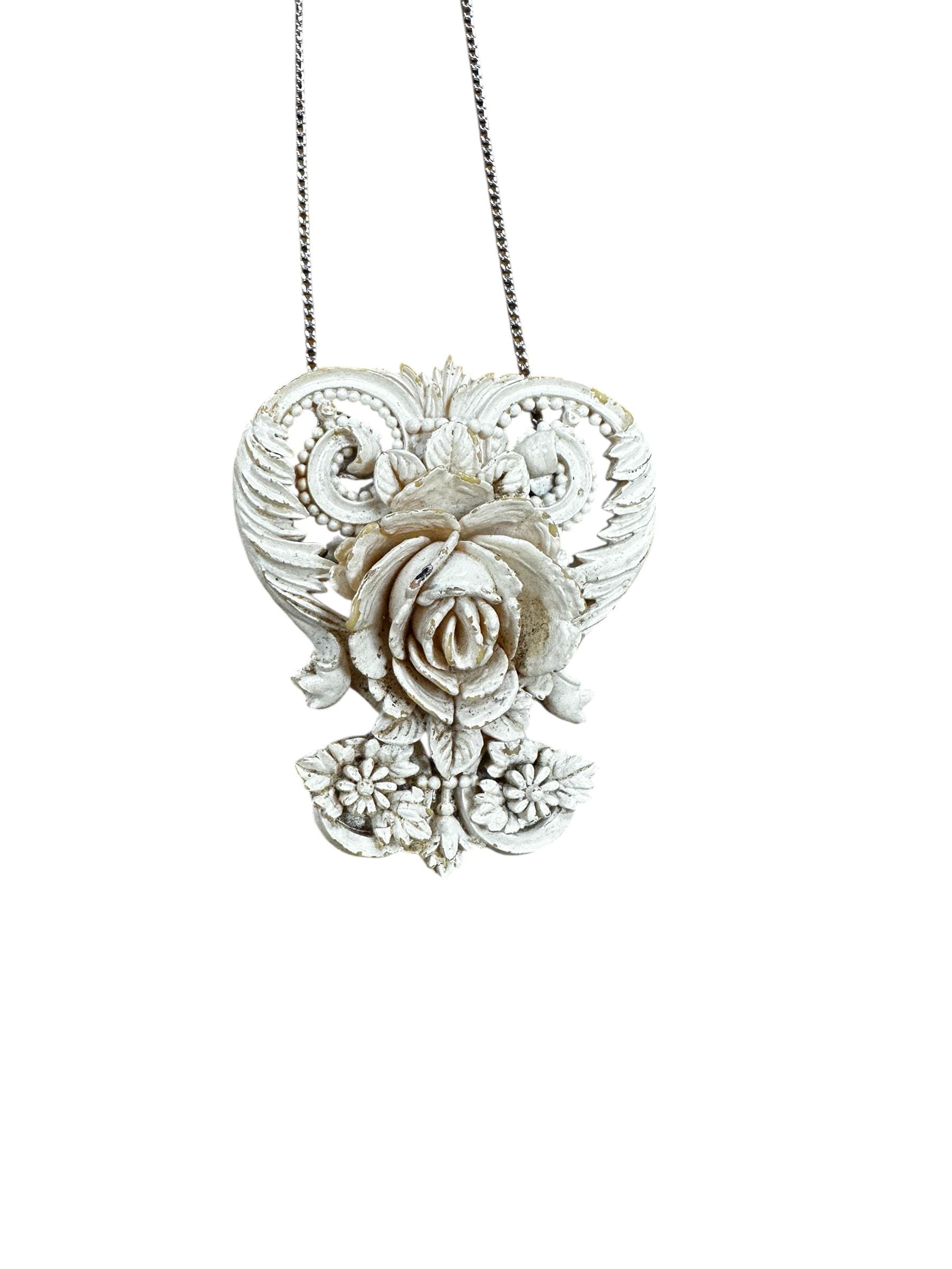 A charming vintage celluloid carving of a unique floral arrangement from the 1940's. We believe that at one time it was perhaps a dress clip, and since there was only one we decided to create a pendant from it. This one-of-a-kind piece captures the essence of mid-century design, making it a perfect statement accessory for any outfit. With intricate detailing and a timeless aesthetic, it’s an ideal gift for vintage lovers or a special treat for yourself. The pendant is suspended from a sterling silver chain.