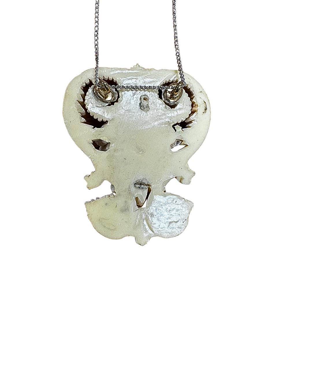 Metal: The back of the celluloid pendant we attached 2 gold tone jump ring type loops so the chain can slide through easily. The sterling silver chain measures 16 inches in length and is secured by a spring ring.