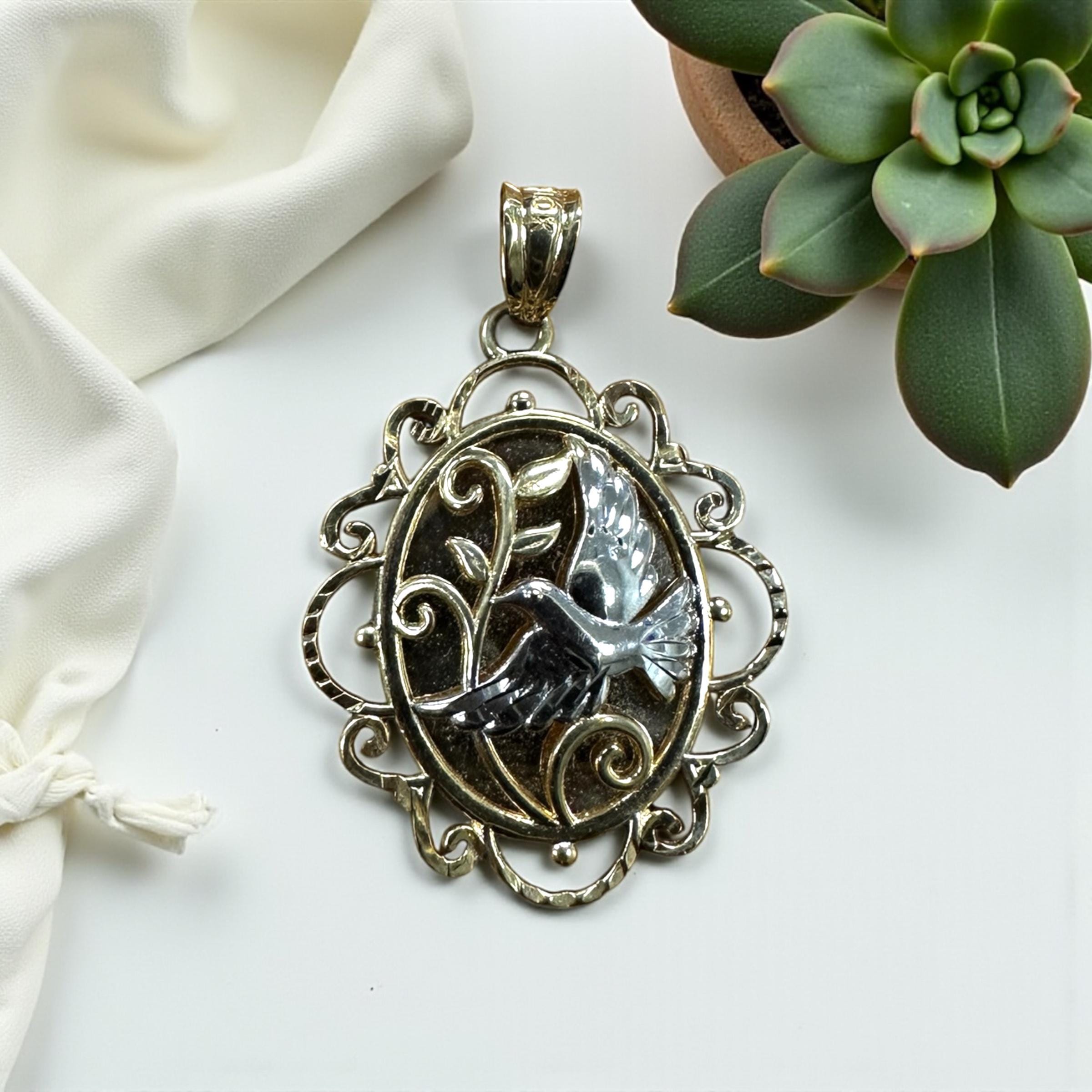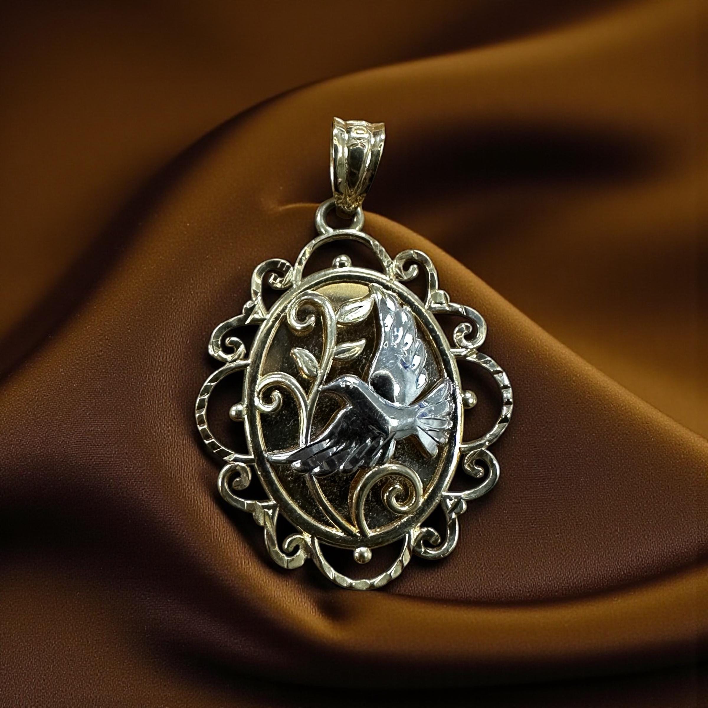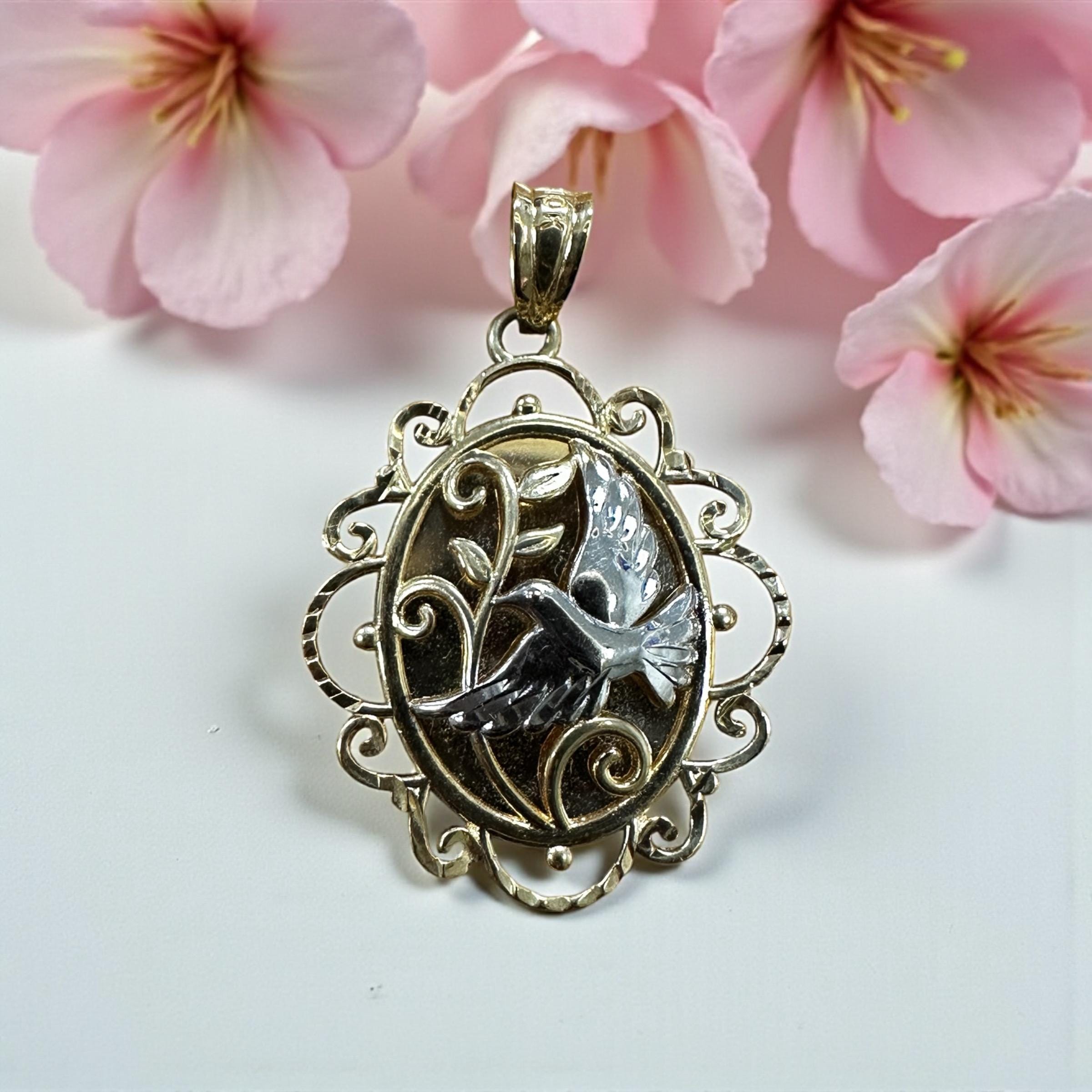 A beautiful 10-karat yellow gold pendant featuring a graceful white gold bird in flight. The front showcases a dimensional, sculpted design, framed by an elegant border of gold scrollwork. A meaningful piece for anyone who loves inspirational symbols and heartfelt messages.