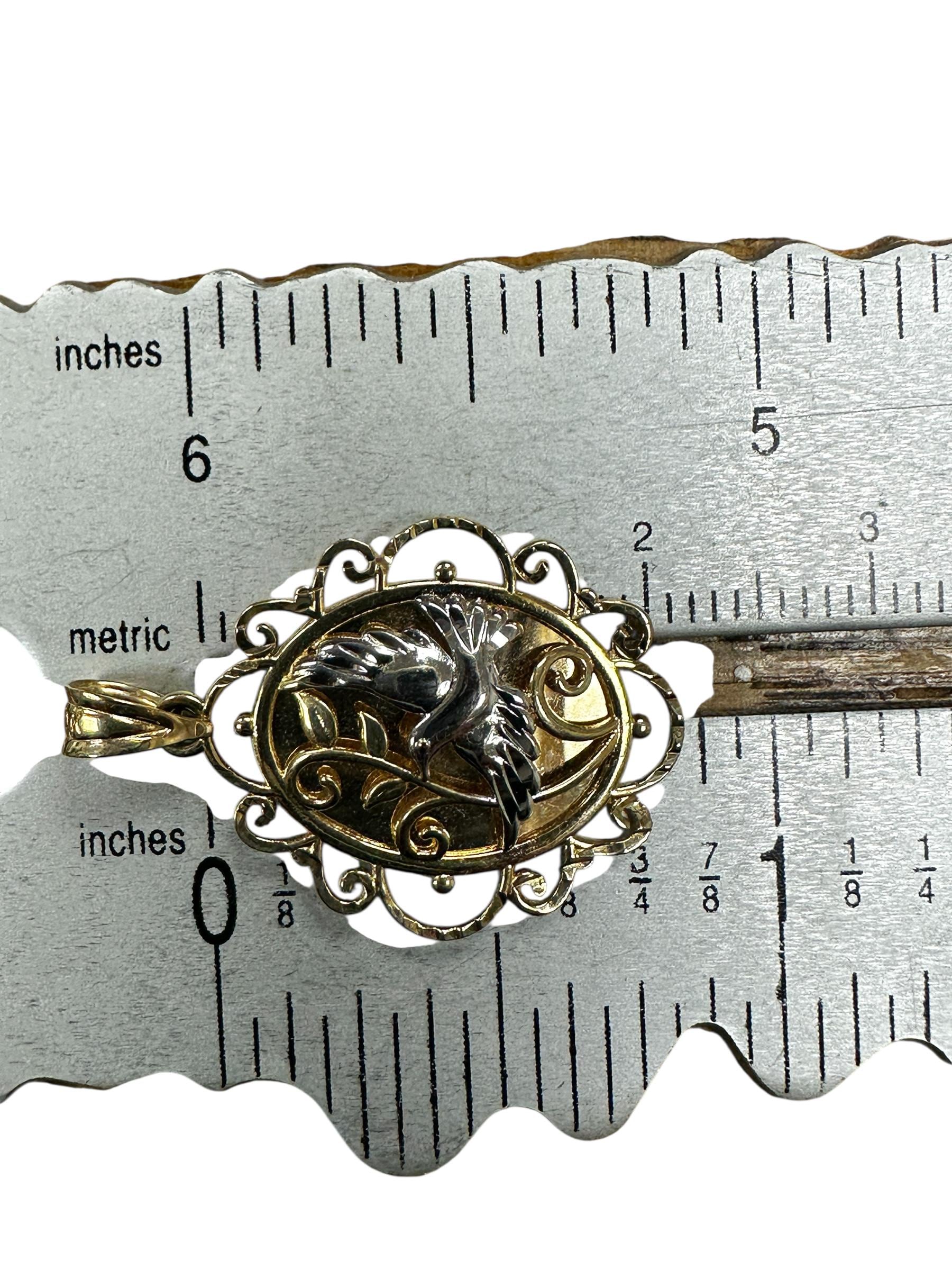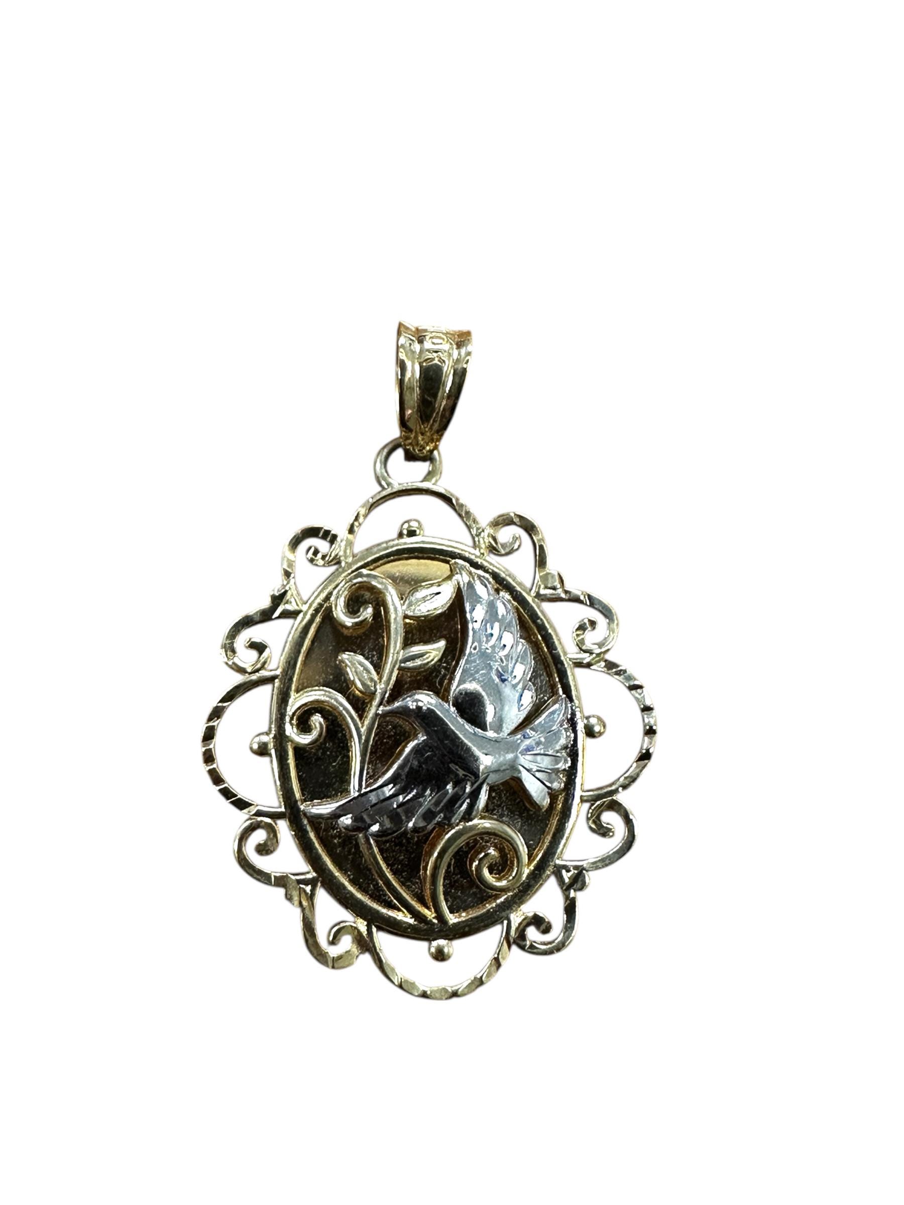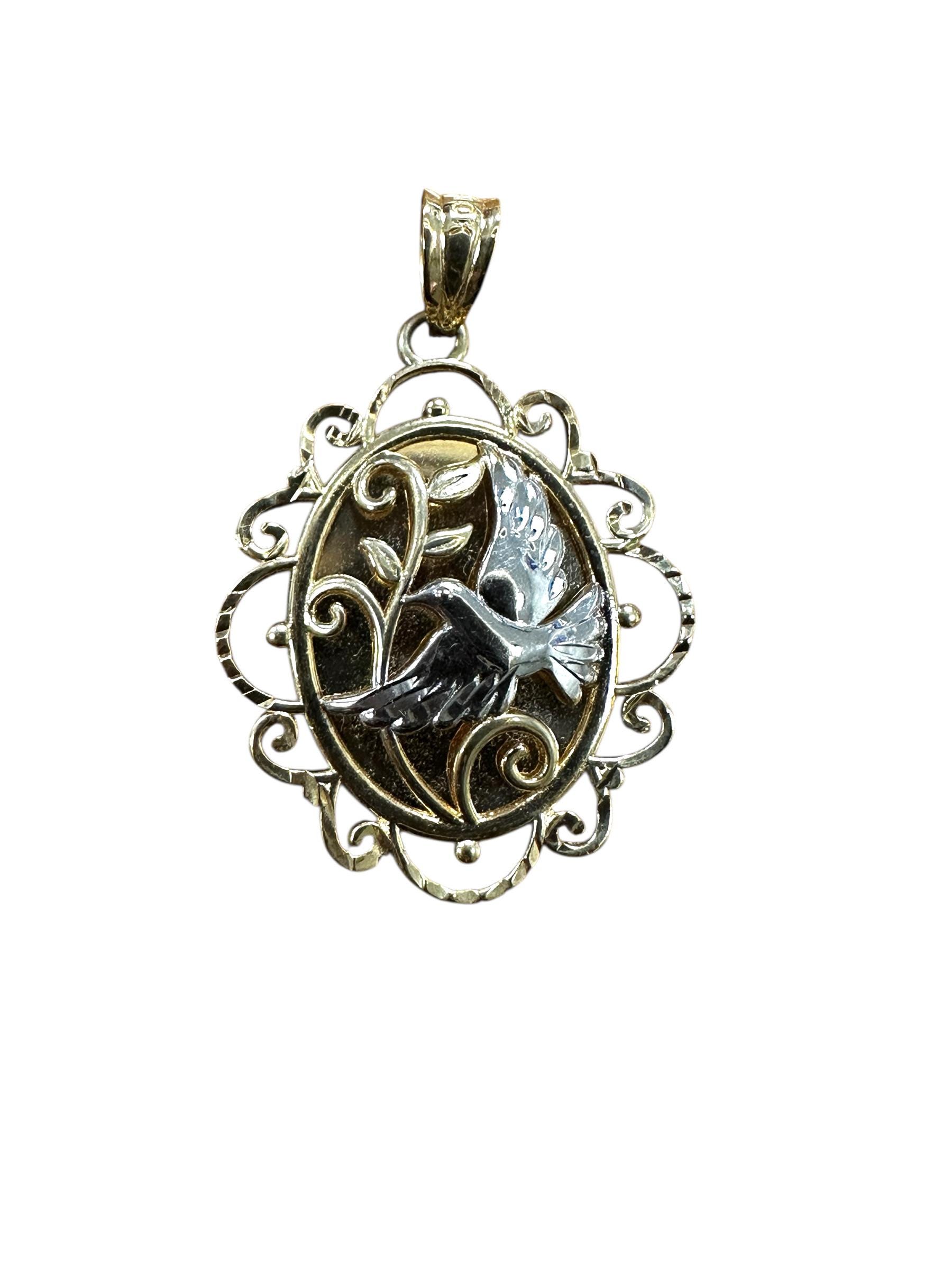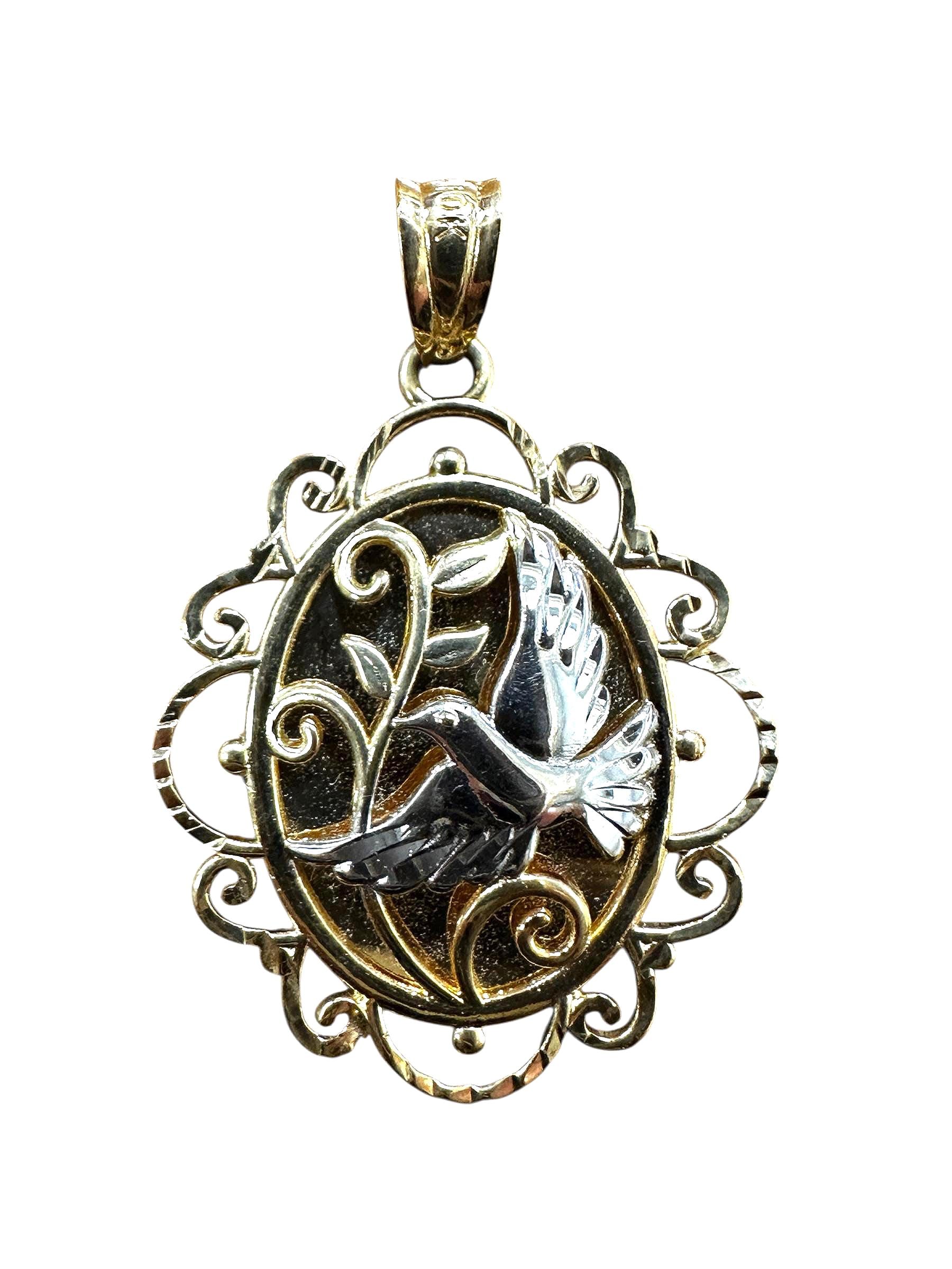 A beautiful 10-karat yellow gold pendant featuring a graceful white gold bird in flight. The front showcases a dimensional, sculpted design, framed by an elegant border of gold scrollwork. A meaningful piece for anyone who loves inspirational symbols and heartfelt messages.