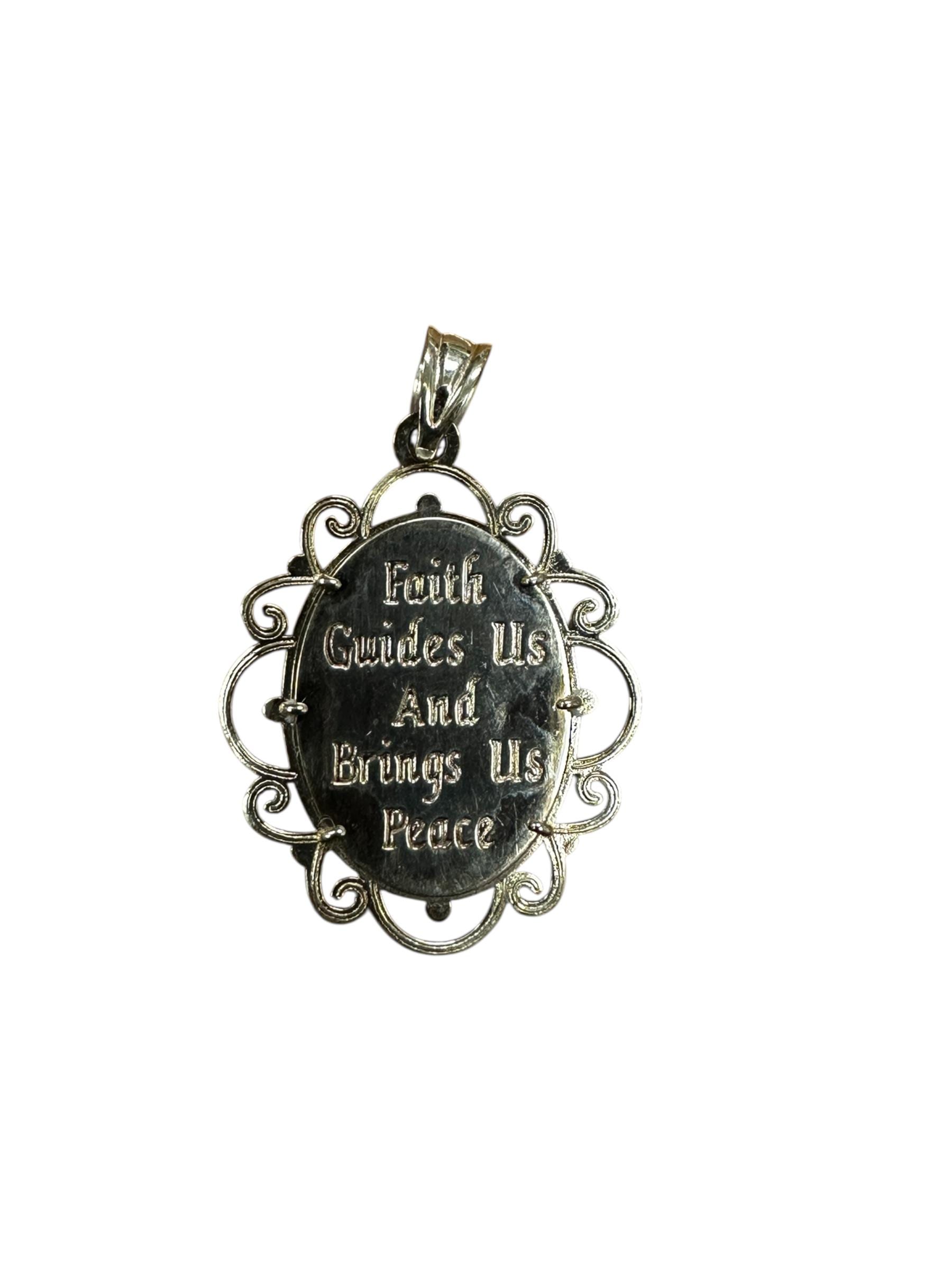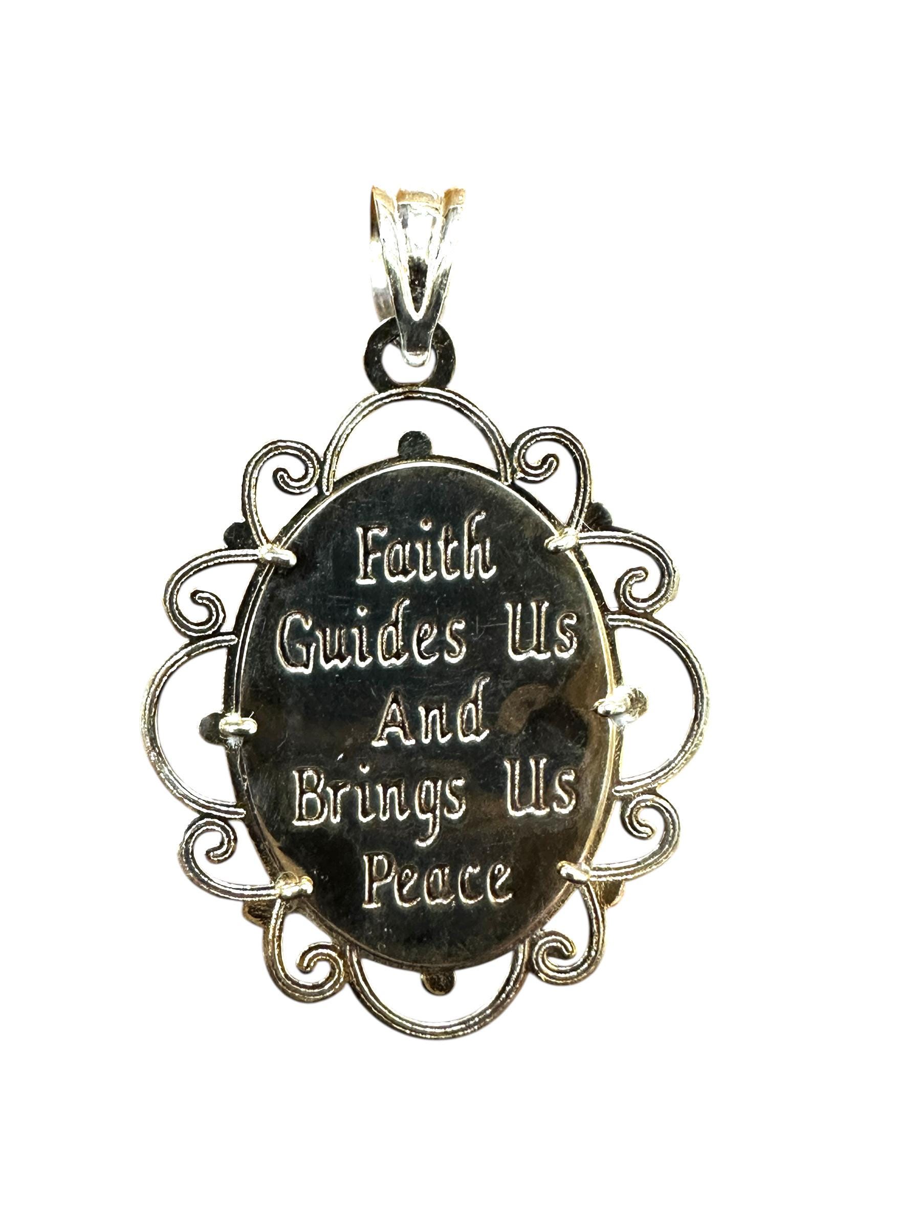Metal: 10 karat yellow and white gold. Engraved on the back of the oval center piece is the following: "Faith guides us and brings us piece."