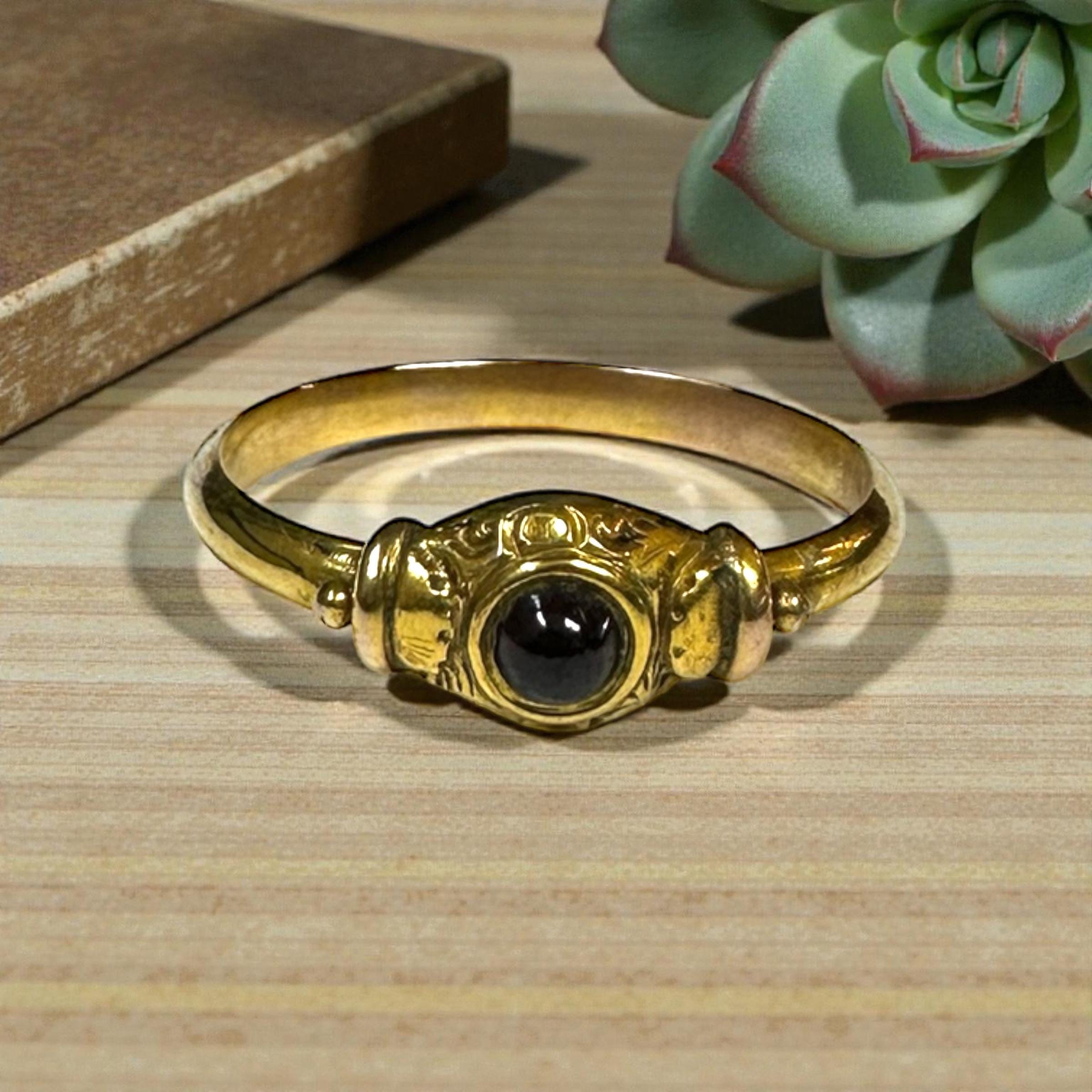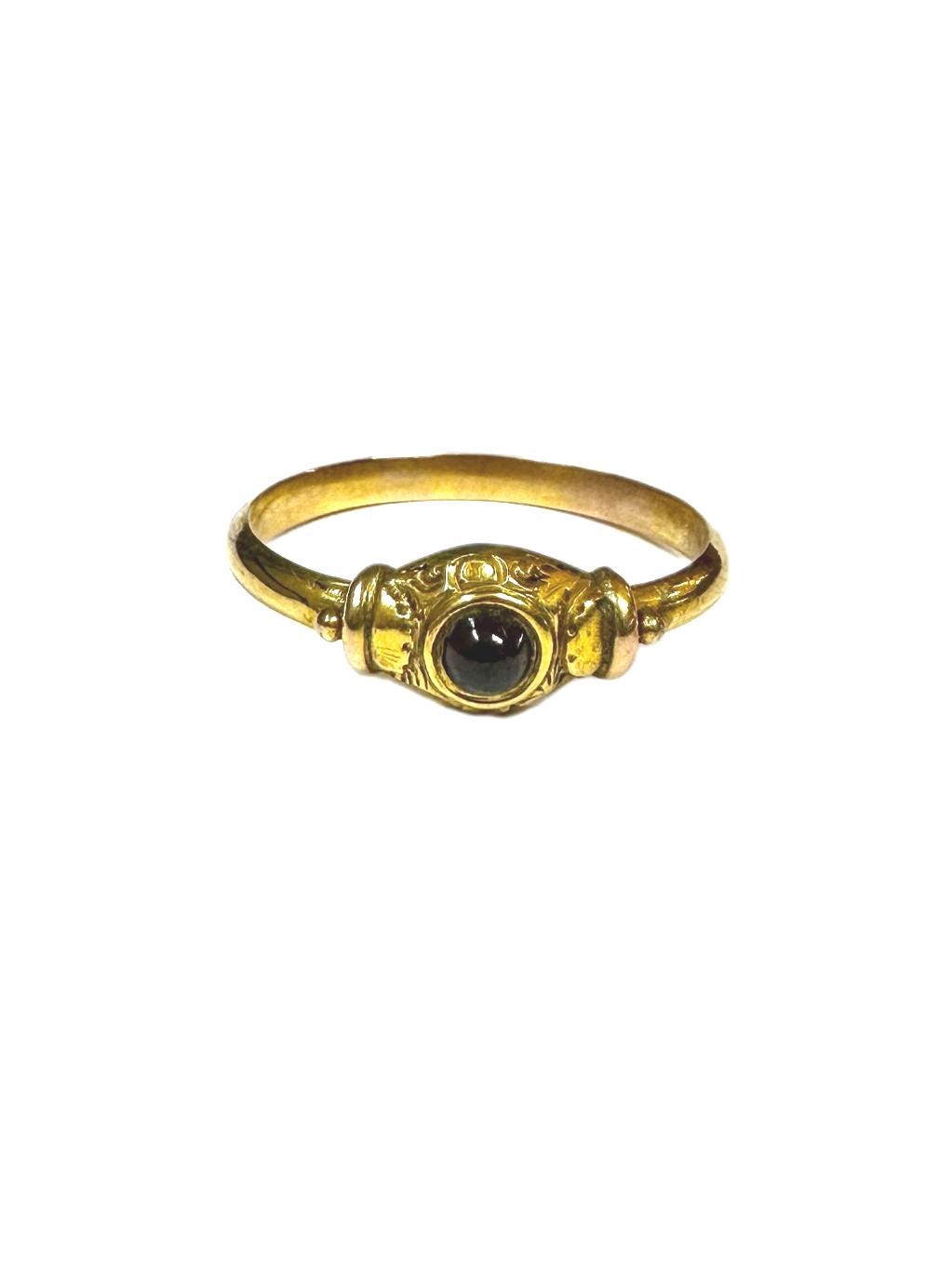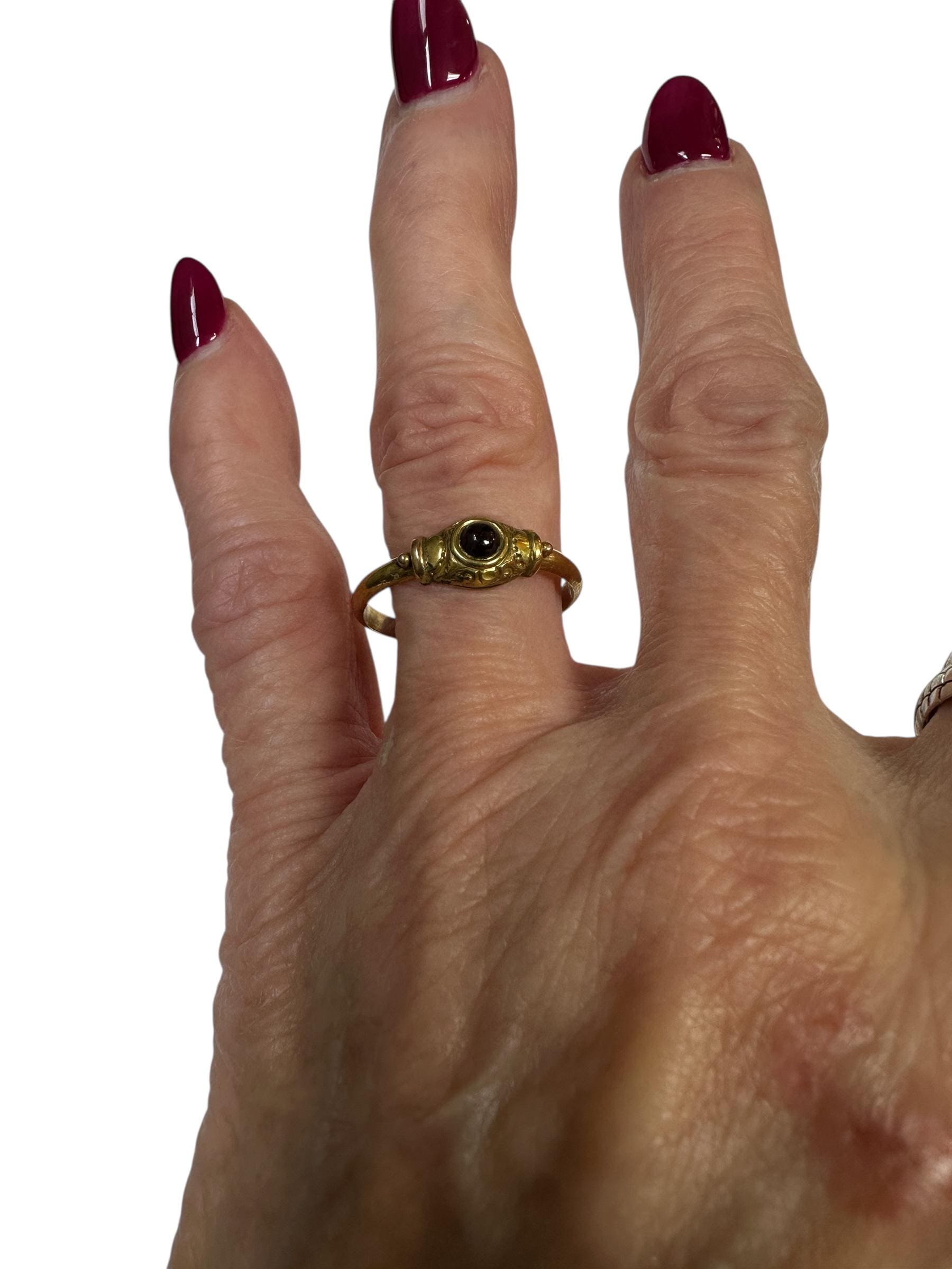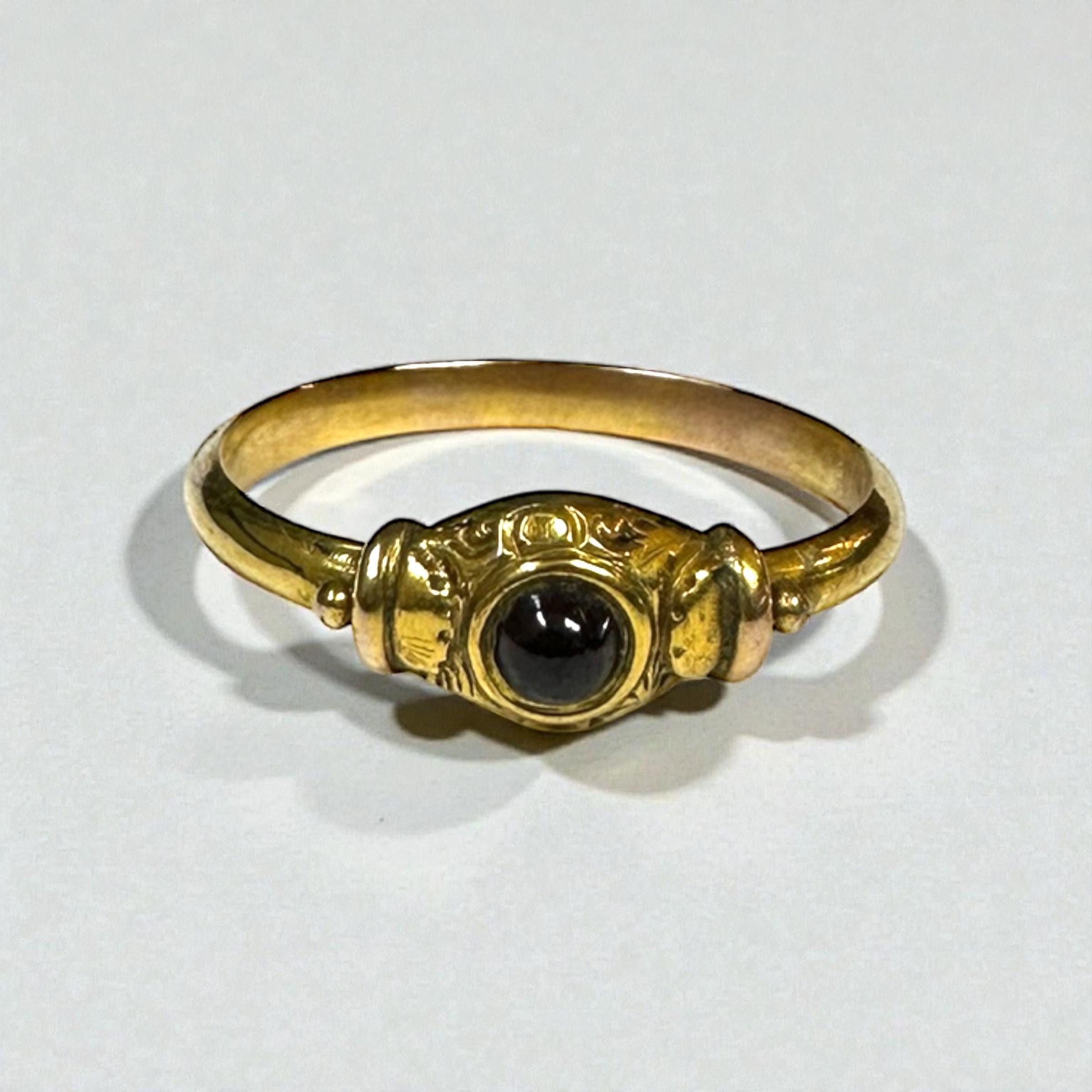 Gemstone: One round cabochon cut garnet measuring approximately 3.5mm in diameter and is dark red in hue. The garnet shows some slight wear due to age.