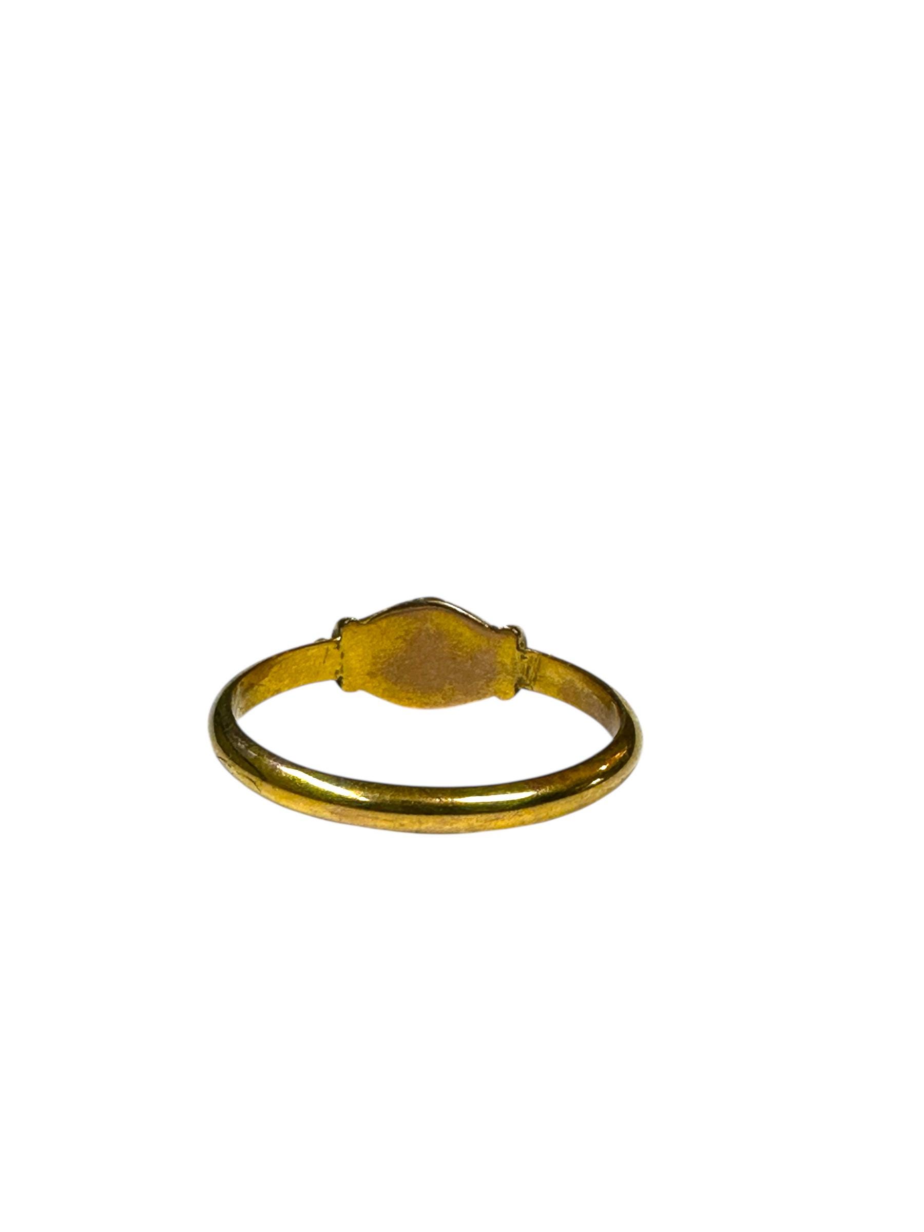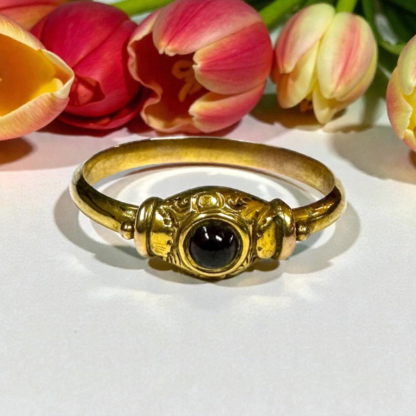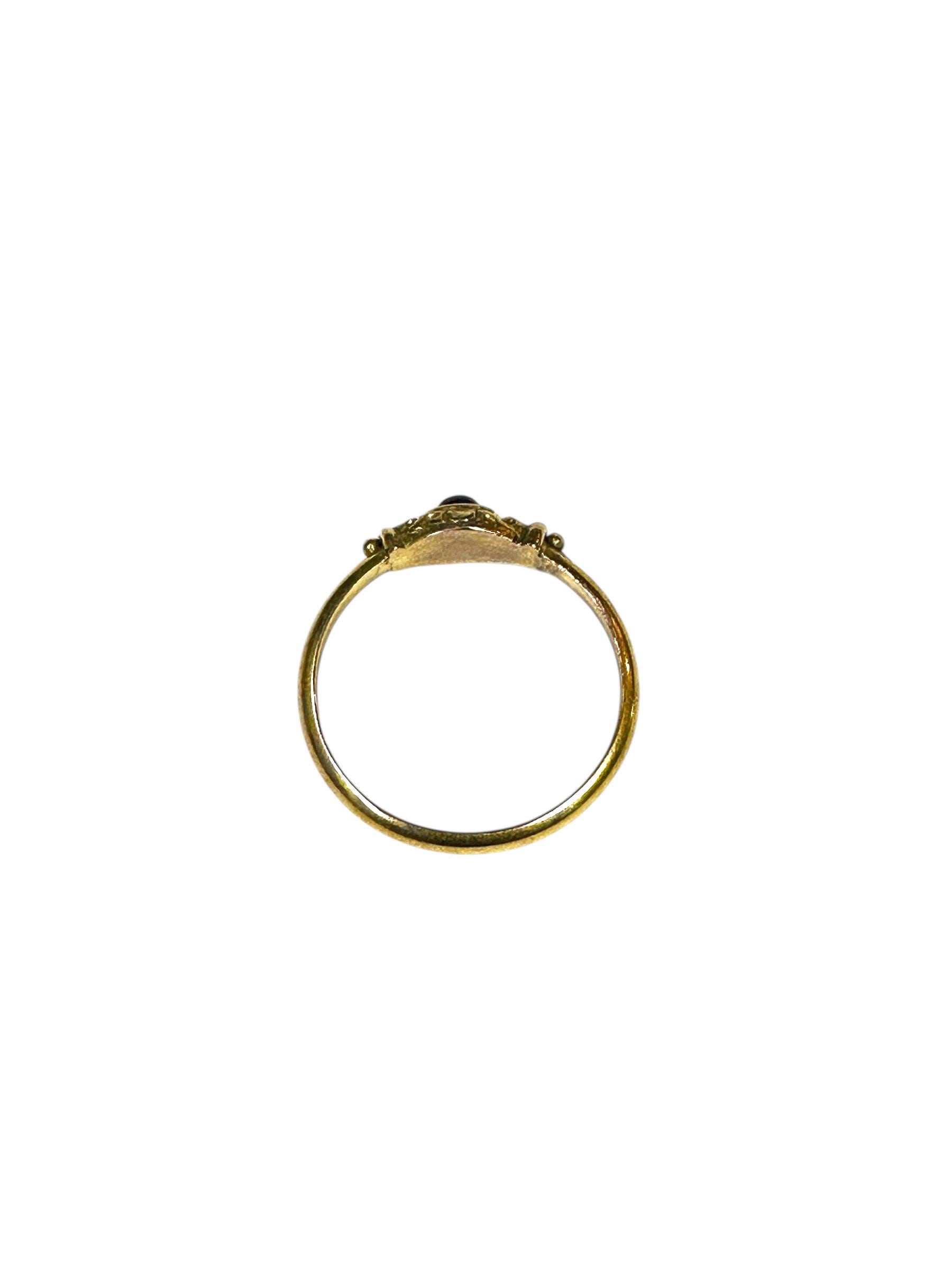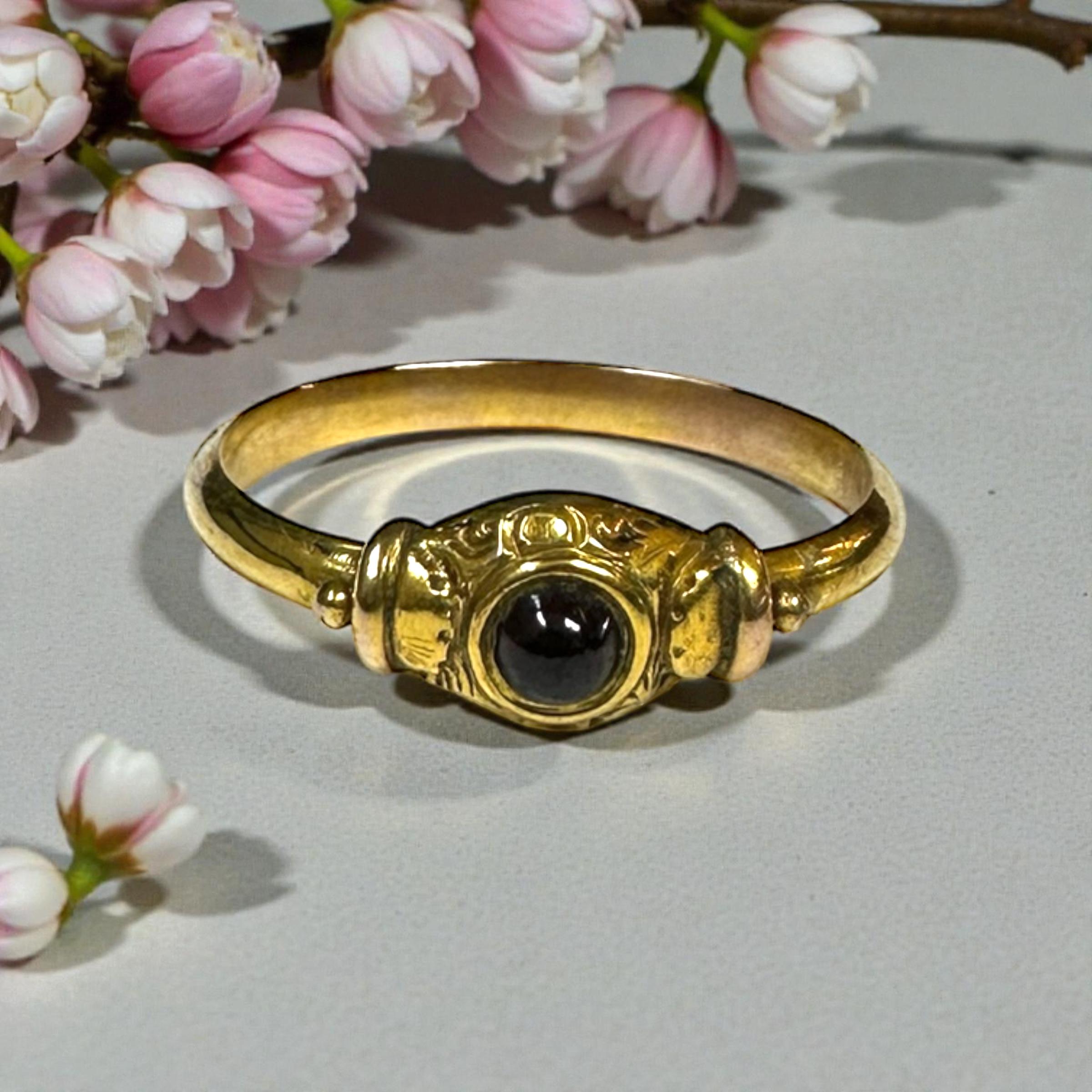 Gemstone: One round cabochon cut garnet measuring approximately 3.5mm in diameter and is dark red in hue. The garnet shows some slight wear due to age.