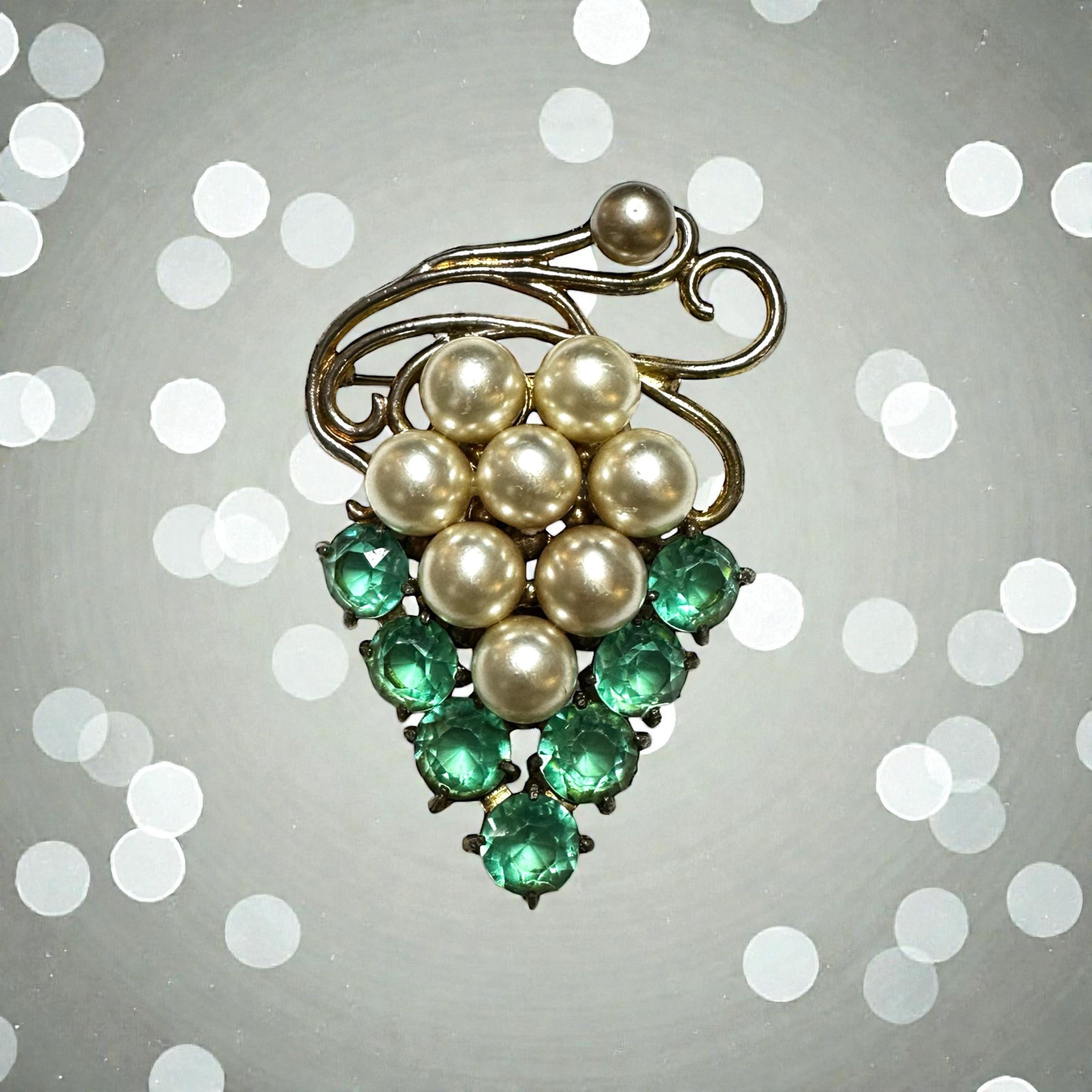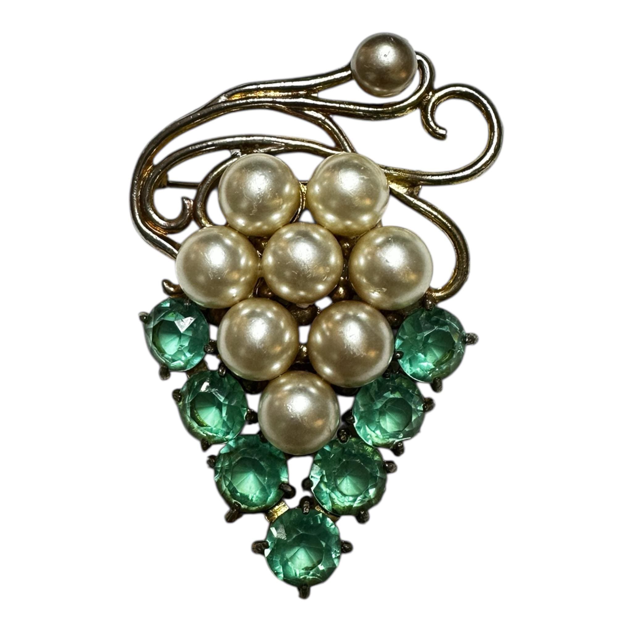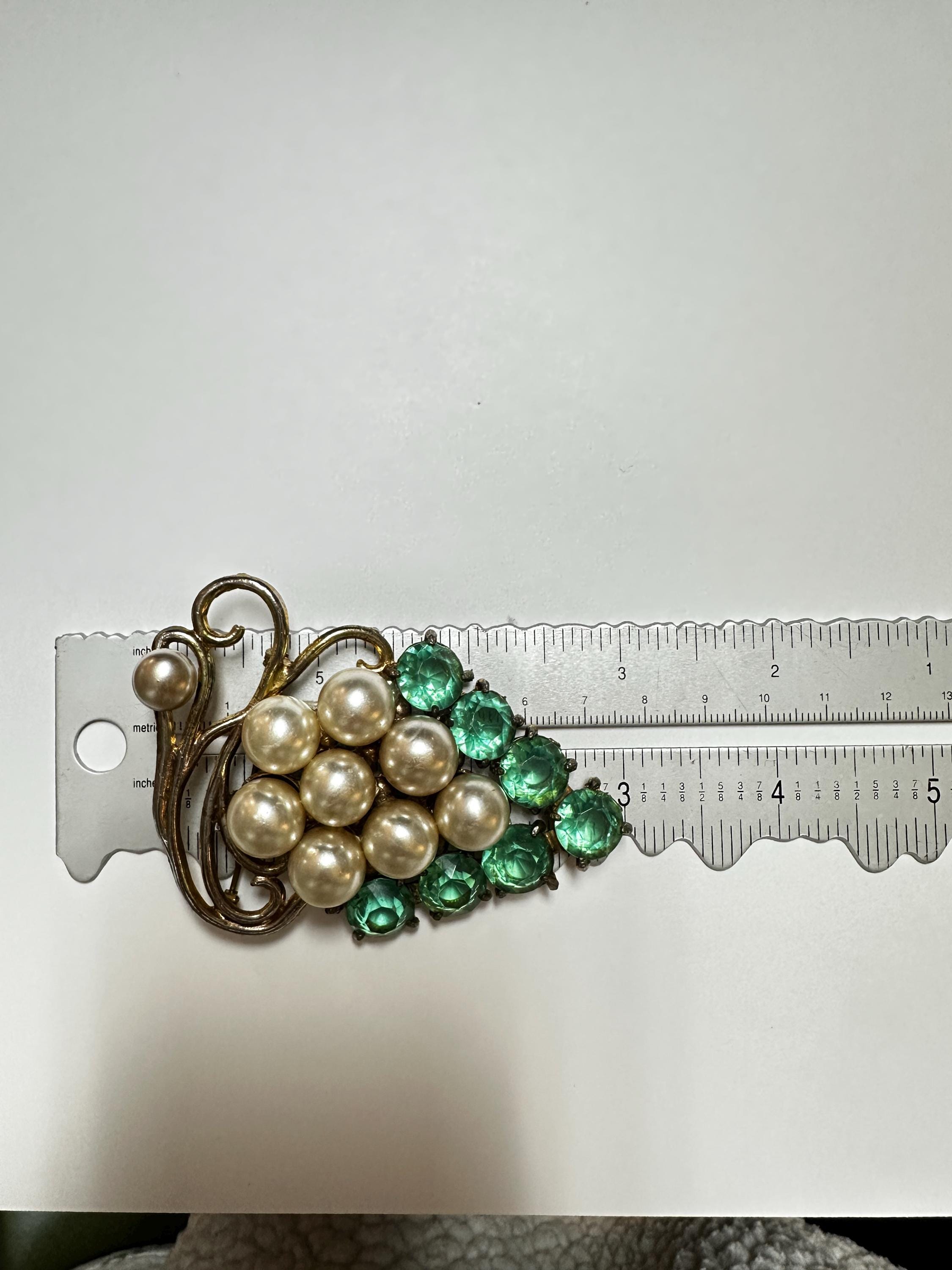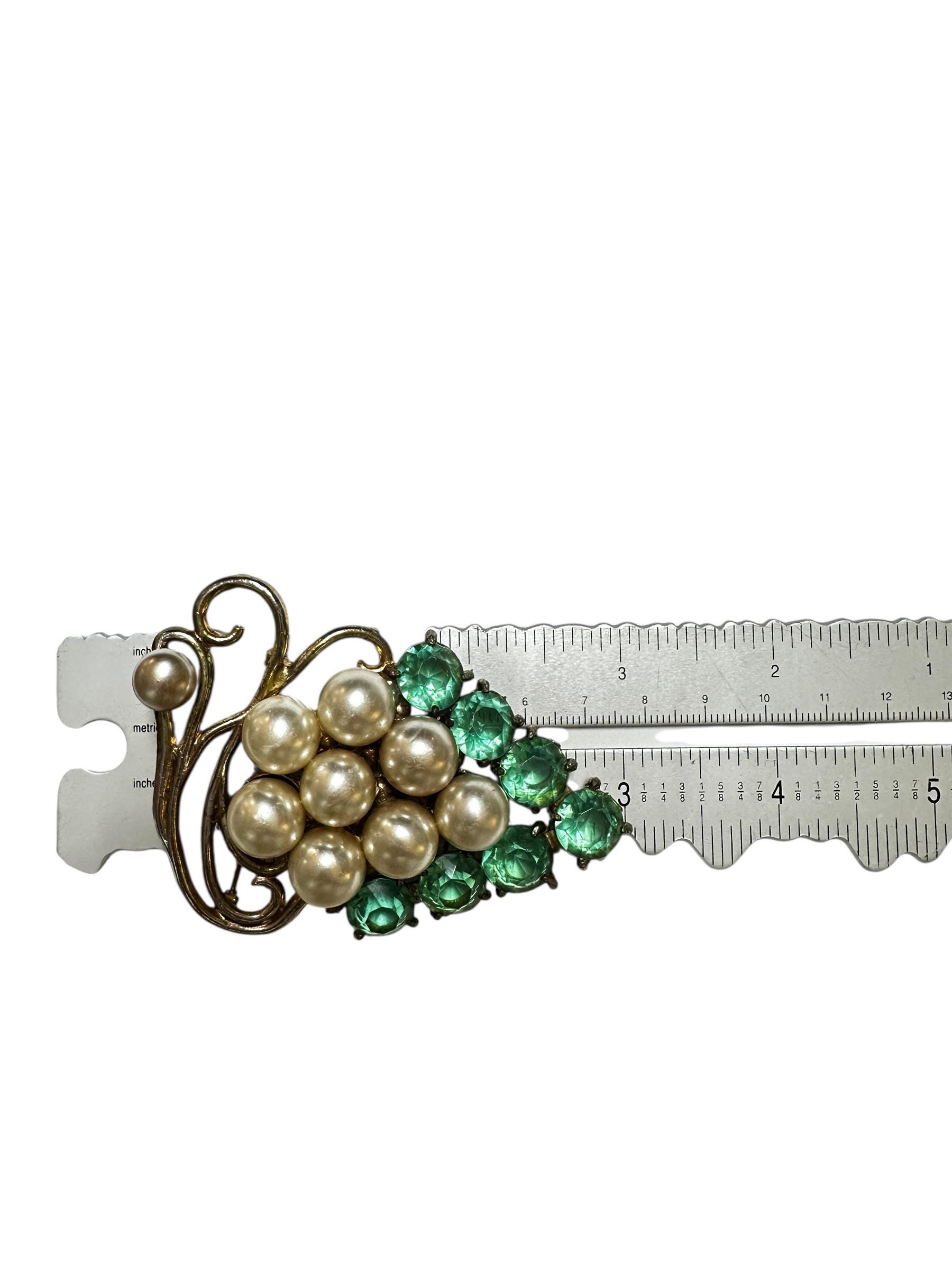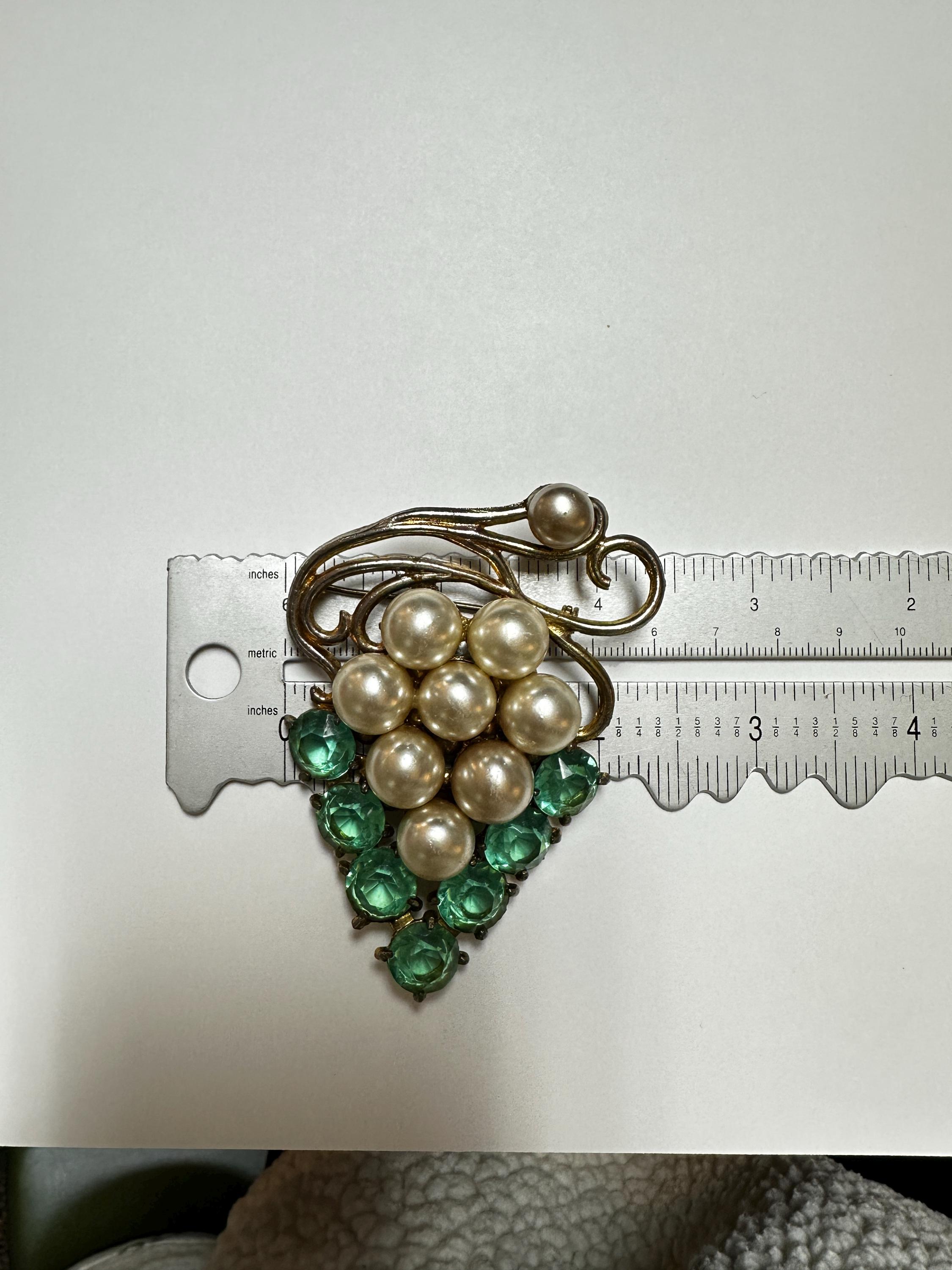 A large 1940's-1950's grape brooch that is a true vintage statement piece. With large faux pearls and seven round green transparent glass "stones" this brooch is wonderfully nostalgic. This is a statement pin the really makes a statement! Wear on a jacket, coat, scarf or sweater and add some instant fun!