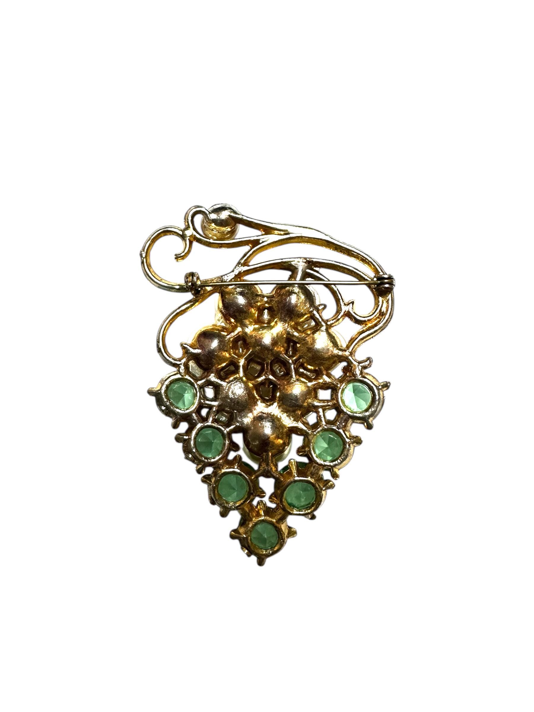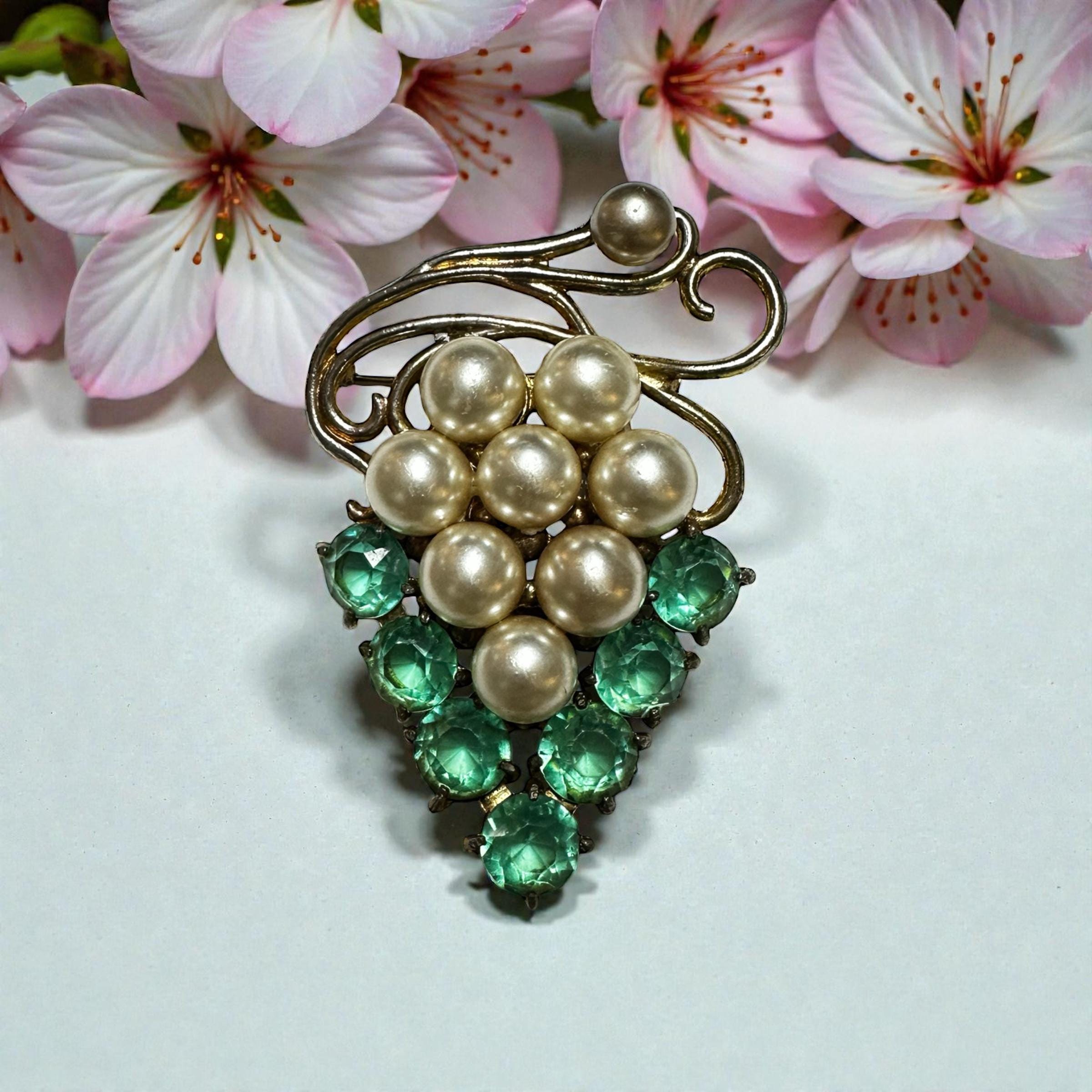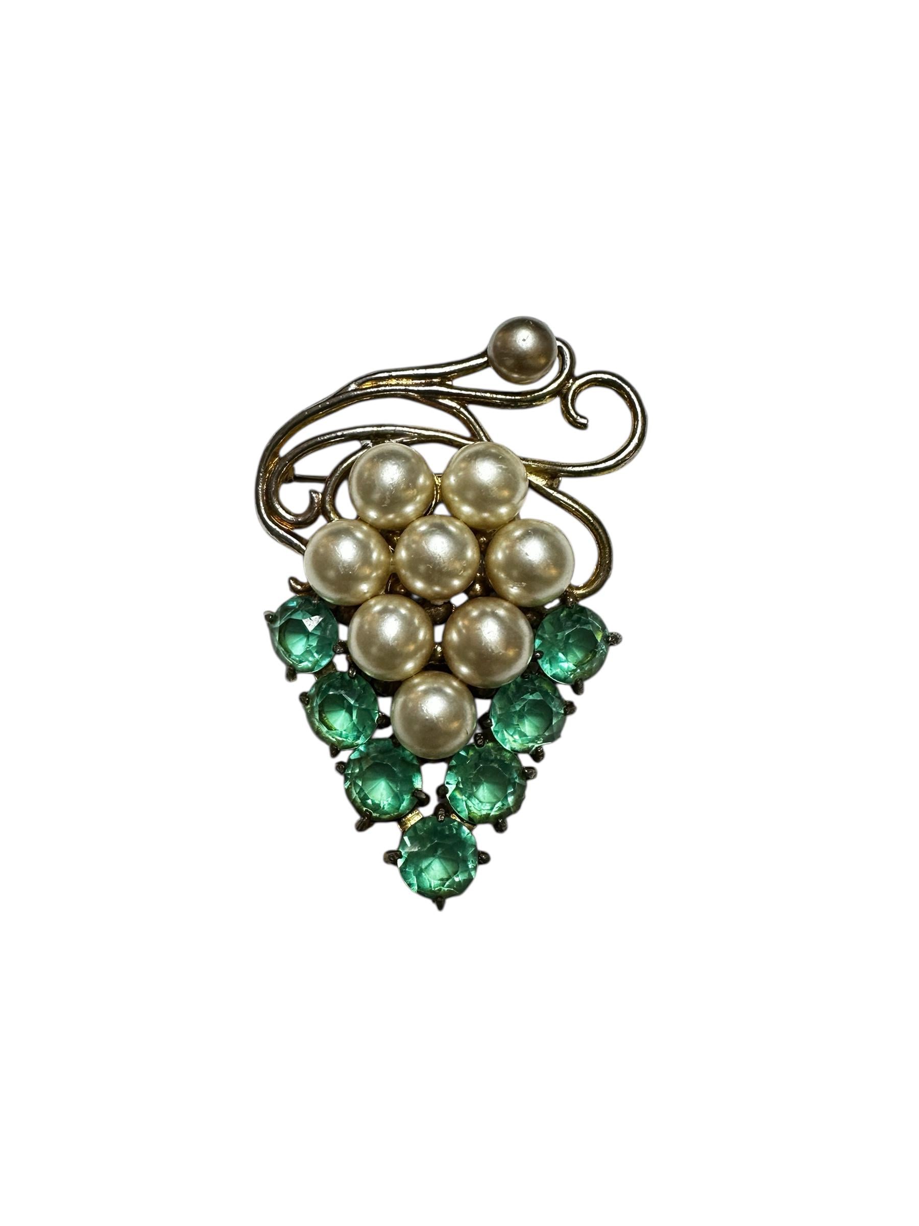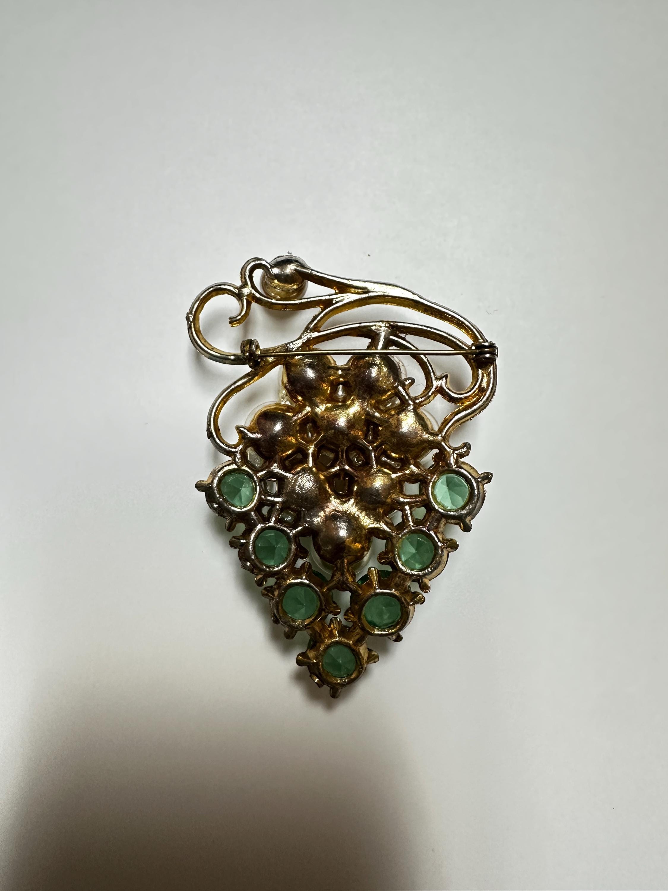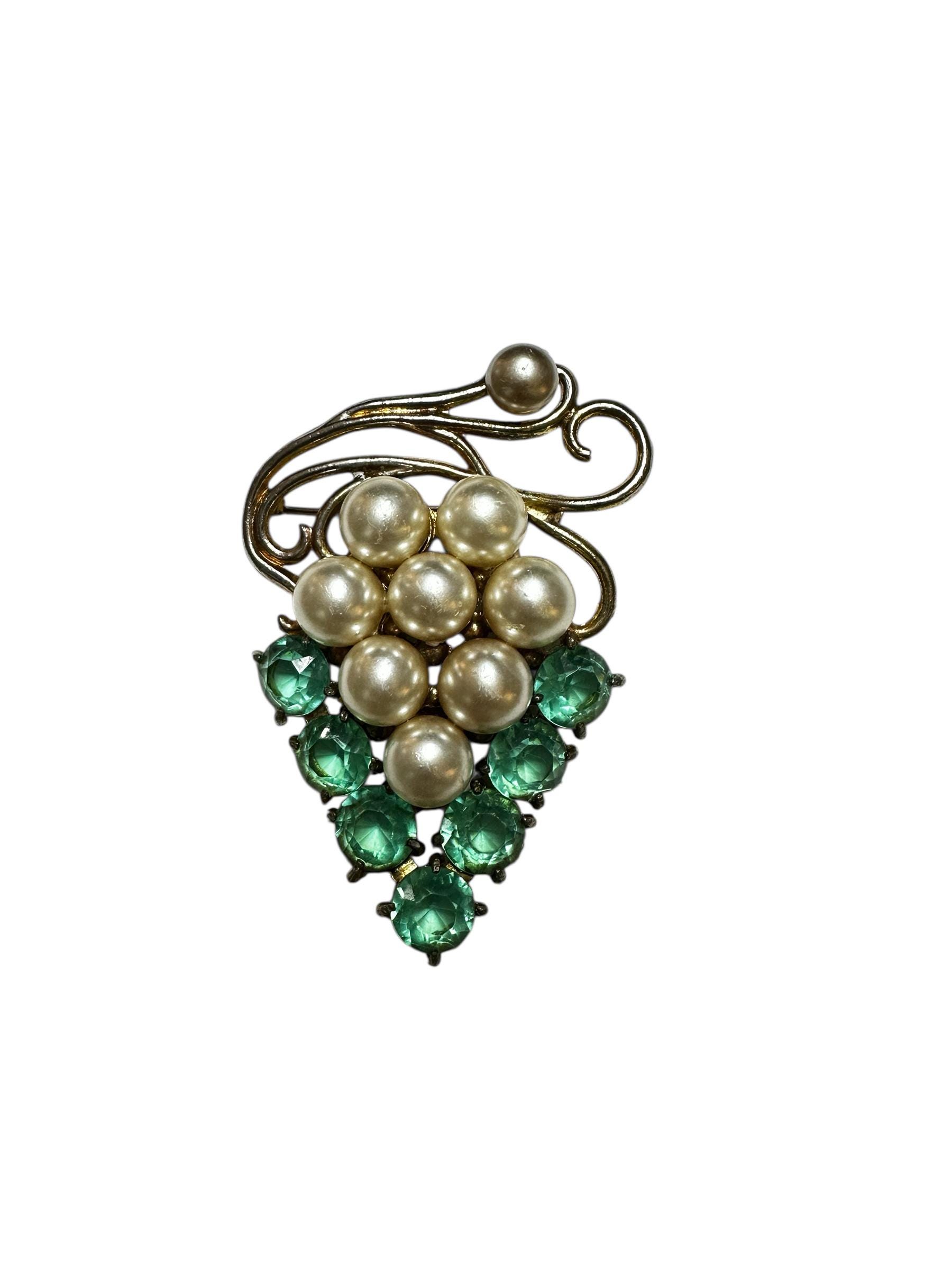 A large 1940's-1950's grape brooch that is a true vintage statement piece. With large faux pearls and seven round green transparent glass "stones" this brooch is wonderfully nostalgic. This is a statement pin the really makes a statement! Wear on a jacket, coat, scarf or sweater and add some instant fun!