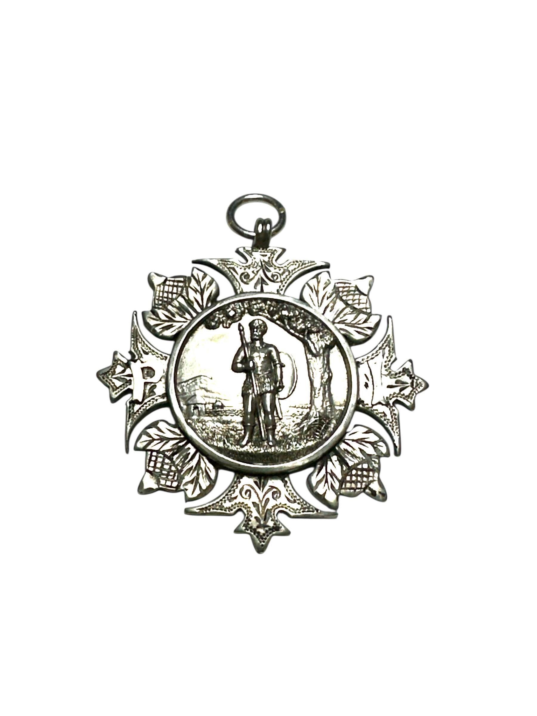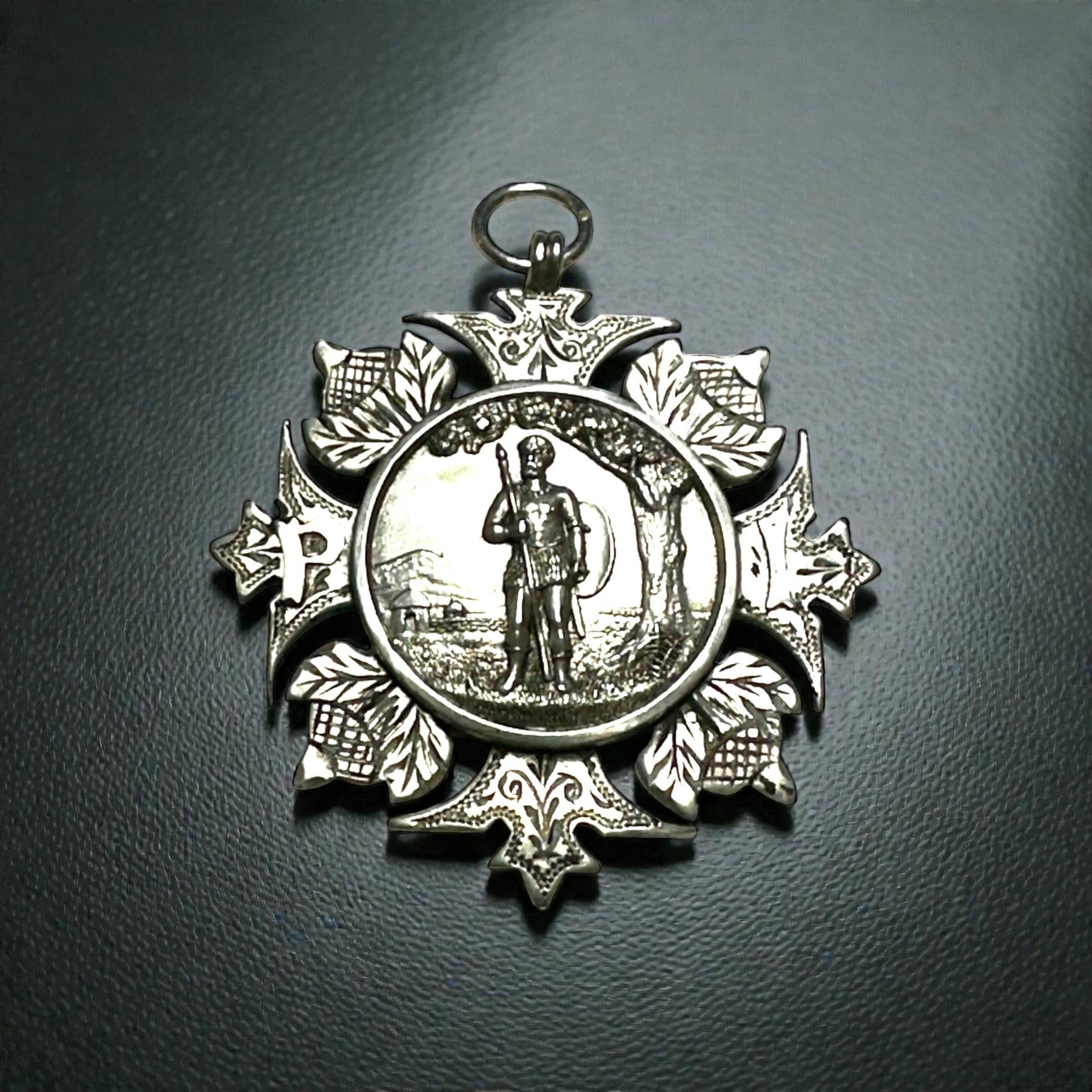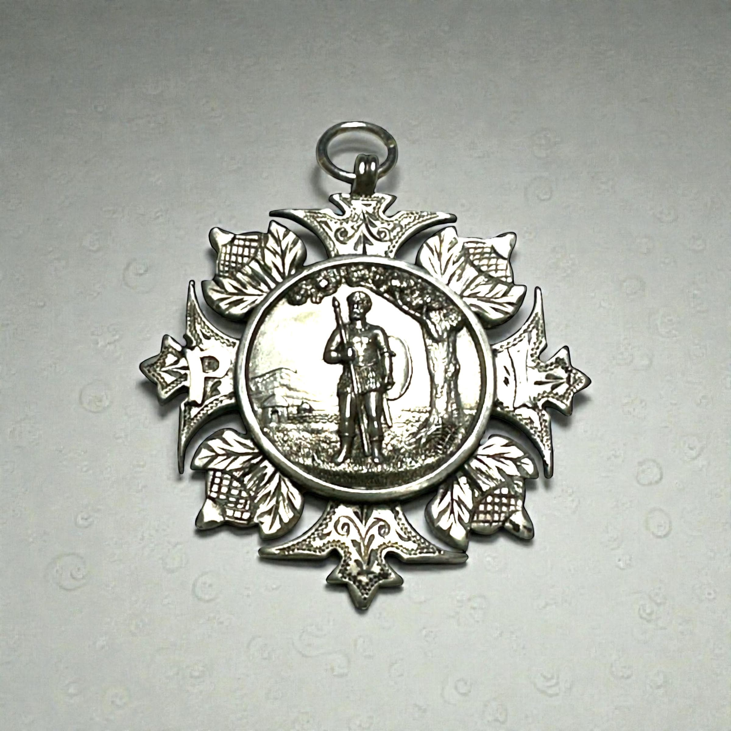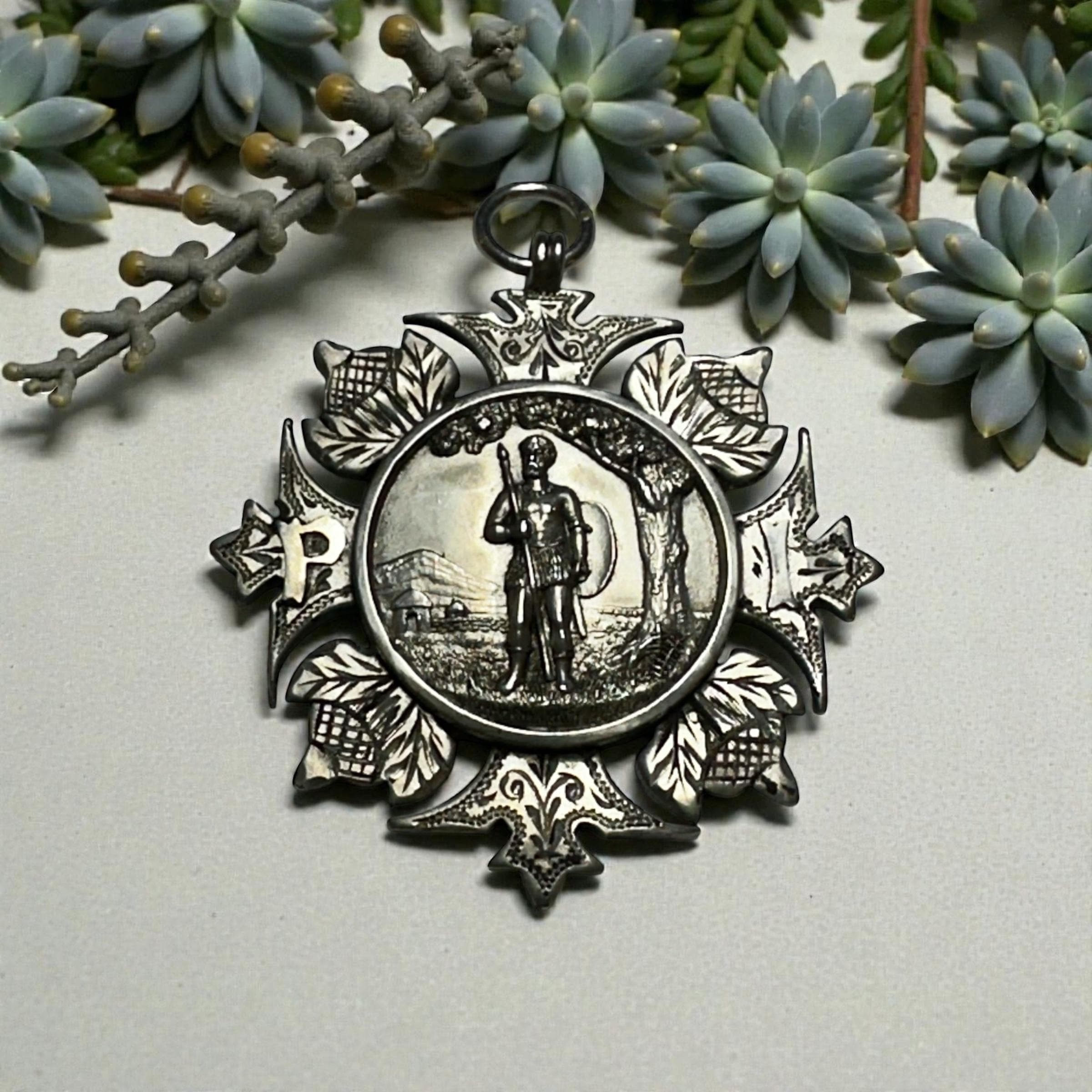 This remarkable antique 1909 Sterling Silver hallmarked medal is rich with history and symbolism. The front features a finely detailed warrior holding a spear and shield, framed by an intricate acorn motif, symbolizing strength and endurance.