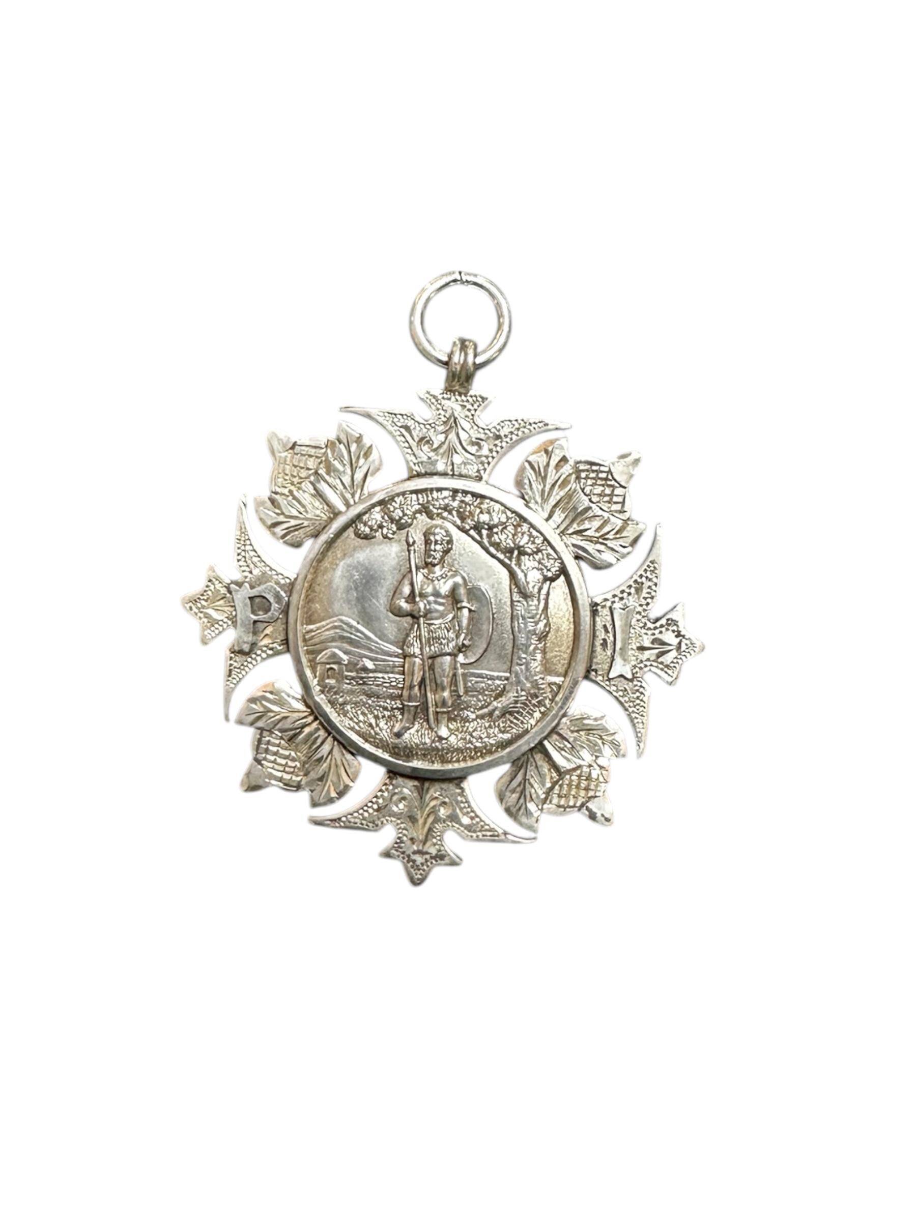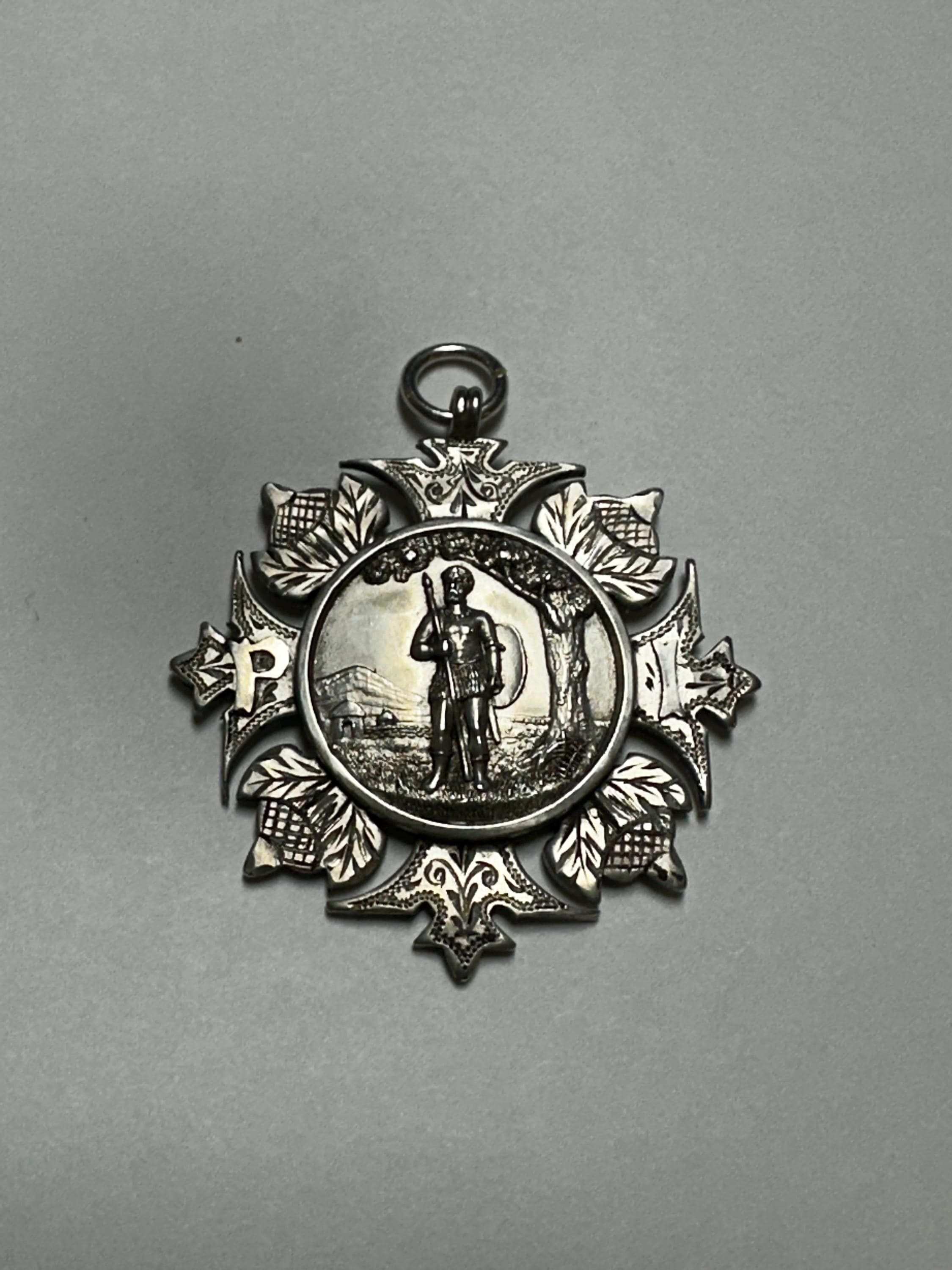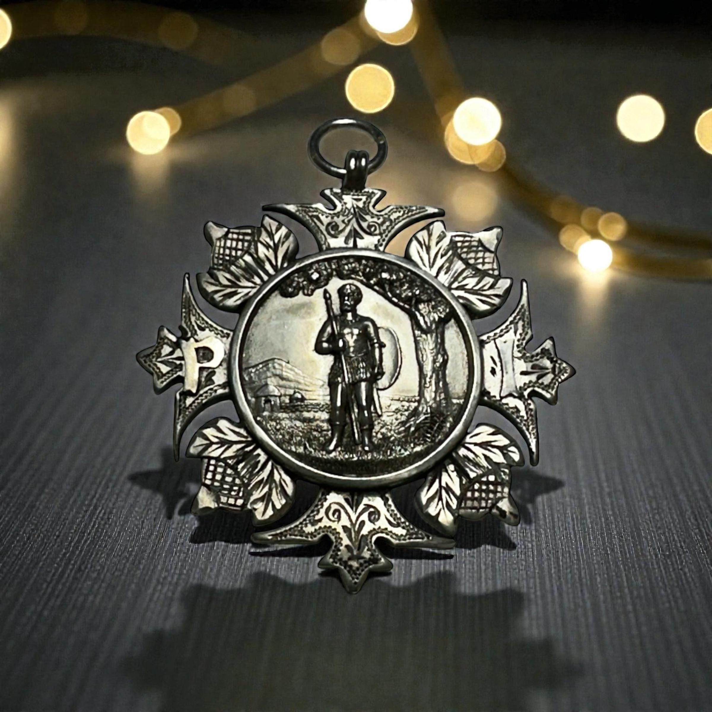 This remarkable antique 1909 Sterling Silver hallmarked medal is rich with history and symbolism. The front features a finely detailed warrior holding a spear and shield, framed by an intricate acorn motif, symbolizing strength and endurance.