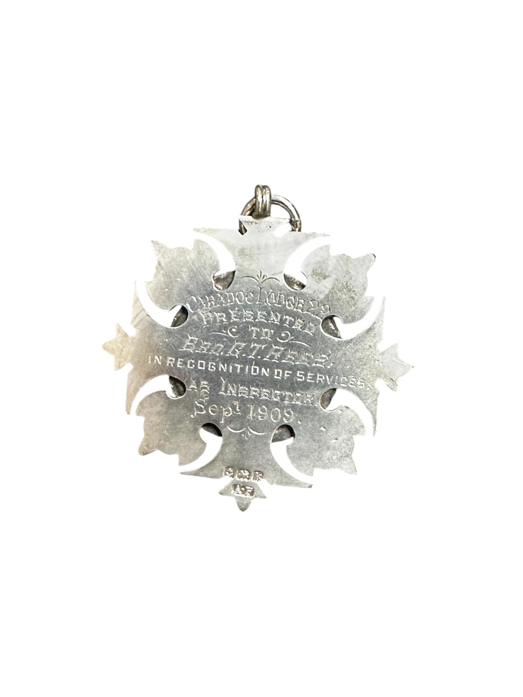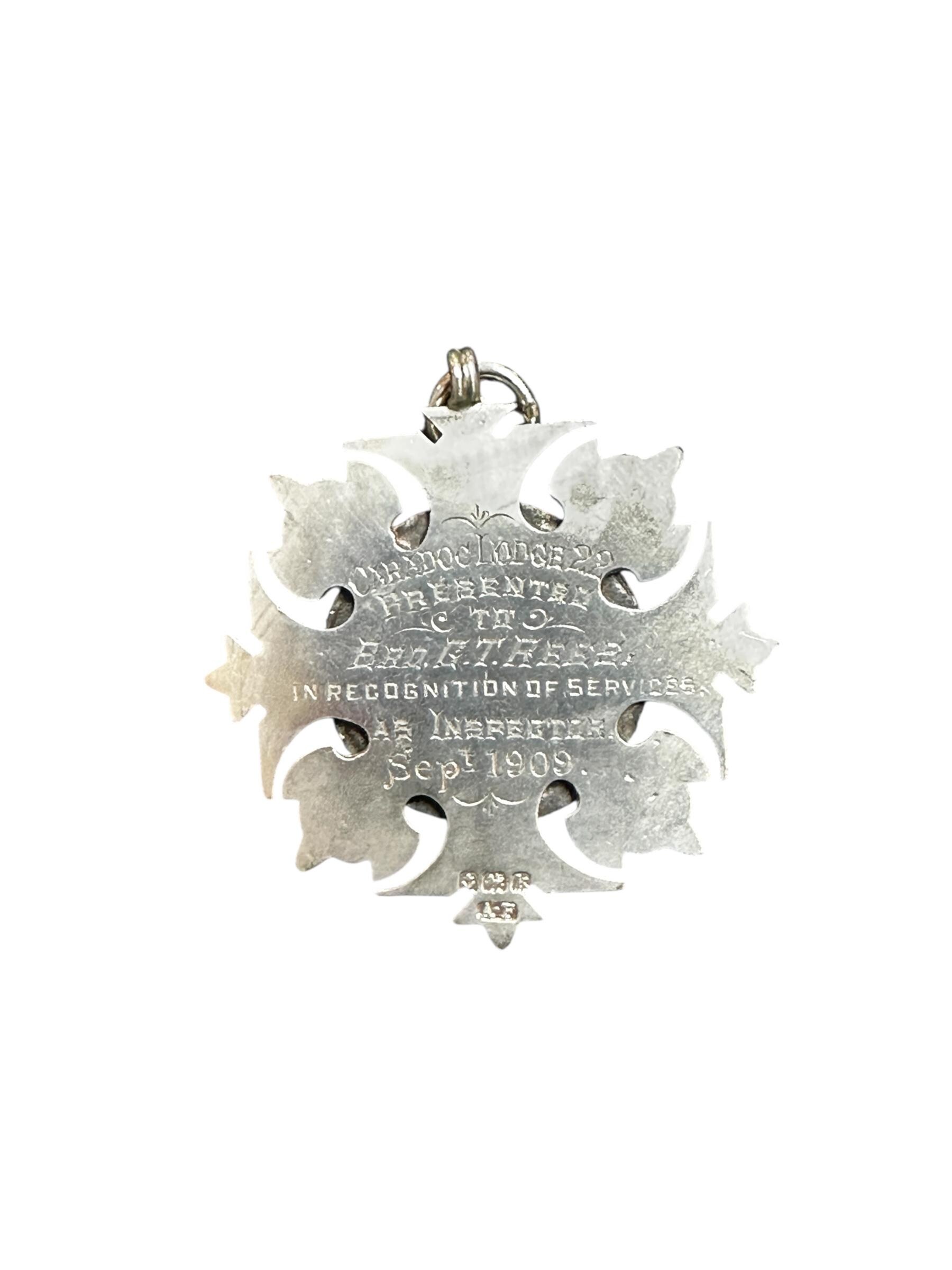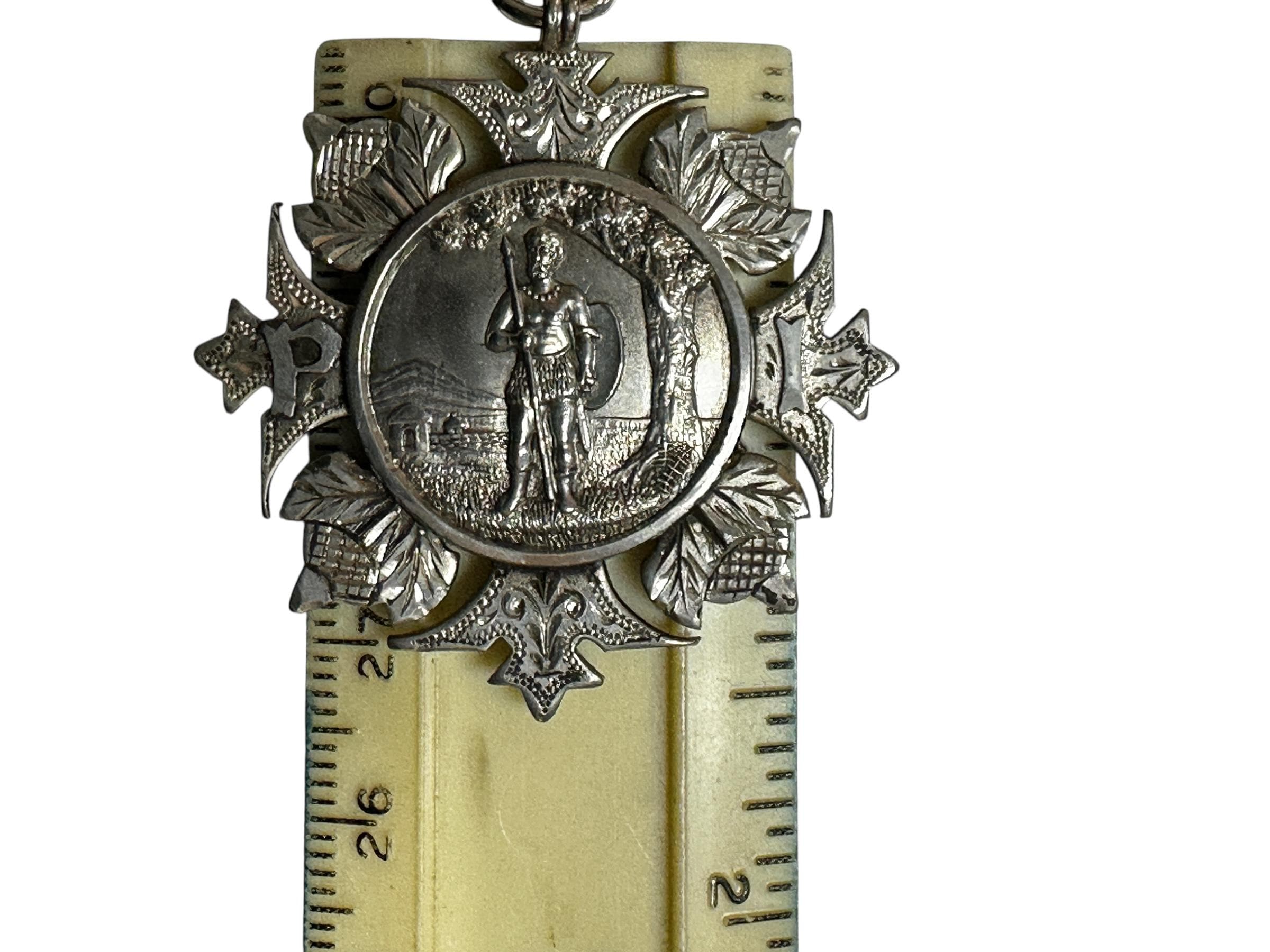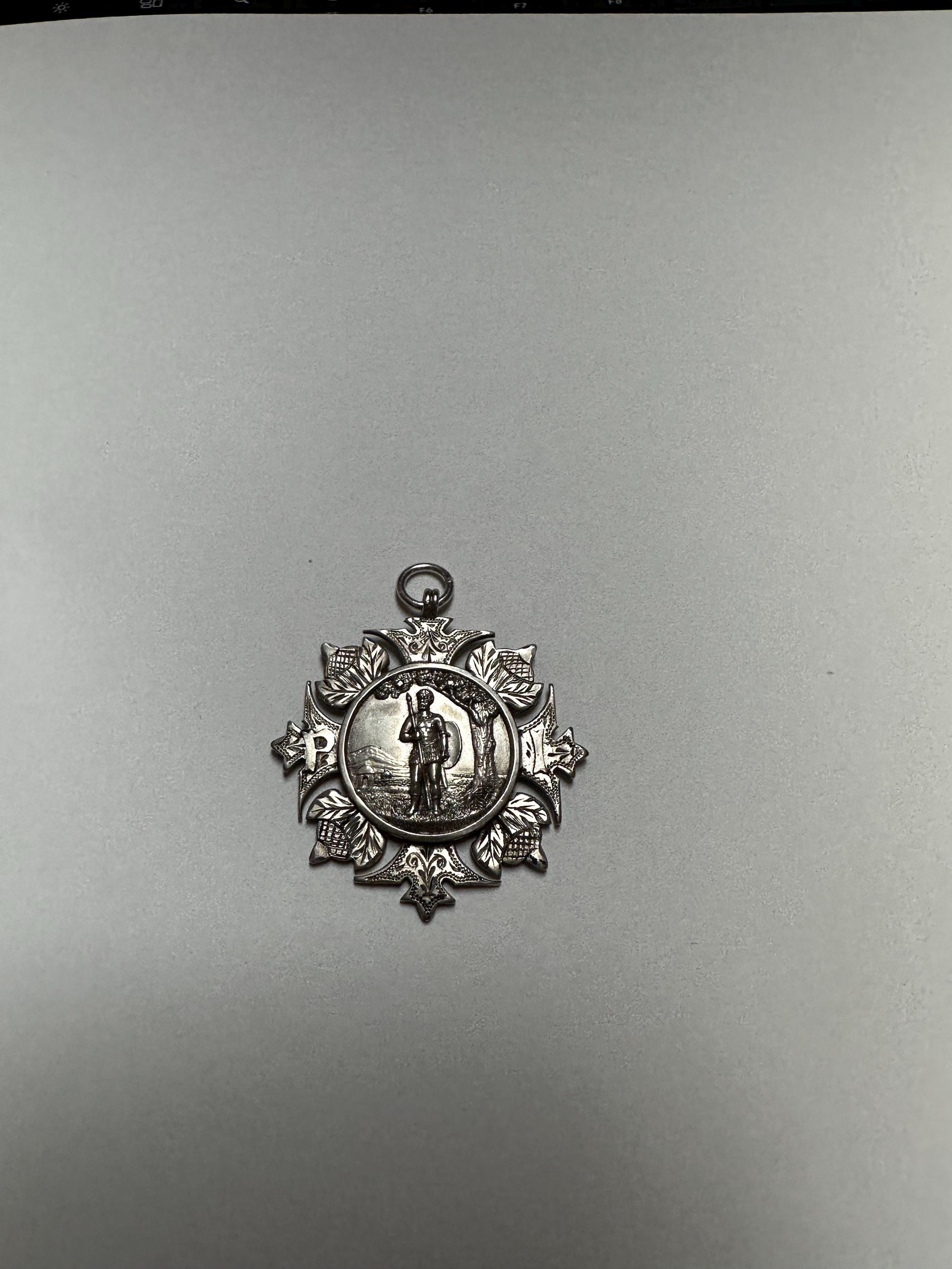 This remarkable antique 1909 Sterling Silver hallmarked medal is rich with history and symbolism. The front features a finely detailed warrior holding a spear and shield, framed by an intricate acorn motif, symbolizing strength and endurance.