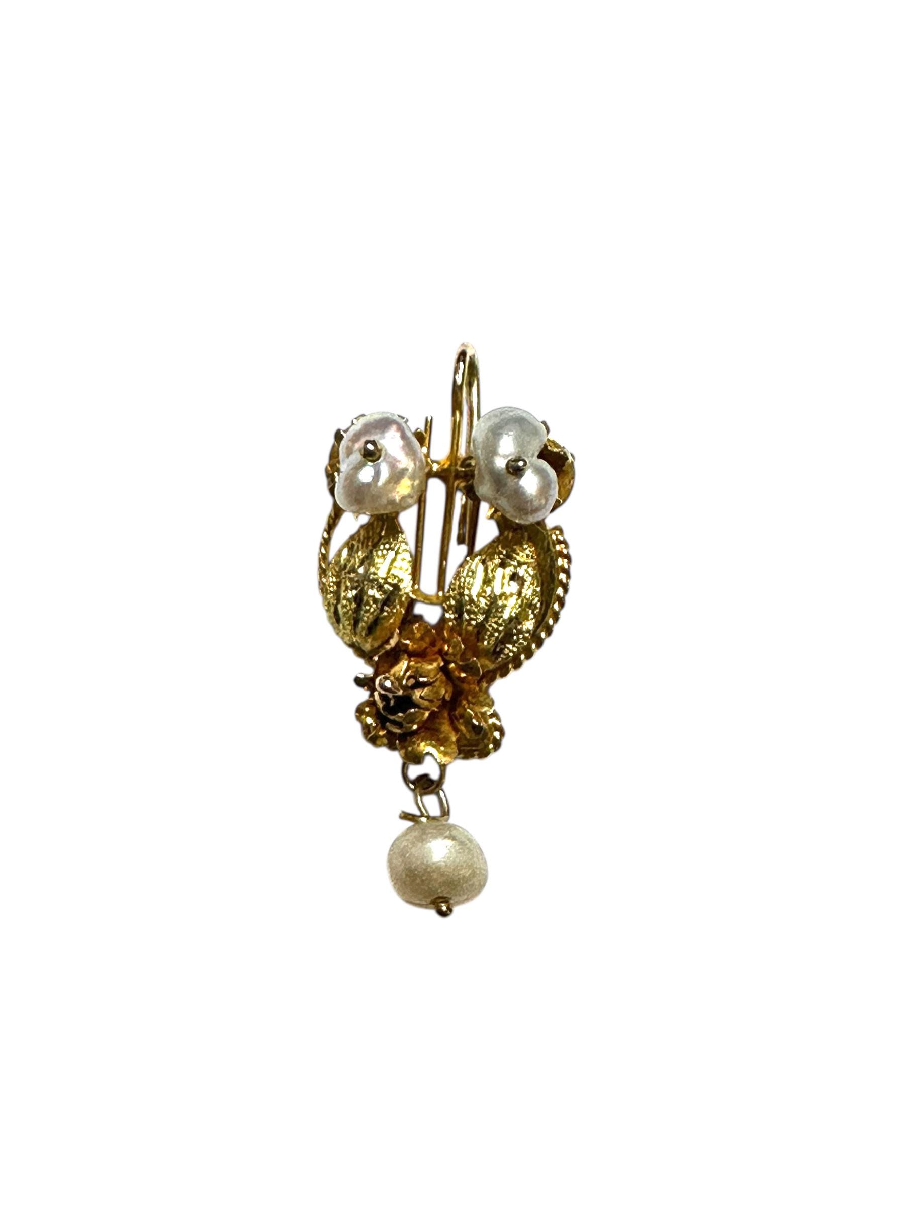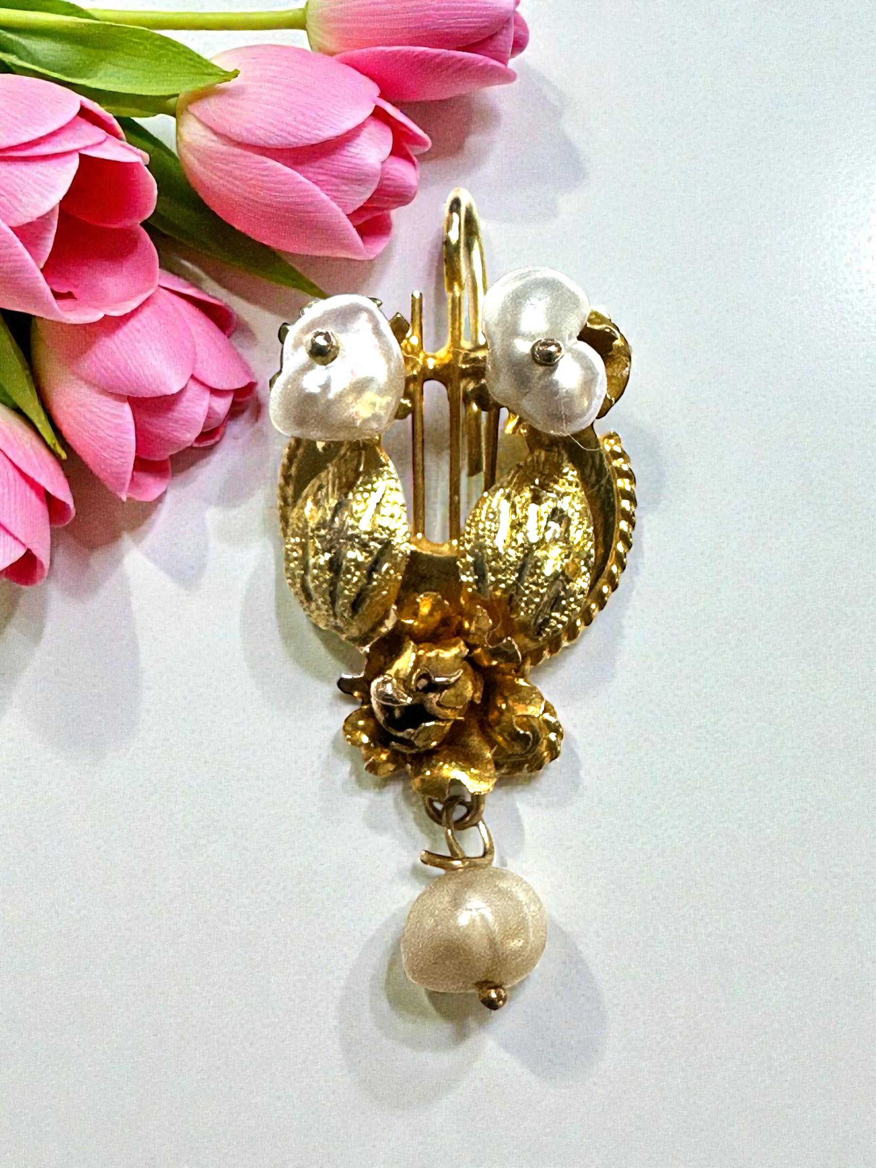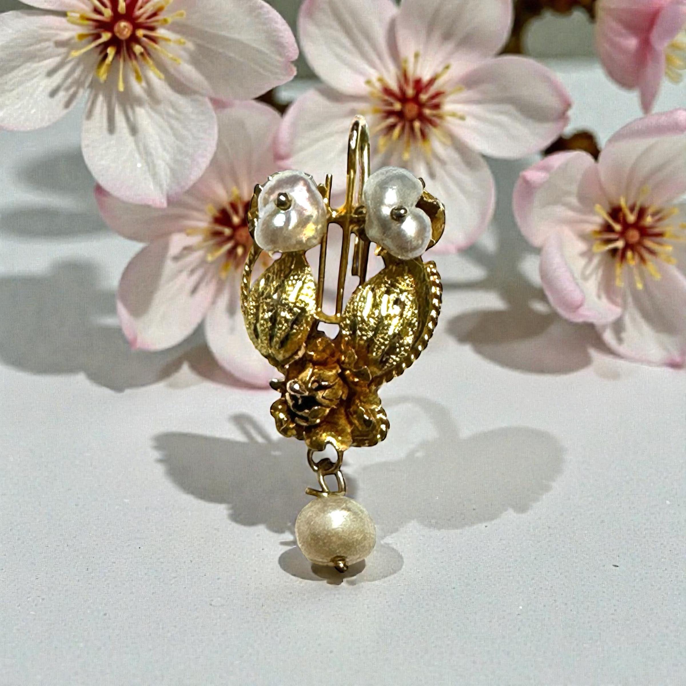 Introducing this antique 10 karat gold pendant with nature design. The rose bud at the bottom of the pendant is in rose gold, while the rest of the pendant is yellow gold. The pendant is accented by three baroque pearls. Very late Victorian early Edwardian!