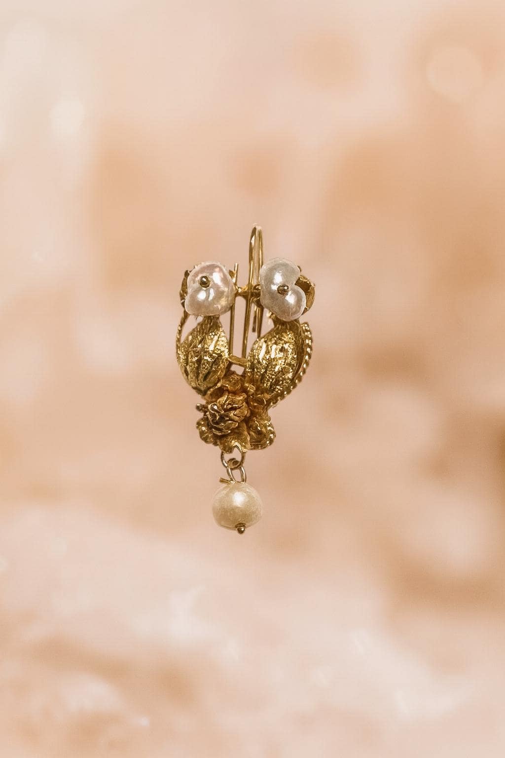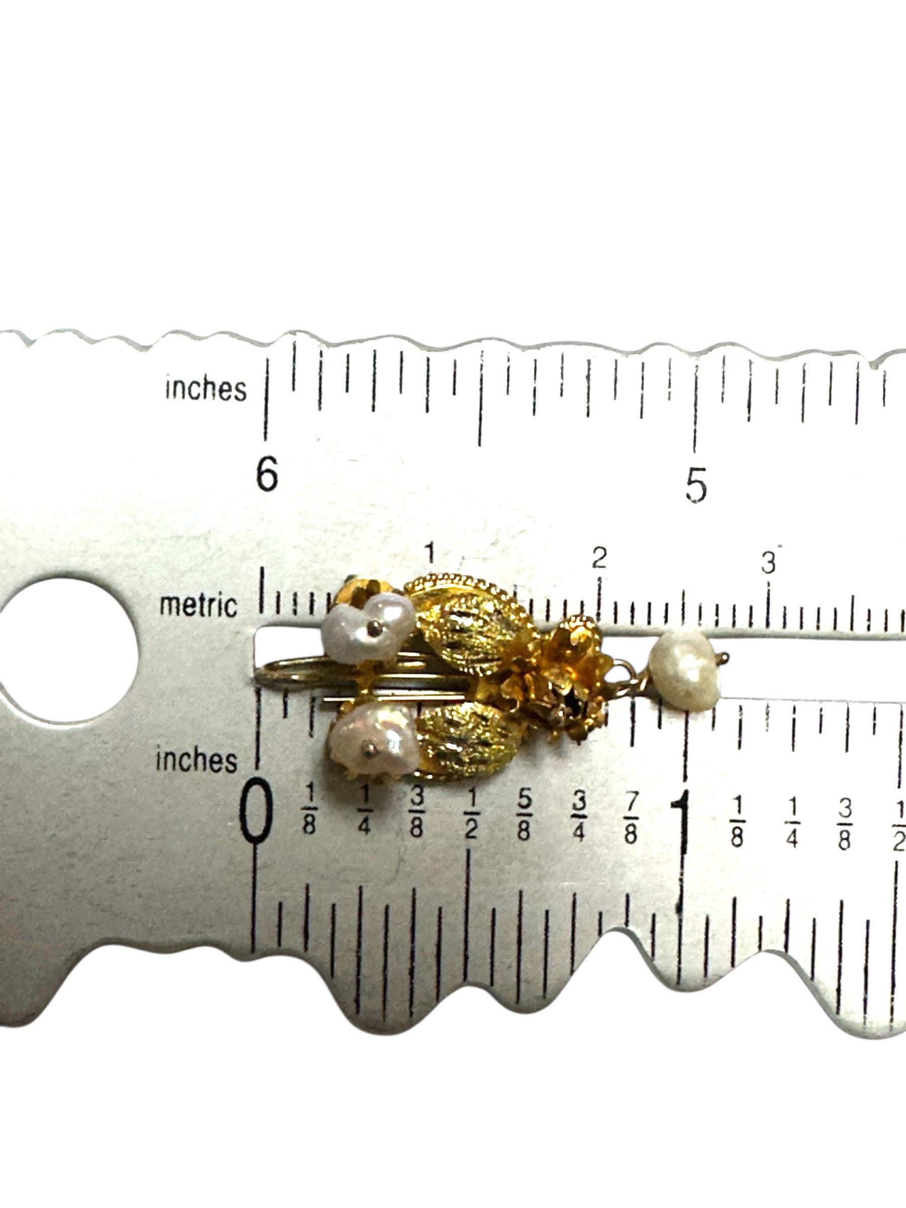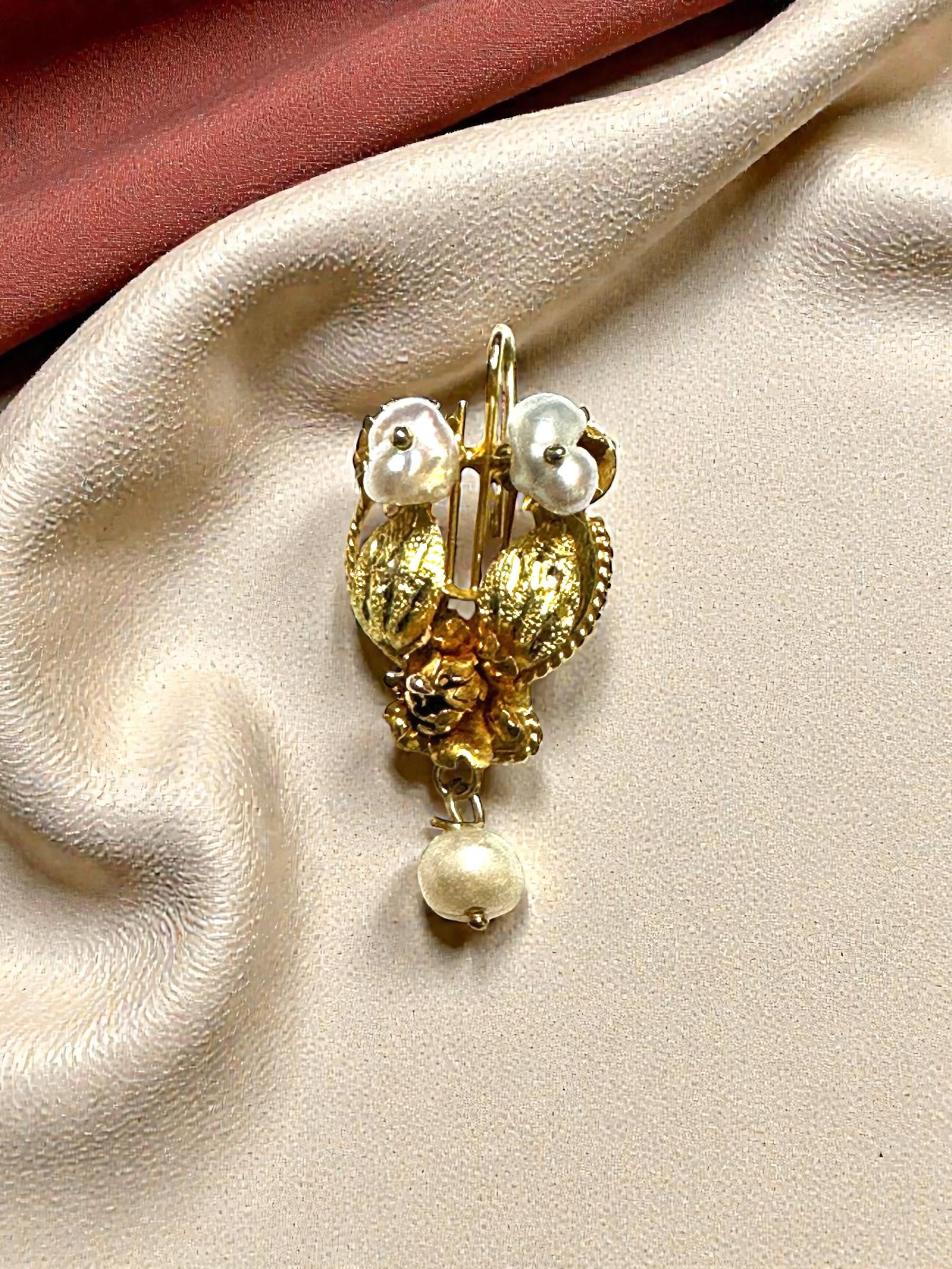 Introducing this antique 10 karat gold pendant with nature design. The rose bud at the bottom of the pendant is in rose gold, while the rest of the pendant is yellow gold. The pendant is accented by three baroque pearls. Very late Victorian early Edwardian!