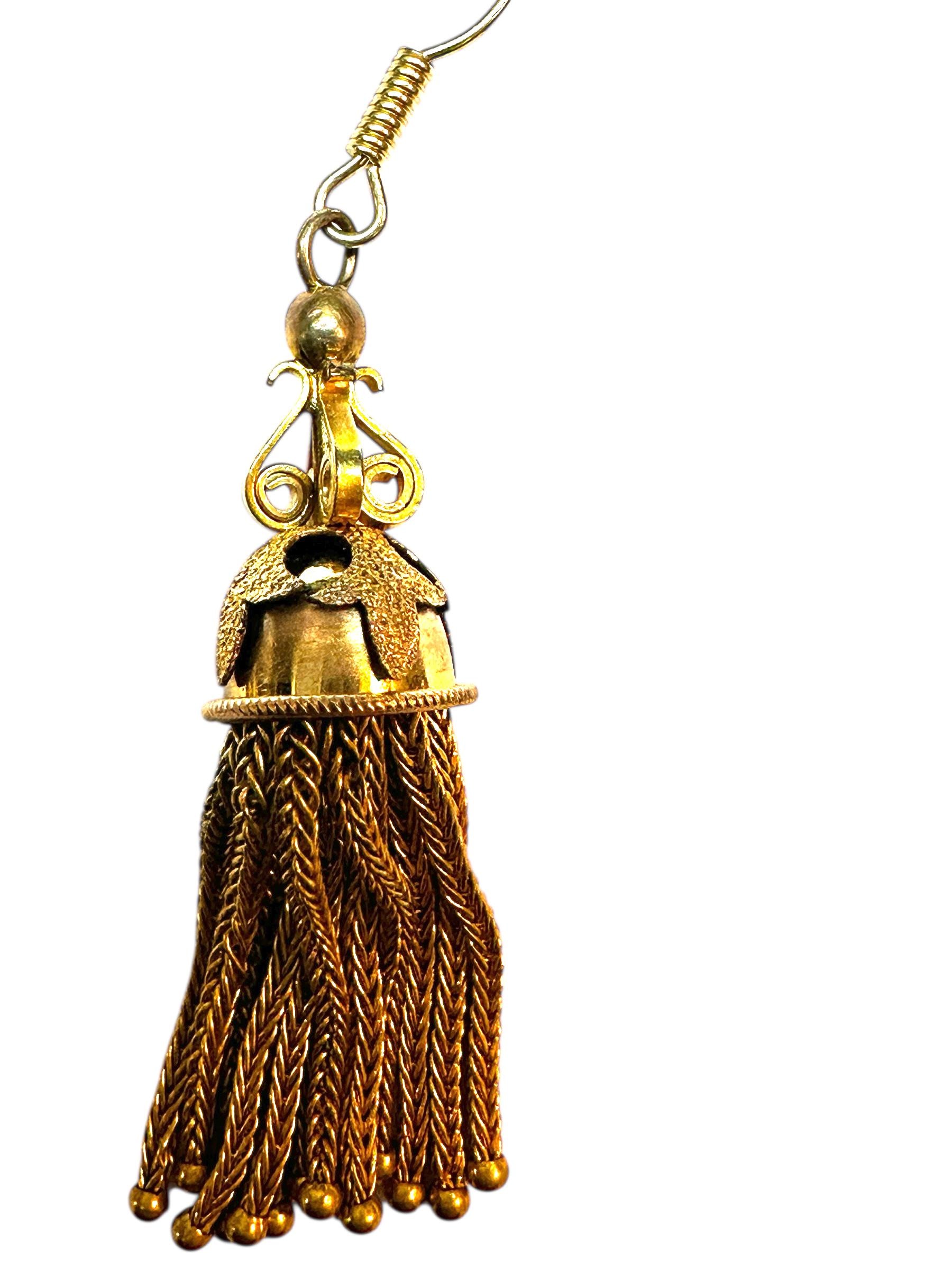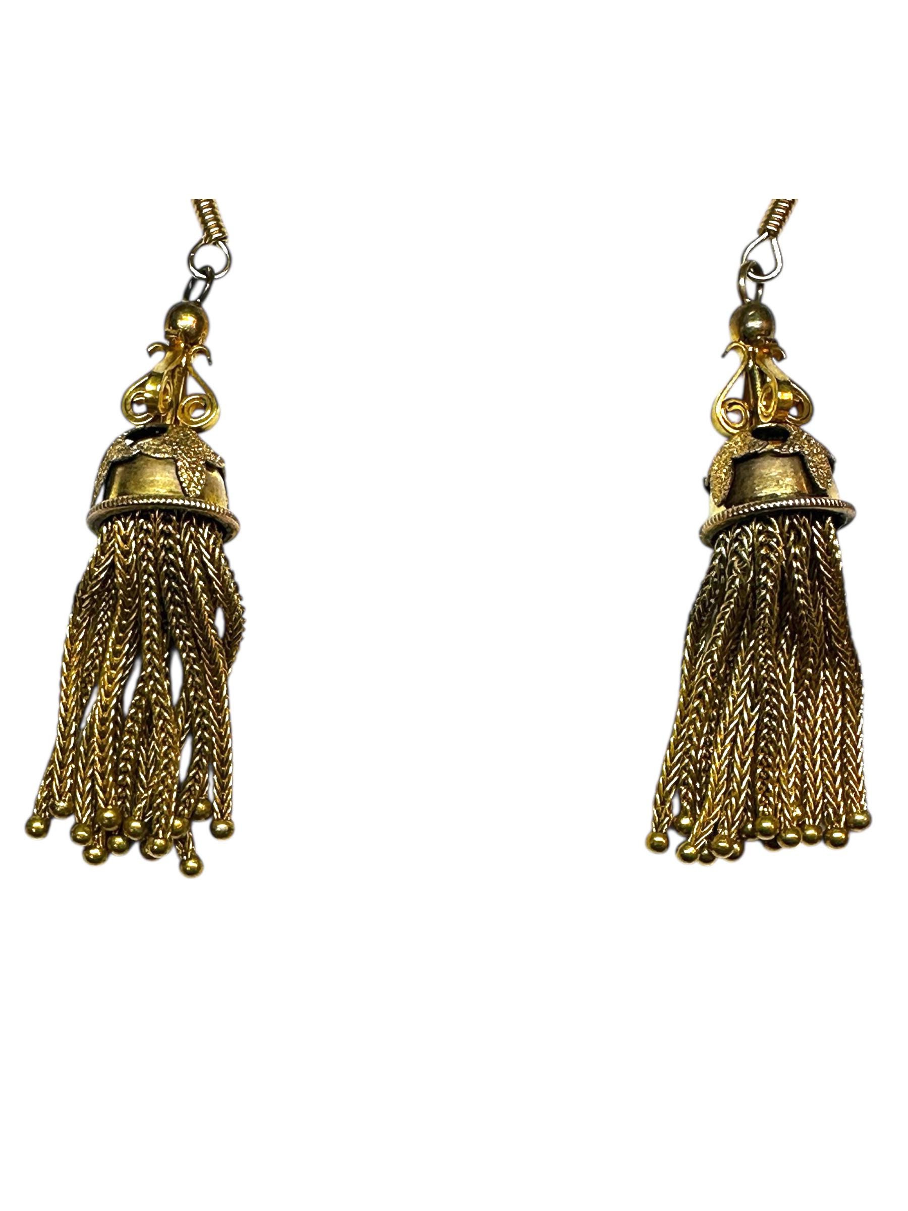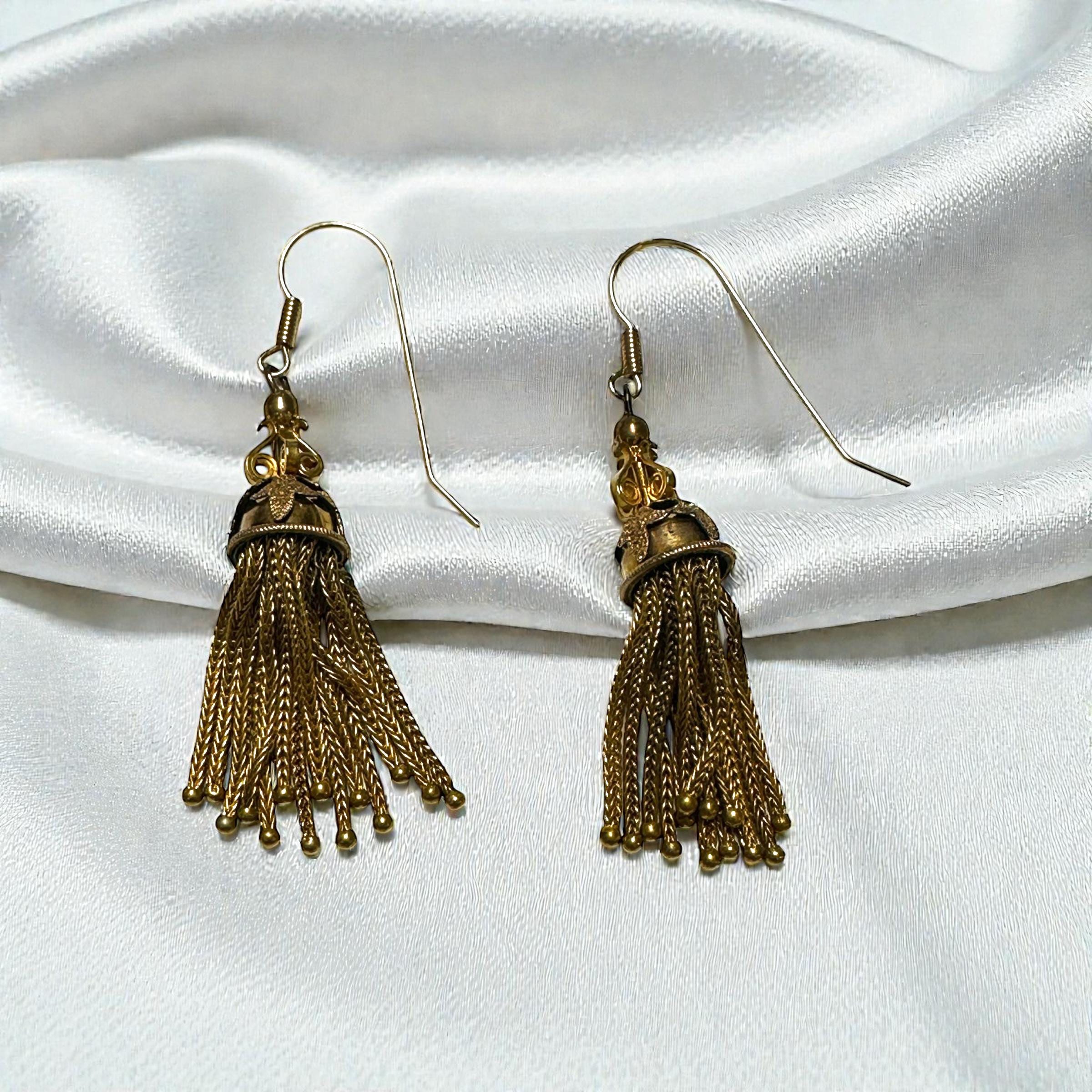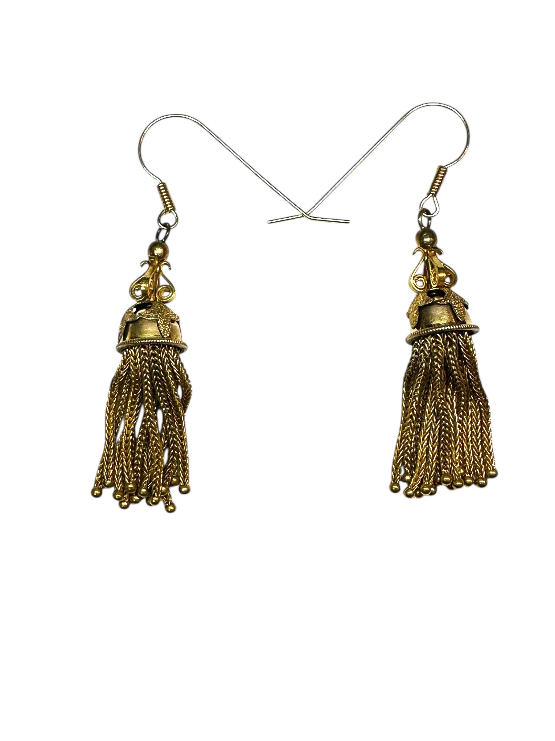 These desirable tassle earrings from the Late Victorian Early Edwardian period are absolutely attention grabbing. Dangling from each earring "cap" are what appears to be fox tail chains with little gold filled balls at the bottom of each chain. The ear wires are nice and long, reducing the risk of the falling off.
