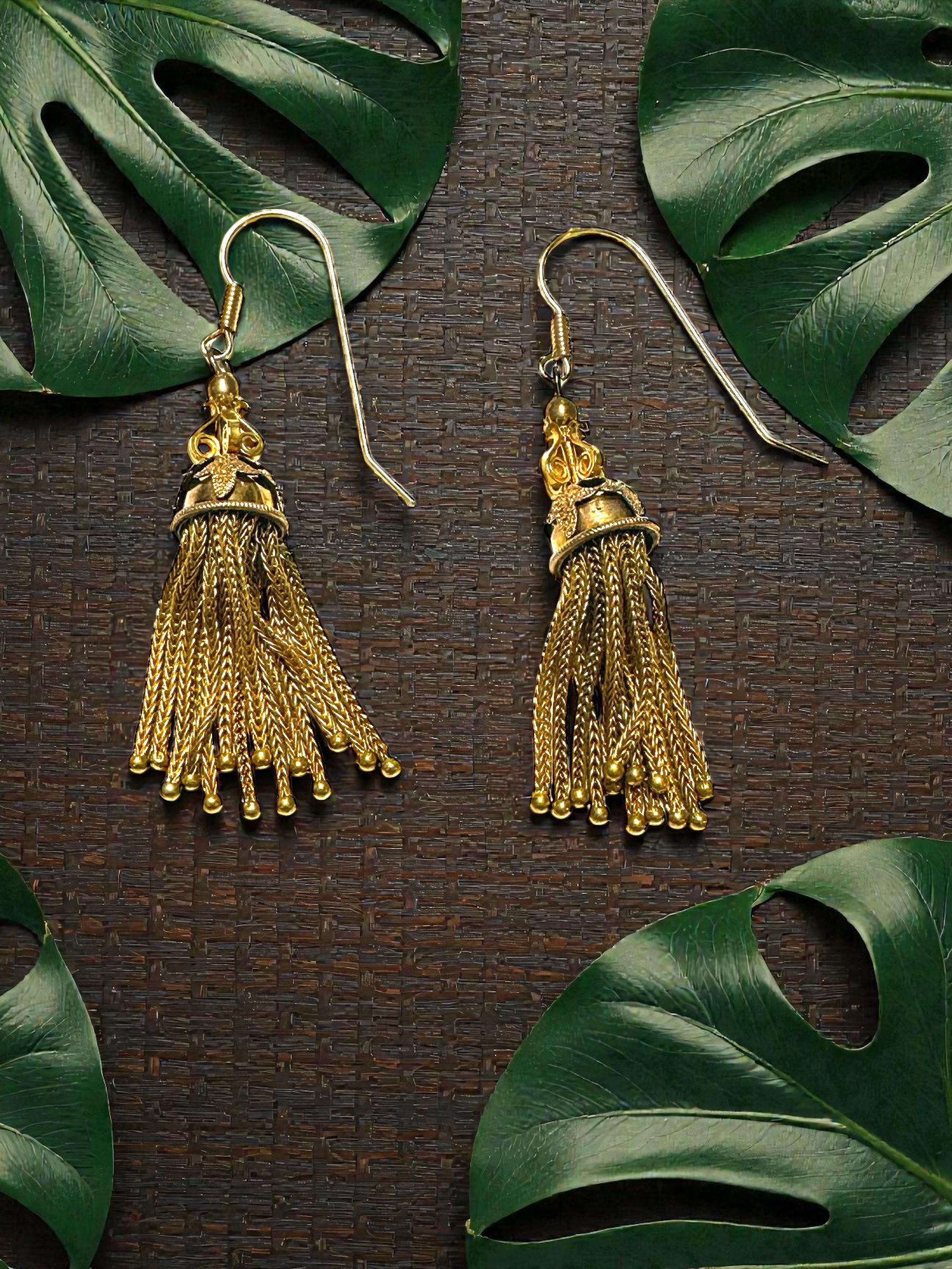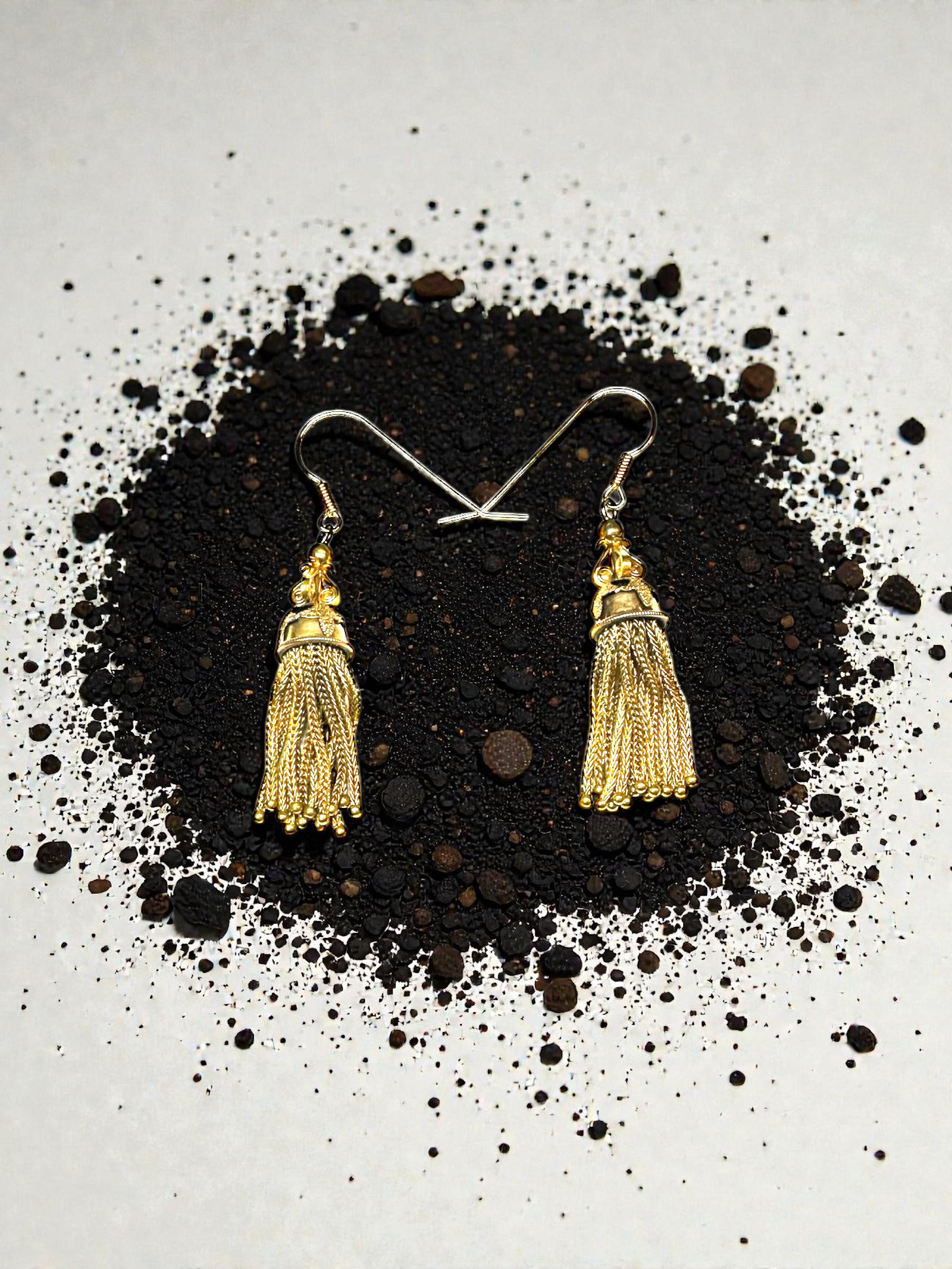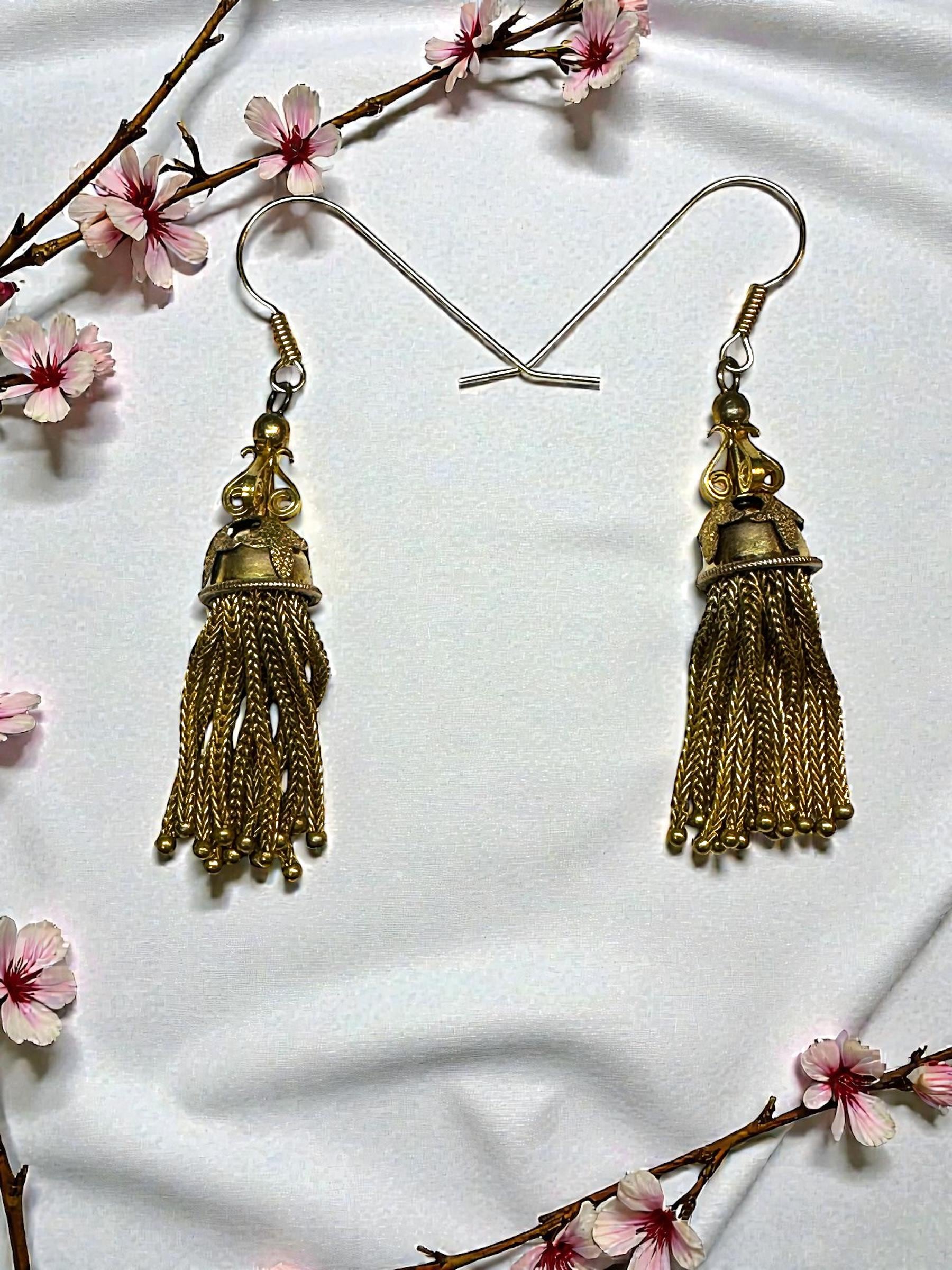 Metal: Gold filled BUT the ear wires are stamped 14 karat. PLEASE NOTE: One earring has 13 tassle strands and the other has 14 tassle strands. However it is only noticeable when you take the earrings off and actually count the strands.