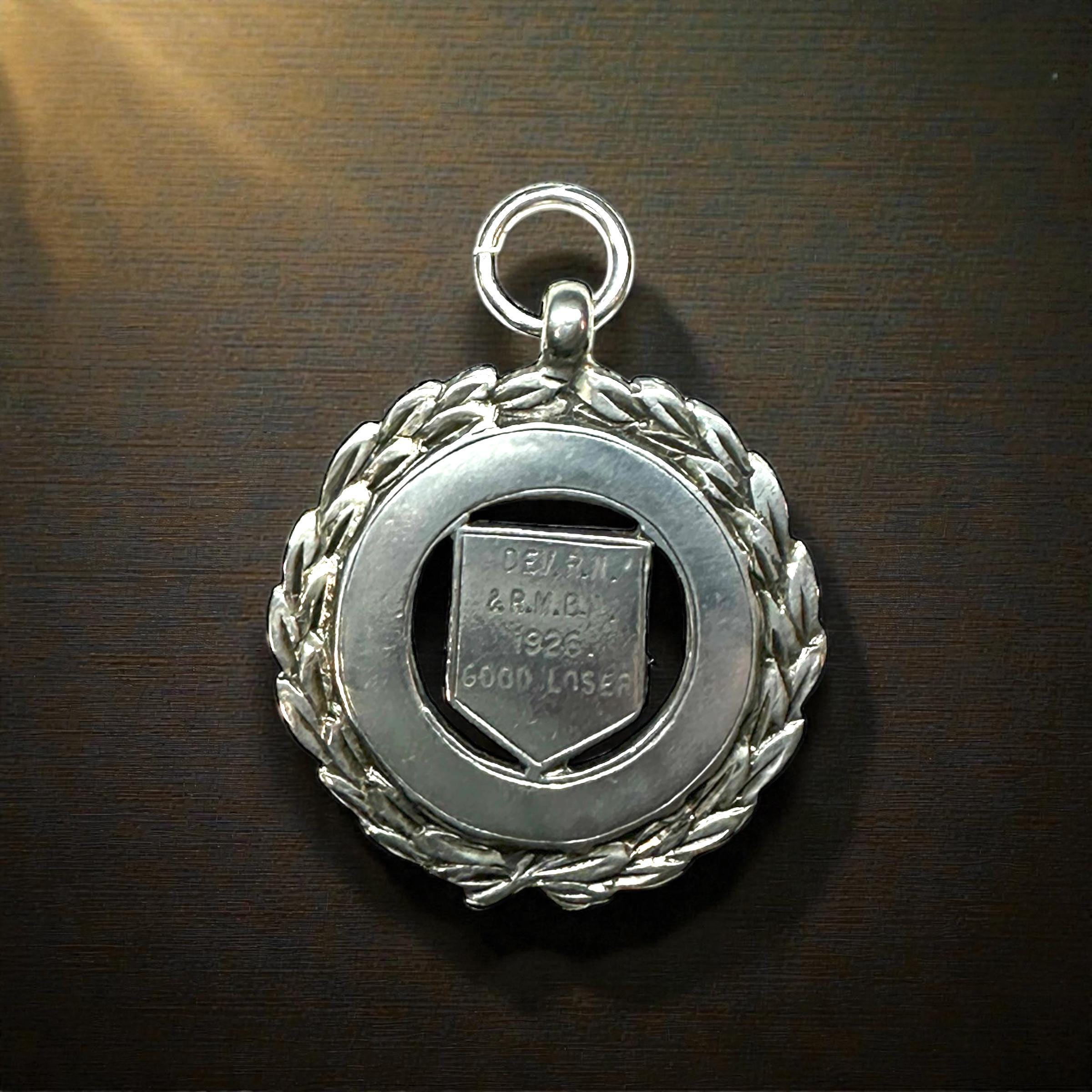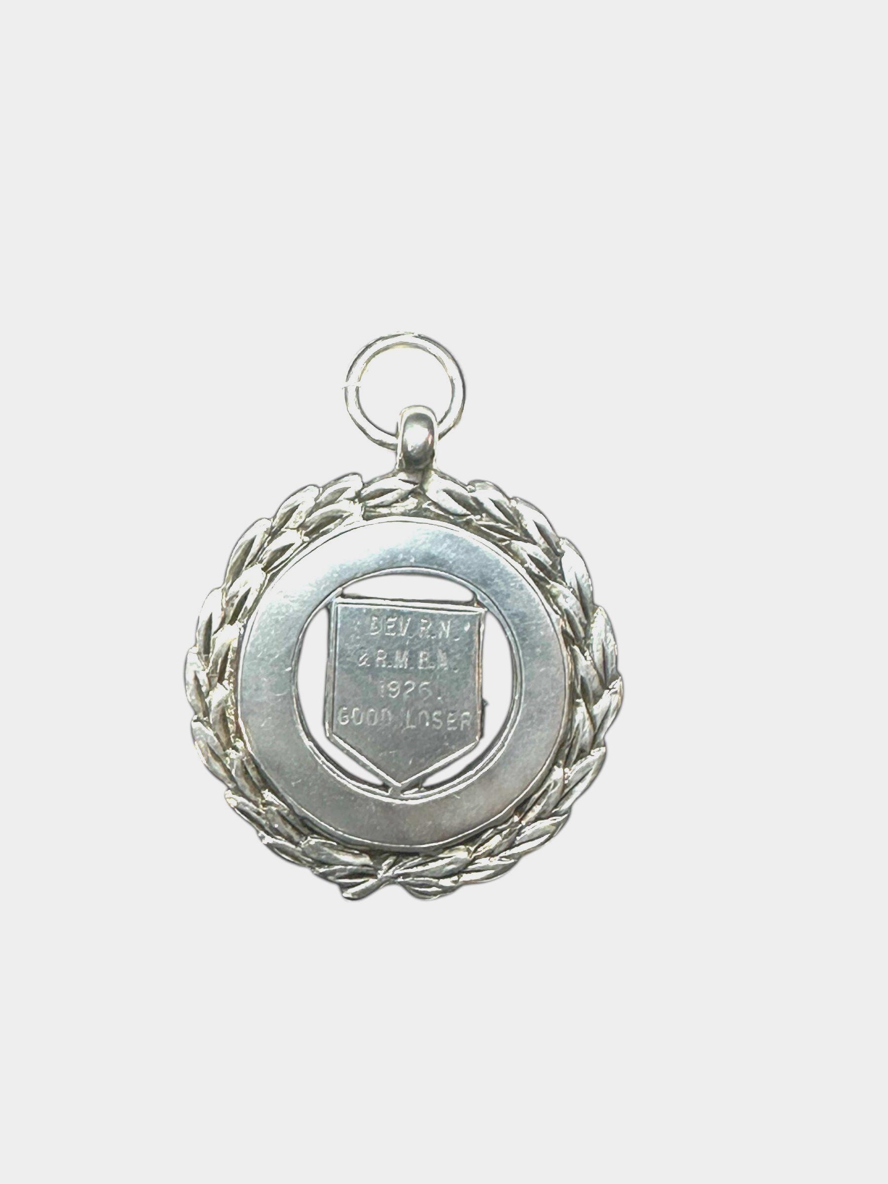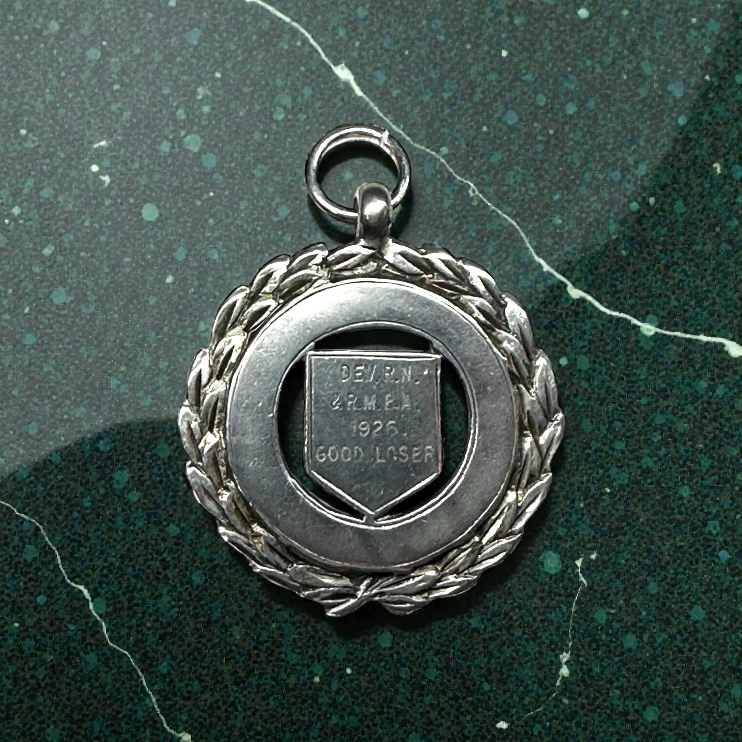 Metal: Sterling Silver. On the back of the medal is P.K.D. with the anchor, lion and the letter B. Engraved on the front: "DEV. RN. & R.M.B.A. 1926 GOOD LOSER"