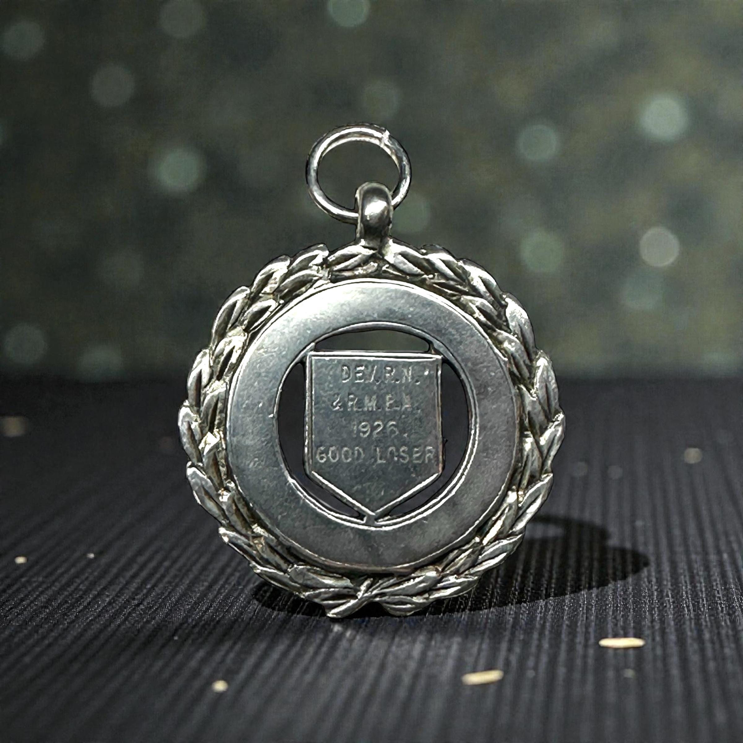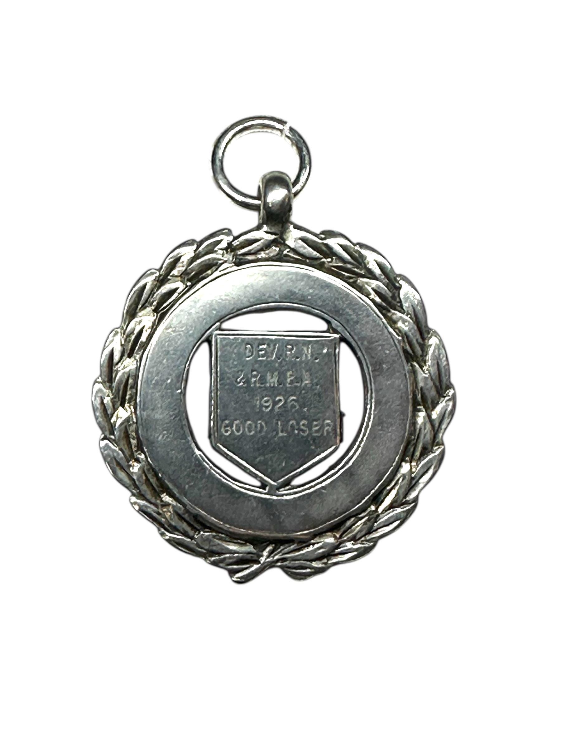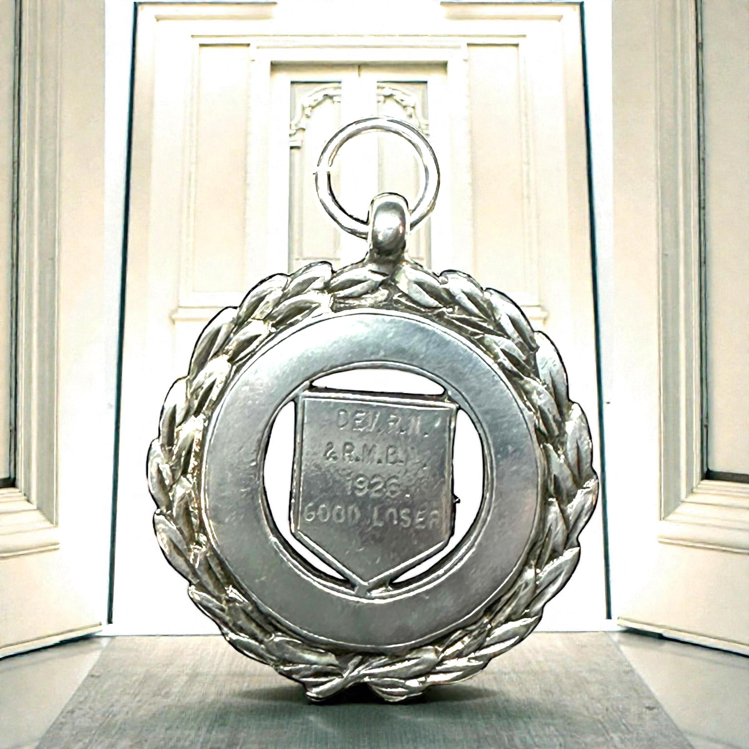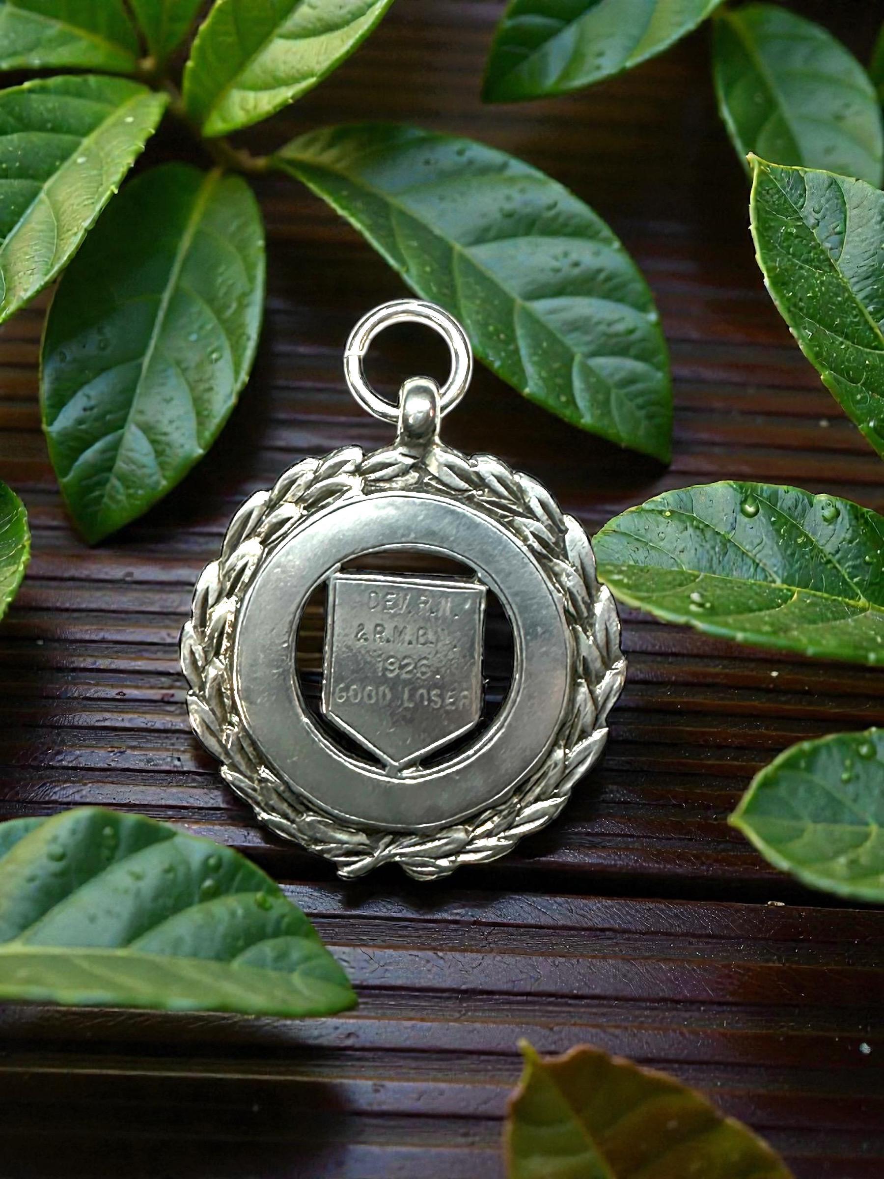 Metal: Sterling Silver. On the back of the medal is P.K.D. with the anchor, lion and the letter B. Engraved on the front: "DEV. RN. & R.M.B.A. 1926 GOOD LOSER"