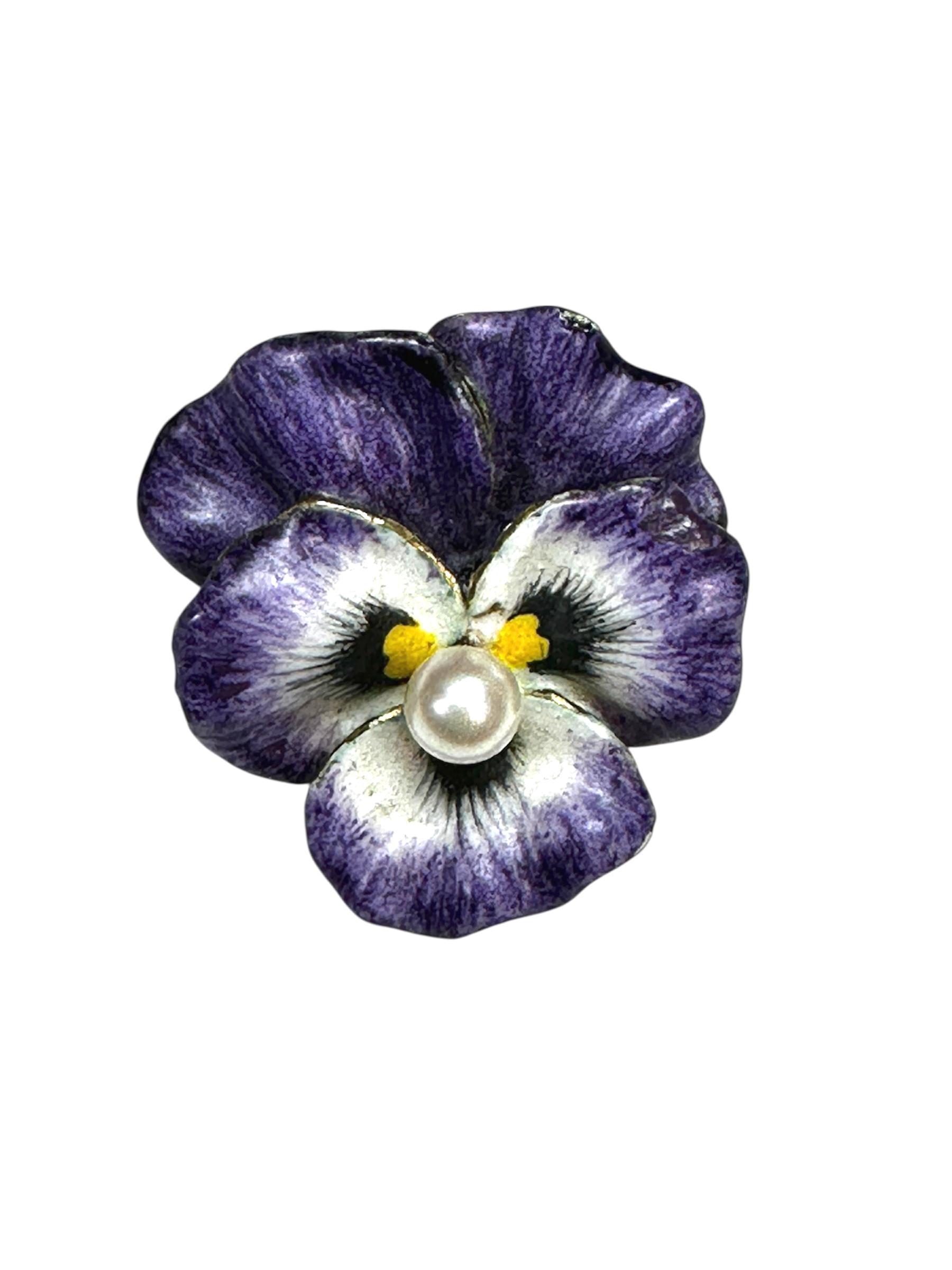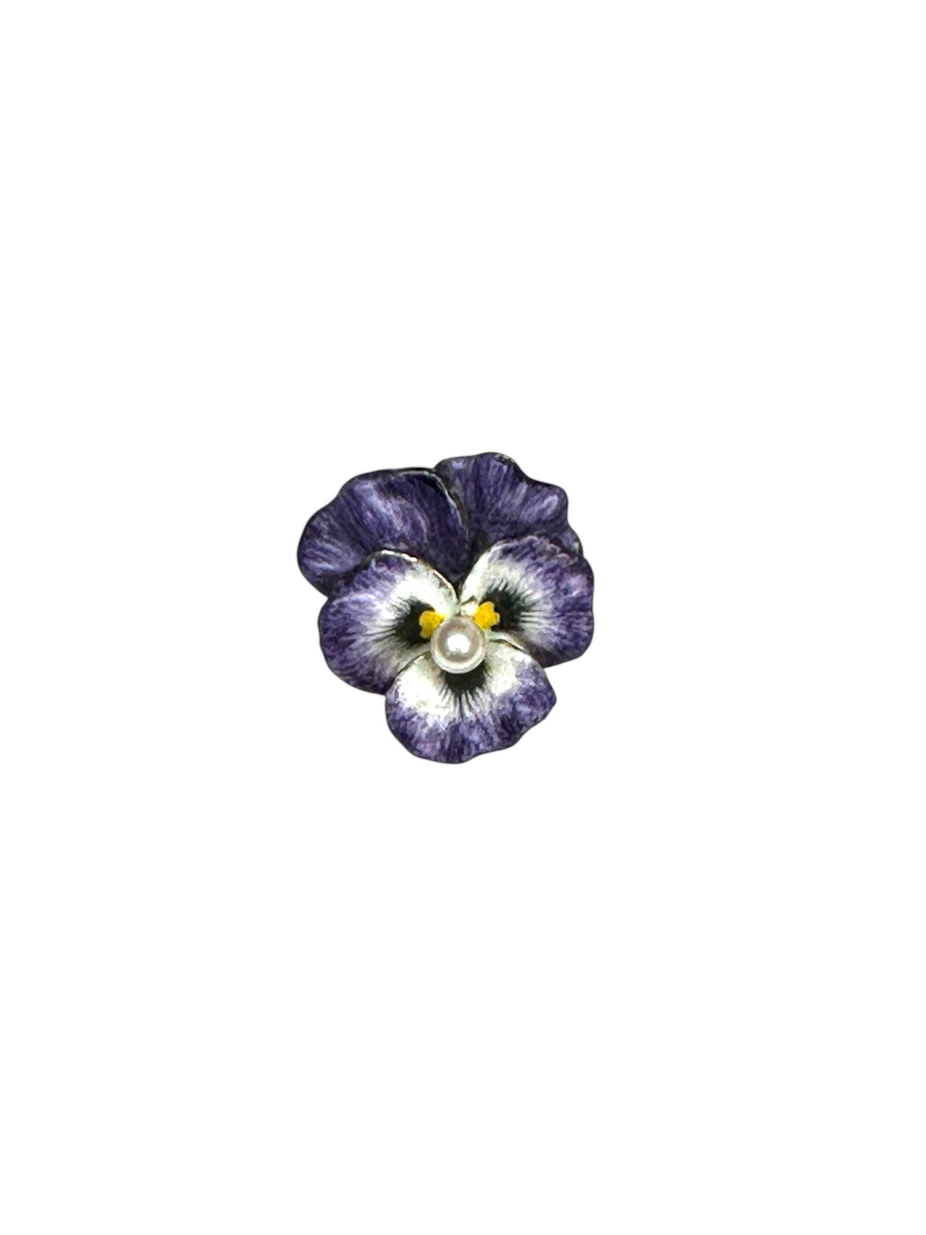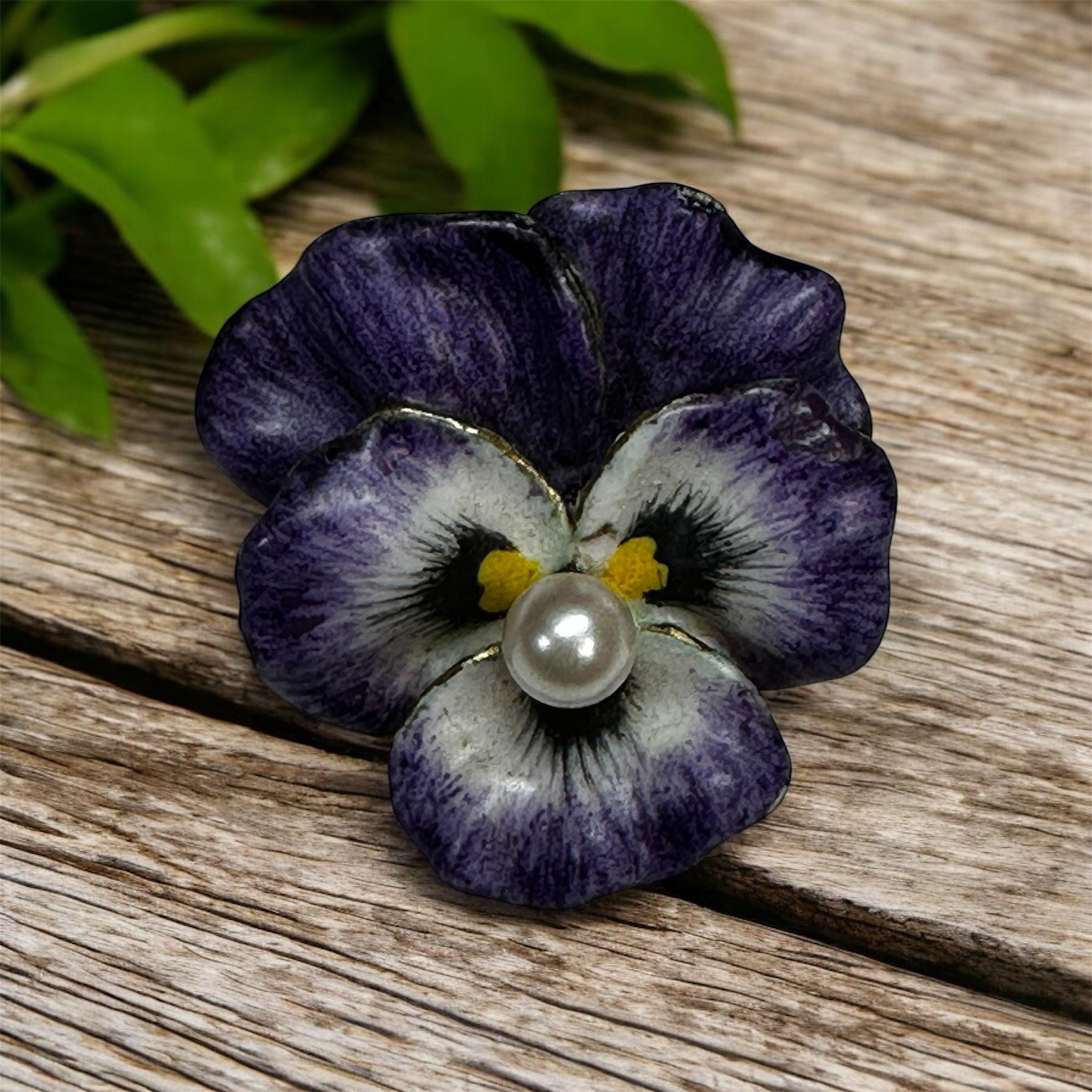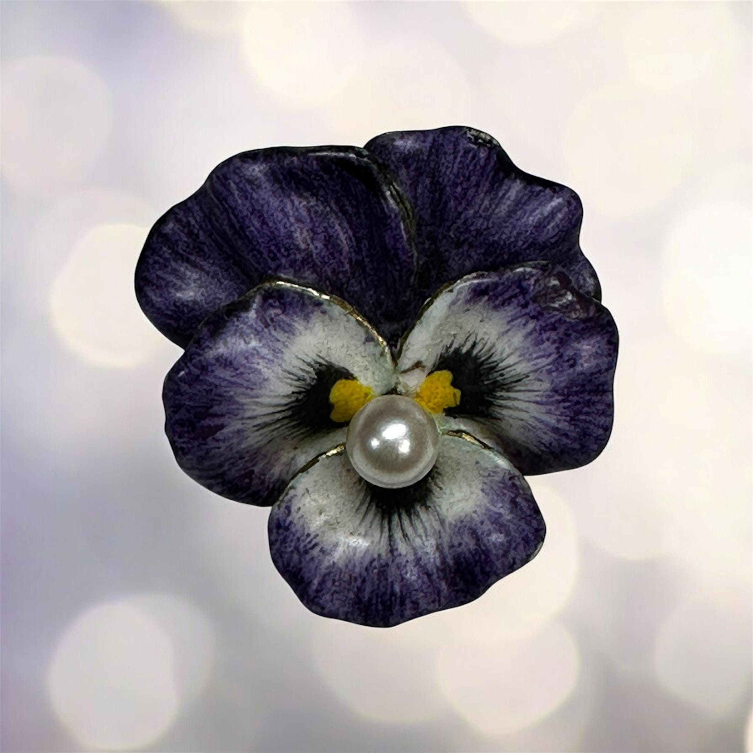 Victorian 14 karat yellow gold purple, black, white and yellow enamel pansy or flower brooch. The center of the brooch is highlighted by a pearl. Whenever you wear this pin you will bring spring with your wherever you go! Perfect for flower lovers! Authentic Antique Brooch. Not a reproduction.