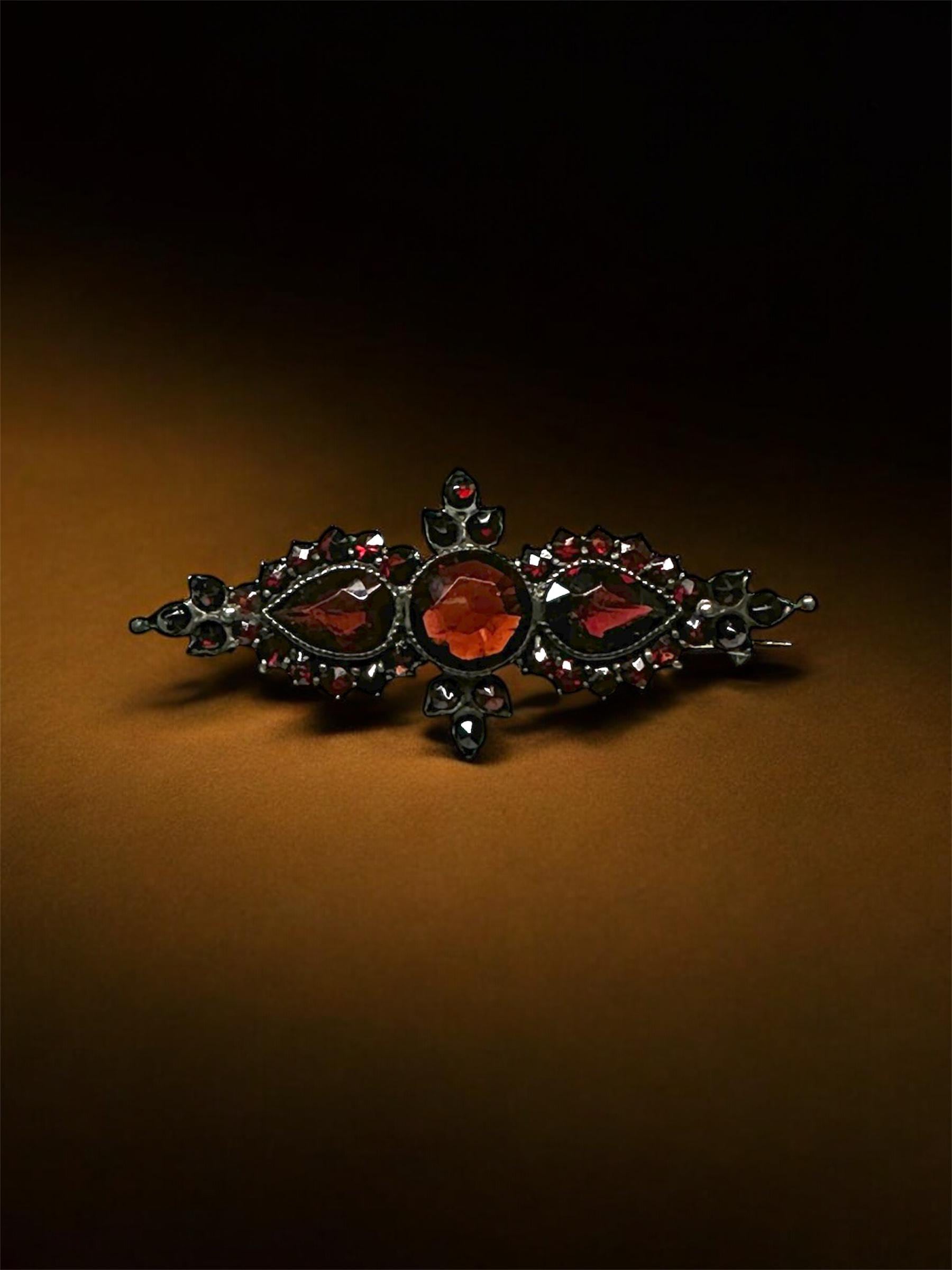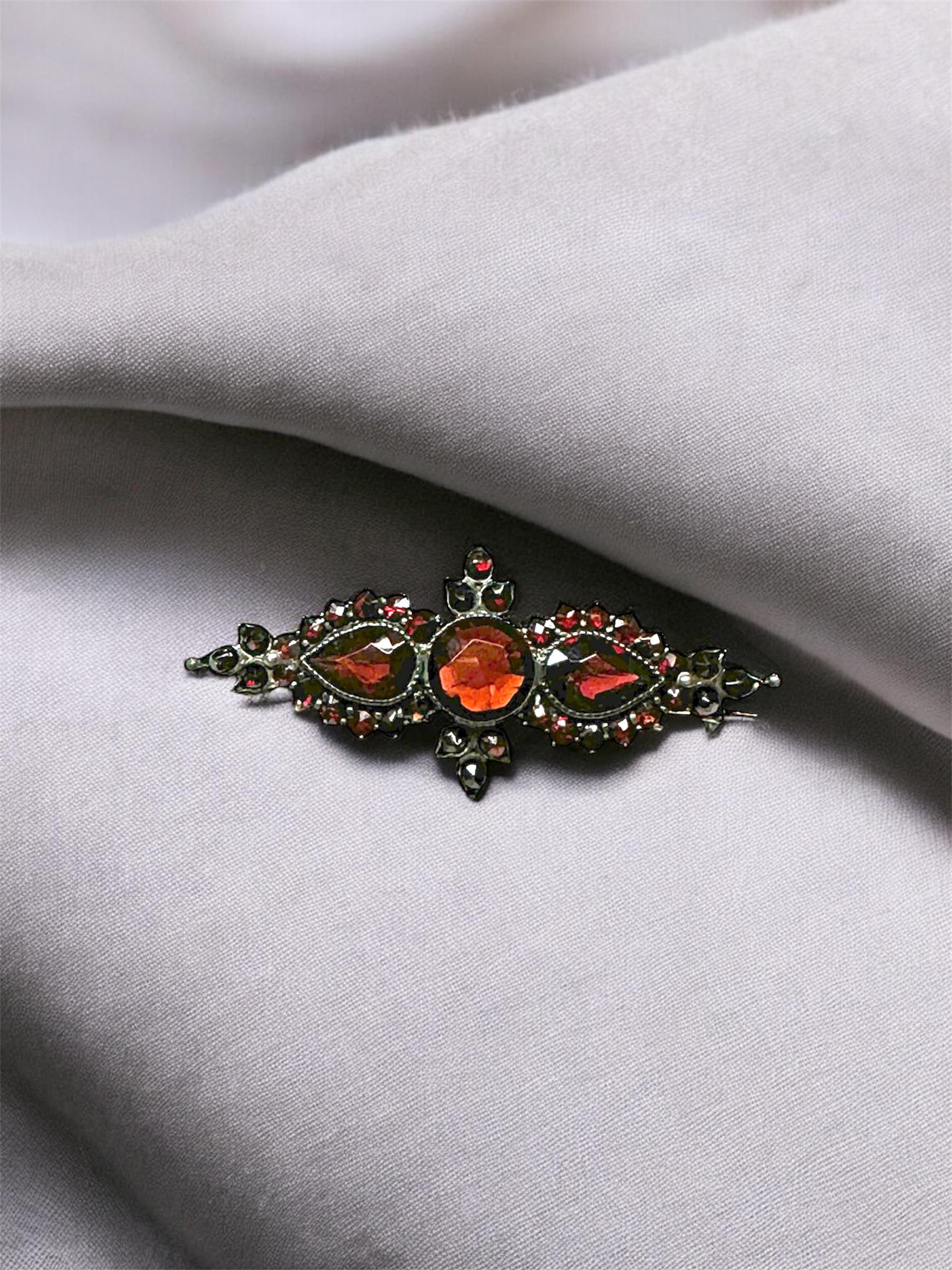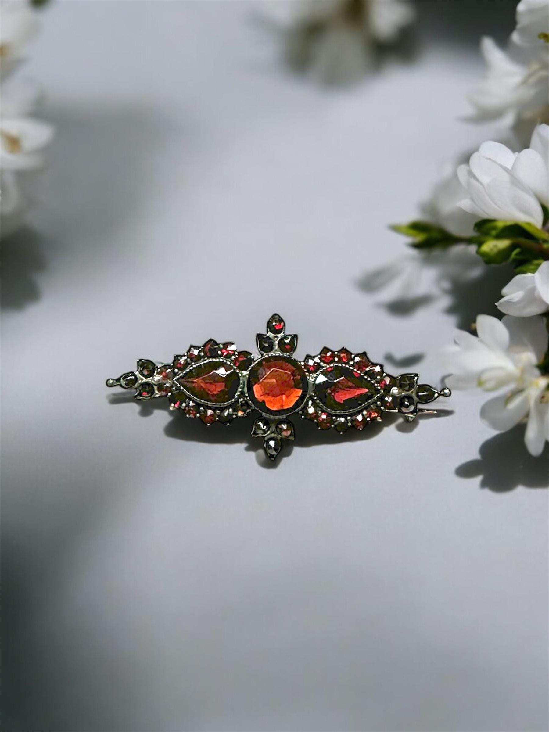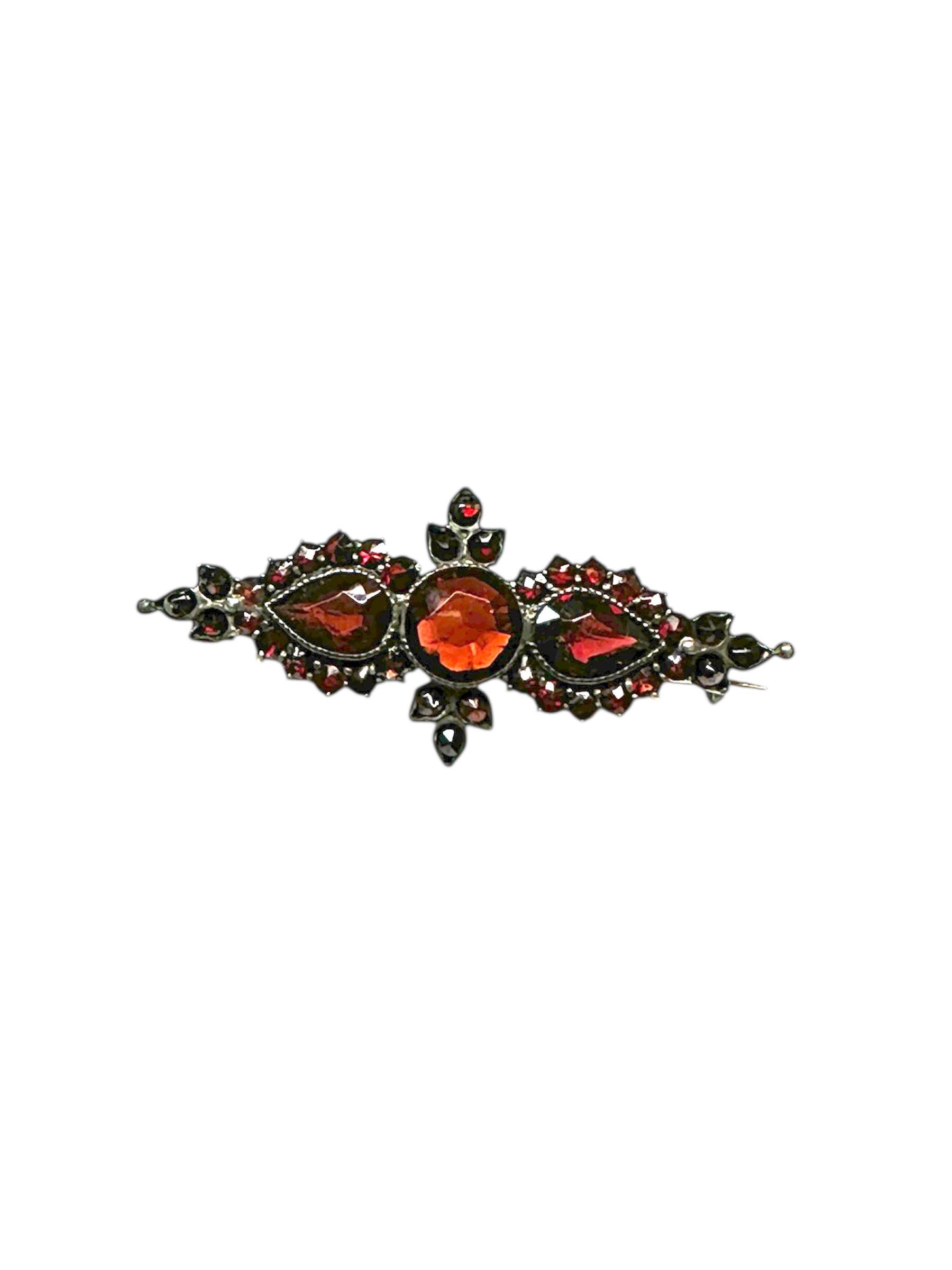 An authentic antique Bohemian cut garnet bar pin brooch. January's birthstone looks so vibrant in this bar pin brooch, it will look great on a lapel of a jacket or scarf! Authentic Antique Pin. Not a reproduction.
