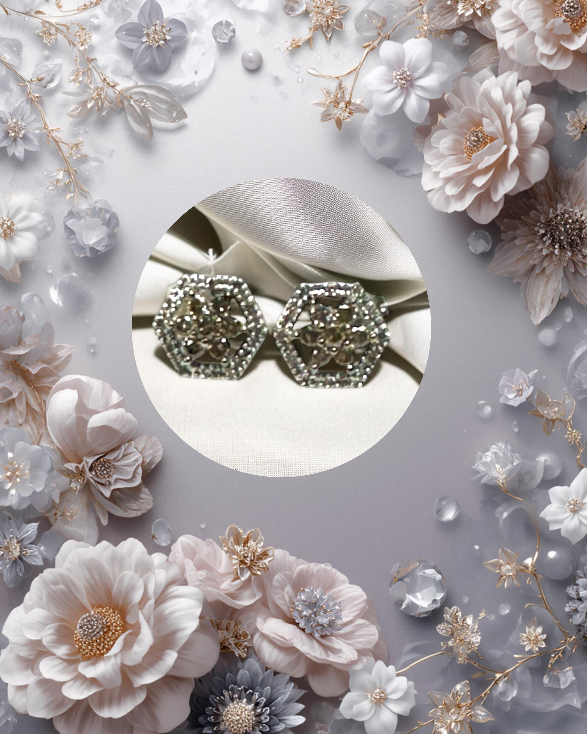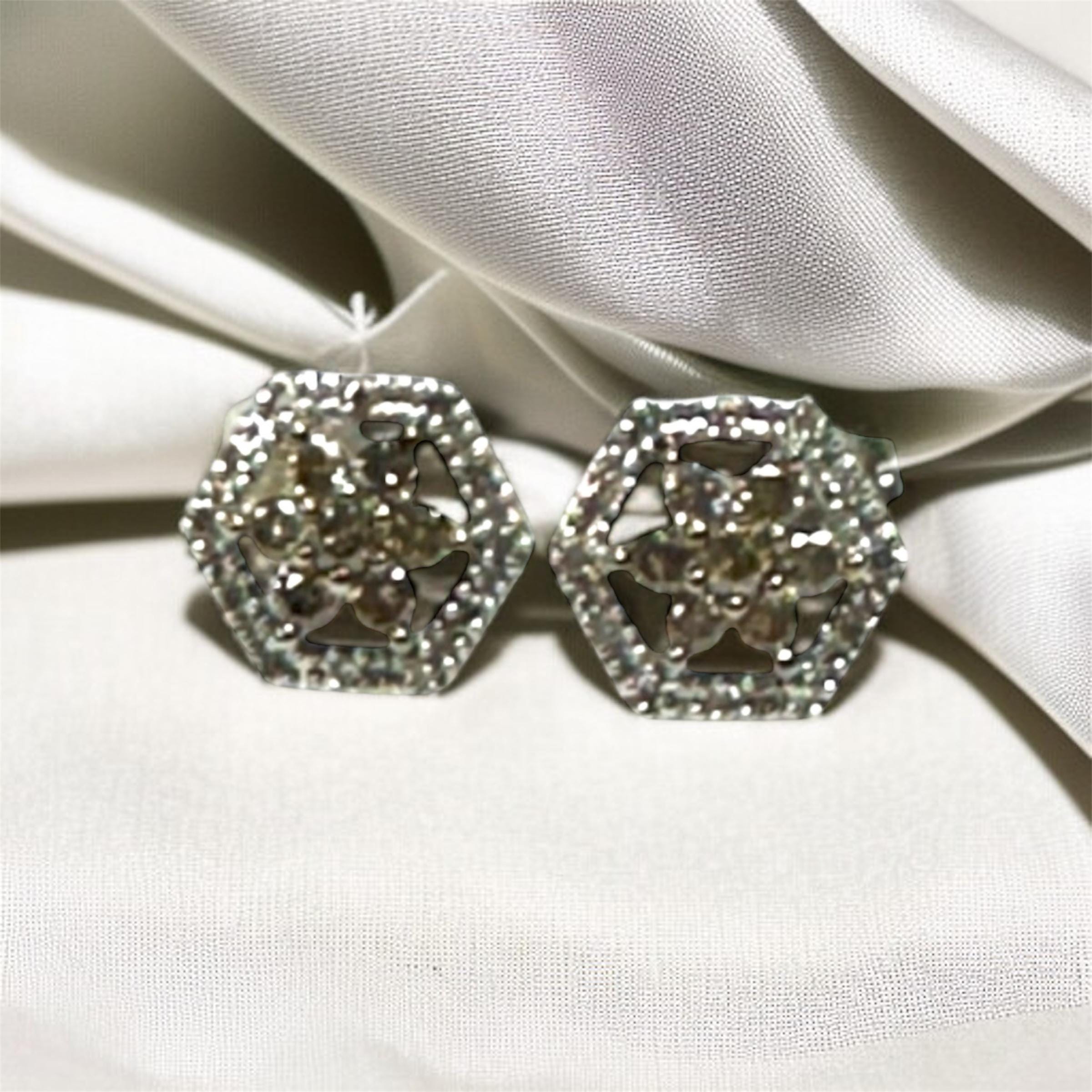 Pair of 14 Karat White Gold Diamond Hexagon Shaped Pierced Earrings. In the center are diamonds to look like a flower. The frame of the hexagon is set with single cut diamonds.