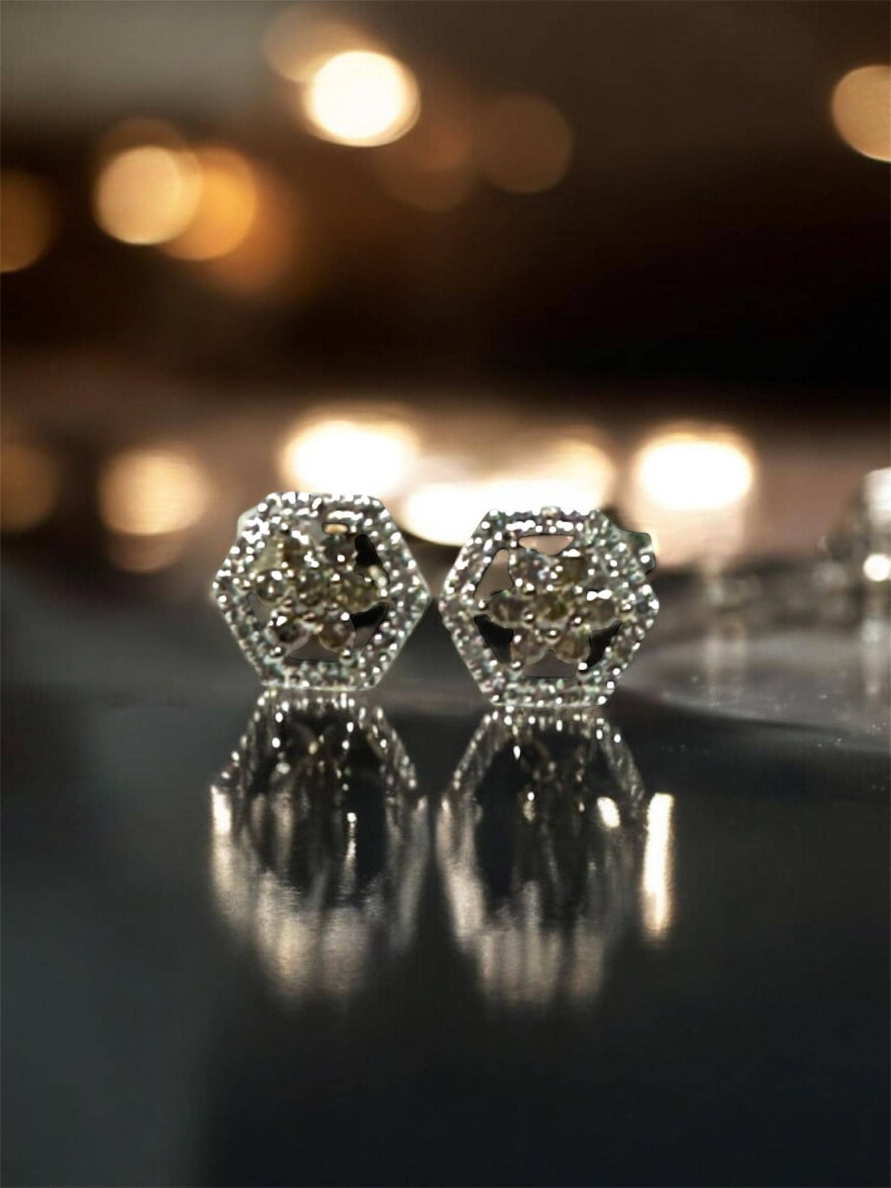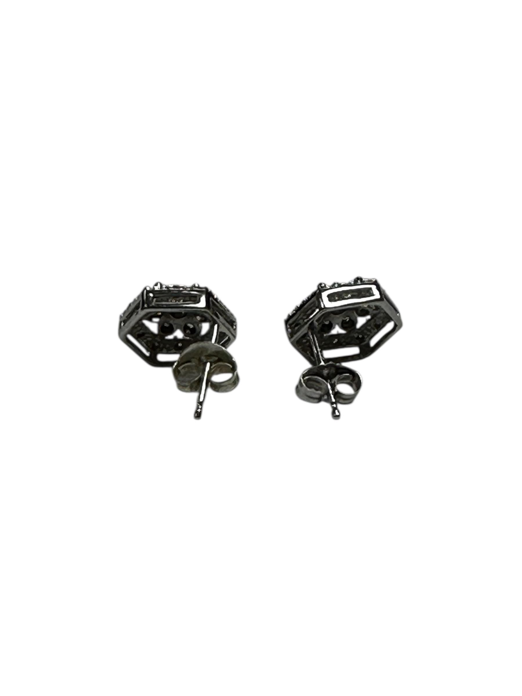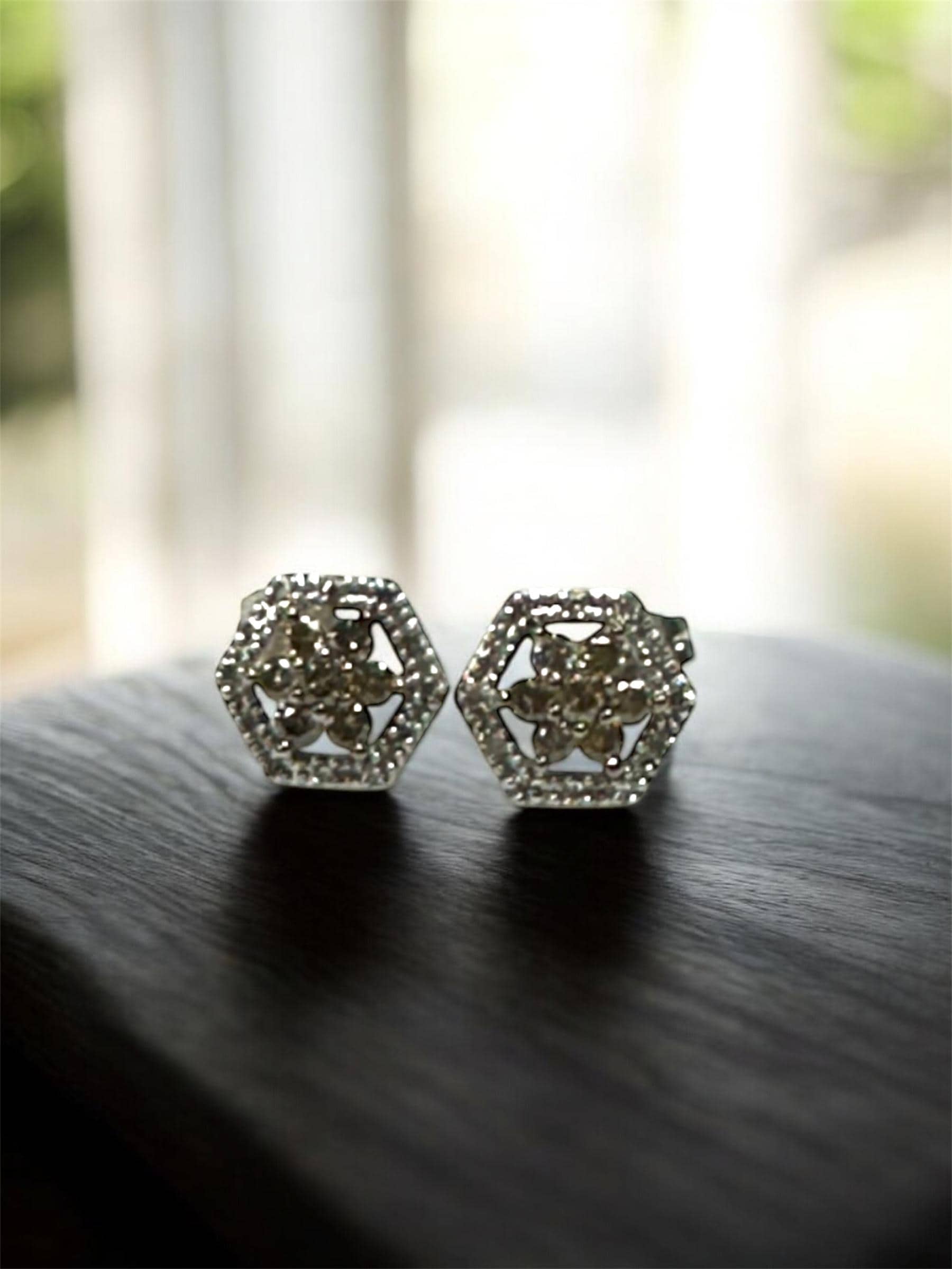 Gemstones: Set in the center of EACH earring are 7 full cut diamonds for an estimated total weight of 0.27 carats. Set in the frame of the hexagon shape in EACH earring are 12 single cut diamonds having an estimated total weight of 0.18 carats. *** PLEASE NOTE*** The 7 diamonds in the center of each earring have an AVERAGE clarity of SI2-I1 AND the color is a light toasty grayish brown.. The quality of the single cut diamonds are good to fair.