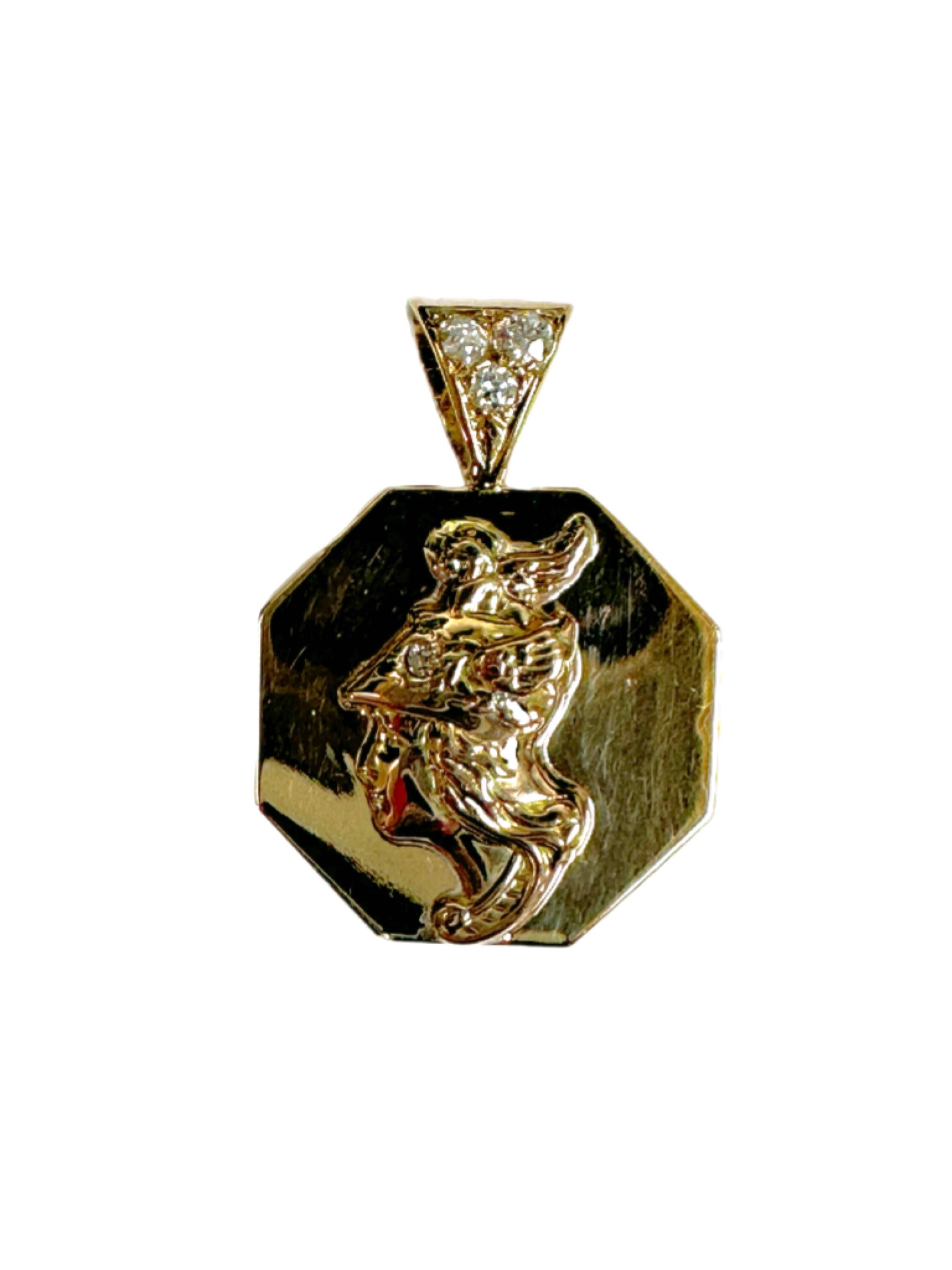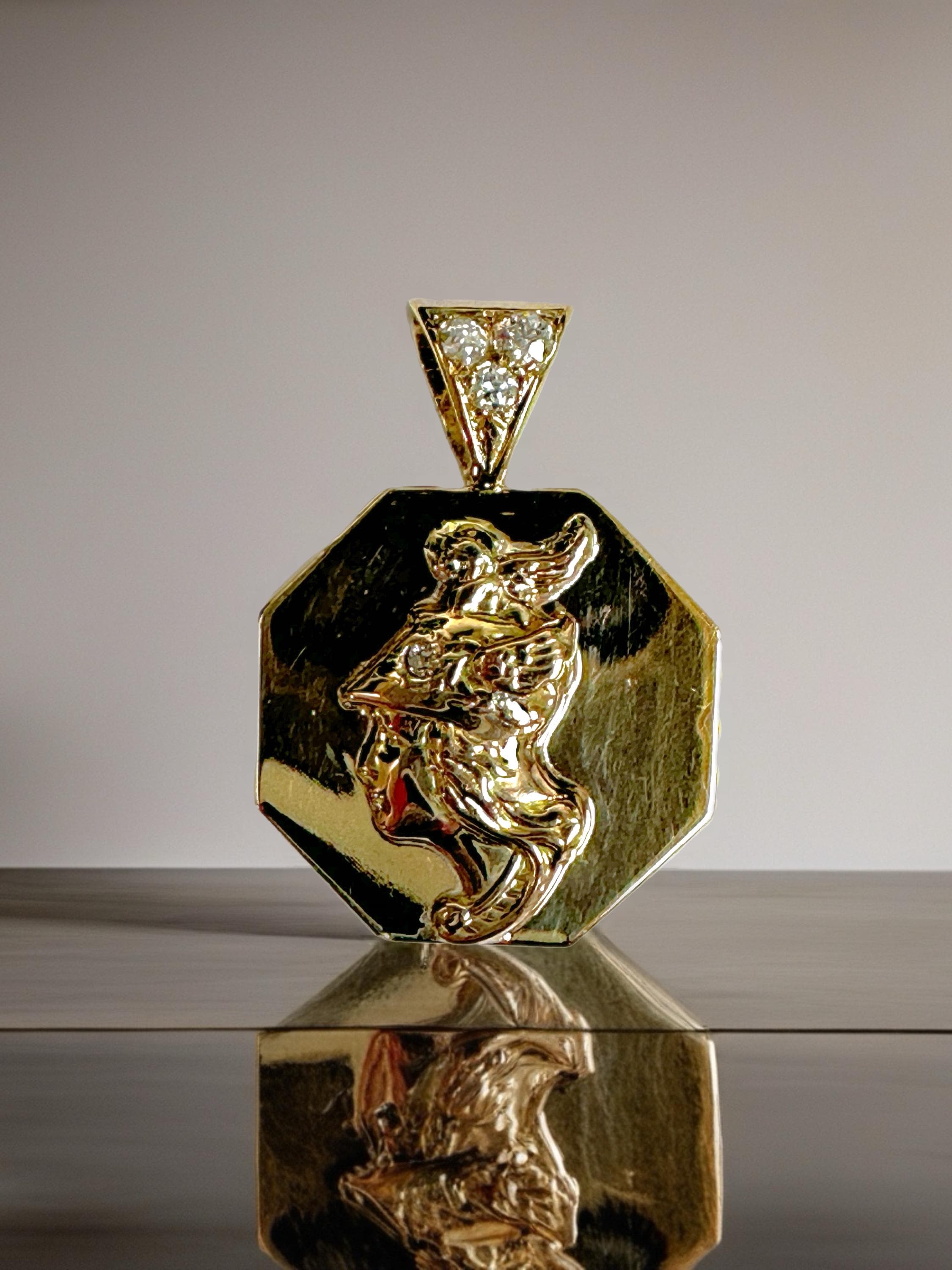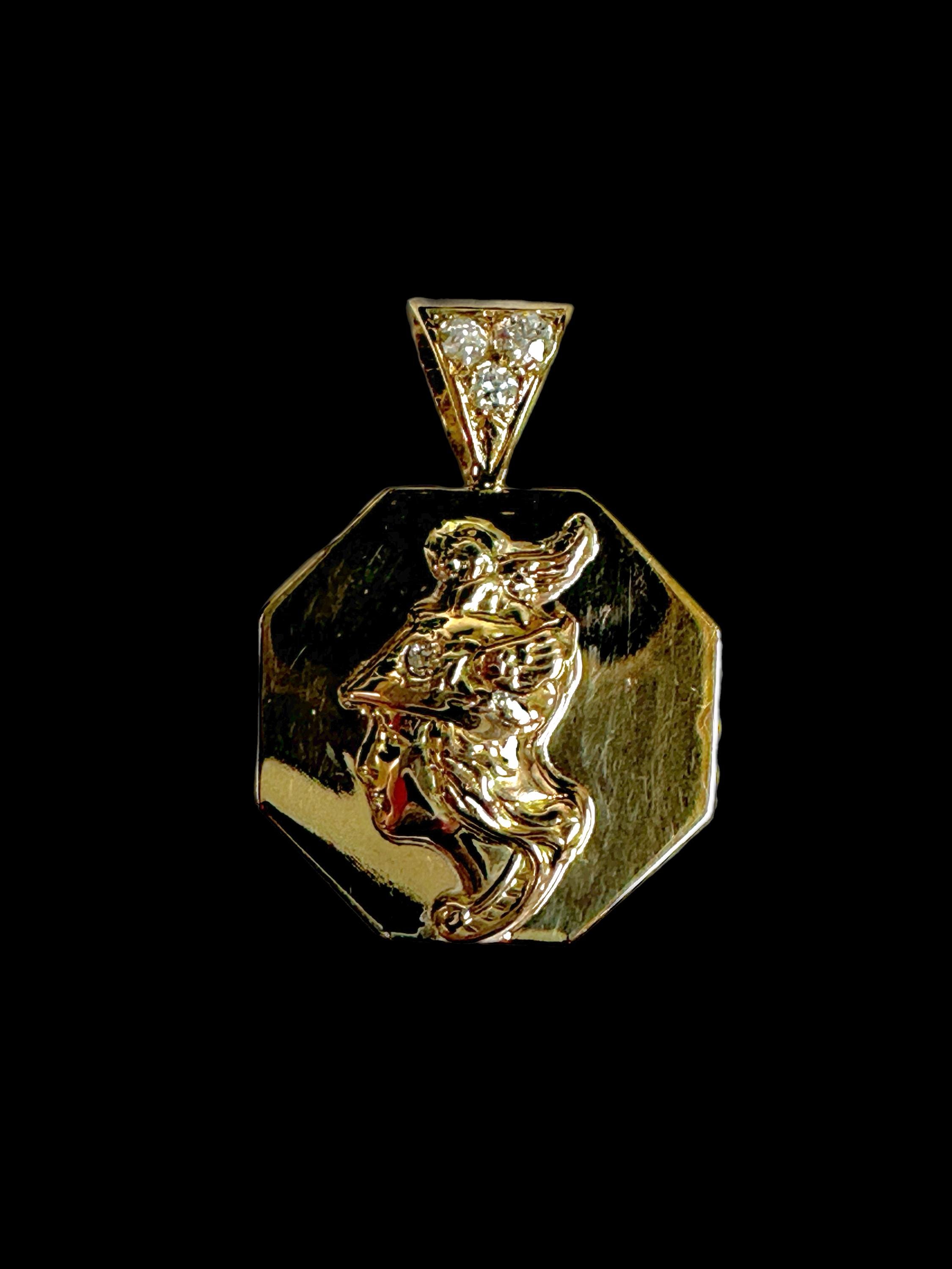 Vintage 14 karat yellow gold pendant features a detailed bust of Mercury, the Roman God of commerce, travel and communication. Designed in an octagonal (8 sided) shape, the disc adds interest by highlighting the classical profile in the center of the disc. The pendant is accented by a bail set with Old European cut diamonds.