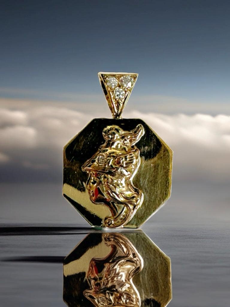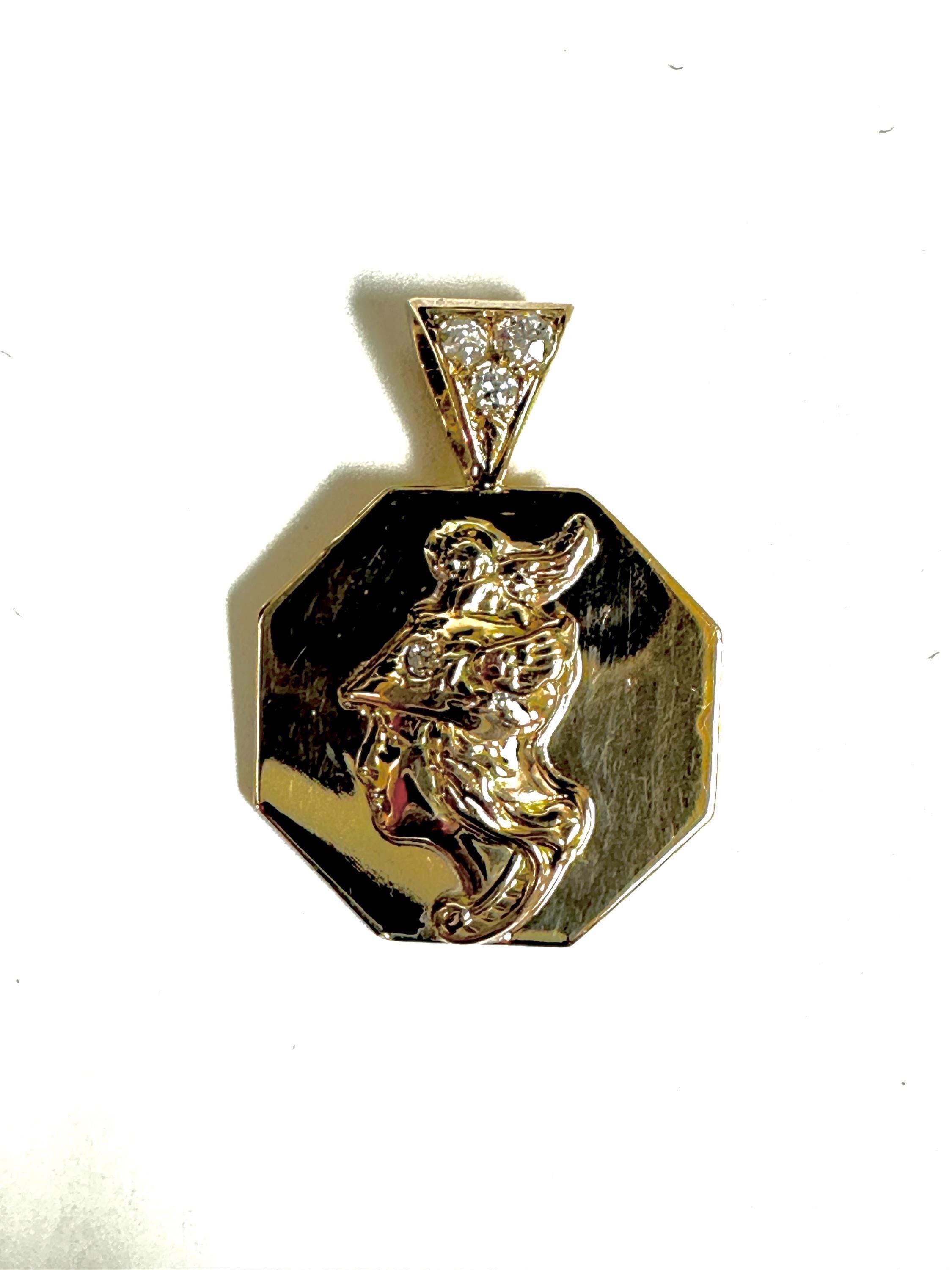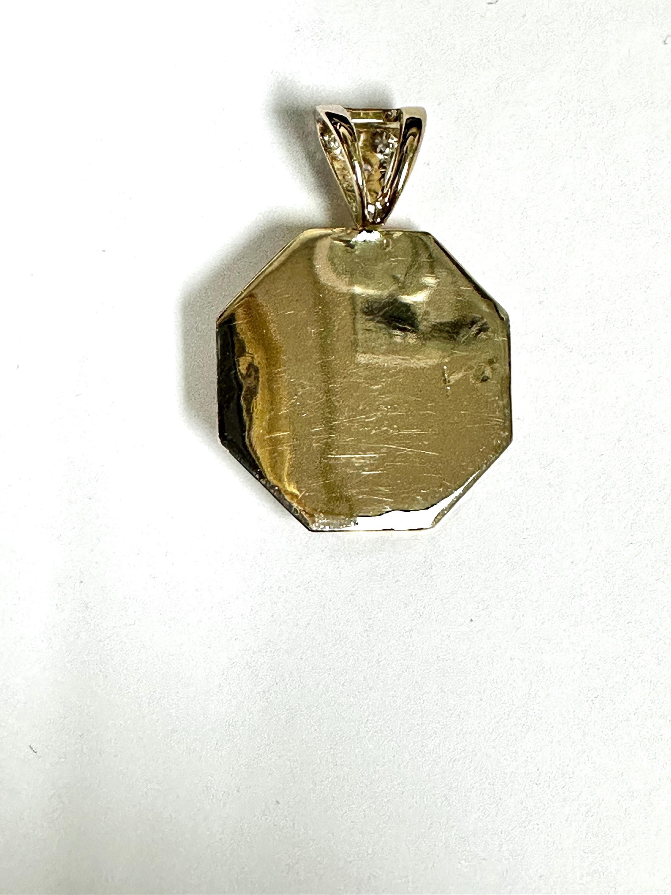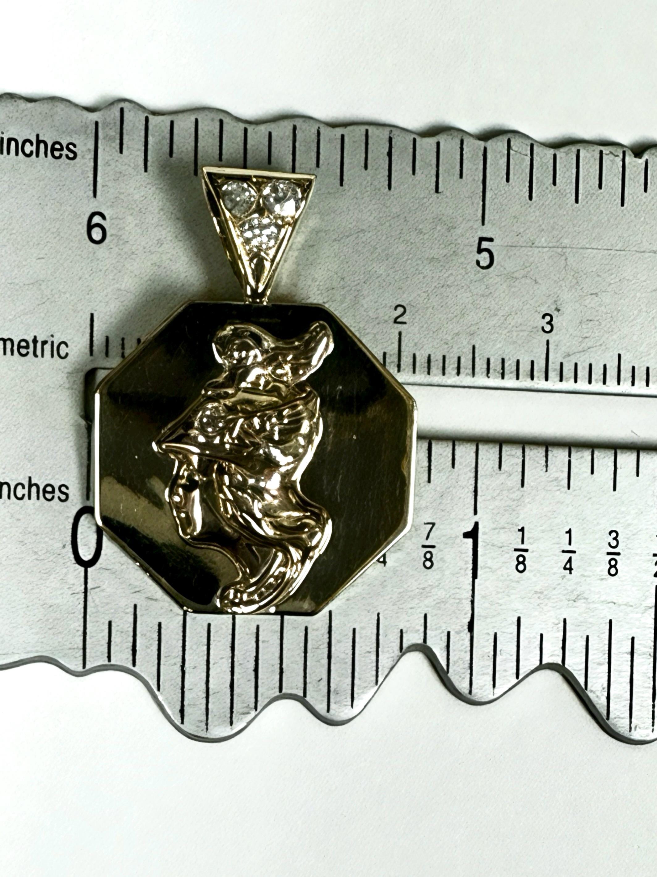 Vintage 14 karat yellow gold pendant features a detailed bust of Mercury, the Roman God of commerce, travel and communication. Designed in an octagonal (8 sided) shape, the disc adds interest by highlighting the classical profile in the center of the disc. The pendant is accented by a bail set with Old European cut diamonds.