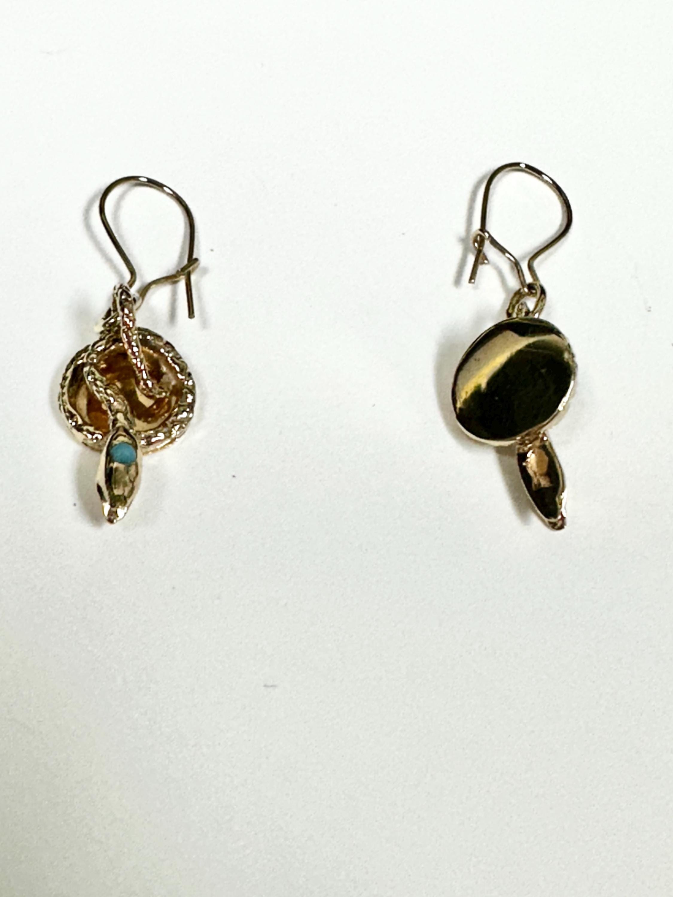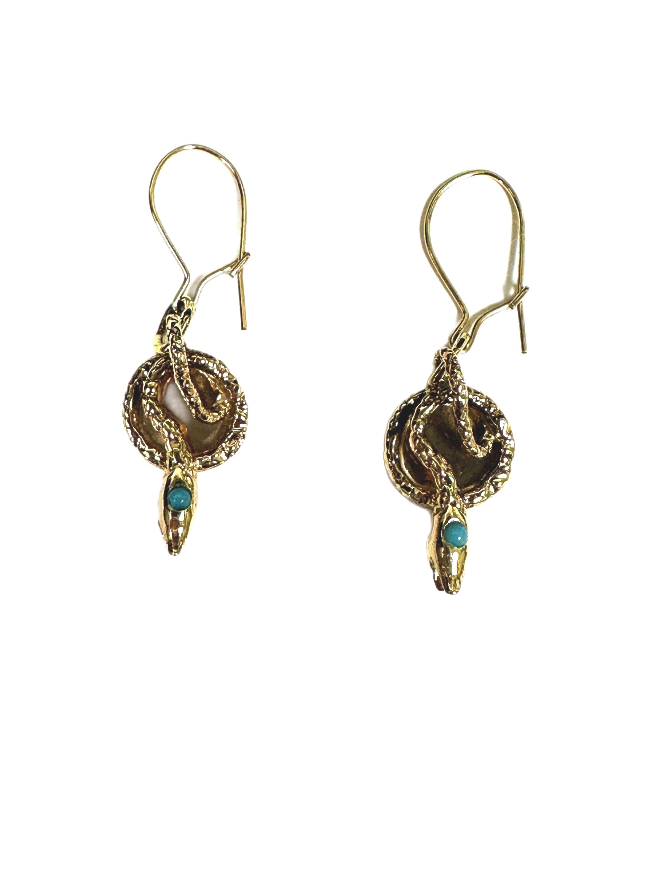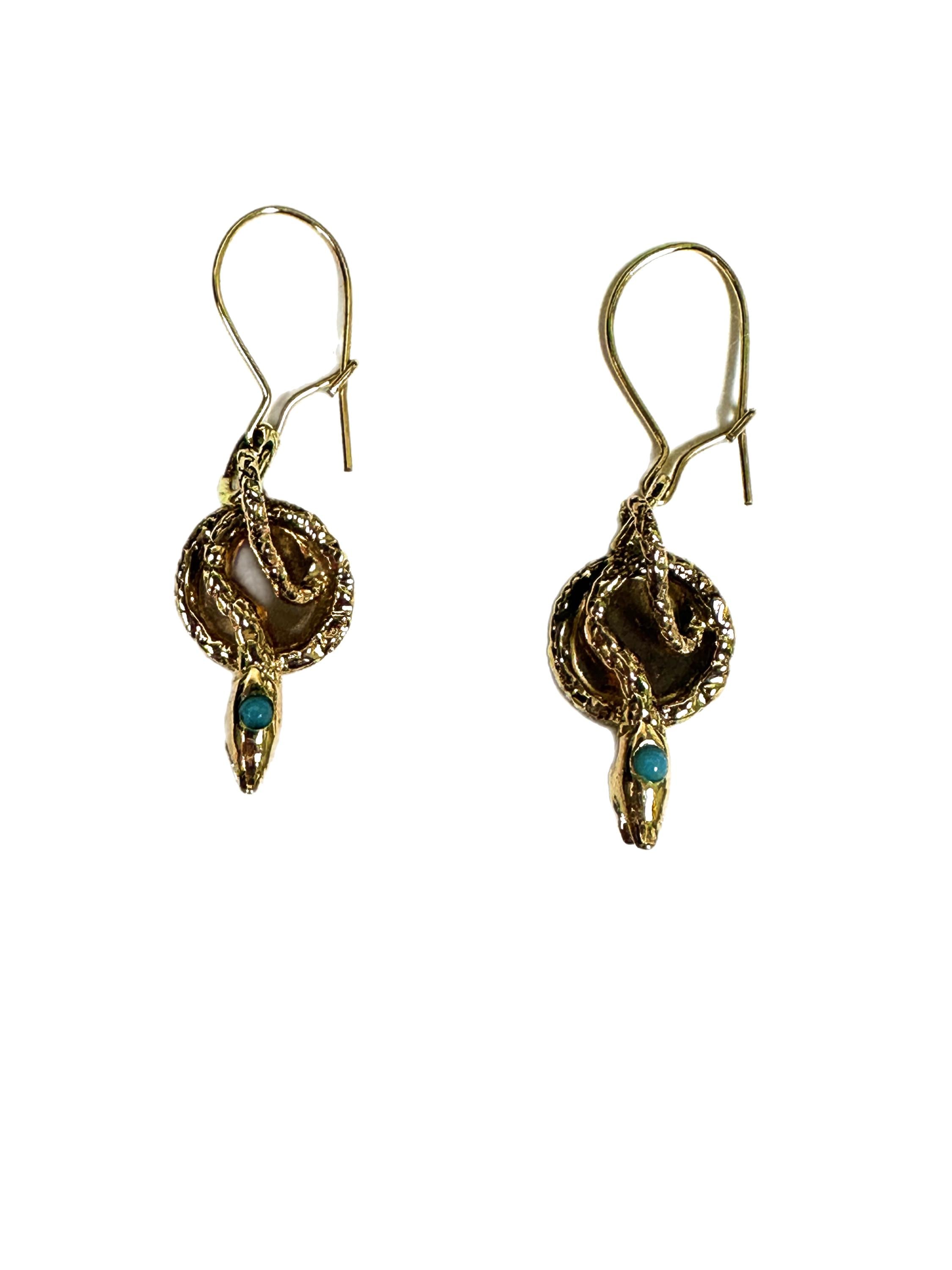 Vintage 14 karat yellow gold snake dangle earrings. Each serpent curves gracefully on a 14 karat yellow gold disc and are suspended by wire backs. Set in the head of each snake is a cabochon cut turquoise. Rich in symbolism these earrings are perfect for lovers of beautiful fine jewelry.