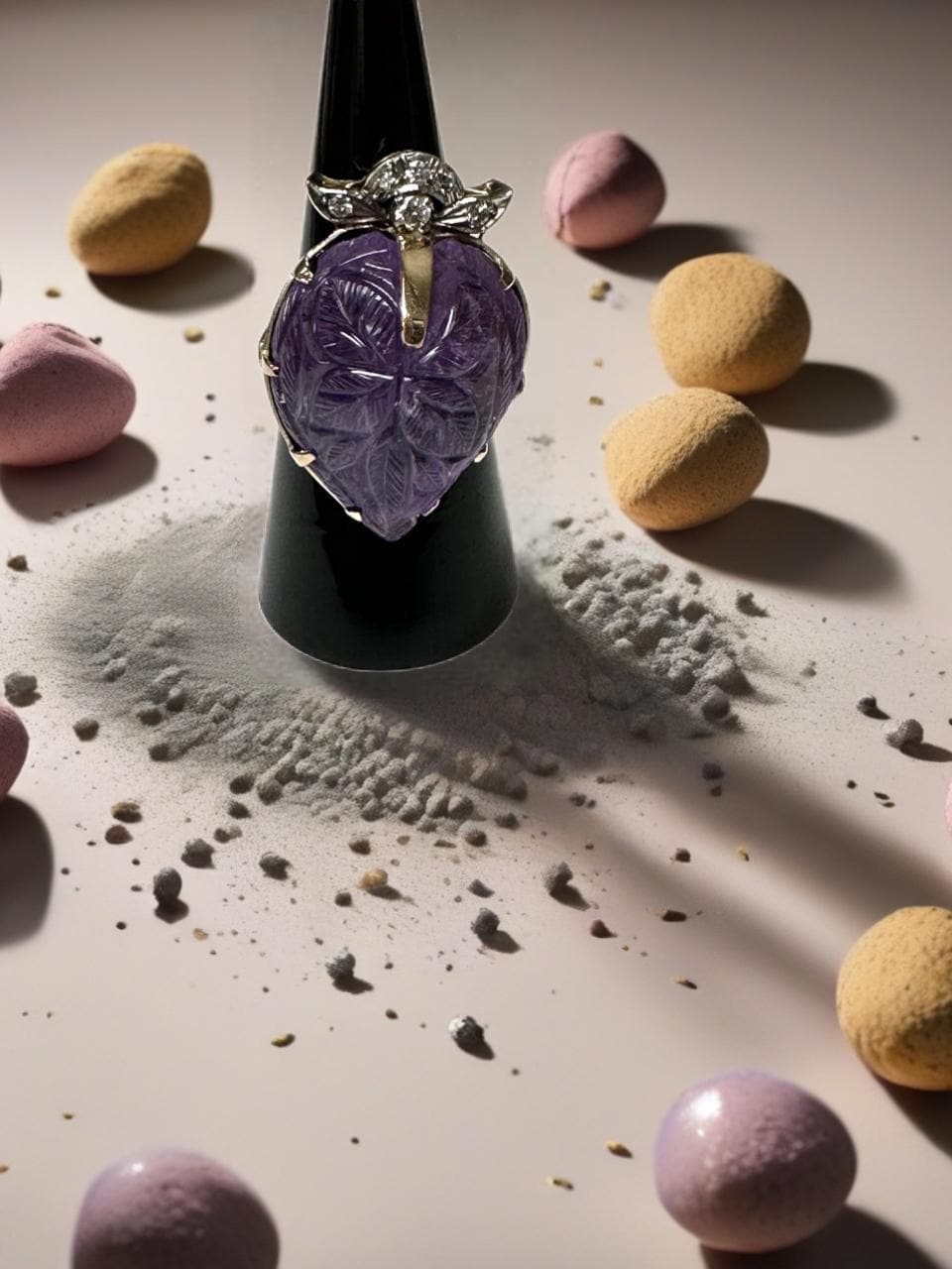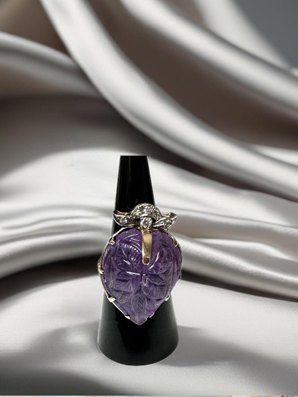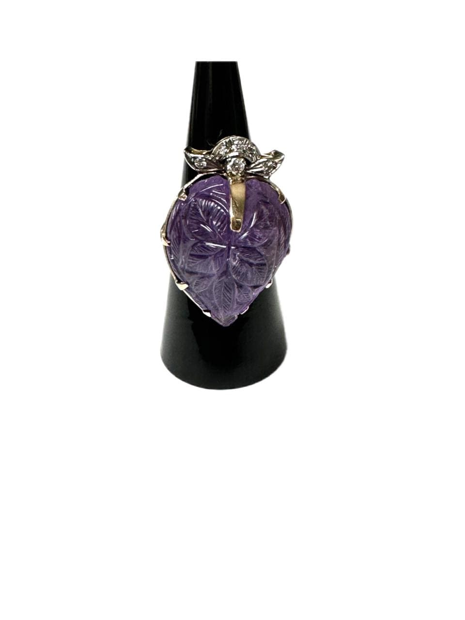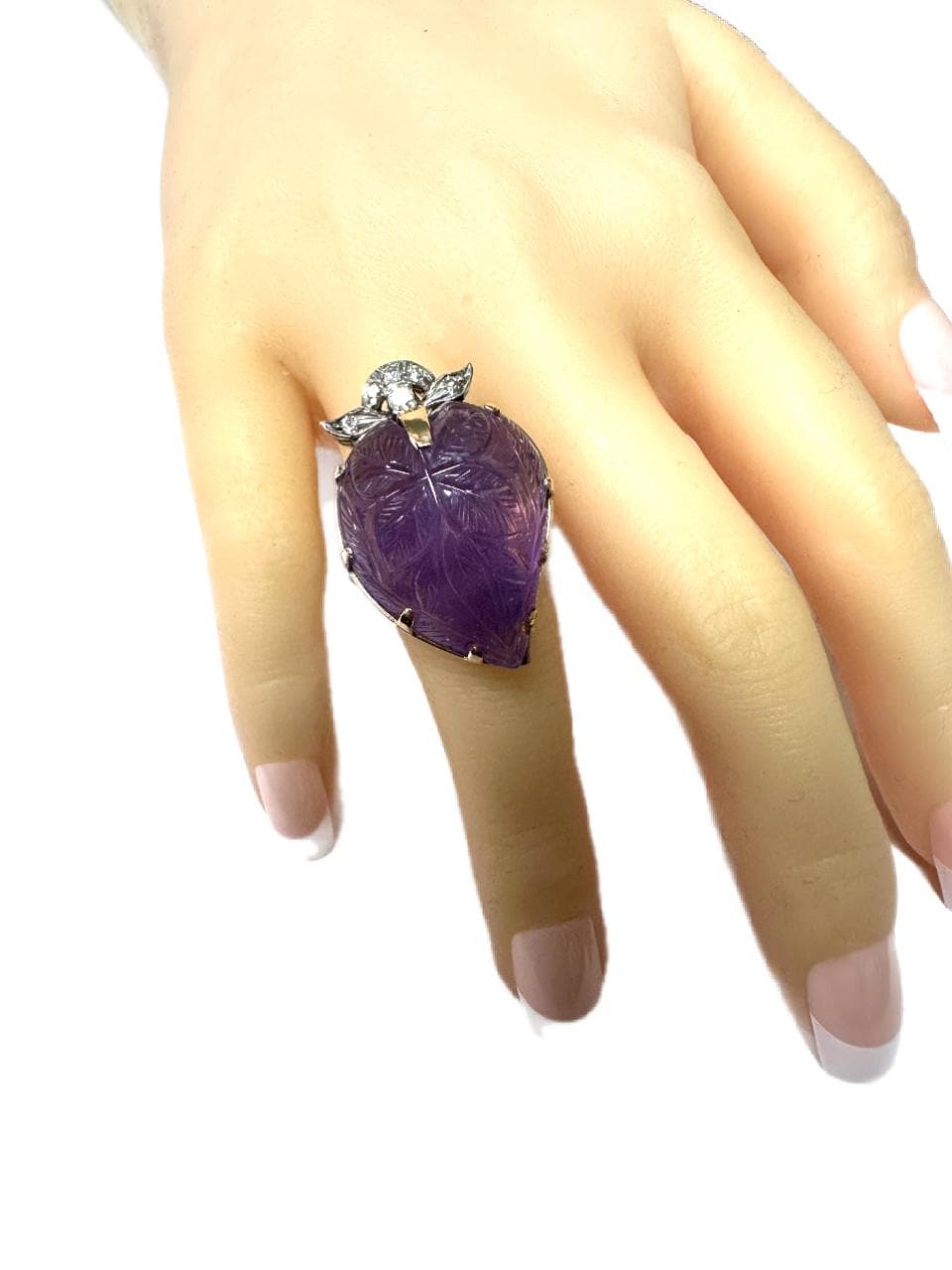 Definitely a statement ring! Set in this 14 karat yellow gold mounting is one carved pear shaped amethyst. The amethyst is nicely carved with a leaf design and measures approximately 1 inch x 3/4 inch. At the top of the amethyst are 6 full cut round brilliant diamonds having a combined estimated weight of approximately 0.12 carats. The ring kind of looks like a strawberry with the strawberry leaves carved into the amethyst and then the diamonds making up the strawberry "leaf cap." Ring Size: 6-1/2 can be sized