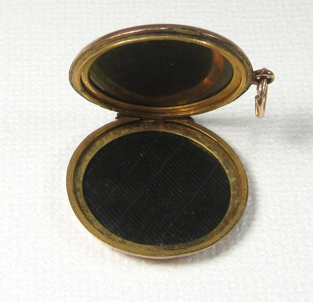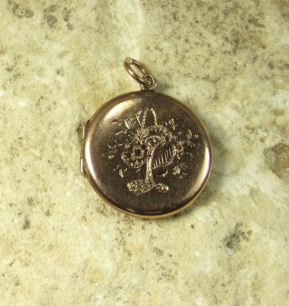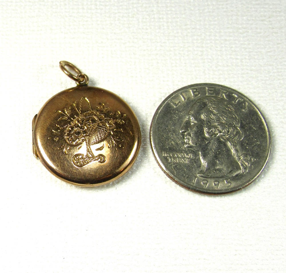 Gold filled round locket measuring approximately 3/4 inch in diameter. The locket has an engraving of flowers in a Victorian flower basket with handle, while the back is flowers and a bird. Both inside rims and plastic inserts are present and in good condition. The locket opens easily and shuts securely. Circa: Early 1900's