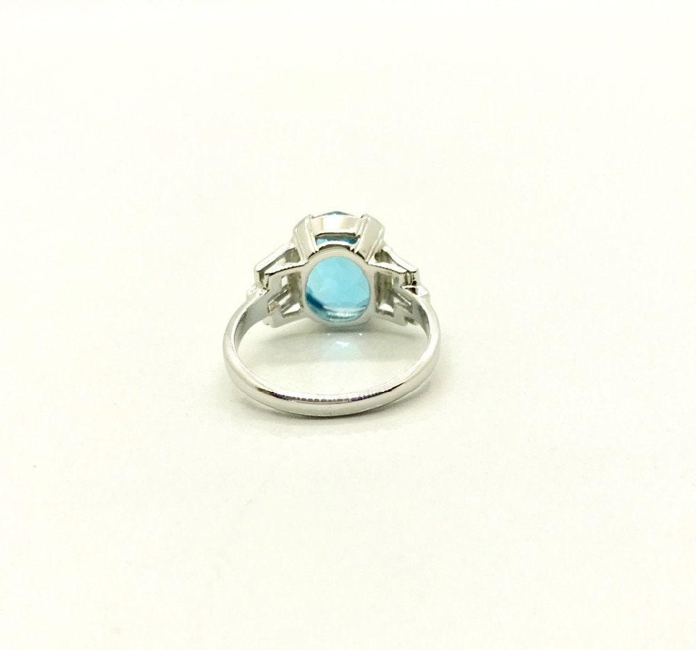 White gold vintage blue topaz and cubic zirconia ring. The ring is stamped 14 karat however my goldsmith tested the metal and it tested 10 karat. Set in the center is one oval cut blue topaz measuring approximately 10.90mm x 9.80mm and is considered to be moderate blue in hue. Accenting the blue topaz are 6 baguette cut c.z.'s...two measuring approximately 5.00mm x 2.00mm and four measuring approximately 3.50mm x 1.50mm. Topaz is the birthstone for November however Blue Topaz is now designated as an alternative birthstone for the month of December. Ring Size: 5-3/4 can be sized