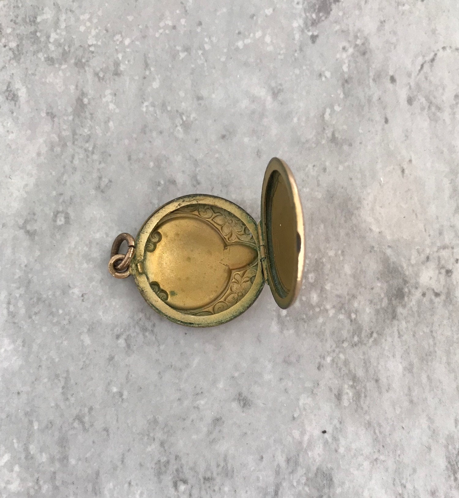 Beautifully embossed round antique gold filled locket. The locket measures approximately 1 inch in diameter. The front of the locket is embossed with a floral design. In the center of the locket and hand engraved is the letter "B." The back of the locket is plain and does show some wear.
