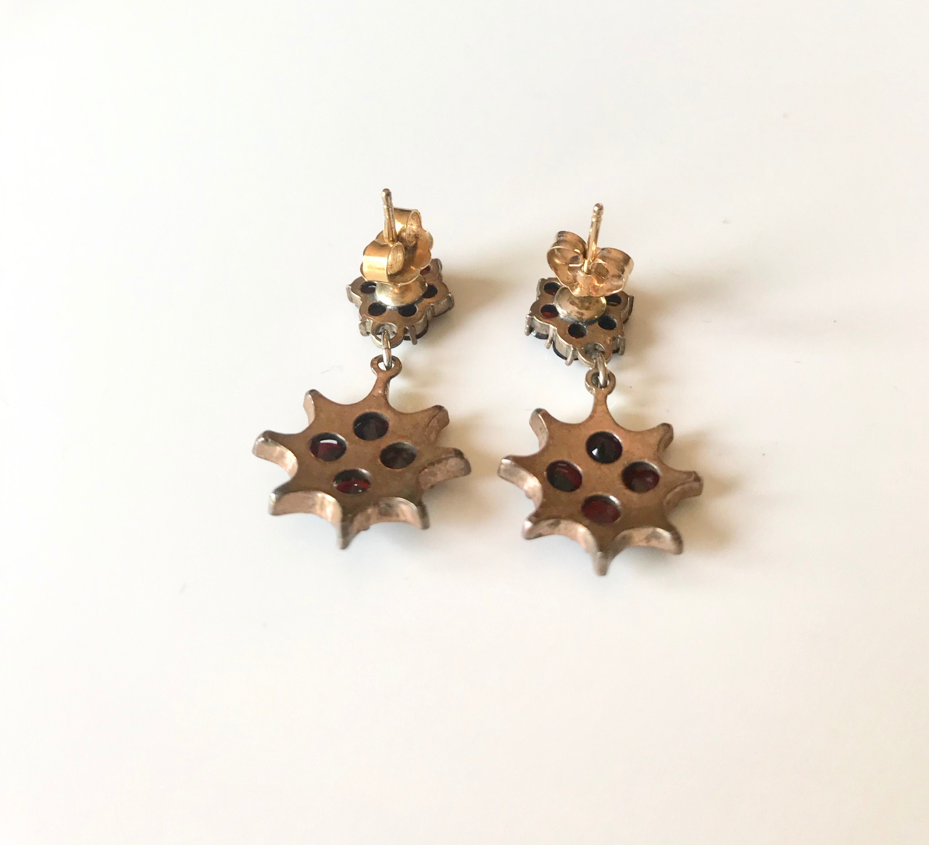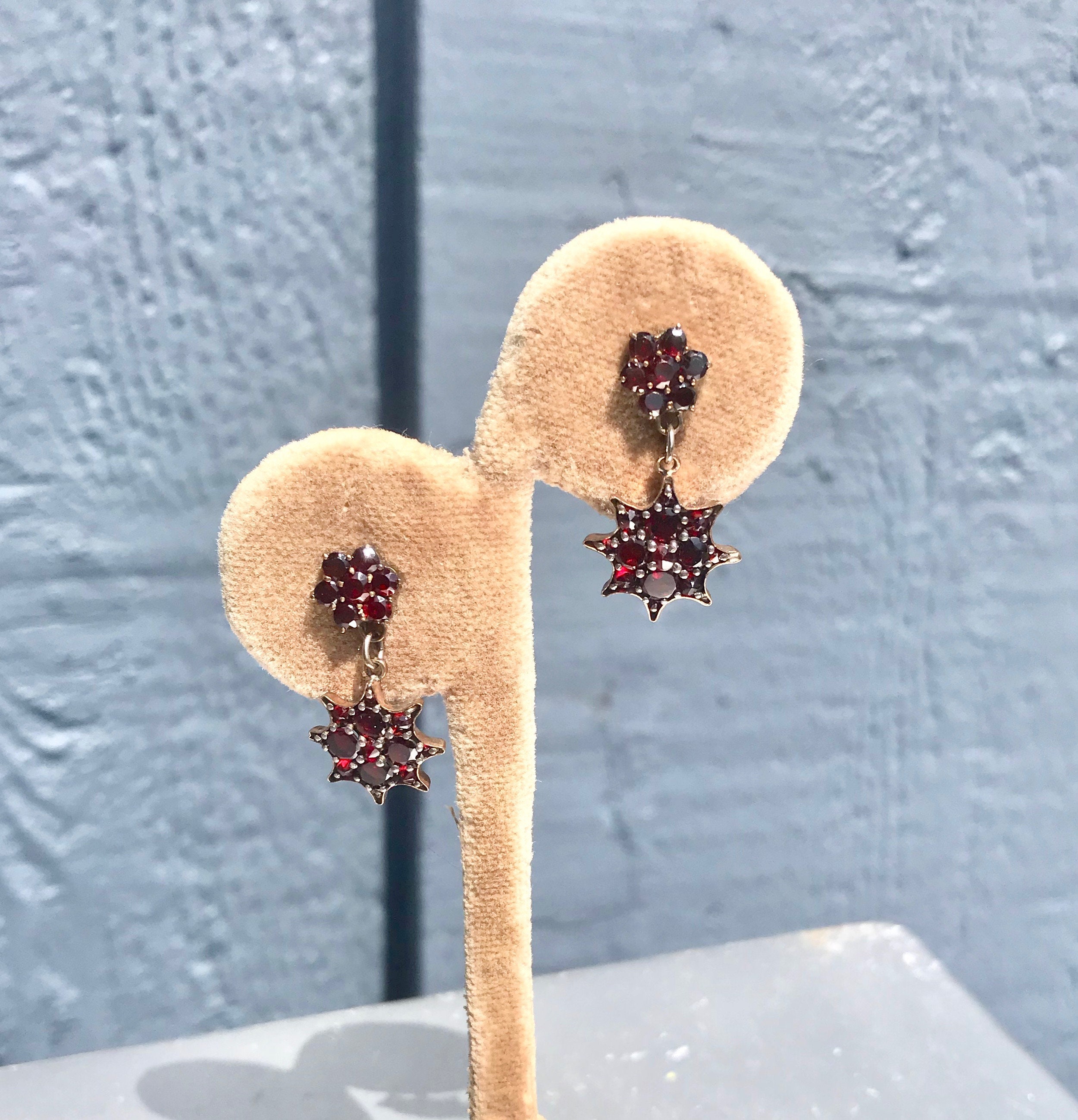 Originally screw back earrings these garnets have been converted to pierced with 14 karat yellow gold posts (please examine the back of the earrings carefully to inspect the conversion). Each earring looks as if they have 2 stars; one at the top where the post is and then one that is dangling from the top.